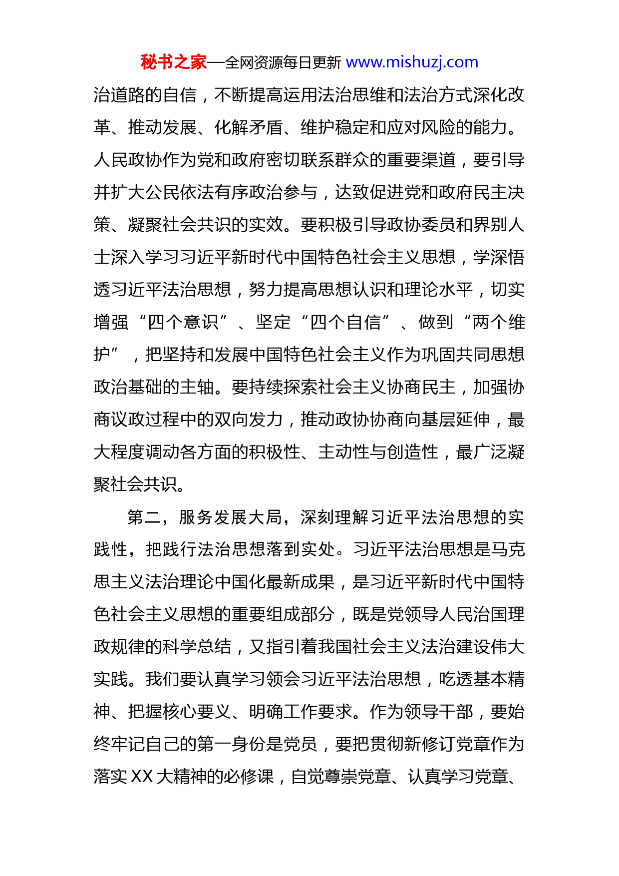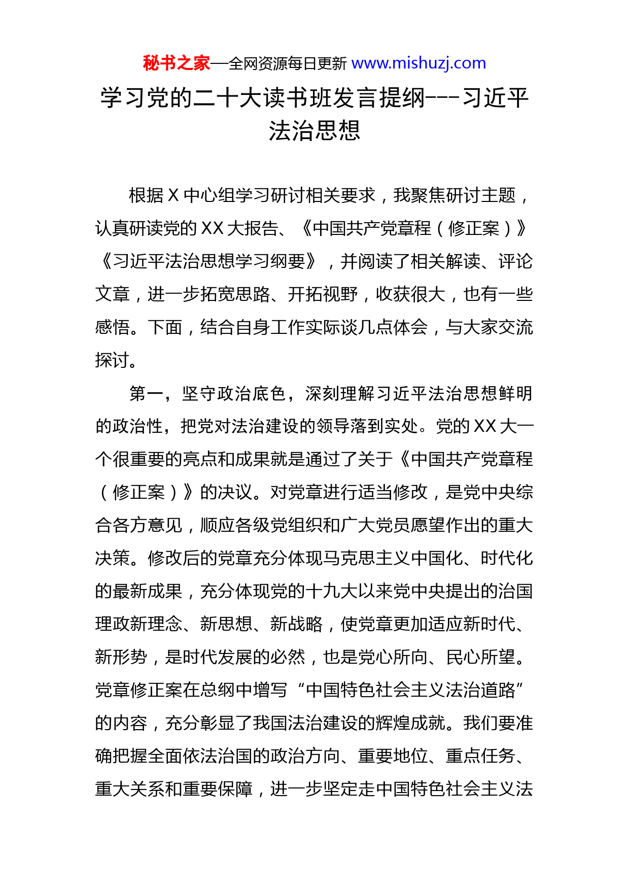 秘书之家—全网资源每日更新www.mishuzj.com学习党的二十大读书班发言提纲---习近平法治思想根据X中心组学习研讨相关要求,我聚焦研讨主题,认真研读党的XX大报告、《中国共产党章程(修正案)》《习近平法治思想学习纲要》,并阅读了相关解读、评论文章,进一步拓宽思路、开拓视野,收获很大,也有一些感悟。下面,结合自身工作实际谈几点体会,与大家交流探讨。第一,坚守政治底色,深刻理解习近平法治思想鲜明的政治性,把党对法治建设的领导落到实处。党的XX大一个很重要的亮点和成果就是通过了关于《中国共产党章程(修正案)》的决议。对党章进行适当修改,是党中央综合各方意见,顺应各级党组织和广大党员愿望作出的重大决策。修改后的党章充分体现马克思主义中国化、时代化的最新成果,充分体现党的十九大以来党中央提出的治国理政新理念、新思想、新战略,使党章更加适应新时代、新形势,是时代发展的必然,也是党心所向、民心所望。党章修正案在总纲中增写“中国特色社会主义法治道路”的内容,充分彰显了我国法治建设的辉煌成就。我们要准确把握全面依法治国的政治方向、重要地位、重点任务、重大关系和重要保障,进一步坚定走中国特色社会主义法秘书之家—全网资源每日更新www.mishuzj.com治道路的自信,不断提高运用法治思维和法治方式深化改革、推动发展、化解矛盾、维护稳定和应对风险的能力。人民政协作为党和政府密切联系群众的重要渠道,要引导并扩大公民依法有序政治参与,达致促进党和政府民主决策、凝聚社会共识的实效。要积极引导政协委员和界别人士深入学习习近平新时代中国特色社会主义思想,学深悟透习近平法治思想,努力提高思想认识和理论水平,切实增强“四个意识”、坚定“四个自信”、做到“两个维护”,把坚持和发展中国特色社会主义作为巩固共同思想政治基础的主轴。要持续探索社会主义协商民主,加强协商议政过程中的双向发力,推动政协协商向基层延伸,最大程度调动各方面的积极性、主动性与创造性,最广泛凝聚社会共识。第二,服务发展大局,深刻理解习近平法治思想的实践性,把践行法治思想落到实处。习近平法治思想是马克思主义法治理论中国化最新成果,是习近平新时代中国特色社会主义思想的重要组成部分,既是党领导人民治国理政规律的科学总结,又指引着我国社会主义法治建设伟大实践。我们要认真学习领会习近平法治思想,吃透基本精神、把握核心要义、明确工作要求。作为领导干部,要始终牢记自己的第一身份是党员,要把贯彻新修订党章作为落实XX大精神的必修课,自觉尊崇党章、认真学习党章、秘书之家—全网资源每日更新www.mishuzj.com严格遵守党章、坚决维护党章,始终以党的旗帜为旗帜、以党的方向为方向、以党的意志为意志,为更好扛起新使命、谱写新篇章提供坚强政治保证,以实际行动坚定捍卫“两个确立”、坚决做到“两个维护”。在政协分管工作方面,要围绕分管领域重点任务,精心谋划超前布局,形成推动落实的思路举措,以高水平建言资政服务我区绿色高质量发展。要强化委员责任担当,提高委员法治思维和依法办事的能力,充分激发广大委员参与国家治理的积极性与能动性,为党委部门决策、推进国家治理体系和治理能力现代化提供强有力的民意支撑。第三,聚焦民生福祉,深刻理解习近平法治思想的人民性,把以人民为中心落到实处。习近平法治思想的人民性适应了全面依法治国的要求,明确指出了中国特色社会主义法制建设的发展方向,充分代表了广大人民群众的利益和愿望,真实体现了对人民权益的保护和对人民福祉的守护。“全心全意为人民服务”一直是党章总纲的重要内容,印证了中国共产党人践行初心使命的历史自觉。今天,要实现新时代党和国家事业发展的宏伟目标,更加需要我们贯彻党章精神和党章规定,“全心全意为人民服务”,把人民情怀深植于灵魂血脉,在不忘初心中保持先进性、纯洁性,在牢记使命中担当任事、砥砺前行,永远做人民的保卫者、人民利益的捍卫者。落实到具体工作秘书之家—全网资源每日更新www.mishuzj.com上,做好新时代政协工作,要树牢“人民政协为人民”的履职理念,把不断满足人民对美好生活的需要、促进民生改善作为重要着力点,坚持就改革发展稳定重大问题、事关人民群众切身利益的问题进行广泛协商,有效践行“有事好商量、众人的事情由众人商量,找到全社会意愿和要求的最大公约数”这一人民民主的真谛。要始终与人民同呼吸、共命运、心连心,以“不负时代、不负人民”的奋斗姿态,展示政协的责任与担当,以政协之能服务发展之为,助推X更好更快发展。学习宣传贯彻党的XX大精神是当前和今后一个时期的首要政治任务,我们要按照“五个牢牢把握”的要求,原原本本学习研读党的XX大报告和党章,学懂弄通做实党的XX大精神,把强大的精神力量转化为物质力量,把强大的理论力量转化为实践力量,一步一个脚印把党的XX大作出的重大决策部署付诸行动、见之于成效。