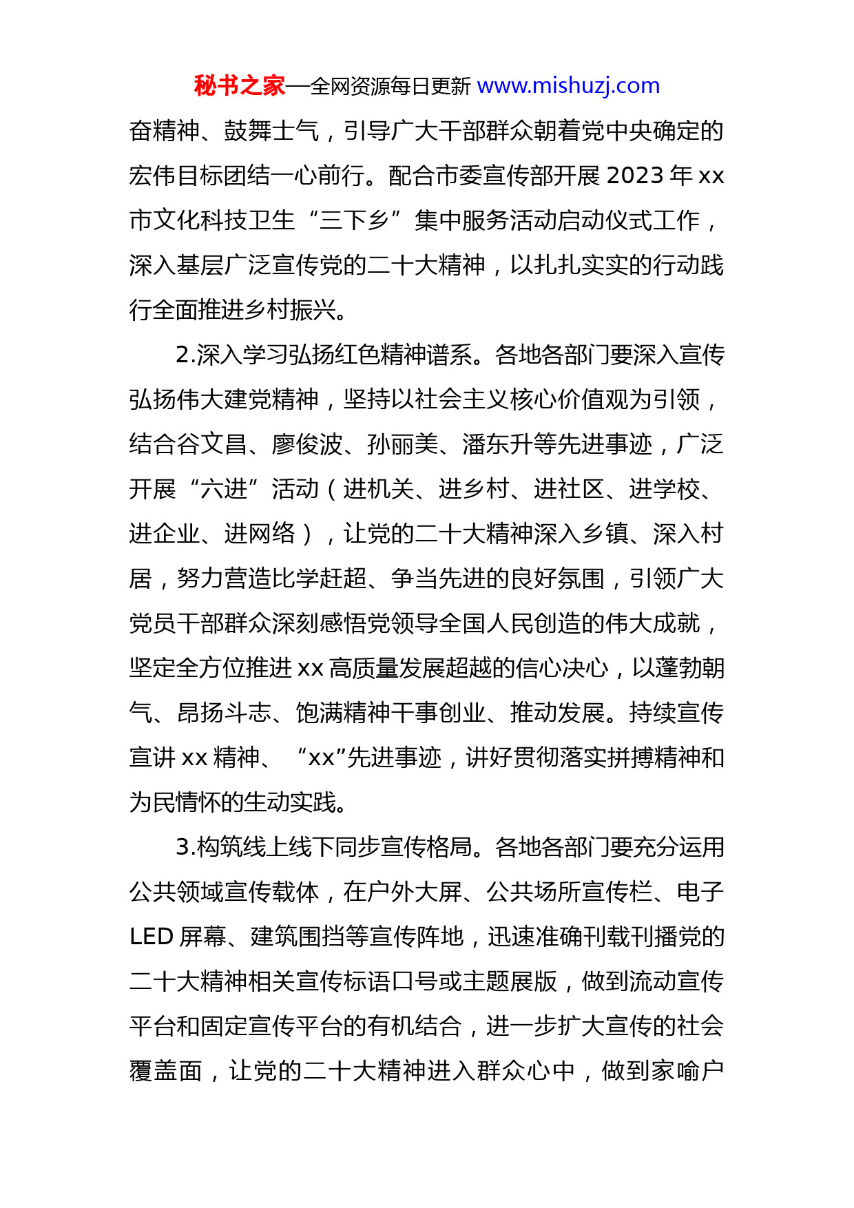 秘书之家—全网资源每日更新www.mishuzj.com学习宣传贯彻党的二十大精神社会宣传工作方案学习宣传贯彻党的二十大精神是当前和今后一个时期全党全国的首要政治任务。要把好基调、把好导向,组织开展内容丰富、形式多样的宣传教育活动,切实增强感召力、凝聚力、影响力,努力营造奋进新征程的良好社会氛围。为深入学习宣传贯彻党的二十大精神,特制定方案如下:一、指导思想深刻领悟“两个确立”的决定性意义,增强“四个意识”、坚定“四个自信”、做到“两个维护”,切实把思想和行动统一到党的二十大精神上来,高举中国特色社会主义伟大旗帜,全面贯彻习近平新时代中国特色社会主义思想,统筹运用各类社会宣传阵地,迅速在全县上下掀起学习宣传贯彻热潮,推动学习宣传贯彻党的二十大精神走深走实,为把xx建成活力新产城、生态富家园提供精神动力。二、工作安排1.广泛开展群众性主题宣传教育活动。持续推进“强国复兴有我”、“奋进新征程建功新时代”群众性主题宣传教育活动,广泛开展群众性主题宣传教育活动,进一步振秘书之家—全网资源每日更新www.mishuzj.com奋精神、鼓舞士气,引导广大干部群众朝着党中央确定的宏伟目标团结一心前行。配合市委宣传部开展2023年xx市文化科技卫生“三下乡”集中服务活动启动仪式工作,深入基层广泛宣传党的二十大精神,以扎扎实实的行动践行全面推进乡村振兴。2.深入学习弘扬红色精神谱系。各地各部门要深入宣传弘扬伟大建党精神,坚持以社会主义核心价值观为引领,结合谷文昌、廖俊波、孙丽美、潘东升等先进事迹,广泛开展“六进”活动(进机关、进乡村、进社区、进学校、进企业、进网络),让党的二十大精神深入乡镇、深入村居,努力营造比学赶超、争当先进的良好氛围,引领广大党员干部群众深刻感悟党领导全国人民创造的伟大成就,坚定全方位推进xx高质量发展超越的信心决心,以蓬勃朝气、昂扬斗志、饱满精神干事创业、推动发展。持续宣传宣讲xx精神、“xx”先进事迹,讲好贯彻落实拼搏精神和为民情怀的生动实践。3.构筑线上线下同步宣传格局。各地各部门要充分运用公共领域宣传载体,在户外大屏、公共场所宣传栏、电子LED屏幕、建筑围挡等宣传阵地,迅速准确刊载刊播党的二十大精神相关宣传标语口号或主题展版,做到流动宣传平台和固定宣传平台的有机结合,进一步扩大宣传的社会覆盖面,让党的二十大精神进入群众心中,做到家喻户秘书之家—全网资源每日更新www.mishuzj.com晓。要紧密结合创建省级文明县城、助推创建市域社会治理现代化合格试点城市、国家安全、国防教育、安全生产、食品安全、房屋安全、廉洁文化、依法治县、普法、疫情防控、移风易俗、未成年人保护、垃圾分类等社会宣传工作,以实际行动践行党的二十大精神。融媒体中心等要发挥主流媒体优势,通过刊载宣传标语口号、公益广告、专题报道等方式,加大社会宣传力度,共同营造浓厚宣传氛围。负责组织协调3xx国道xx路段氛围布置工作,助力第十二届海峡两岸现代农业博览会﹒第二十二届海峡两岸花卉博览会。4.依托宣传阵地开展实践教育。充分发挥中共闽粤边区特委红色革命教育基地等全县各级爱国主义教育基地和新时代文明实践中心的教育功能,激励动员广大党员干部群众特别是青少年,持续为全面建设社会主义现代化国家、夺取新时代中国特色社会主义伟大胜利、实现中华民族伟大复兴而奋斗。加强场馆解说员和志愿者的培训,把党的故事、革命的故事、根据地的故事、英雄和烈士的故事与党的二十大精神有机结合起来,增强讲解能力和感染力,激发广大党员干部干事创业热情。三、工作要求1.加强领导,精心组织。各地各部门要加强组织领导,精心制定方案,周密组织实施,迅速兴起学习宣传贯彻党秘书之家—全网资源每日更新www.mishuzj.com的二十大精神的热潮,确保第一时间把党的二十大精神准确传达到广大党员干部群众中。2.迅速行动,形成合力。要组织各类新闻媒体、新媒体等“报、端、网、微”和各种宣传阵地一起发声,形成联动,聚焦聚力,全方位、高频率地开展宣传报道,形成学习宣传党的二十大精神的强大声势。3.形式多样,注重创新。要积极创新,采用闽南语、芗剧、木偶戏、诗歌、歌曲等群众通俗易懂的创新方式,把党的二十大精神传播到千家万户,让群众入脑入心,转化成行动自觉。4.建立机制,实现长效。各地各部门要把贯彻落实本方案的情况纳入督查工作中,也作为意识形态工作责任制考核的一项重要指标,及时通报存在问题,确保各项工作落实见效,要做好调查研究,及时总结和推广基层的创新经验,不断提高工作水平。附件:1.学习宣传贯彻党的二十大精神氛围布置分工方案2.学习宣传贯彻党的二十大精神宣传标语口号秘书之家—全网资源每日更新www.mishuzj.com秘书之家—全网资源每日更新www.mishuzj.com附件1学习宣传贯彻党的二十大精神氛围布置分工方案1.县直机关工委:负责组织县直机关各单位尤其是沿街各县直单位、行政服务中心、审批办事窗口等,充分利用LED电子显示屏等宣传载体刊播标语、海报、宣传片。2.县城管局:负责主干道(xx大道、xx大道、xx大道、xx大道)、县城区市场、户外大屏等刊播标语、海报、宣传片。3.县市场监管局:负责组织县城各主要