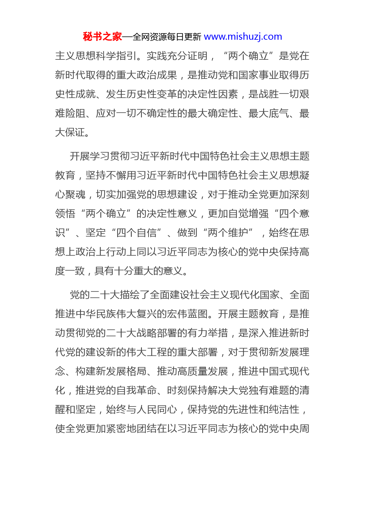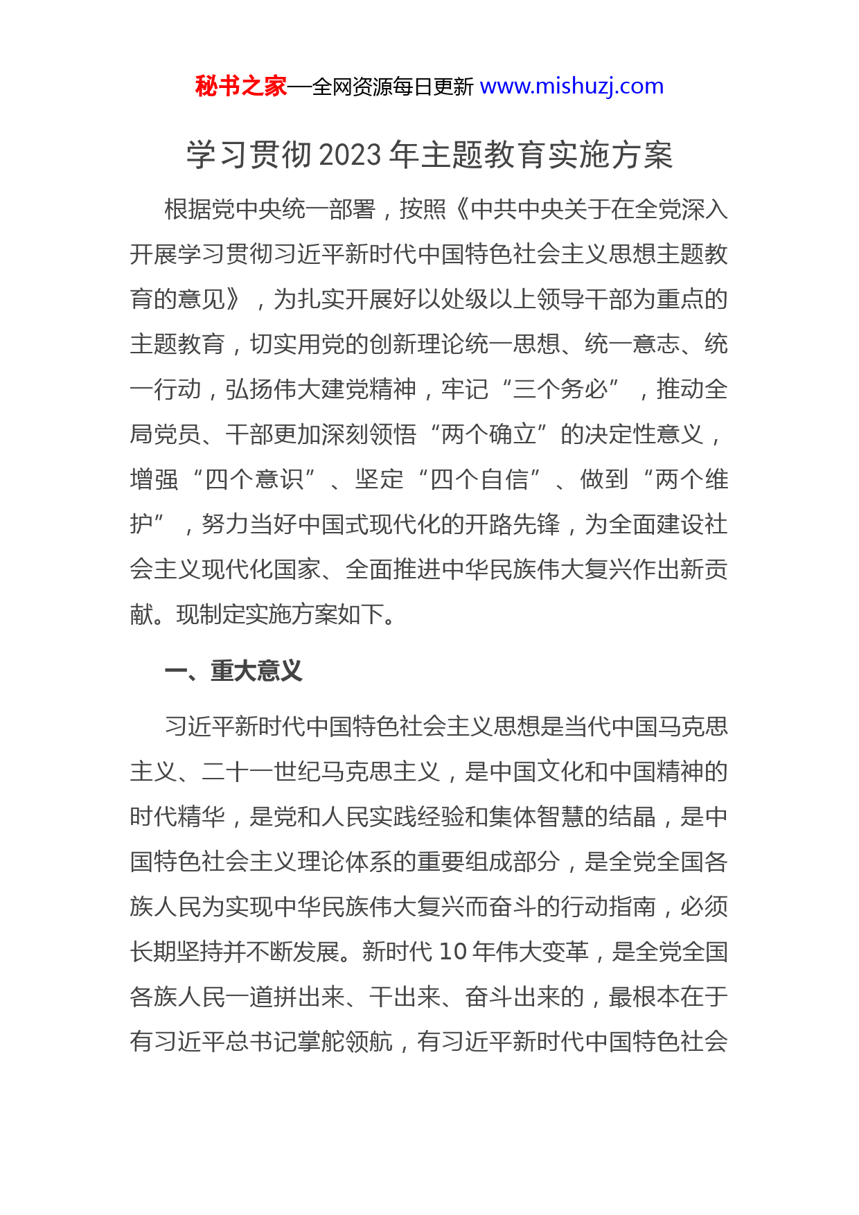 秘书之家—全网资源每日更新www.mishuzj.com学习贯彻2023年主题教育实施方案根据党中央统一部署,按照《中共中央关于在全党深入开展学习贯彻习近平新时代中国特色社会主义思想主题教育的意见》,为扎实开展好以处级以上领导干部为重点的主题教育,切实用党的创新理论统一思想、统一意志、统一行动,弘扬伟大建党精神,牢记“三个务必”,推动全局党员、干部更加深刻领悟“两个确立”的决定性意义,增强“四个意识”、坚定“四个自信”、做到“两个维护”,努力当好中国式现代化的开路先锋,为全面建设社会主义现代化国家、全面推进中华民族伟大复兴作出新贡献。现制定实施方案如下。一、重大意义习近平新时代中国特色社会主义思想是当代中国马克思主义、二十一世纪马克思主义,是中国文化和中国精神的时代精华,是党和人民实践经验和集体智慧的结晶,是中国特色社会主义理论体系的重要组成部分,是全党全国各族人民为实现中华民族伟大复兴而奋斗的行动指南,必须长期坚持并不断发展。新时代10年伟大变革,是全党全国各族人民一道拼出来、干出来、奋斗出来的,最根本在于有习近平总书记掌舵领航,有习近平新时代中国特色社会秘书之家—全网资源每日更新www.mishuzj.com主义思想科学指引。实践充分证明,“两个确立”是党在新时代取得的重大政治成果,是推动党和国家事业取得历史性成就、发生历史性变革的决定性因素,是战胜一切艰难险阻、应对一切不确定性的最大确定性、最大底气、最大保证。开展学习贯彻习近平新时代中国特色社会主义思想主题教育,坚持不懈用习近平新时代中国特色社会主义思想凝心聚魂,切实加强党的思想建设,对于推动全党更加深刻领悟“两个确立”的决定性意义,更加自觉增强“四个意识”、坚定“四个自信”、做到“两个维护”,始终在思想上政治上行动上同以习近平同志为核心的党中央保持高度一致,具有十分重大的意义。党的二十大描绘了全面建设社会主义现代化国家、全面推进中华民族伟大复兴的宏伟蓝图。开展主题教育,是推动贯彻党的二十大战略部署的有力举措,是深入推进新时代党的建设新的伟大工程的重大部署,对于贯彻新发展理念、构建新发展格局、推动高质量发展,推进中国式现代化,推进党的自我革命、时刻保持解决大党独有难题的清醒和坚定,始终与人民同心,保持党的先进性和纯洁性,使全党更加紧密地团结在以习近平同志为核心的党中央周秘书之家—全网资源每日更新www.mishuzj.com围,完成党在新时代新征程的使命任务,具有十分重大的意义。开展主题教育,是统一全党思想意志行动、始终保持党的强大凝聚力、战斗力的必然要求,是推动全党积极担当作为、不断开创事业发展新局面的必然要求,是深入推进全面从严治党、以党的自我革命引领社会革命的必然要求。作为中央和国家机关,必须牢牢把握政治机关定位,带头维护党中央权威和集中统一领导,在深入学习贯彻习近平新时代中国特色社会主义思想上作表率,在始终同以习近平同志为核心的党中央保持高度一致上作表率,在坚决贯彻落实党中央各项决策部署上作表率。新征程上推进强国建设、民族复兴的接力棒,历史地落在了我们这一代人身上,必须强化用党的创新理论武装,不断把学习贯彻习近平新时代中国特色社会主义思想引向深入,为奋进新征程建功新时代、当好中国式现代化的开路先锋提供坚强有力的政治引领和政治保障。二、目标任务开展主题教育,总要求是“学思想、强党性、重实践、建新功”,根本任务是坚持学思用贯通、知信行统一,把习近平新时代中国特色社会主义思想转化为坚定理想、锤炼党性和指导实践、推动工作的强大力量,使全党始终保秘书之家—全网资源每日更新www.mishuzj.com持统一的思想、坚定的意志、协调的行动、强大的战斗力努力在以学铸魂、以学增智、以学正风、以学促干方面取得实实在在的成效。具体达到以下目标。1.凝心铸魂筑牢根本。全面、系统、深入学习习近平新时代中国特色社会主义思想,完整准确掌握这一重要思想的主要内容,全面把握这一重要思想的世界观、方法论和贯彻其中的立场观念方法,深刻理解这一重要思想的道理学理哲理,推动党员、干部真学真懂真信真用,推动学习往深里走、往实里走、往心里走,提高思想觉悟,切实做到筑牢信仰之基、补足精神之钙、把稳思想之舵。2.锤炼品格强化忠诚。深刻领悟“两个确立”的决定性意义,牢固树立政治机关意识,走好“第一方阵”,不断增强忠诚核心、拥戴核心、维护核心、捍卫核心的政治自觉、思想自觉、行动自觉,不断提高政治判断力、政治领悟力、政治执行力,始终忠诚于党、忠诚于人民、忠诚于马克思主义,真心爱党、时刻忧党、坚定护党、全力兴党。3.实干担当促进发展。突出实践导向,真抓实干、务求实效,紧紧围绕新时代新征程党的中心任务,胸怀“国之大者”,牢固树立正确的权力观、政绩观、事业观,增强推动高质量发展本领、服务群众本领、防范化解风险本领敢于斗争、敢于负责,聚焦问题、知难而进,以“时时放秘书之家—全网资源每日更新www.mishuzj.com心不下”的责任感、积极担当作为的精气神为党和人民履好职、尽好责,走好贯彻落实党中央决策部署“最初一公里”,以新气象新
