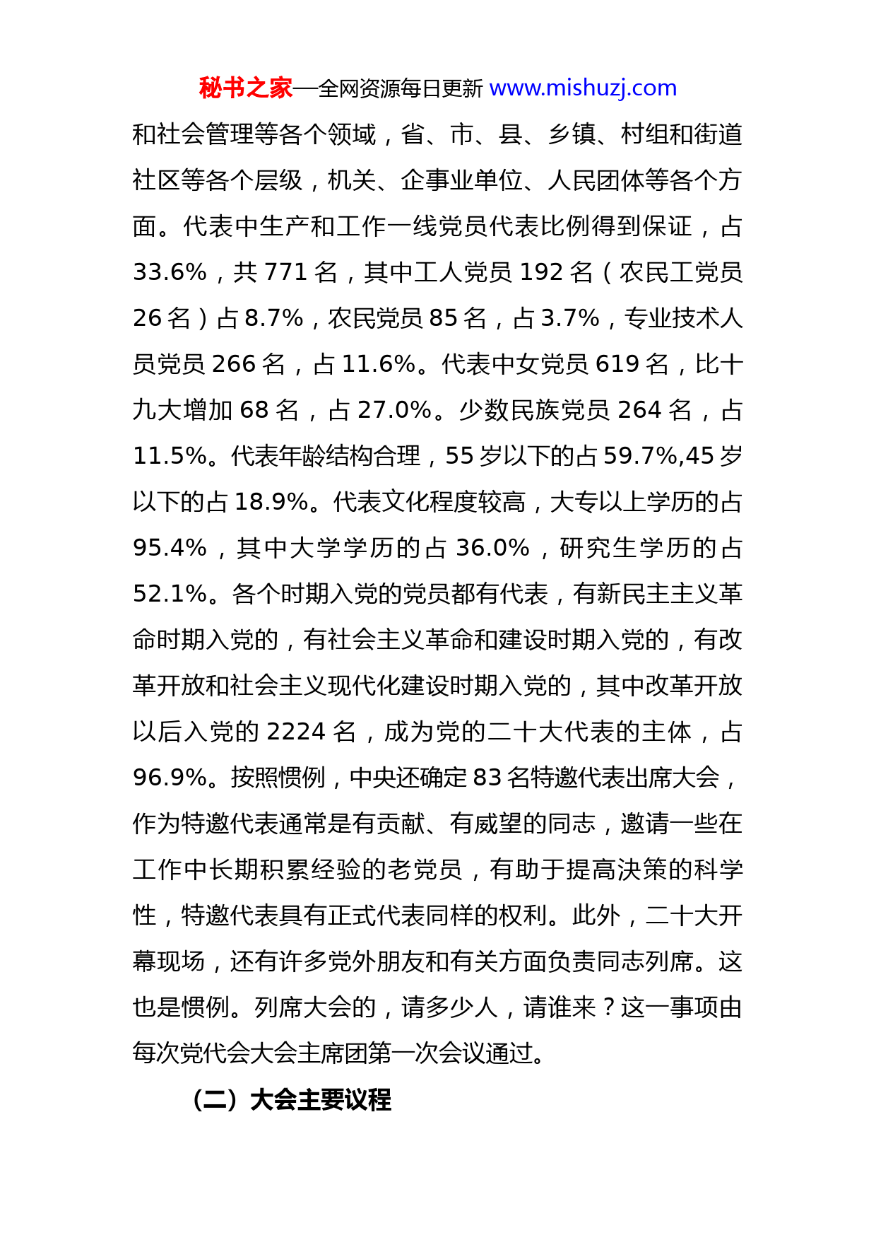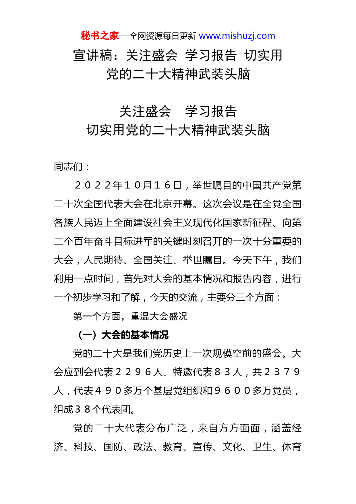 秘书之家—全网资源每日更新www.mishuzj.com宣讲稿:关注盛会学习报告切实用党的二十大精神武装头脑关注盛会学习报告切实用党的二十大精神武装头脑同志们:2022年10月16日,举世瞩目的中国共产党第二十次全国代表大会在北京开幕。这次会议是在全党全国各族人民迈上全面建设社会主义现代化国家新征程、向第二个百年奋斗目标进军的关键时刻召开的一次十分重要的大会,人民期待、全国关注、举世瞩目。今天下午,我们利用一点时间,首先对大会的基本情况和报告内容,进行一个初步学习和了解,今天的交流,主要分三个方面:第一个方面,重温大会盛况(一)大会的基本情况党的二十大是我们党历史上一次规模空前的盛会。大会应到会代表2296人、特邀代表83人,共2379人,代表490多万个基层党组织和9600多万党员,组成38个代表团。党的二十大代表分布广泛,来自方方面面,涵盖经济、科技、国防、政法、教育、宣传、文化、卫生、体育秘书之家—全网资源每日更新www.mishuzj.com和社会管理等各个领域,省、市、县、乡镇、村组和街道社区等各个层级,机关、企事业单位、人民团体等各个方面。代表中生产和工作一线党员代表比例得到保证,占33.6%,共771名,其中工人党员192名(农民工党员26名)占8.7%,农民党员85名,占3.7%,专业技术人员党员266名,占11.6%。代表中女党员619名,比十九大增加68名,占27.0%。少数民族党员264名,占11.5%。代表年龄结构合理,55岁以下的占59.7%,45岁以下的占18.9%。代表文化程度较高,大专以上学历的占95.4%,其中大学学历的占36.0%,研究生学历的占52.1%。各个时期入党的党员都有代表,有新民主主义革命时期入党的,有社会主义革命和建设时期入党的,有改革开放和社会主义现代化建设时期入党的,其中改革开放以后入党的2224名,成为党的二十大代表的主体,占96.9%。按照惯例,中央还确定83名特邀代表出席大会,作为特邀代表通常是有贡献、有威望的同志,邀请一些在工作中长期积累经验的老党员,有助于提高決策的科学性,特邀代表具有正式代表同样的权利。此外,二十大开幕现场,还有许多党外朋友和有关方面负责同志列席。这也是惯例。列席大会的,请多少人,请谁来?这一事项由每次党代会大会主席团第一次会议通过。(二)大会主要议程秘书之家—全网资源每日更新www.mishuzj.com党的二十大开幕前,于10月15日召开了预备会议,通过和产生了代表资格审查委员会(22人)、大会主席团(243人)及其常务委员会、大会秘书长和副秘书长、大会秘书处机构设置和工作任务,以及大会议程:一是听取和审查十九届中央委员会的报告;二是审查十九届中央纪律检查委员会的工作报告;三是审议通过《中国共产党章程(修正案)》;四是选举二十届中央委员会;五是选举二十届中央纪律检查委员会。各代表团选举产生了团长、副团长和秘书长。解放军和武警部队代表团团长、副团长分别由许其亮、张又侠担任,秘书长由苗华担任。10月16日上午,中国共产党第二十次全国代表大会开幕,习主席代表第十九届中央委员会向大会作了题为《高举中国特色社会主义伟大旗帜为全面建设社会主义现代化国家而团结奋斗》的报告。整个大会分阶段进行,从16日下午开始,各代表团分组讨论党的二十大报告等文件。与会代表以对党的事业高度负责的政治责任感和历史使命感,畅所欲言、参政议事,展现出团结奋进、昂扬向上、开拓创新、民主开放的风貌。(三)大会主要特点1.召开意义十分重大。习主席在党的二十大报告中指秘书之家—全网资源每日更新www.mishuzj.com出,这次会议是在全党全国各族人民迈上全面建设社会主义现代化国家新征程、向第二个百年奋斗目标进军的关键时刻召开的一次十分重要的大会。大会明确宣示党在新征程上举什么旗、走什么路、以什么样的精神状态、朝着什么样的目标继续前进,对全面建成社会主义现代化强国两步走战略安排进行宏观展望,科学谋划未来5年乃至更长时期党和国家事业发展的目标任务和大政方针。开好这次大会,事关党和国家事业继往开来,事关中国特色社会主义前途命运,事关中华民族伟大复兴,对鼓舞和动员全党全军全国各族人民坚持和发展中国特色社会主义、全面建设社会主义现代化国家、全面推进中华民族伟大复兴具有重大意义。2.准备工作非常充分。一是精心组织起草党的二十大报告。为起草好党的二十大报告,党中央组织开展了深入的调查研究,部署了26个重点课题,由中央和国家机关54家单位开展专题调研,形成80份调研报告。中央有关部门还开展了党的二十大相关工作网络征求意见活动,收到留言854.2万条,这些调研成果为报告起草打下了坚实基础。报告征求意见稿形成后,征求意见人数共4700余人。党内外各方面的许多意见都得到了采纳。二是精心起草党章修正案。党的二十大的一项重要任务是修改党章。党的全国代表大会根据党的理论创新和实践发展的需要对秘书之家—全网资源每日更新www.mishuzj.com党章进行修改,这是一个惯例。根据新形势新任务对党章进行适当修改,有利于全党更好学习党章、遵守党章、贯彻党章、维护党章,更好发挥党章对党的工作和党的建设的指导、规范作用。在党中央就党的二十大报告议题征求意见过程中,各地区各部门普遍建议党的二十大根据党的理论创新和实践发展、根据形势任务发展变化,