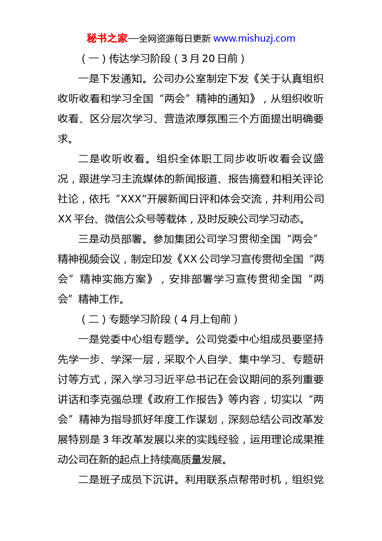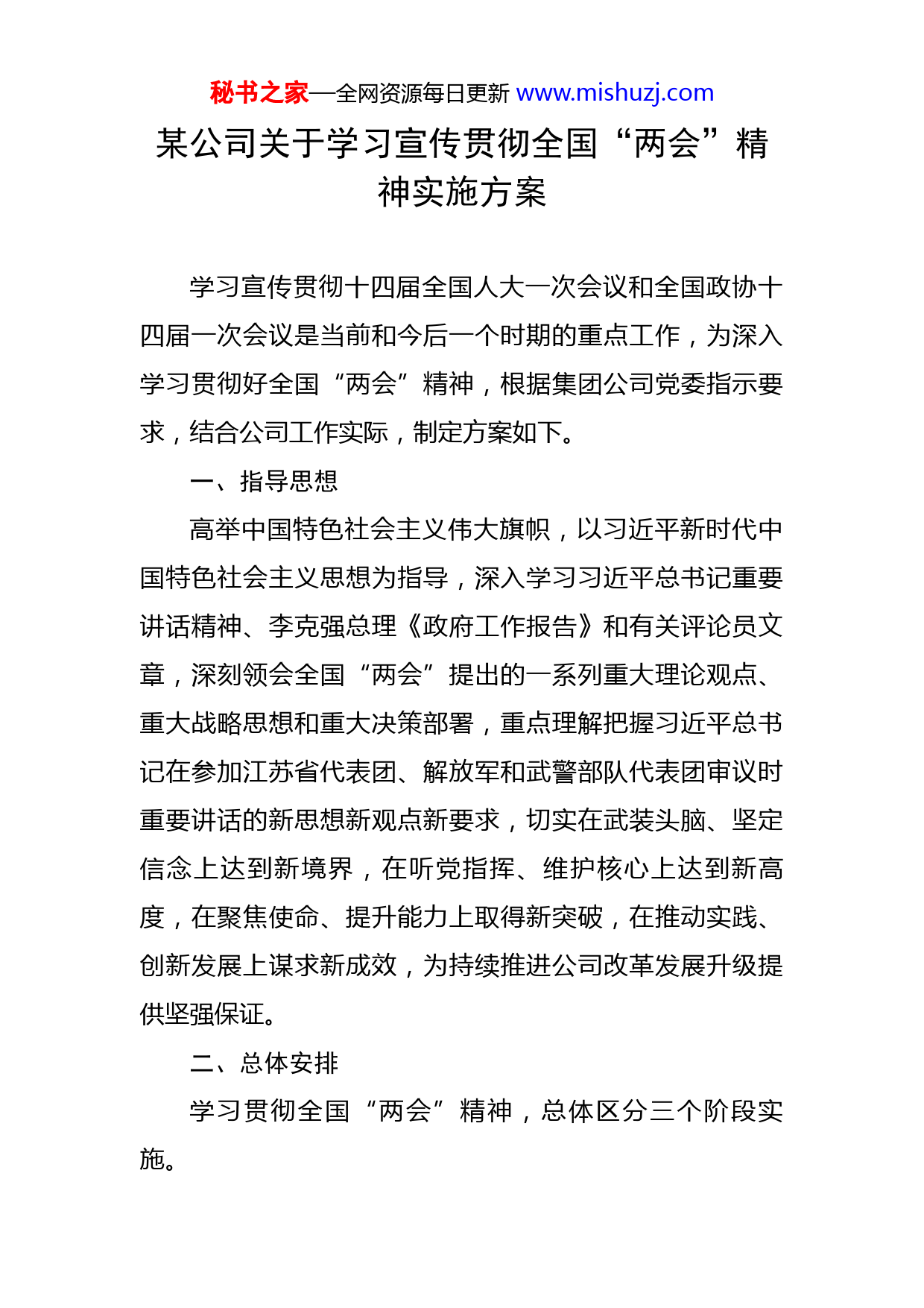 秘书之家—全网资源每日更新www.mishuzj.com某公司关于学习宣传贯彻全国“两会”精神实施方案学习宣传贯彻十四届全国人大一次会议和全国政协十四届一次会议是当前和今后一个时期的重点工作,为深入学习贯彻好全国“两会”精神,根据集团公司党委指示要求,结合公司工作实际,制定方案如下。一、指导思想高举中国特色社会主义伟大旗帜,以习近平新时代中国特色社会主义思想为指导,深入学习习近平总书记重要讲话精神、李克强总理《政府工作报告》和有关评论员文章,深刻领会全国“两会”提出的一系列重大理论观点、重大战略思想和重大决策部署,重点理解把握习近平总书记在参加江苏省代表团、解放军和武警部队代表团审议时重要讲话的新思想新观点新要求,切实在武装头脑、坚定信念上达到新境界,在听党指挥、维护核心上达到新高度,在聚焦使命、提升能力上取得新突破,在推动实践、创新发展上谋求新成效,为持续推进公司改革发展升级提供坚强保证。二、总体安排学习贯彻全国“两会”精神,总体区分三个阶段实施。秘书之家—全网资源每日更新www.mishuzj.com(一)传达学习阶段(3月20日前)一是下发通知。公司办公室制定下发《关于认真组织收听收看和学习全国“两会”精神的通知》,从组织收听收看、区分层次学习、营造浓厚氛围三个方面提出明确要求。二是收听收看。组织全体职工同步收听收看会议盛况,跟进学习主流媒体的新闻报道、报告摘登和相关评论社论,依托“XXX”开展新闻日评和体会交流,并利用公司XX平台、微信公众号等载体,及时反映公司学习动态。三是动员部署。参加集团公司学习贯彻全国“两会”精神视频会议,制定印发《XX公司学习宣传贯彻全国“两会”精神实施方案》,安排部署学习宣传贯彻全国“两会”精神工作。(二)专题学习阶段(4月上旬前)一是党委中心组专题学。公司党委中心组成员要坚持先学一步、学深一层,采取个人自学、集中学习、专题研讨等方式,深入学习习近平总书记在会议期间的系列重要讲话和李克强总理《政府工作报告》等内容,切实以“两会”精神为指导抓好年度工作谋划,深刻总结公司改革发展特别是3年改革发展以来的实践经验,运用理论成果推动公司在新的起点上持续高质量发展。二是班子成员下沉讲。利用联系点帮带时机,组织党秘书之家—全网资源每日更新www.mishuzj.com委班子成员为分公司传达“两会”精神,教育引导广大职工群众主动对标习近平总书记重要讲话精神和《政府工作报告》部署,把“两会”精神融入到全年工作谋划中,落实到日常工作实践中,进一步强化忧患意识,进一步明确目标任务,进一步坚定必胜信心,以钉钉子的钻劲,咬定青山不放松的韧劲,从正在抓的工作抓起,从正在干的事情干起,一步一个脚印,扎扎实实地推动学习贯彻走深走实。(公司各工作组自行组织)三是党校专家来公司讲。邀请市委党校专家到公司围绕深入学习贯彻习近平总书记全国“两会”重要讲话精神,解读2022年政府工作报告要点和扎实做好XX发展工作等三个方面,为公司全体职工作辅导报告,教育引导广大职工群众积极落实党中央、国务院高质量发展的“首要任务”,聚焦公司业务发展任务,时刻保持勇争一流的状态,坚决打赢年度“XXXX”目标任务。四是理论骨干穿插讲。公司机关业务部门,梳理习近平总书记重要讲话精神和《政府工作报告》关键词,在公司公众号开设“两会”学习专题栏目,制作名词解释小卡片和应知应会“口袋书”,发放到每名员工手中,由青年理论骨干利用集会、XX的时间,以通俗的语言、易懂的词语讲解关键词、知识点,并利用点滴时间翻一翻、记一记、考一考,帮助员工坚定信心决心,牢固树立“四个意秘书之家—全网资源每日更新www.mishuzj.com识”,坚决捍卫“两个确立”,自觉强化“四个自信”,始终做到“两个维护”。五是全体员工自主学。编印全国“两会”精神学习资料汇编,公司党委中心组成员,党员干部和职工群众要把全国“两会”精神纳入个人自学计划,切实用好“学习强国”APP指导员工通过阅读文章、视听学习、发表观点、知识答题等形式跟进学、拓展学、持久学。注重发挥典型示范引领作用,广泛开展向XX站和先进典型学习活动,用身边人身边事影响和带动广大职工群众把思想和行动向全国“两会”聚焦。(三)深化学习阶段(4月中旬到年底)坚持学以致用、用以促学,将学习融入实践、进入工作,不断把学习贯彻引向深入。在联系思想实际、凝聚认知认同上,把学习全国“两会”精神作为党委中心组学习、政治教育、党团日的重要内容,运用“XX模式”系统组织学习,深化对“两会”重大理论观点、重大战略思想、重大决策部署的学习理解,教育引导广大员工进一步坚定对以习近平同志为核心的党中央的信赖拥护,进一步增强党带领全国各族人民取得新征程伟大胜利的信心决心。在联系发展实际、夯实能力基础上,深刻学习领会政府工作报告中关于国企改革、绿色发展的总体要求和主要任务,充分认清党中央、国务院对XX工作的高度重视和殷秘书之家—全网资源每日更新www.mishuzj.com切期望进一步提升推进XX体系的使命感责任感。始终坚持“XXX”,自觉站在“XXX”集团的战略定位上谋划、部署、落实年度工作。在联系作风实际、弘扬优良传统上,准