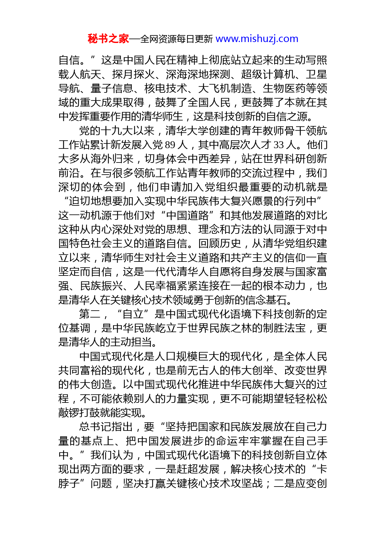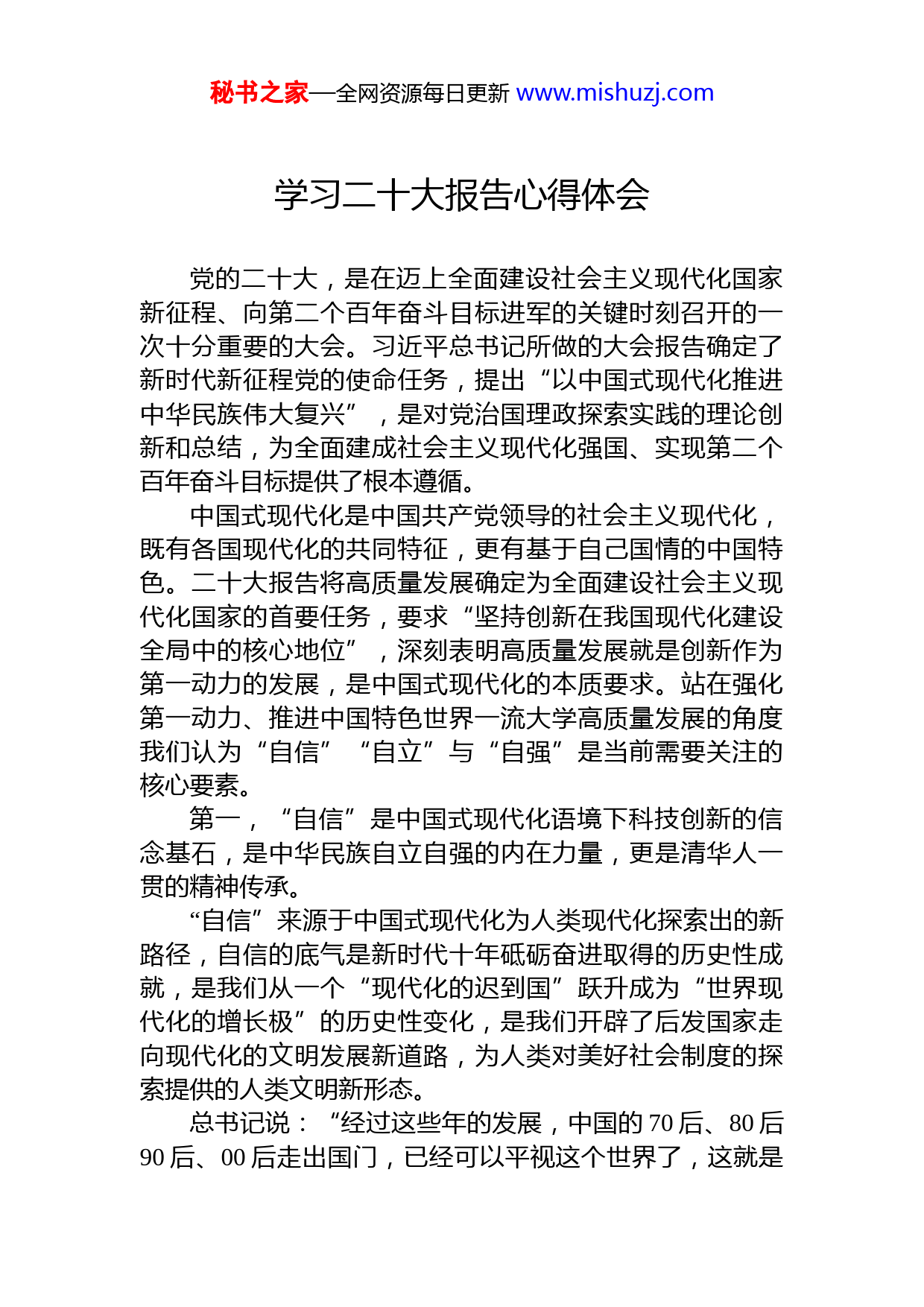秘书之家—全网资源每日更新www.mishuzj.com学习二十大报告心得体会党的二十大,是在迈上全面建设社会主义现代化国家新征程、向第二个百年奋斗目标进军的关键时刻召开的一次十分重要的大会。习近平总书记所做的大会报告确定了新时代新征程党的使命任务,提出“以中国式现代化推进中华民族伟大复兴”,是对党治国理政探索实践的理论创新和总结,为全面建成社会主义现代化强国、实现第二个百年奋斗目标提供了根本遵循。中国式现代化是中国共产党领导的社会主义现代化,既有各国现代化的共同特征,更有基于自己国情的中国特色。二十大报告将高质量发展确定为全面建设社会主义现代化国家的首要任务,要求“坚持创新在我国现代化建设全局中的核心地位”,深刻表明高质量发展就是创新作为第一动力的发展,是中国式现代化的本质要求。站在强化第一动力、推进中国特色世界一流大学高质量发展的角度我们认为“自信”“自立”与“自强”是当前需要关注的核心要素。第一,“自信”是中国式现代化语境下科技创新的信念基石,是中华民族自立自强的内在力量,更是清华人一贯的精神传承。“自信”来源于中国式现代化为人类现代化探索出的新路径,自信的底气是新时代十年砥砺奋进取得的历史性成就,是我们从一个“现代化的迟到国”跃升成为“世界现代化的增长极”的历史性变化,是我们开辟了后发国家走向现代化的文明发展新道路,为人类对美好社会制度的探索提供的人类文明新形态。总书记说:“经过这些年的发展,中国的70后、80后90后、00后走出国门,已经可以平视这个世界了,这就是秘书之家—全网资源每日更新www.mishuzj.com自信。”这是中国人民在精神上彻底站立起来的生动写照载人航天、探月探火、深海深地探测、超级计算机、卫星导航、量子信息、核电技术、大飞机制造、生物医药等领域的重大成果取得,鼓舞了全国人民,更鼓舞了本就在其中发挥重要作用的清华师生,这是科技创新的自信之源。党的十九大以来,清华大学创建的青年教师骨干领航工作站累计新发展入党89人,其中高层次人才33人。他们大多从海外归来,切身体会中西差异,站在世界科研创新前沿。在与很多领航工作站青年教师的交流过程中,我们深切的体会到,他们申请加入党组织最重要的动机就是“迫切地想要加入实现中华民族伟大复兴愿景的行列中”这一动机源于他们对“中国道路”和其他发展道路的对比这种从内心深处对党的思想、理念和方法的认同源于对中国特色社会主义的道路自信。回顾历史,从清华党组织建立以来,清华师生对社会主义道路和共产主义的信仰一直坚定而自信,这是一代代清华人自愿将自身发展与国家富强、民族振兴、人民幸福紧紧连接在一起的根本动力,也是清华人在关键核心技术领域勇于创新的信念基石。第二,“自立”是中国式现代化语境下科技创新的定位基调,是中华民族屹立于世界民族之林的制胜法宝,更是清华人的主动担当。中国式现代化是人口规模巨大的现代化,是全体人民共同富裕的现代化,也是前无古人的伟大创举、改变世界的伟大创造。以中国式现代化推进中华民族伟大复兴的过程,不可能依赖别人的力量实现,更不可能期望轻轻松松敲锣打鼓就能实现。总书记指出,要“坚持把国家和民族发展放在自己力量的基点上、把中国发展进步的命运牢牢掌握在自己手中。”我们认为,中国式现代化语境下的科技创新自立体现出两方面的要求,一是赶超发展,解决核心技术的“卡脖子”问题,坚决打赢关键核心技术攻坚战;二是应变创秘书之家—全网资源每日更新www.mishuzj.com新,提出应对“世所罕见”“史所罕见”挑战的中国方案形成具有全球竞争力的开放创新生态。清华大学始终把服务国家作为最高追求,把攻克国家亟需的重大科技难题作为光荣使命。校党委书记邱勇老师指出:“清华大学永远心怀‘国之大者’,服务国家战略部署和重大需求从不缺席。”一方面,坚持以“四个面向”为根本遵循,以国家战略需求为导向,集聚力量进行原创性引领性科技攻关,自2018年起先后成立航空发动机研究院、万科卫生与健康学院、集成电路学院、碳中和研究院开展相关科研攻关,在关系发展全局和国家安全的基础核心领域取得一系列重要成果。另一方面,积极应对人类共同面对的挑战和全球性技术问题。新冠肺炎疫情发生以来,学校积极响应党中央号召,快速响应、积极作为,组织多支精锐突击队加快抗病毒药物和检测技术的研发,领衔研发了我国首个全自主研发并经过严格对照研究证明有效的抗新冠病毒特效药,并积极向一带一路沿线国家、东南亚国家提供疫苗与抗病毒药物技术研发支持。第三,“自强”是中国式现代化语境下科技创新的力量基点,是中华民族民族精神的重要组成部分,更是清华大学的校风品格。纵观人类史,一个国家往往在两个时期面临的压力最大,一个是积贫积弱之时,一个是发展振兴之时。新中国成立之时面临因侵略、战争和内战导致的极度贫穷和落后经历了东西方两个阵营的敌对和封锁。中国人民秉承自强不息、艰苦奋斗的精神,在极端艰苦的环境下开展国家建设,使新中国一步步从弱小走向强大。当前,摆在中国式现代化道路和中国新发展阶段面前的,是更加动荡的、加速变革的世界大环境