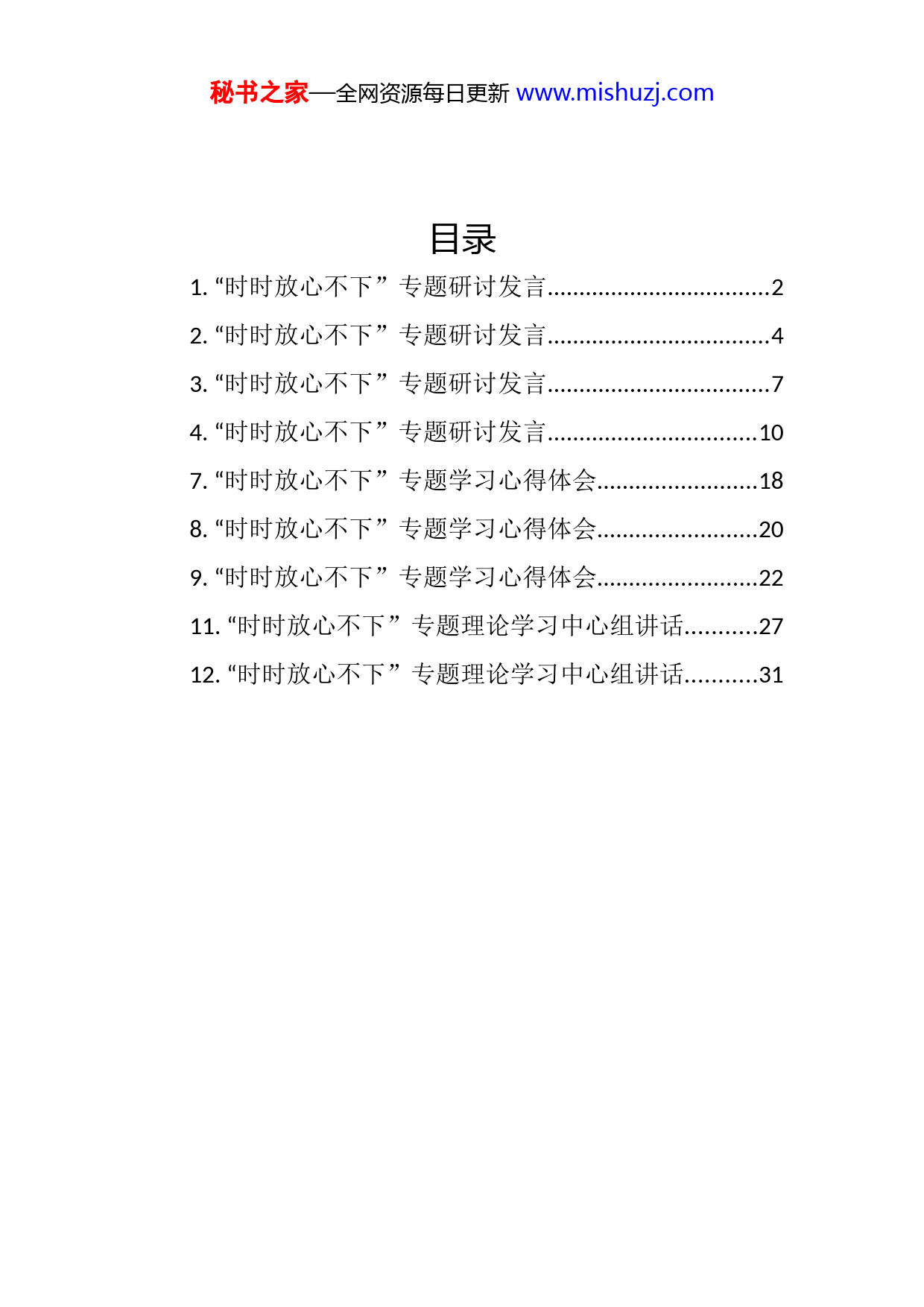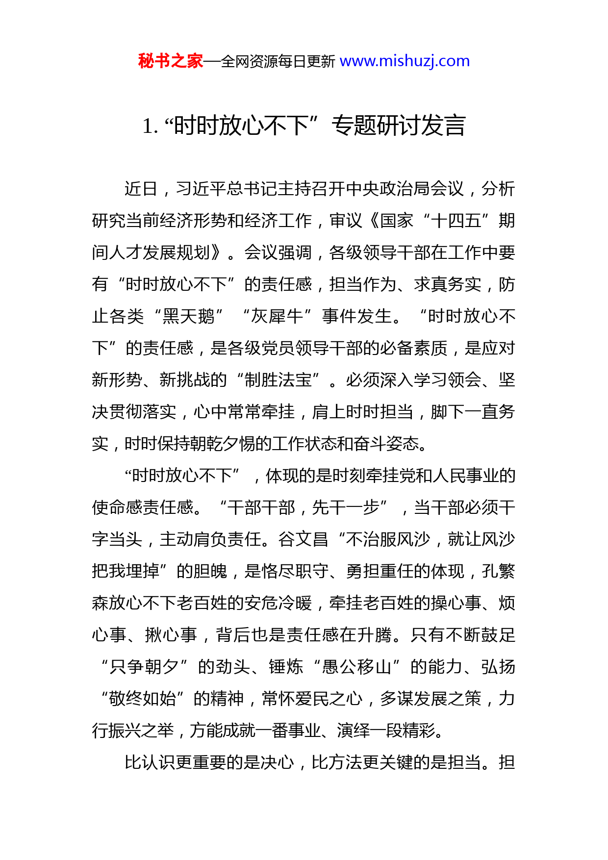 秘书之家—全网资源每日更新www.mishuzj.com目录1.“时时放心不下”专题研讨发言...................................22.“时时放心不下”专题研讨发言...................................43.“时时放心不下”专题研讨发言...................................74.“时时放心不下”专题研讨发言.................................107.“时时放心不下”专题学习心得体会.........................188.“时时放心不下”专题学习心得体会.........................209.“时时放心不下”专题学习心得体会.........................2211.“时时放心不下”专题理论学习中心组讲话...........2712.“时时放心不下”专题理论学习中心组讲话...........31秘书之家—全网资源每日更新www.mishuzj.com1.“时时放心不下”专题研讨发言近日,习近平总书记主持召开中央政治局会议,分析研究当前经济形势和经济工作,审议《国家“十四五”期间人才发展规划》。会议强调,各级领导干部在工作中要有“时时放心不下”的责任感,担当作为、求真务实,防止各类“黑天鹅”“灰犀牛”事件发生。“时时放心不下”的责任感,是各级党员领导干部的必备素质,是应对新形势、新挑战的“制胜法宝”。必须深入学习领会、坚决贯彻落实,心中常常牵挂,肩上时时担当,脚下一直务实,时时保持朝乾夕惕的工作状态和奋斗姿态。“时时放心不下”,体现的是时刻牵挂党和人民事业的使命感责任感。“干部干部,先干一步”,当干部必须干字当头,主动肩负责任。谷文昌“不治服风沙,就让风沙把我埋掉”的胆魄,是恪尽职守、勇担重任的体现,孔繁森放心不下老百姓的安危冷暖,牵挂老百姓的操心事、烦心事、揪心事,背后也是责任感在升腾。只有不断鼓足“只争朝夕”的劲头、锤炼“愚公移山”的能力、弘扬“敬终如始”的精神,常怀爱民之心,多谋发展之策,力行振兴之举,方能成就一番事业、演绎一段精彩。比认识更重要的是决心,比方法更关键的是担当。担秘书之家—全网资源每日更新www.mishuzj.com当是“苟利国家生死以,岂因祸福避趋之”的境界,是“天下兴亡,匹夫有责”的情怀,是“人生自古谁无死,留取丹心照汗青”的气概,更是党员领导干部应有的政治素质、作风特质、工作品质。有“时时放心不下”的责任感,要做到肩上时时有担当,困难面前不退缩、矛盾面前勇向前,该做的事顶着压力必须干,该负的责无论多难都要坚决担,把掣肘社会发展的“硬骨头”一块一块啃掉,把阻碍振兴步伐的“暗礁”一个一个搬开。担当要有底线思维,居安思危、未雨绸缪,把形势想得更复杂一点、把挑战看得更严峻一些,既有如履薄冰的谨慎,又有居安思危的忧患,积极寻求规避系统性风险、化解复杂矛盾、谋求创新发展的路径和方法,真正“托底”“守底”“保底”,做到“时时放心不下”。美好生活不会凭空而来,只有求真务实才能梦想成真。“时时放心不下”,离不开求真务实、苦干实干的工作作风。在右玉,历届班子带领群众治沙育林多年,书写了一部防沙治沙终不悔、誓将沙漠变绿洲的壮丽诗篇;政和县在的带领下,从一个贫困县连续三年跻身省县域经济发展“十佳”。这些美好蜕变的可贵之处,就在于始终发扬求真务实、苦干实干的工作作风,一张蓝图绘到底、一天接着一天干,真正做到时时践行、刻刻坚守。“时时放心不下”,字虽短,意深远。越是关键时刻,秘书之家—全网资源每日更新www.mishuzj.com领导干部越应站得出来、冲得上去,以始终保持夙兴夜寐宵衣旰食的敬业精神,让“时时放心不下”铭于心、践于行。秘书之家—全网资源每日更新www.mishuzj.com2.“时时放心不下”专题研讨发言日前召开的中央政治局会议强调,各级领导干部在工作中要有“时时放心不下”的责任感,担当作为,求真务实,防止各类“黑天鹅”“灰犀牛”事件发生。“时时放心不下”,短短六个字,含义深刻,发人深省。蕴含着“枝叶总关情”的为民宗旨,体现着“岂因祸福避趋之”的责任担当、“安而不忘危”的忧患意识。党员干部必须认真领悟,踏实工作,自觉主动践行。“时时放心不下”,是为民服务宗旨的集中体现,也是对党员干部最基本的要求。“民之所忧,我必念之;民之所盼,我必行之。”为官一任,造福一方的焦裕禄总是在群众有困难的时候挺身而出;初心不改,奋斗不止的申纪兰要和乡亲们在一起,把根永远扎在农村大地上;像对待亲人一样对待群众,处处为群众着想。心系群众鱼得水背离群众树断根。党员干部要心中常常牵挂百姓,“时时放心不下”,始终与人民群众“同坐一条板凳”,做到情感上融入群众,行动上依靠群众,紧扣富民、利民、惠民聚焦就业、教育、养老、医疗、交通等群众“急难愁盼”问题,一件一件抓落实,以看得见的方式,摸得着的实惠不断增强群众获得感、幸福感、安全感。秘书之家—全网资源每日更新www.mishuzj.com“时时放心不下”,是一种义不容辞的精神状态,也是一种勤勉尽责的工作作风。中华民族伟大复兴,绝不是轻轻松松、敲锣打鼓就能实现的。党的事业任重而道远,不允许我们当“甩手掌柜”“天桥把式”,人民的托付重于泰山,不允许我们有所谓的“举重若轻”“信手拈来”。面对当前“防疫情、稳经济、保安全”三大重点工作任务必须强化“政如农工、日夜思之”“晨思夕念、朝乾夕惕”的责任担当,分分秒秒不耽搁,样样事情想争先,