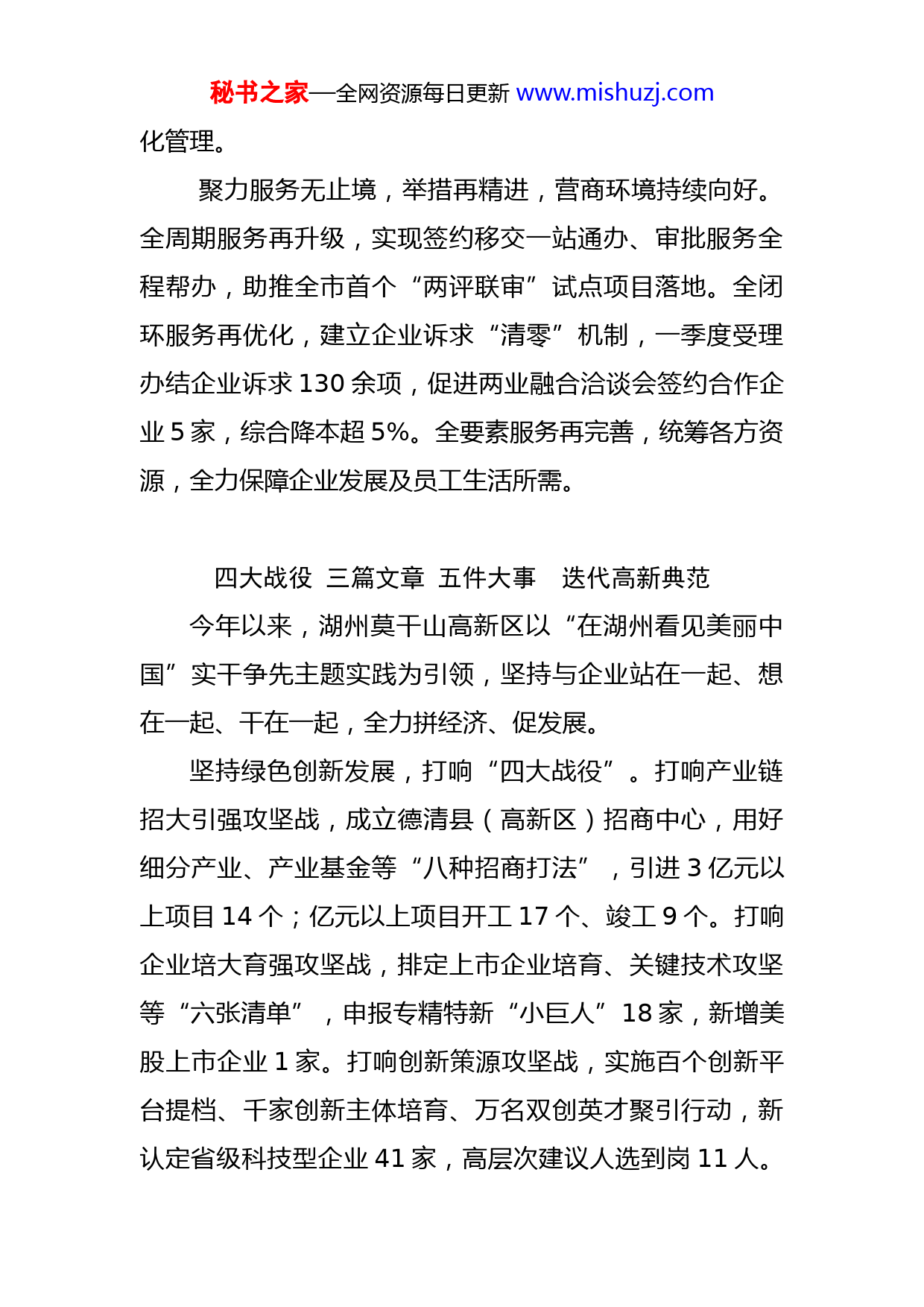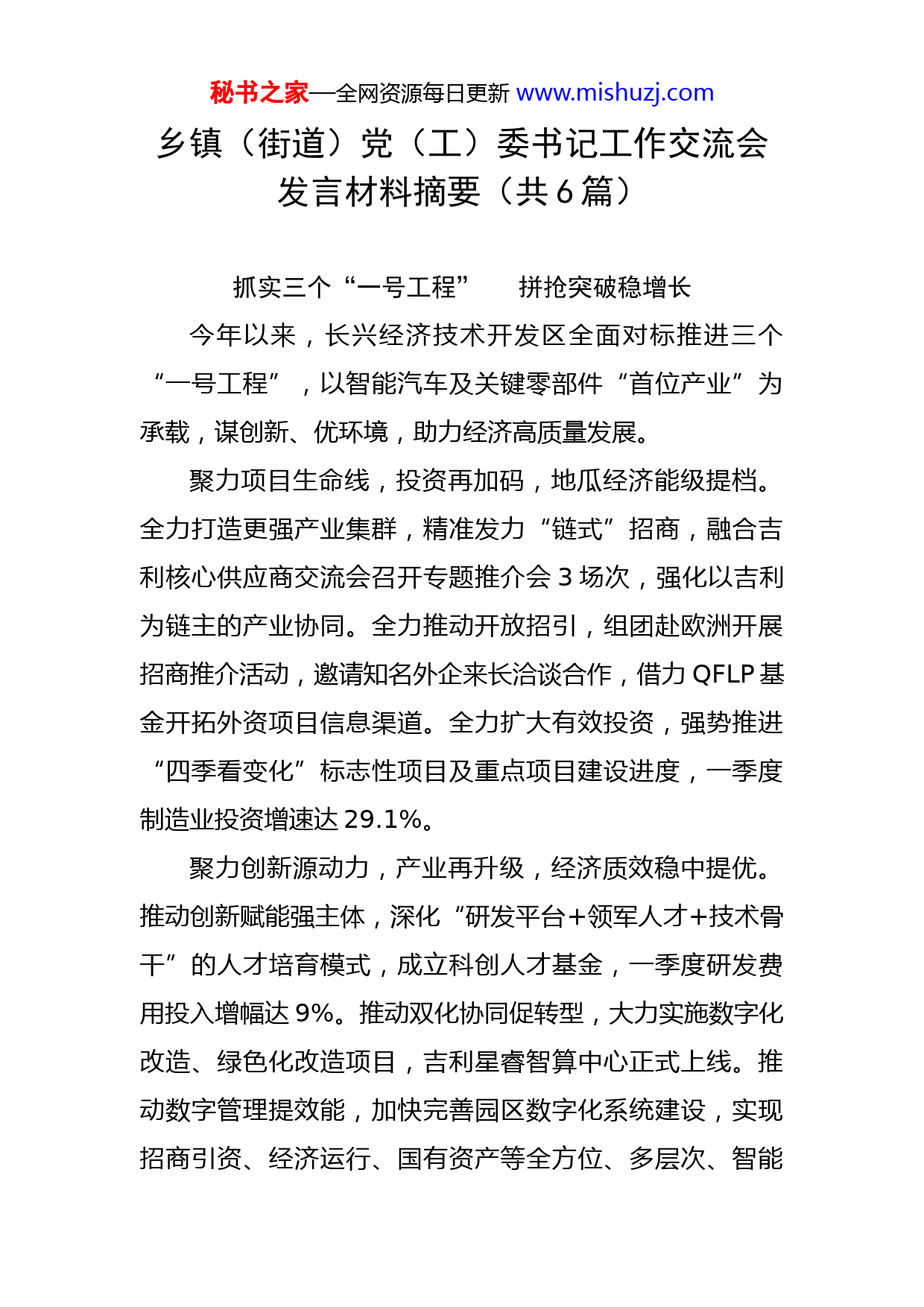 秘书之家—全网资源每日更新www.mishuzj.com乡镇(街道)党(工)委书记工作交流会发言材料摘要(共6篇)抓实三个“一号工程”拼抢突破稳增长今年以来,长兴经济技术开发区全面对标推进三个“一号工程”,以智能汽车及关键零部件“首位产业”为承载,谋创新、优环境,助力经济高质量发展。聚力项目生命线,投资再加码,地瓜经济能级提档。全力打造更强产业集群,精准发力“链式”招商,融合吉利核心供应商交流会召开专题推介会3场次,强化以吉利为链主的产业协同。全力推动开放招引,组团赴欧洲开展招商推介活动,邀请知名外企来长洽谈合作,借力QFLP基金开拓外资项目信息渠道。全力扩大有效投资,强势推进“四季看变化”标志性项目及重点项目建设进度,一季度制造业投资增速达29.1%。聚力创新源动力,产业再升级,经济质效稳中提优。推动创新赋能强主体,深化“研发平台+领军人才+技术骨干”的人才培育模式,成立科创人才基金,一季度研发费用投入增幅达9%。推动双化协同促转型,大力实施数字化改造、绿色化改造项目,吉利星睿智算中心正式上线。推动数字管理提效能,加快完善园区数字化系统建设,实现招商引资、经济运行、国有资产等全方位、多层次、智能秘书之家—全网资源每日更新www.mishuzj.com化管理。聚力服务无止境,举措再精进,营商环境持续向好。全周期服务再升级,实现签约移交一站通办、审批服务全程帮办,助推全市首个“两评联审”试点项目落地。全闭环服务再优化,建立企业诉求“清零”机制,一季度受理办结企业诉求130余项,促进两业融合洽谈会签约合作企业5家,综合降本超5%。全要素服务再完善,统筹各方资源,全力保障企业发展及员工生活所需。四大战役三篇文章五件大事迭代高新典范今年以来,湖州莫干山高新区以“在湖州看见美丽中国”实干争先主题实践为引领,坚持与企业站在一起、想在一起、干在一起,全力拼经济、促发展。坚持绿色创新发展,打响“四大战役”。打响产业链招大引强攻坚战,成立德清县(高新区)招商中心,用好细分产业、产业基金等“八种招商打法”,引进3亿元以上项目14个;亿元以上项目开工17个、竣工9个。打响企业培大育强攻坚战,排定上市企业培育、关键技术攻坚等“六张清单”,申报专精特新“小巨人”18家,新增美股上市企业1家。打响创新策源攻坚战,实施百个创新平台提档、千家创新主体培育、万名双创英才聚引行动,新认定省级科技型企业41家,高层次建议人选到岗11人。秘书之家—全网资源每日更新www.mishuzj.com打响产业园绩效攻坚战,出台产业园中介招商办法,引进企业47家,新增入驻面积7万方。打造最优营商环境,做好“三篇文章”。做好平台能级提升文章,实施平台能级提升“6050”四季看变化专项行动,排定基础设施项目69个,年度计划投资53.68亿元,高新集团获联合国际BBB投资评级。做好最优服务供给文章,发布优化营商环境十条,做到要素保障“全集成”直供、政策兑现“全提速”直达。做好高新铁军锻造文章,让干部到招商一线去、到项目工地去、到助企现场去,形成“一城一圈一园一平台一新区”发展格局。聚焦重大战略融入,抓实“五件大事”。签约落地“地球磁场模拟与监测系统”大科学装置,引进华飞智能、华麦机器人等标志性项目,获批全国县域首个国家级车联网先导区。聚力省部共建地信实验室、筹备地信国际学院、培育地信类技术创新中心。推动省部共办国际“地信周”,举办2023莫干山地理信息高峰论坛。奋进开新局全面打赢项目双进攻坚战南浔经济开发区持续深化“在湖州看见美丽中国”实干争先主题实践,实字当头、干字在先,项目双招双引、平台拓展提升、营商环境优化升级实现有效突破。昂扬斗志,二次创业再出发。全体干部牢固树立“后秘书之家—全网资源每日更新www.mishuzj.com进不可怕、赶超才是勇”的拼抢决心,不破不立、大破大立,翻篇归零二次创业再出发。牢牢咬定三年创成国家级经济开发区的总目标,力争项目增量每年提一档、经济总量三年翻一番。以“一年干成几件事的狠劲”,大抓征迁、大抓招商、大抓项目;以“几年干成一件事的韧劲”,牢牢锁定新能源汽车核心零部件和光电通信半导体两大新兴赛道,加快形成百亿产业。强基固链,招新引优抢先机。以实干争先风起南浔之势,全力打造全省先进、全市一流的现代化产业平台。紧盯新能源汽车核心零部件等战略性新兴产业,坚持外引内育、大小兼顾,引进固投5亿元以上项目7个,其中50亿元以上项目2个,总投资额超去年全年;南洋电机、德易精密等6家本土电机企业加速转型;耀宁固态电池研究院、木蚁机器人等小而精的科技人才项目相继落户。推行“五线并联”机制,以“你急我更急”的工作状态推着项目业主狠抓项目落地,实现项目开工入库12个,竣工6个。实干争先,营商环境拼一流。始终坚持问题导向,动真碰硬做实干部下沉一线,全力做到闻风而动、事不过夜。精选百名干部进百企破百题,政企同心解决问题103个。成立重点项目现场办,实行人员一线办公、问题一线解决、工作一线落实,开工时间平均压缩25%以上。坚持秘书之家—全网资源每日更新www.mishuzj.com严管和厚爱相结合,全面营造“制度管着干部干、干部追着项目转”的浓厚氛围,以干部优良作风换得一流营商环境。担当实干加