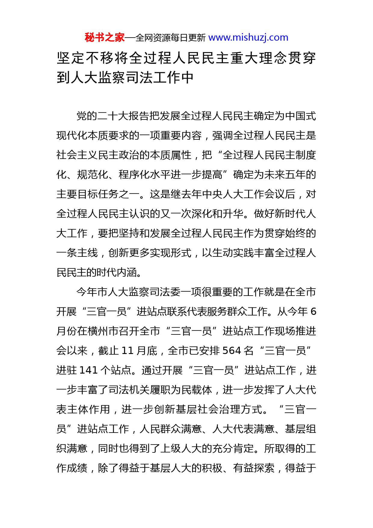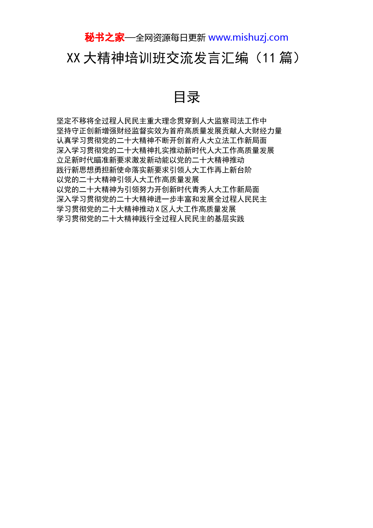 秘书之家—全网资源每日更新www.mishuzj.comXX大精神培训班交流发言汇编(11篇)目录坚定不移将全过程人民民主重大理念贯穿到人大监察司法工作中坚持守正创新增强财经监督实效为首府高质量发展贡献人大财经力量认真学习贯彻党的二十大精神不断开创首府人大立法工作新局面深入学习贯彻党的二十大精神扎实推动新时代人大工作高质量发展立足新时代瞄准新要求激发新动能以党的二十大精神推动践行新思想勇担新使命落实新要求引领人大工作再上新台阶以党的二十大精神引领人大工作高质量发展以党的二十大精神为引领努力开创新时代青秀人大工作新局面深入学习贯彻党的二十大精神进一步丰富和发展全过程人民民主学习贯彻党的二十大精神推动X区人大工作高质量发展学习贯彻党的二十大精神践行全过程人民民主的基层实践秘书之家—全网资源每日更新www.mishuzj.com坚定不移将全过程人民民主重大理念贯穿到人大监察司法工作中党的二十大报告把发展全过程人民民主确定为中国式现代化本质要求的一项重要内容,强调全过程人民民主是社会主义民主政治的本质属性,把“全过程人民民主制度化、规范化、程序化水平进一步提高”确定为未来五年的主要目标任务之一。这是继去年中央人大工作会议后,对全过程人民民主认识的又一次深化和升华。做好新时代人大工作,要把坚持和发展全过程人民民主作为贯穿始终的一条主线,创新更多实现形式,以生动实践丰富全过程人民民主的时代内涵。今年市人大监察司法委一项很重要的工作就是在全市开展“三官一员”进站点联系代表服务群众工作。从今年6月份在横州市召开全市“三官一员”进站点工作现场推进会以来,截止11月底,全市已安排564名“三官一员”进驻141个站点。通过开展“三官一员”进站点工作,进一步丰富了司法机关履职为民载体,进一步发挥了人大代表主体作用,进一步创新基层社会治理方式。“三官一员”进站点工作,人民群众满意、人大代表满意、基层组织满意,同时也得到了上级人大的充分肯定。所取得的工作成绩,除了得益于基层人大的积极、有益探索,得益于秘书之家—全网资源每日更新www.mishuzj.com我市开展的站点深度融合标准化建设之外,很重要的一点就是“三官一员”进站点工作是自觉把全过程人民民主重大理念贯彻落实到全市人大工作全过程各方面,积极创新、勇于实践的结果。此次参加培训班,聆听了专家、领导有关党的二十大精神的辅导,收获颇丰,特别是自治区人大常委会范晓晓莉副主任的专题辅导,为我市人大今后的工作如何全面深入贯彻党的二十大精神进行了精准指导。我们要善于从党的二十大报告的精髓要义中,从晓莉副主任的辅导报告中找思路、找启迪、找答案,把坚持和发展全过程人民民主作为贯穿始终的一条主线,聚焦高质量发展存在的深层次问题、人民群众“急难愁盼”问题,不断提出解决问题的新理念新思路新办法,真正把学习成效转化为推进人大监察司法工作高质量发展的强大动力和实际成效。对明年工作有几点设想:1.开展全市“三官一员”进站点工作调研,协助常委会审议市一级公检法司开展“三官一员”进站点的专项工作报告。2.开展“三官一员”进站点工作观摩现场会,开展星级“三官一员”和星级站点双评选活动。3.加强“三官一员”进站点工作指导,完善进站点工作制度,充分发挥县级人大常委会的人大代表履职平台的督秘书之家—全网资源每日更新www.mishuzj.com查职责。秘书之家—全网资源每日更新www.mishuzj.com坚持守正创新增强财经监督实效为首府高质量发展贡献人大财经力量学习宣传贯彻党的二十大精神,是当前及今后一段时间的首要政治任务。安排的学习党的二十大精神、发展全过程人民民主、平陆运河建设、中国式现代化道路的历史逻辑和理论逻辑的课程,让我们丰富了知识广度和维度。主要有三点学习体会。一、提高政治站位,忠诚捍卫“两个确立”,坚决做到“两个维护”党的二十大期间,习近平总书记参加广西代表团讨论并发表重要讲话,提出了“五个牢牢把握”和“五个更大”重要要求,为我们深入学习贯彻党的二十大精神,奋力谱写中国式现代化广西篇章,提供了战略指引和根本遵循。在实际工作中,我们必须提高政治站位,强化政治意识,始终坚持党的领导,把“两个确立”转化为坚决做到“两个维护”的高度自觉。二、坚持守正创新,增强财经监督实效,践行全过程人民民主学习贯彻落实党的二十大精神,贯彻落实习近平总书记重要讲话精神关键在于真抓实干,根本要求是落地见效。在明年的财经监督工作中,有四个方面的创新考虑:秘书之家—全网资源每日更新www.mishuzj.com(一)创新推出预决算报告“白话解读版”,让代表更看得懂报告。(二)创新推出预算基层联系点,打通财经监督“最后一公里”。在部分城区代表联络站建立预算基层联系点,探索将财经监督业务下沉。(三)创新推出财经监督APP,发挥人大财经联网监督系统作用,实现财经监督的高效和便捷。(四)创新监督调研方式,服务好西部陆海新通道建设和东部产业新城规划建设的持续监督。要抓住国家支持南宁市建设面向东盟开放合作的国际化大都市,跨境产业融合发展合作区带来的契机,协助自治区人大做好对西部陆海新通道建设的监督。