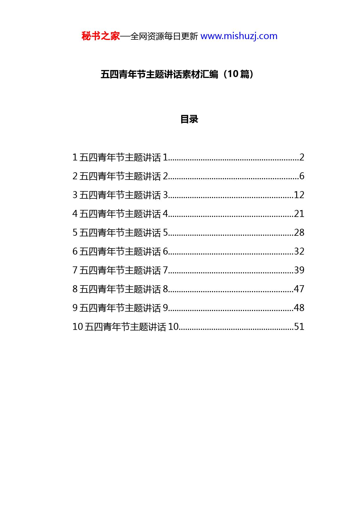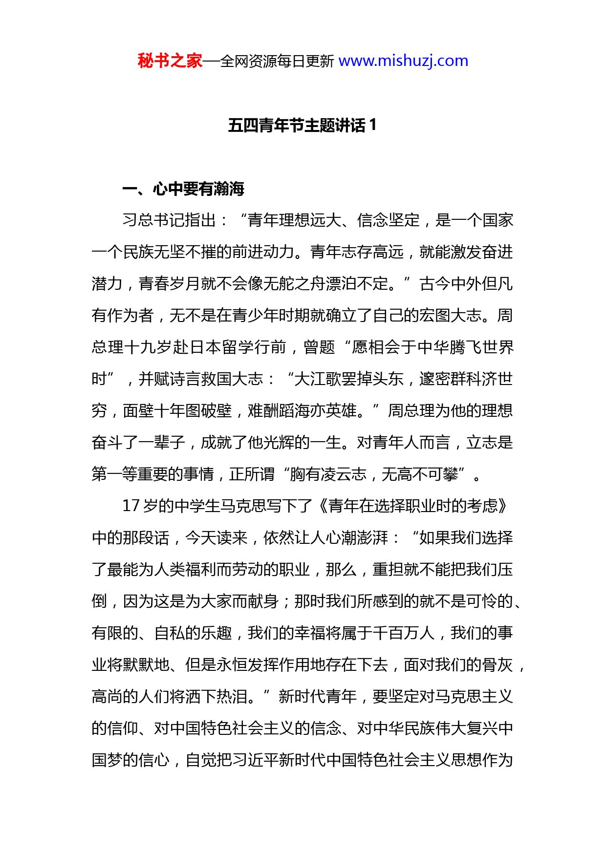 秘书之家—全网资源每日更新www.mishuzj.com五四青年节主题讲话素材汇编(10篇)目录1五四青年节主题讲话1............................................................22五四青年节主题讲话2............................................................63五四青年节主题讲话3.........................................................124五四青年节主题讲话4.........................................................215五四青年节主题讲话5.........................................................286五四青年节主题讲话6.........................................................327五四青年节主题讲话7.........................................................398五四青年节主题讲话8.........................................................479五四青年节主题讲话9.........................................................4810五四青年节主题讲话10.....................................................51秘书之家—全网资源每日更新www.mishuzj.com五四青年节主题讲话1一、心中要有瀚海习总书记指出:“青年理想远大、信念坚定,是一个国家一个民族无坚不摧的前进动力。青年志存高远,就能激发奋进潜力,青春岁月就不会像无舵之舟漂泊不定。”古今中外但凡有作为者,无不是在青少年时期就确立了自己的宏图大志。周总理十九岁赴日本留学行前,曾题“愿相会于中华腾飞世界时”,并赋诗言救国大志:“大江歌罢掉头东,邃密群科济世穷,面壁十年图破壁,难酬蹈海亦英雄。”周总理为他的理想奋斗了一辈子,成就了他光辉的一生。对青年人而言,立志是第一等重要的事情,正所谓“胸有凌云志,无高不可攀”。17岁的中学生马克思写下了《青年在选择职业时的考虑》中的那段话,今天读来,依然让人心潮澎湃:“如果我们选择了最能为人类福利而劳动的职业,那么,重担就不能把我们压倒,因为这是为大家而献身;那时我们所感到的就不是可怜的、有限的、自私的乐趣,我们的幸福将属于千百万人,我们的事业将默默地、但是永恒发挥作用地存在下去,面对我们的骨灰,高尚的人们将洒下热泪。”新时代青年,要坚定对马克思主义的信仰、对中国特色社会主义的信念、对中华民族伟大复兴中国梦的信心,自觉把习近平新时代中国特色社会主义思想作为秘书之家—全网资源每日更新www.mishuzj.com人生远航的“指路明灯”,坚定不移听党话、跟党走,把“个人梦”植根于伟大的“中国梦”,把自身成长进步与xx高质量发展的生动实践紧密联系,让理想信念在创业奋斗中升华,让青春在创新创造中闪光。二、眼前正是蓝海当今世界面临百年未有之大变局,孕育着千载难逢的发展机遇,也蕴含着复杂严峻的风险挑战,伟大的时代为广大青年展现了一片广阔的蓝海。这是新一轮科技革命和产业变革的蓝海,信息技术、生命科学、智能制造、绿色能源等前沿领域不断突破,新材料、新产品、新业态迭代周期不断缩短,大数据、3D打印、人工智能已经融入人们的衣食住行用。未来已来,莫负韶华。要牢记习总书记的教诲,努力学习掌握科学知识,提高内外素质,锤炼过硬本领,使自己的思维视野、思想观念、认识水平跟上越来越快的时代发展。这是一系列重大战略机遇叠加的蓝海,“一带一路”建设、长江经济带高质量发展、长三角区域一体化发展等国家战略机遇在xx交汇叠加,长江经济带大健康产业集聚发展试点、国家金融改革试点正稳步推进,北沿江高铁正加快前期准备工作,等等,都给我们带来诸多的创业利好。可以说,当今的xx为广大青年展露才华、大显身手提供了广阔的舞台。这是xx高质量发展的蓝海,我市综合实力升至全国地级以上城市第41位,营商环境跻身全省第一方阵,新时代科技新长征集成出台“80条新政”,“向环境污染宣秘书之家—全网资源每日更新www.mishuzj.com战”取得了前所未有的进展,等等。可以说,沐浴着新时代春风的xx,风景这边更好。百舸争流,奋楫者先。xx青年要勇做只争朝夕的奋进者、上下求索的开拓者、舍我其谁的奉献者,才能够搏击蓝海、成就大业。三、挂帆直济沧海习总书记深情指出:“奋斗是青春最亮丽的底色。”“人的一生只有一次青春。现在,青春是用来奋斗的;将来,青春是用来回忆的。”青年朋友们,要努力做好三个方面:一要有原则底线,不能迷失方向。五四运动的这一百年,就是一群青年人选择的历史、奋斗的历史、奉献的历史。从五四运动以来历史发展的必然中,从中国发展道路的探索中,我们要更加坚定正确的政治方向,更加坚定加强党对一切工作的领导,更加坚定习近平新时代中国特色社会主义思想这一根本遵循,更加坚定走好中国特色社会主义道路,这是任何时候都不能动摇的,否则就会迷失方向,甚至误入歧途。对一个国家、对一个政党、对一个地区是这样,对一个青年人的成长也是如此,任何时候都要有原则底线。二要能吃苦不怕吃亏。一个人一生最好的机会大多来自苦拼。习总书记在七年知青岁月里,从“扁担把他的肩膀磨得一层一层掉皮、出血”到“肩膀上磨出了厚厚的茧子,就不怕扁担磨了”;从一开始劳动“连婆姨都不如的每天五六个工分”到两年以后“拿到壮劳力的10个工分,成了种地的好把式”;秘书之家—全网资源每日更新www.mishuzj.com从一开始一群知青坐在窑洞里,到最后一个个都走了,只留下他一个;从他带了好几箱的书在窑洞里钻研,到今天教导我们读书要“学原著、读