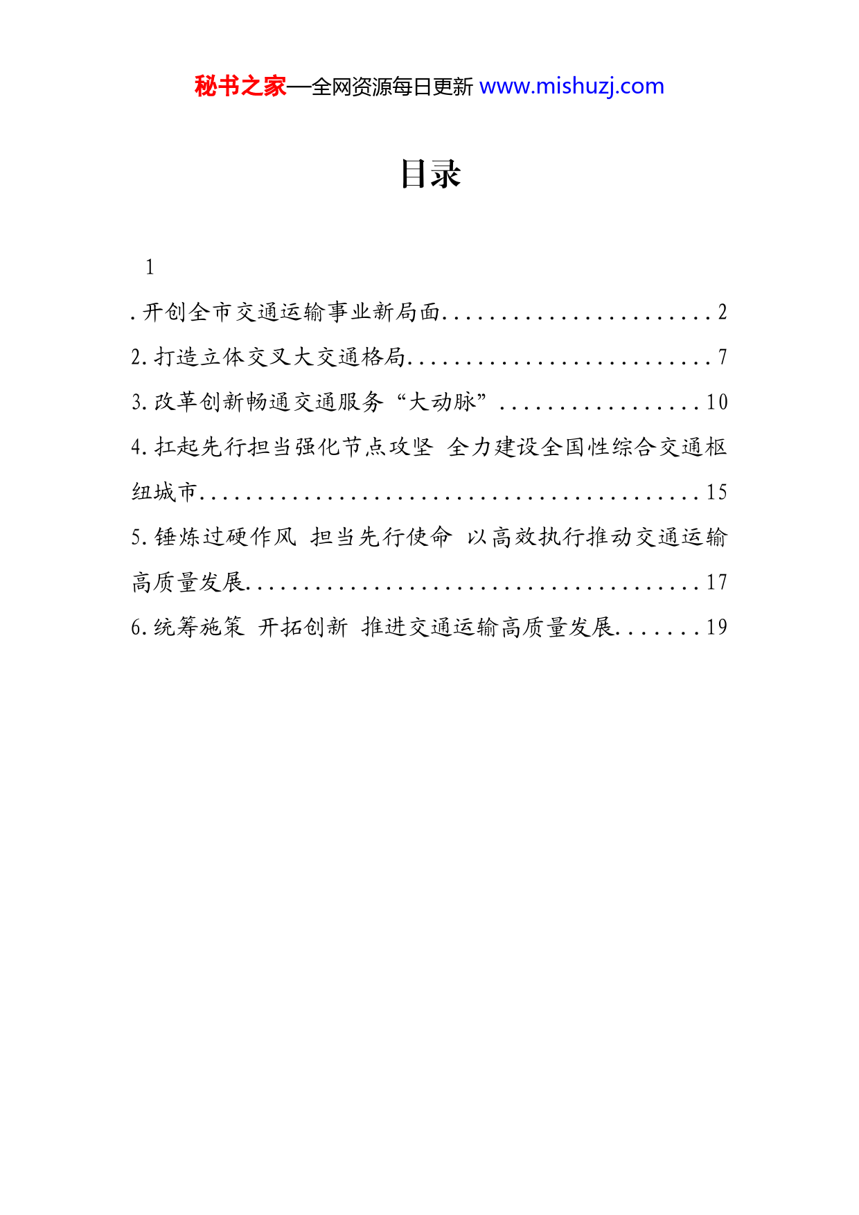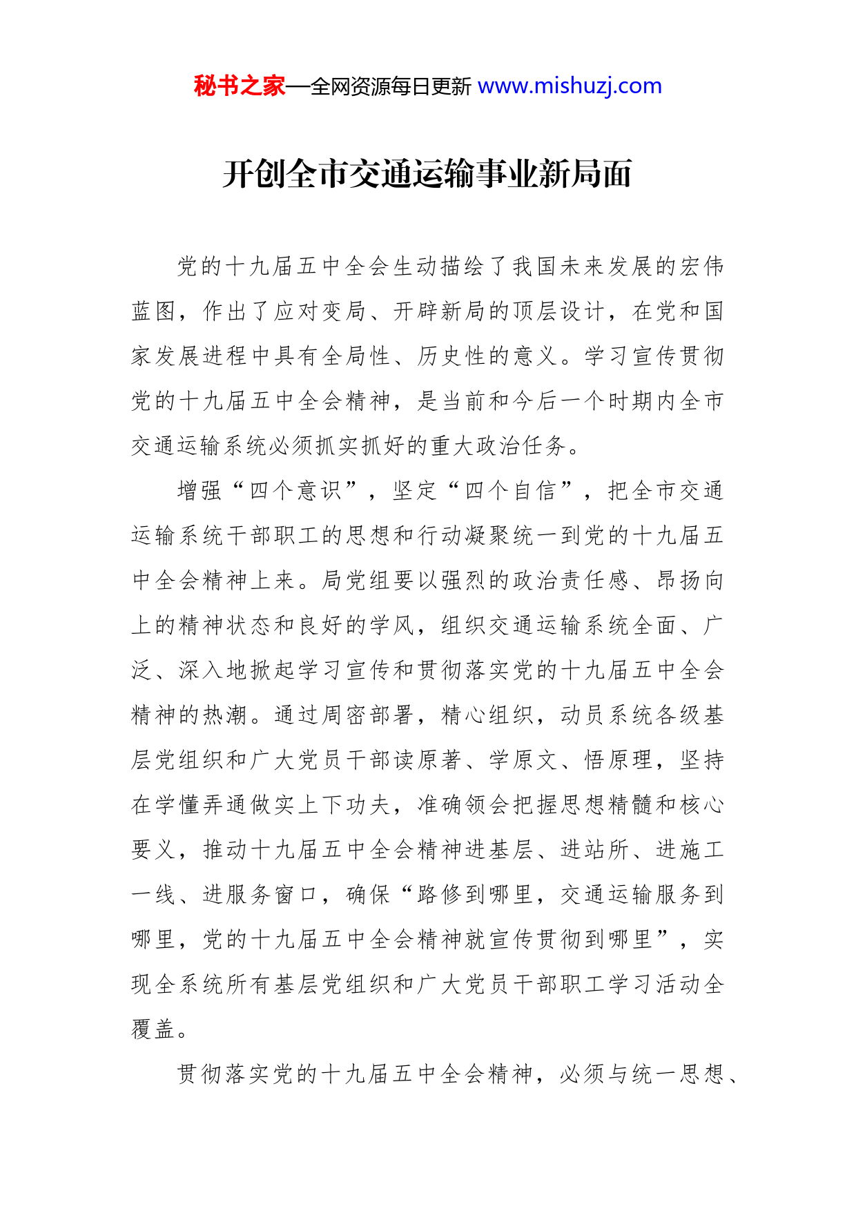 秘书之家—全网资源每日更新www.mishuzj.com目录1.开创全市交通运输事业新局面.......................22.打造立体交叉大交通格局..........................73.改革创新畅通交通服务“大动脉”.................104.扛起先行担当强化节点攻坚全力建设全国性综合交通枢纽城市...........................................155.锤炼过硬作风担当先行使命以高效执行推动交通运输高质量发展.......................................176.统筹施策开拓创新推进交通运输高质量发展.......19秘书之家—全网资源每日更新www.mishuzj.com开创全市交通运输事业新局面党的十九届五中全会生动描绘了我国未来发展的宏伟蓝图,作出了应对变局、开辟新局的顶层设计,在党和国家发展进程中具有全局性、历史性的意义。学习宣传贯彻党的十九届五中全会精神,是当前和今后一个时期内全市交通运输系统必须抓实抓好的重大政治任务。增强“四个意识”,坚定“四个自信”,把全市交通运输系统干部职工的思想和行动凝聚统一到党的十九届五中全会精神上来。局党组要以强烈的政治责任感、昂扬向上的精神状态和良好的学风,组织交通运输系统全面、广泛、深入地掀起学习宣传和贯彻落实党的十九届五中全会精神的热潮。通过周密部署,精心组织,动员系统各级基层党组织和广大党员干部读原著、学原文、悟原理,坚持在学懂弄通做实上下功夫,准确领会把握思想精髓和核心要义,推动十九届五中全会精神进基层、进站所、进施工一线、进服务窗口,确保“路修到哪里,交通运输服务到哪里,党的十九届五中全会精神就宣传贯彻到哪里”,实现全系统所有基层党组织和广大党员干部职工学习活动全覆盖。贯彻落实党的十九届五中全会精神,必须与统一思想、秘书之家—全网资源每日更新www.mishuzj.com凝聚力量紧密结合起来。党的十九届五中全会擘画了我国“十四五”规划和二〇三五年远景目标,为我们确立了新的奋斗的目标,是我们做好当前和今后一个时期内各项工作的行动指南。交通运输系统的各级基层党组织和广大党员干部必须旗帜鲜明地讲政治,切实把思想和行动统一到党的十九届五中全会精神上来。系统各级基层党组织要充分发挥好领导核心作用,教育和引导系统广大党员干部对党的十九届五中全会精神在思想上高度认同,政治上坚决维护,组织上自觉服从,行动上紧紧跟随,坚定不移地让十九届五中全会精神在交通运输系统落地生根、开花结果。贯彻落实党的十九届五中全会精神,必须与联系实际、推动工作紧密结合起来。交通工作者要在思想上政治上行动上同党中央的决策部署保持高度一致,特别要对照党的十九届五中全会的新要求,把建设交通强国和习近平总书记关于建好“四好农村路”的一系列指示精神重新梳理一遍。与此同时要结合交通运输工作实际,主动对号入座,做好贯穿结合,做好规划研究。党的十九大提出了建设交通强国的重大战略目标,赋予了新时代交通运输工作者新使命和新任务。党的十九届五中全会提出的关于制定“十四五”规划和二〇三五年远景目标的重要思想和重大举措对我们当前正在奋力建设交通强国又提出了新要求。我们要迅速把十九届五中全会精神转化为交通运输系统上下统秘书之家—全网资源每日更新www.mishuzj.com一思想、真抓实干的指导思想和精神动力。面临新形势,我们要重新规划好交通运输工作的新目标。结合我市实际,今后一段时间交通运输工作要以先行引领、适度超前为原则,努力实现公路运输能力适度超前配置,充分发挥公路对经济发展、民生改善的支撑引领作用;要以坚持服务民生和精准扶贫为原则,率先实现落后地区和贫困地区公路建设的新突破;要以统筹兼顾、协调发展为原则,综合各种交通运输方式协调发展,努力实现多种交通运输方式的“无缝衔接”,切实做到先行、做实尽责,当好经济社会发展的先行。面临新形势,我们要认真谋划好交通运输工作的新思路。“十四五”时期是我国全面建成小康社会、实现第一个百年奋斗目标之后,乘势而上开启全面建设社会主义现代化国家新征程、向第二个百年奋斗目标进军的第一个五年。我们要紧紧深入落实《交通强国建设纲要》任务要求积极融入“一带一路”、京津冀协调发展等国家重大战略对接蒙俄欧、助推xx、优化xx,以构建现代化综合交通运输体系为主线,以深化改革为动力,以绿色低碳生态保护为前提,着力提升交通运输服务水平,使交通运输业成为xx先行发展的基础产业,为经济社会快速发展提供支撑和保障。面临新形势,我们要体现出新时代交通运输工作的新秘书之家—全网资源每日更新www.mishuzj.com作为。总体目标是到xxxx年,基本形成“互联互通、便捷高效、智慧安全、生态绿色”的高质量公路水路交通运输体系。基础设施网络更加完善;管养运输服务更加优质;公共交通服务水平进一步提高;智慧交通、平安交通和绿色交通深度融合;行业治理体系和治理能力现代化水平不断增强;改革与创新驱动交通事业持续发展。全力支撑和引领xx市国民经济和社会发展,为全面开启交通强国建设提供强有力的交通运输保障。预计到“十四五”末,新增高速公路xxx公里,全市高速公路通车里程达到xxxx公里以上,xx境内高速公路网全面贯通,高速公路旗县(市、区)覆盖率达xx%;全市公路通车总里程约达到x.xx