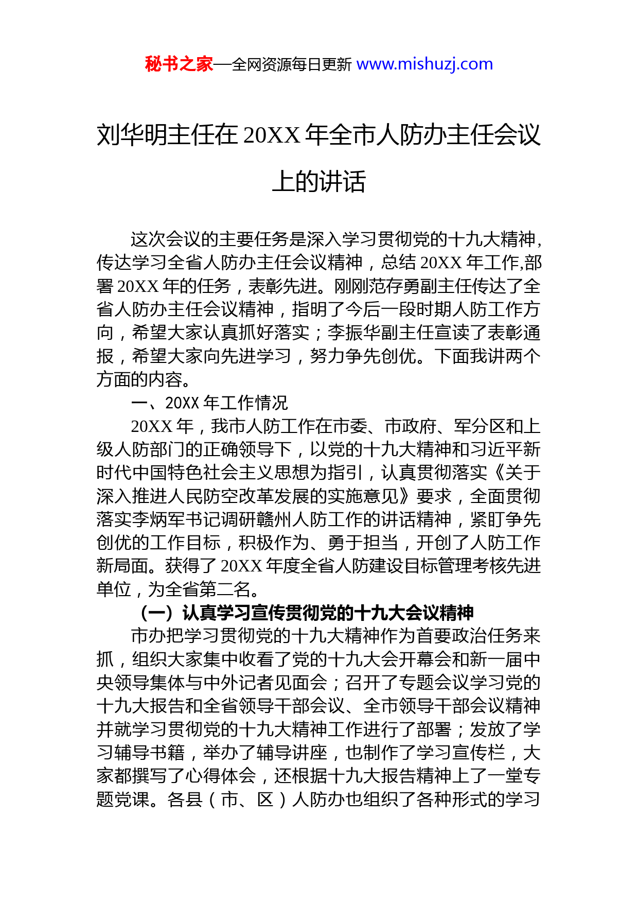 秘书之家—全网资源每日更新www.mishuzj.com人防办领导讲话汇编(2篇)目录1.刘华明主任在20XX年全市人防办主任会议上的讲话22.市人防办党组书记、主任李更生在市人防办创建全国文明城市工作推进会上的讲话....................................16秘书之家—全网资源每日更新www.mishuzj.com刘华明主任在20XX年全市人防办主任会议上的讲话这次会议的主要任务是深入学习贯彻党的十九大精神,传达学习全省人防办主任会议精神,总结20XX年工作,部署20XX年的任务,表彰先进。刚刚范存勇副主任传达了全省人防办主任会议精神,指明了今后一段时期人防工作方向,希望大家认真抓好落实;李振华副主任宣读了表彰通报,希望大家向先进学习,努力争先创优。下面我讲两个方面的内容。一、20XX年工作情况20XX年,我市人防工作在市委、市政府、军分区和上级人防部门的正确领导下,以党的十九大精神和习近平新时代中国特色社会主义思想为指引,认真贯彻落实《关于深入推进人民防空改革发展的实施意见》要求,全面贯彻落实李炳军书记调研赣州人防工作的讲话精神,紧盯争先创优的工作目标,积极作为、勇于担当,开创了人防工作新局面。获得了20XX年度全省人防建设目标管理考核先进单位,为全省第二名。(一)认真学习宣传贯彻党的十九大会议精神市办把学习贯彻党的十九大精神作为首要政治任务来抓,组织大家集中收看了党的十九大会开幕会和新一届中央领导集体与中外记者见面会;召开了专题会议学习党的十九大报告和全省领导干部会议、全市领导干部会议精神并就学习贯彻党的十九大精神工作进行了部署;发放了学习辅导书籍,举办了辅导讲座,也制作了学习宣传栏,大家都撰写了心得体会,还根据十九大报告精神上了一堂专题党课。各县(市、区)人防办也组织了各种形式的学习秘书之家—全网资源每日更新www.mishuzj.com宣传贯彻活动。通过学习和研究,为人防事业发展明确了方向,为解决人防建设中遇到的难题提供了思路。(二)积极开展人防工程建设一是人防结建工程建设成效显著。20XX年市本级批准修建防空地下室万平方米,县级人防审批人防工程面积万平方米。通过主体结构验收面积为万余平方米,为省人防办下达的年度工作任务的175%,市县两级共收取易地建设费亿元,创历史最高水平。在全省率先推进专业队工程建设,市本级1个医疗救护站工程、2个抢险抢修专业队工程已建成投入使用,3个急救医院工程完成了主体验收,2个抢险抢修专业队工程完成主体施工,1个急救医院工程及6个项目的抢险抢修、防化防疫等专业队人防工程在施工建设。会昌县引进PPP模式建设的1个急救医院工程正在施工,于都县人防办投资的1个医疗救护站工程完成图纸设计;龙南县人防办投资的1个医疗救护站和1个抢险抢修专业队工程完成了设计招标。二是人防指挥工程建设不断推进。定南县、崇义县、全南处于室内装修和信息系统集成项目工程建设阶段,20XX年上半年竣工验收交付使用;经开区已完成主体施工;寻乌、安远县正在进行基础施工;宁都县和于都县已开挖土方;南康区已完成项目地勘,处于施工图设计;信丰县已列入20XX年重点工程建设目录,力争20XX年上半年开工建设。三是人防工程质量监督落实严格。20XX年全市共受理88个项目的质量监督报监工作,巡查核查人防地下室项目95个,检查工地380多次、出具核查记录160余份,对发现的质量问题都监督其落实整改。8月份组织了全市人防质监技术人员和人防监理、设备企业技术人员开展了人防质监业务培训,为县级质监人员独立开展质监工作打好基础培训结束后还组织了结业考试,考试合格的人防企业人员发放了人防监理员上岗证、防护设备安装施工员上岗证。秘书之家—全网资源每日更新www.mishuzj.com兴国县成立了“人防工程质监站”,瑞金、兴国等六个县(市、区)已开始受理网上报监。四是全面开展早期人防工程巡查整治工作。20XX年共巡查早期人防工事240次,开展人防地下停车场、人防设备维护保养监督管理30次,防汛抗旱监督检查20次,并做好巡查记录,发现问题及时报告、及时处理。积极做好老人防工事安全隐患摸排工作,成立了领导小组和安全质量评定小组进行拉网式排查,邀请广东人防设计院有关专家就我市早期人防工程进行全面“体检”,提出了综合整治实施方案。投资1450万元对2.1公里红旗大道西段早期人防工程进行了维修改造,投资122万元对两处早期人防工程洞口房进行了维修改造。(二)全面推进人防融合发展一是积极建设自建人防工程。20XX年市办启动了市体育中心地下人防工程和J2地块公园绿地地下人防工程两个自建工程项目,市体育中心项目已完成开工前的各项准备工作;J2地块公园绿地地下人防工程项目正在进行土方开挖。部分县(市、区)也启动了人防单建工程项目,如南康区体育公园地下人防工程项目完成了主体施工,兴国县启动了民兵军事训练基地和高铁站广场人防工程项目,龙南县启动了体育公园地下人防工程项目,于都县启动了永红片区棚户区改造人防工程项目。二是主动对接市政公用民生工程。20XX年我市计划在中心城区建设13个地面为休闲公园、地下为公共停车场的小游园民生项目。市办了解后及时与筹建单位对接沟通,筹建单位最终同意按总面积40%的比例提高建设标准,以二等人掩功能为主修建防空