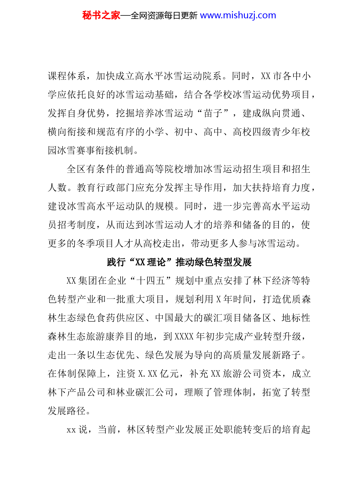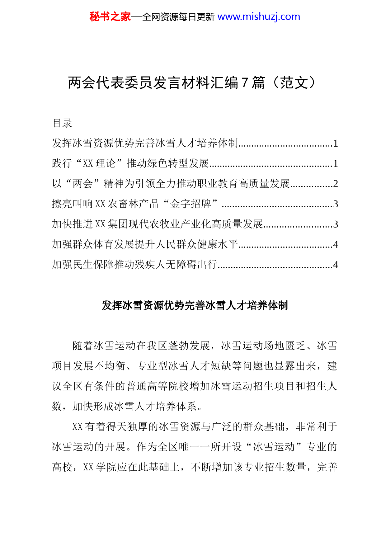 秘书之家—全网资源每日更新www.mishuzj.com两会代表委员发言材料汇编7篇(范文)目录发挥冰雪资源优势完善冰雪人才培养体制....................................1践行“XX理论”推动绿色转型发展...............................................1以“两会”精神为引领全力推动职业教育高质量发展................2擦亮叫响XX农畜林产品“金字招牌”..........................................3加快推进XX集团现代农牧业产业化高质量发展..........................3加强群众体育发展提升人民群众健康水平....................................4加强民生保障推动残疾人无障碍出行............................................4发挥冰雪资源优势完善冰雪人才培养体制随着冰雪运动在我区蓬勃发展,冰雪运动场地匮乏、冰雪项目发展不均衡、专业型冰雪人才短缺等问题也显露出来,建议全区有条件的普通高等院校增加冰雪运动招生项目和招生人数,加快形成冰雪人才培养体系。XX有着得天独厚的冰雪资源与广泛的群众基础,非常利于冰雪运动的开展。作为全区唯一一所开设“冰雪运动”专业的高校,XX学院应在此基础上,不断增加该专业招生数量,完善秘书之家—全网资源每日更新www.mishuzj.com课程体系,加快成立高水平冰雪运动院系。同时,XX市各中小学应依托良好的冰雪运动基础,结合各学校冰雪运动优势项目,发挥自身优势,挖掘培养冰雪运动“苗子”,建成纵向贯通、横向衔接和规范有序的小学、初中、高中、高校四级青少年校园冰雪赛事衔接机制。全区有条件的普通高等院校增加冰雪运动招生项目和招生人数。教育行政部门应充分发挥主导作用,加大扶持培育力度,建设冰雪高水平运动队的规模。同时,进一步完善高水平运动员招考制度,从而达到冰雪运动人才的培养和储备的目的,使更多的冬季项目人才从高校走出,带动更多人参与冰雪运动。践行“XX理论”推动绿色转型发展XX集团在企业“十四五”规划中重点安排了林下经济等特色转型产业和一批重大项目,规划利用X年时间,打造优质森林生态绿色食药供应区、中国最大的碳汇项目储备区、地标性森林生态旅游康养目的地,到XXXX年初步完成产业转型升级,走出一条以生态优先、绿色发展为导向的高质量发展新路子。在体制保障上,注资X.XX亿元,补充XX旅游公司资本,成立林下产品公司和林业碳汇公司,理顺了管理体制,拓宽了转型发展路径。xx说,当前,林区转型产业发展正处职能转变后的培育起秘书之家—全网资源每日更新www.mishuzj.com步期,XX集团在全面停伐之后收入能力下降,且在历次改革中承担了大量改革成本,自我发展能力不足,难以独立完成林区改革转型使命,需要上级和属地政府持续加大支持力度,助力转型攻坚。自治区人民政府加强组织领导,成立组织机构,统筹资源力量,形成推动林区转型发展的强大合力;积极落实规划相关支持政策,搭建平台,联合金融机构设立地方性林业产业发展基金;建立国家重点生态功能区转移支付资金地方、林业共享机制;在年度国有资本经营预算中对XX集团转型发展给予侧重支持;在自治区级招商引资工作中,将XX集团作为重点企业进行推介,多措并举提高企业转型发展内生动力,为自治区兴边富民提供强大支撑。以“两会”精神为引领全力推动职业教育高质量发展自治区《政府工作报告》中提到,要实施职业教育‘双高’、双优计划,推动部区共建‘技能XX’,对接重点产业和市场需求深化产教融合、校企合作。这为办好新时代职业教育指明了前进方向,我们要以‘两会’精神为引领,全力推动职业教育高质量发展。推进职业教育高质量发展,必须始终把立德树人作为根本任务。要巩固党史学习教育成果,把思想政治教育、“三全育秘书之家—全网资源每日更新www.mishuzj.com人”、铸牢中华民族共同体意识和意识形态责任制落实落地。“要扎实推进‘六稳’‘六保’,全力做好大中专毕业生就业工作。”张廷表示,做好高校毕业生就业工作是重要的政治任务和民生底线。今年,首届扩招生即将毕业,受疫情影响,既要确保绝大多数扩招生如期毕业,还要同等对待搞好就业服务,尤其要实施好自治区出台的XX条政策措施,多渠道扩大求职岗位,确保毕业生就业率。要不断深化校企合作、产教融合,尝试与XXXX集团共建混合所有制产业学院。”张廷建议,继续柔性引智引才,加强与高校、科研院所的沟通,借助科研技术力量,以XXXX得天独厚的资源优势和国有集体的经营优势,集中力量办大事,搞试点,做科研,建模式,出样板。学院拟在无人机技术、农业XX、畜牧业良种繁育与模式化养殖、XX药良种培育与栽培等方面合作共建农牧业产业学院,同时辐射和服务XX农牧业人才培养培训,加快推动农牧业现代化发展。擦亮叫响XX农畜林产品“金字招牌”自治区《政府工作报告》中提到,要大力推进农畜产品生产基地优质高效转型,‘两会’期间,我提出了《关于加大我区农畜林产品品牌建设与推广力度的建议》。XX农畜林产品种类丰富、产量大,其中,野生果品制品、秘书之家—全网资源每日更新www.mishuzj.com油料植物制品、淀粉植物制品、食用植物制品、野生食药用菌制品以及XX大草原久负盛名的牛羊肉、XX湖鱼类产品等,深受国内外广大消费者青睐,市场消费潜力巨大。但XX的农畜林产品与国内同类知名产品相比,却远未形成品牌含金量。XX应以品牌化建设