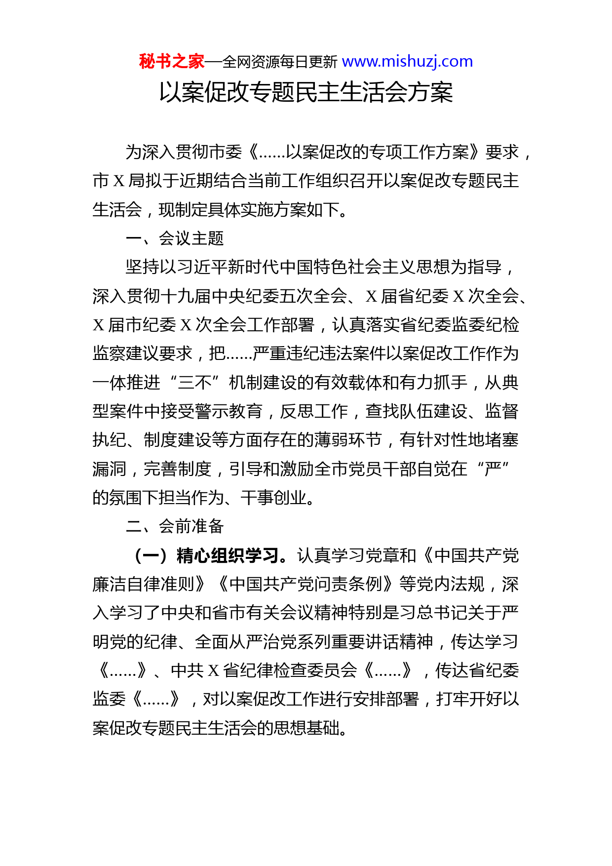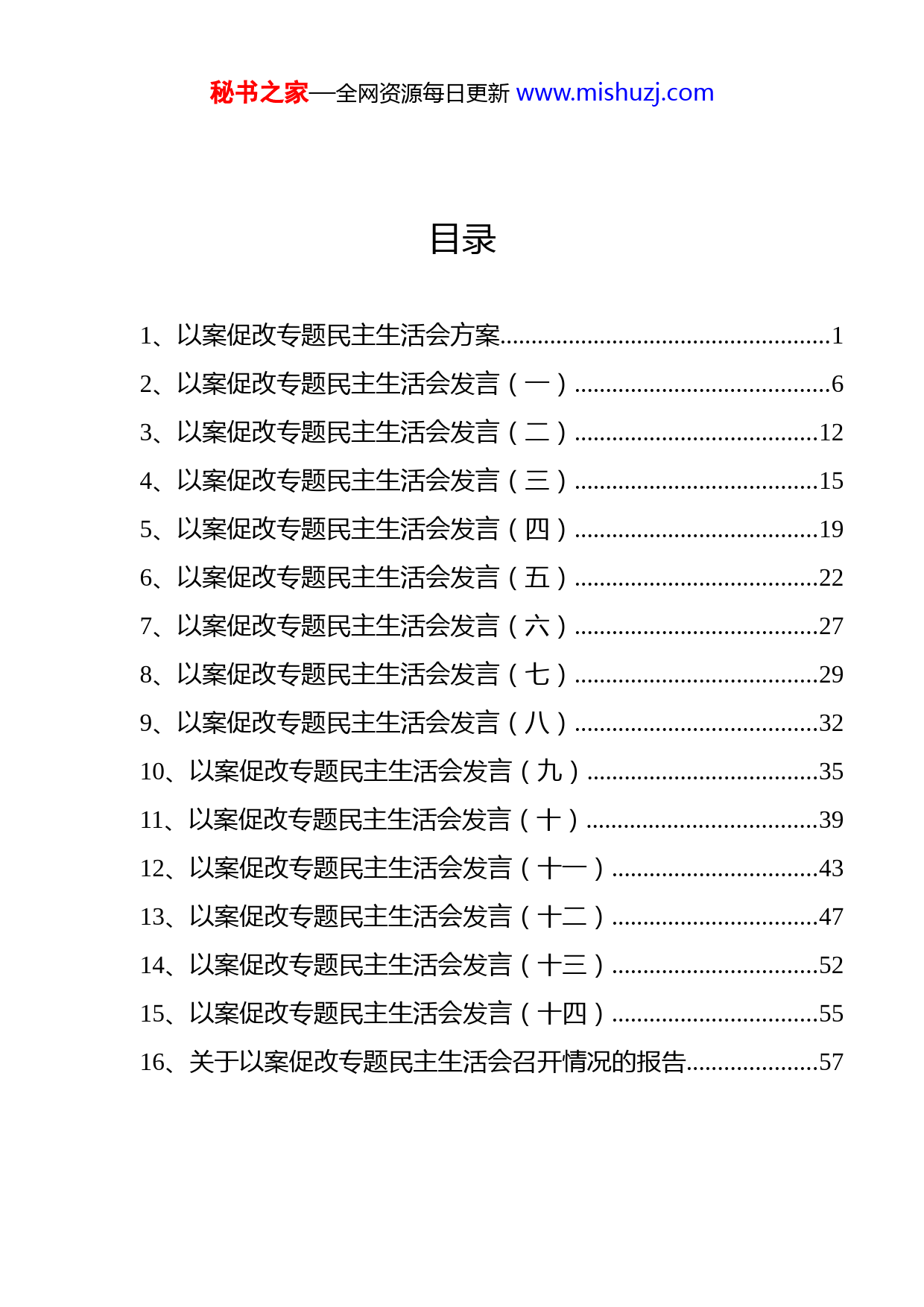 秘书之家—全网资源每日更新www.mishuzj.com目录1、以案促改专题民主生活会方案.....................................................12、以案促改专题民主生活会发言(一).........................................63、以案促改专题民主生活会发言(二).......................................124、以案促改专题民主生活会发言(三).......................................155、以案促改专题民主生活会发言(四).......................................196、以案促改专题民主生活会发言(五).......................................227、以案促改专题民主生活会发言(六).......................................278、以案促改专题民主生活会发言(七).......................................299、以案促改专题民主生活会发言(八).......................................3210、以案促改专题民主生活会发言(九).....................................3511、以案促改专题民主生活会发言(十).....................................3912、以案促改专题民主生活会发言(十一).................................4313、以案促改专题民主生活会发言(十二).................................4714、以案促改专题民主生活会发言(十三).................................5215、以案促改专题民主生活会发言(十四).................................5516、关于以案促改专题民主生活会召开情况的报告.....................57秘书之家—全网资源每日更新www.mishuzj.com以案促改专题民主生活会方案为深入贯彻市委《……以案促改的专项工作方案》要求,市X局拟于近期结合当前工作组织召开以案促改专题民主生活会,现制定具体实施方案如下。一、会议主题坚持以习近平新时代中国特色社会主义思想为指导,深入贯彻十九届中央纪委五次全会、X届省纪委X次全会、X届市纪委X次全会工作部署,认真落实省纪委监委纪检监察建议要求,把……严重违纪违法案件以案促改工作作为一体推进“三不”机制建设的有效载体和有力抓手,从典型案件中接受警示教育,反思工作,查找队伍建设、监督执纪、制度建设等方面存在的薄弱环节,有针对性地堵塞漏洞,完善制度,引导和激励全市党员干部自觉在“严”的氛围下担当作为、干事创业。二、会前准备(一)精心组织学习。认真学习党章和《中国共产党廉洁自律准则》《中国共产党问责条例》等党内法规,深入学习了中央和省市有关会议精神特别是习总书记关于严明党的纪律、全面从严治党系列重要讲话精神,传达学习《……》、中共X省纪律检查委员会《……》,传达省纪委监委《……》,对以案促改工作进行安排部署,打牢开好以案促改专题民主生活会的思想基础。秘书之家—全网资源每日更新www.mishuzj.com(二)深入谈心谈话。局党组书记要带头与班子成员开展谈心谈话,班子成员之间也要开展谈心谈话。同时,要采取适当方式,结合工作调研、走访慰问等,征求意见建议。(三)客观查摆问题。对照……严重违纪违法案件暴露出的问题和深层次原因,找准短板,汲取教训,提高免疫力。围绕案件特点和案发原因,重点查摆:是否存在违反中央八项规定精神,腐败和不正之风交织等“四风”顽疾问题;是否存在政商关系亲而不清,为他人在公司经营、工程承揽、协调资金拨付等方面提供帮助并收受他人财物等问题;是否存在利用职务上的便利,违反有关规定在干部选拔任用、干部考核、职务晋升工作中,为他人谋取利益并收受他人财物等问题。(四)认真撰写对照检查材料。参会人员查摆问题要紧密结合实际,分析问题症结,剖析问题根源,特别是在主观上、思想上进行深刻检视,找准思想根子上的问题,并明确努力方向和改进措施。班子对照检查材料和个人发言提纲主要包括三个方面内容:一是聚焦主题,在学习研讨、查找问题的基础上,聚焦市委提出的X个方面开展对照检查,深入联系思想、工作和作风实际查找存在的突出问题。二是深入剖析原因、认清问题实质。三是提出具体整改措施,对着问题去,可操作、能落实。个人发言提纲要自己动手撰写,本着对党忠诚、对事业负责的态度认真修改,坚持把自己摆进去、把思想摆进去、把职责摆进去秘书之家—全网资源每日更新www.mishuzj.com把工作摆进去,直奔主题、直面问题,切实查摆个人责任深刻剖析思想、政治、组织、作风、纪律上存在的问题,深刻挖掘问题根源,有针对性地制定整改措施。县处级以上干部撰写个人发言提纲,在X年X月X日前,统一交办公室汇总,报党组书记X同志审阅把关。(五)扎实开展批评和自我批评。参会人员要聚焦主题,联系思想工作具体事例,围绕三个“是否”,遵循“团结——批评——团结”的方针,以刀刃向内的自我革命精神,充分运用批评和自我批评武器,开展积极健康的思想斗争,防止绕弯子、兜圈子,虚晃一枪、浮在表面。自我批评要实事求是、客观全面。党组书记要代表班子作对照检查,带头开展自我批评。相互批评要出于公心、开诚布公。班子成员对批评意见要正确对待、虚心接受,有则改之、无则加勉。会后,局党组成员要针对会上开展批评和自我批评情况,进一步明确整改方面,完善整改措施形成整改方案。三、会议组织严格按照程序,按时召开专题民主生活会。民主生活会总体方案,经市委组织部审核通过,各项准备工作准备充分后召开。专题学习研讨任务没有完成、查找问题不聚焦不实在、谈心谈话不充分没有谈深谈透、前期准备工作不充分