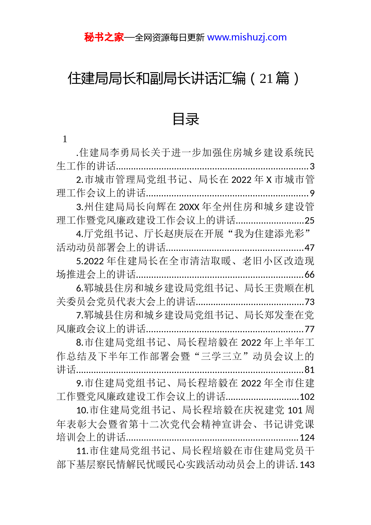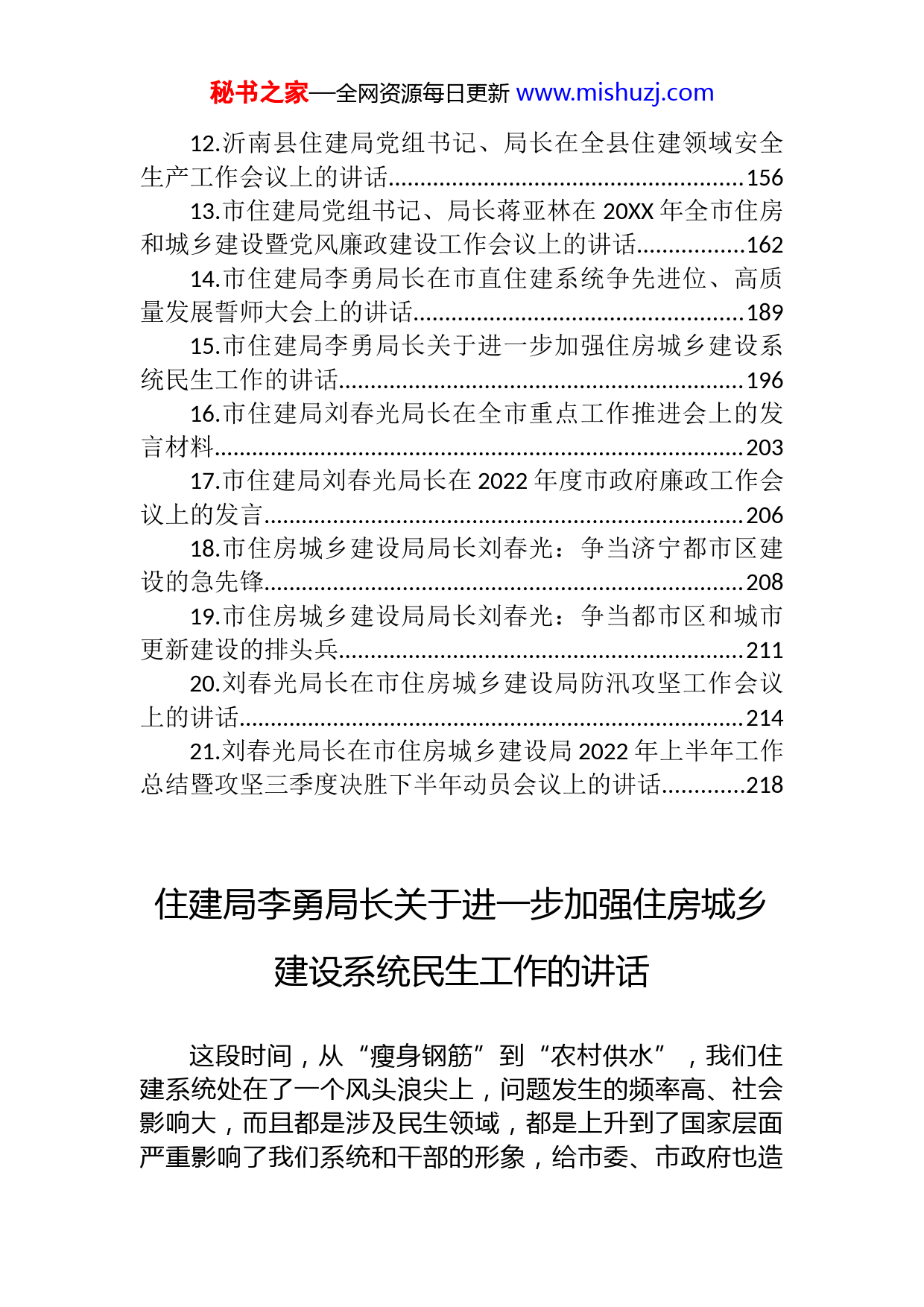 秘书之家—全网资源每日更新www.mishuzj.com住建局局长和副局长讲话汇编(21篇)目录1.住建局李勇局长关于进一步加强住房城乡建设系统民生工作的讲话............................................................................32.市城市管理局党组书记、局长在2022年X市城市管理工作会议上的讲话................................................................93.州住建局局长向辉在20XX年全州住房和城乡建设管理工作暨党风廉政建设工作会议上的讲话...........................254.厅党组书记、厅长赵庚辰在开展“我为住建添光彩”活动动员部署会上的讲话......................................................475.2022年住建局长在全市清洁取暖、老旧小区改造现场推进会上的讲话..................................................................666.郓城县住房和城乡建设局党组书记、局长王贵顺在机关委员会党员代表大会上的讲话...........................................737.郓城县住房和城乡建设局党组书记、局长郑发奎在党风廉政会议上的讲话..............................................................778.市住建局党组书记、局长程培毅在2022年上半年工作总结及下半年工作部署会暨“三学三立”动员会议上的讲话..........................................................................................819.市住建局党组书记、局长程培毅在2022年全市住建工作暨党风廉政建设工作会议上的讲话.............................10210.市住建局党组书记、局长程培毅在庆祝建党101周年表彰大会暨省第十二次党代会精神宣讲会、书记讲党课培训会上的讲话....................................................................12411.市住建局党组书记、局长程培毅在市住建局党员干部下基层察民情解民忧暖民心实践活动动员会上的讲话.143秘书之家—全网资源每日更新www.mishuzj.com12.沂南县住建局党组书记、局长在全县住建领域安全生产工作会议上的讲话........................................................15613.市住建局党组书记、局长蒋亚林在20XX年全市住房和城乡建设暨党风廉政建设工作会议上的讲话.................16214.市住建局李勇局长在市直住建系统争先进位、高质量发展誓师大会上的讲话....................................................18915.市住建局李勇局长关于进一步加强住房城乡建设系统民生工作的讲话................................................................19616.市住建局刘春光局长在全市重点工作推进会上的发言材料....................................................................................20317.市住建局刘春光局长在2022年度市政府廉政工作会议上的发言............................................................................20618.市住房城乡建设局局长刘春光:争当济宁都市区建设的急先锋............................................................................20819.市住房城乡建设局局长刘春光:争当都市区和城市更新建设的排头兵................................................................21120.刘春光局长在市住房城乡建设局防汛攻坚工作会议上的讲话................................................................................21421.刘春光局长在市住房城乡建设局2022年上半年工作总结暨攻坚三季度决胜下半年动员会议上的讲话.............218住建局李勇局长关于进一步加强住房城乡建设系统民生工作的讲话这段时间,从“瘦身钢筋”到“农村供水”,我们住建系统处在了一个风头浪尖上,问题发生的频率高、社会影响大,而且都是涉及民生领域,都是上升到了国家层面严重影响了我们系统和干部的形象,给市委、市政府也造秘书之家—全网资源每日更新www.mishuzj.com成了严重不良影响。通过这几次事件来看,我们住建系统仍然存在“重建设、轻监管”“漠视群众利益”“执行不力、落实不力”等问题,而且主要是涉及民生领域的工作,比如:棚户区改造、安居工程、老百姓吃水,都是跟老百姓生活密切相关的。这些工作,目前都是国家、省、市上级领导高度关注的工作。大家都应该看得到,林书记、于市长高度重视民生工作,对出现的问题,都是“零容忍、顶格处罚、从严问责”。希望各位局长认清现在住建系统面临的形势,及时调整监管重点和方向,进一步抓好住建系统民生领域的各项工作。我们印发了《关于进一步加强住房城乡建设系统民生领域工作的通知》,下面我简要点一点15项重要工作。1、棚户区改造——重点抓好两个方面。一个是要加快完成今年的3786套开工任务和4000套基本建成任务。目前全省排名第三,推进还是比较顺利的。第二个是要加快推进2016至2019年度在建棚改安置房进度。目前全市共190个、12.1万套在建项目,个数全省第一,套数全省第二,总体建设进度缓慢;未复工、未开工、正进行基础施工的项目共49个,占比四分之一以上。其中,金乡县金马河北侧棚户区改造项目,至今仍未完成征收拆迁协议签订;任城区19个项目仅进行土方或桩基施工,进展较为缓慢。要确保年底前在建棚改竣工交付率要达到75%以上。预计,6月底市里就要进行全面调度,按照时间任务双过半,在建棚改项目竣工交付率要在37.5%以上,每个县市区的交付率会排出来。所以,我们要加班加点把进度往前赶,该争取政府主要领导支持的,要尽快争取支持。2、老旧小区改造——主要是抓开工、抓质量、抓便民。①全市102个老旧小区改造项目6月底前必须全部开工。4月底开不了工