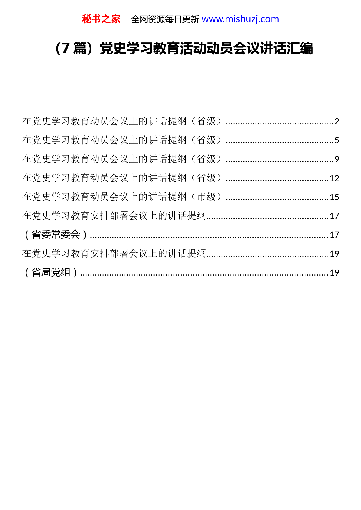秘书之家—全网资源每日更新www.mishuzj.com(7篇)党史学习教育活动动员会议讲话汇编在党史学习教育动员会议上的讲话提纲(省级)............................................2在党史学习教育动员会议上的讲话提纲(省级)............................................5在党史学习教育动员会议上的讲话提纲(省级)............................................9在党史学习教育动员会议上的讲话提纲(省级)..........................................12在党史学习教育动员会议上的讲话提纲(市级)..........................................15在党史学习教育安排部署会议上的讲话提纲..................................................17(省委常委会).................................................................................................17在党史学习教育安排部署会议上的讲话提纲..................................................19(省局党组).....................................................................................................19秘书之家—全网资源每日更新www.mishuzj.com在党史学习教育动员会议上的讲话提纲(省级)在全党开展党史学习教育,是以习近平同志为核心的党中央立足党的百年历史新起点,统筹中华民族伟大复兴战略全局和世界百年未有之大变局,为动员全党全国满怀信心投身全面建设社会主义现代化国家而作出的重大决策。习近平总书记在党史学习教育动员大会上发表的重要讲话,高屋建瓴,视野宏大,思想深邃,内涵丰富,博大精深,深刻阐述了开展党史学习教育的一系列重大问题,是一篇闪耀着马克思主义真理光辉的纲领性文献,具有重大的政治意义、历史意义、时代意义、现实意义,为全党开展好党史学习教育指明了前进方向,提供了根本遵循。一要坚持以习近平总书记重要讲话精神统一思想行动,增强开展党史学习教育的政治责任感和使命感。全省各级党组织和广大党员干部要深刻认识到,开展党史学习教育是牢记初心使命、推进中华民族伟大复兴伟业的必然要求,是坚定理想信念、在新时代坚持和发展中国特色社会主义的必然要求,是推进党的自我革命、永葆党的生机活力的必然要求,是当好首都政治“护城河”、开创xx发展新局面的必然要求。要把学习贯彻习近平总书记重要讲话与学习贯彻习近平新时代中国特色社会主义思想结合起来,与学习贯彻党的十八大以来习近平总书记关于党史学习教育一系列重要指示要求结合起来,与学习贯彻党的十九届五中全会和中央经济工作会议精神结合起来,与学习贯彻习近平总书记对xx工作重要指示批示精神结合起来,坚持学习党史与学习新中国史、改革开放史、社会主义发展史相贯通,做到学史明理、学史增信、学史崇德、学史力行,不断提高政治判断力、政治领悟力、政治执行力,守正创新抓住机遇,锐意进取开辟新局,秘书之家—全网资源每日更新www.mishuzj.com为全面建设社会主义现代化国家、实现中华民族伟大复兴中国梦而不懈奋斗。二要坚持突出重点开展党史学习教育,做到学党史、悟思想、办实事、开新局。一要进一步感悟思想伟力,紧密结合党的十八大以来党和国家各项事业取得的历史性成就、发生的历史性变革,加深对新时代党的创新理论的理解和领悟,联系历史学,入心入脑学,结合实际学,切实用习近平新时代中国特色社会主义思想武装头脑、指导实践、推动工作。二要进一步把握历史发展规律和大势,从“两个大局”中把握历史定位,从“两大奇迹”中认识政治优势,从中国之治和西方之乱的鲜明对比中增强必胜信心,从“两个一百年”奋斗目标的宏伟蓝图中激发热情斗志,矢志不渝为实现中华民族伟大复兴中国梦不懈奋斗。三要进一步深化对党的性质宗旨的认识,坚持一切为了人民、一切依靠人民,始终把人民放在心中最高位置、把人民对美好生活的向往作为奋斗目标,站稳人民立场,走好群众路线,推动共同富裕,始终保持党同人民群众的血肉联系。四要进一步总结党的历史经验,发扬斗争精神,全面从严治党,健全制度机制,有力有效应对各种风险挑战,不断提高党的领导水平和执政水平,增强拒腐防变和抵御风险能力。五要进一步发扬革命精神,坚持从革命先辈的高尚品格中汲取营养、净化灵魂,坚持以社会主义核心价值观引领风尚,持续深化作风纪律专项整治,教育引导广大党员干部发扬优良传统、传承红色基因,激发迈进新征程、奋进新时代的精气神。六要进一步增强党的团结和集中统一,紧密联系当好首都政治“护城河”的实际,在提高政治能力上下功夫,坚定不移同以习近平同志为核心的党中央保持高度一致,切实把对党绝对忠诚、对人民高度负责体现在时时处处事事。秘书之家—全网资源每日更新www.mishuzj.com三要坚持加强党的领导,以开展党史学习教育为动力推动xx各项事业发展开创新局面。要强化组织领导,压实各级党委(党组)主体责任、党委(党组)书记第一责任人责任和班子成员“一岗双责”,充分发挥党员领导干部示范带头作用,建立健全责任体系和落实机制。要把握正确导向,坚持马克思主义历史观,加强思想引导和理论辨析,严格落实意识形态工作责任制,引导干部群众树立正确的党史观。要坚守为民情怀,深入开展“我为群众办实事”实践活动和“三基”建设年活动,持续实施20项民生工程,切实为群众办实事、解难题。要创新方式方法,用好我省丰富的红色资源,开展特色