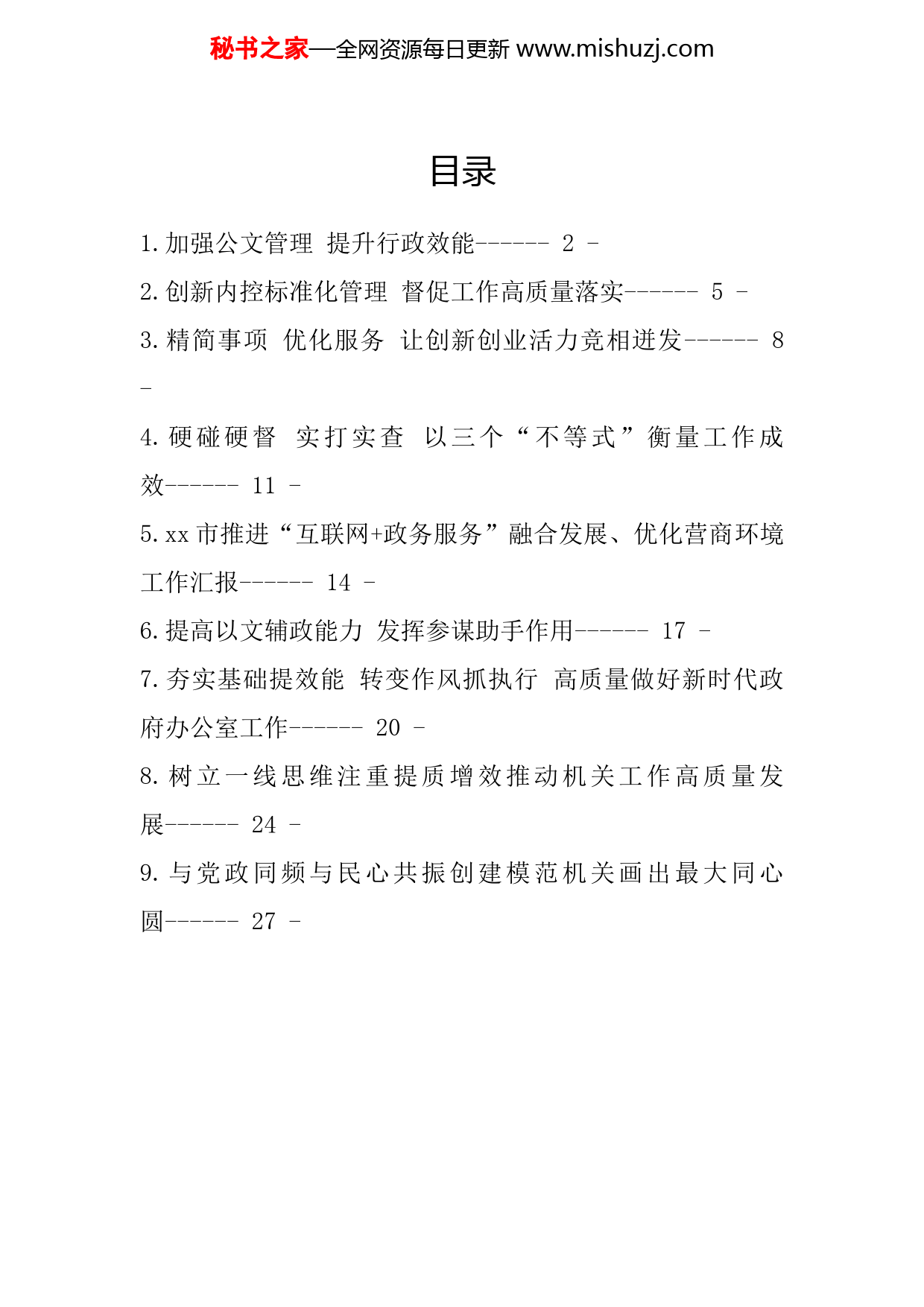 秘书之家—全网资源每日更新www.mishuzj.com目录1.加强公文管理提升行政效能------2-2.创新内控标准化管理督促工作高质量落实------5-3.精简事项优化服务让创新创业活力竞相迸发------8-4.硬碰硬督实打实查以三个“不等式”衡量工作成效------11-5.xx市推进“互联网+政务服务”融合发展、优化营商环境工作汇报------14-6.提高以文辅政能力发挥参谋助手作用------17-7.夯实基础提效能转变作风抓执行高质量做好新时代政府办公室工作------20-8.树立一线思维注重提质增效推动机关工作高质量发展------24-9.与党政同频与民心共振创建模范机关画出最大同心圆------27-秘书之家—全网资源每日更新www.mishuzj.com加强公文管理提升行政效能省水利厅办公室公文管理是机关常规性、基础性的管理工作,关系着机关服务水平,体现着机关工作作风、也影响着机关内外形象。我厅去年下狠劲抓公文管理,有效提升了行政效能。去年,我厅共收发.批转各类公文1.2万多份,未出现一例因处理不及时导致工作延误事件。对发文数量严格控制,2018年比2017年减少60%,严格把关发文质量,公文管理成效明显。一、提高政治站位,一个办法管总厅党组态度一直非常鲜明:抓公文管理就是抓业务工作,抓公文就是抓作风。针对以前发文数量多、层级高、编号滥等问题,厅党组把抓精简文件作为贯彻落实中央八项规定、省委实施细则的重点事项,2018年年初研究出台了《湖南省水利厅加强公文管理暂行办法》,厘清了发文层级、规范了发文字号、明确了发文程序,全厅学习,共同执行。一年多来,全厅公文管理水平大幅提高。二、实行闭环管理,两套流程明责围绕收文、发文两个方面的办文工作,制定了两套办理流程,每个环节明确工作职责,环环落实,形成一个完整的“贵任链”在收文方面,坚持归口收文,统一分发。凡秘书之家—全网资源每日更新www.mishuzj.com是发水利厅的文件均由厅办公室统一收文、登记,并提出拟办意见,经厅领导批示后,按职责由相关处室办理,从而避免了公文“体外循环”,杜绝了“白条公文”,还有效地防止了一些假公文的“侵入”。在发文方面,对有关规定具体化,突出了三个重点。一是厘清发文层级。将发文分为厅发文与厅办公室发文两个层级。二是缩减发文字号。将过去按业务性质编排的40个发文字号,压缩为7个。三是明确发文字号的适用范围。对7个发文字号的适用范围进行了详细规定,列出相应的事例释明,一目了然,便于操作。三、狠抓办文水平,三种培训提质下大力提高工作人员办文水平,将公文知识培训纳入干部职工学习培训重要内容,采取三种模式进行培训。一是请进来、走出去。2018年3月、9月份分别邀请省政府及省委党校有关专家到厅授课。厅办公室到厅10余个部门(单位).上门培训公文知识,此外厅机关组织4次到高校开展的干部综合素质培训班,都把公文管理列为必修课程,反响比较好。二是常态化培训。对新进公务员,每年将公文知识培训纳入年度培训计划。三是点评式培训。每季度对公文办理情况进行总结和通报,2018年共通报了4次,同时还开展了2次集中点评公文中的错误,效果非常好。四、强化信息手段,四化办文加速秘书之家—全网资源每日更新www.mishuzj.com强化信息化手段,优化我厅现有电子公文流转系统,努力提高办文时效。一是无纸化。全厅上下除保密文件不在电子公文系统审阅外,其他文件都在网上流转审阅。二是移动化。全面推行手机版移动办公,实现不限时间、不限地点审批、流转公文。三是精细化。我厅每个干部职工的电子公文系统账号绑定了本人手机号码。系统通过监管流程,自动发送短信提醒,督促办文人员及时处理,从而提高工作效能。四是集约化。针对以前各单位资源不共享的现象,我厅建立水利云平台,将公文流转系统整合到平台,方便公文起草、审核人员随时随地调阅其相关数据和资料,为办文节约了大量时间。公文管理需要持之以恒。下一步我厅将进一步加强公文管理,不断提高行政效能,为我省水利改革发展提供行政保障。秘书之家—全网资源每日更新www.mishuzj.com创新内控标准化管理督促工作高质量落实省交通运输厅办公室2017年7月以来,我们主动顺应行业发展新特点,大力推行内控标准化管理,有力推动了各项工作优质高效落实,取得了“内部感到有压力、外部感到有效率,人人感到有动力”的良好效果。一、加强顶层设计,大力推行内控管理为解决管控手段少、落实效率低的问题,我们大胆引入现代企业管理方法,全面推行内控标准化管理,切实在管理理念、管控模式和评价方法,上进行综合创新,着力提升全厅抓落实本领。一是成立一个专门机构。坚持高起点规划、高标准推进,成立由厅主要领导任组长、其他厅领导任副组长、各单位部门负责人为成员的领导小组,下设办公室牵头、人事处和机关纪委配合的“内控办”具体负责,各单位部门各明确一名联络员具体对接。二是运行一套管理体系。明确了“一年探索试行、两年完善巩固、三年总结提升”的总体要求,制定了实施办法、考评细则、考评实.施方案等一整套制度规范,建立起“标准化+预安销号+绩效考评+全过程督办”的内控标准化管理体系。秘书之家—全网资源每日更新www.mishuzj.com三是建立一个系统平台。建成覆盖PC端、APP安卓版、苹果版、微信小程序等平台的