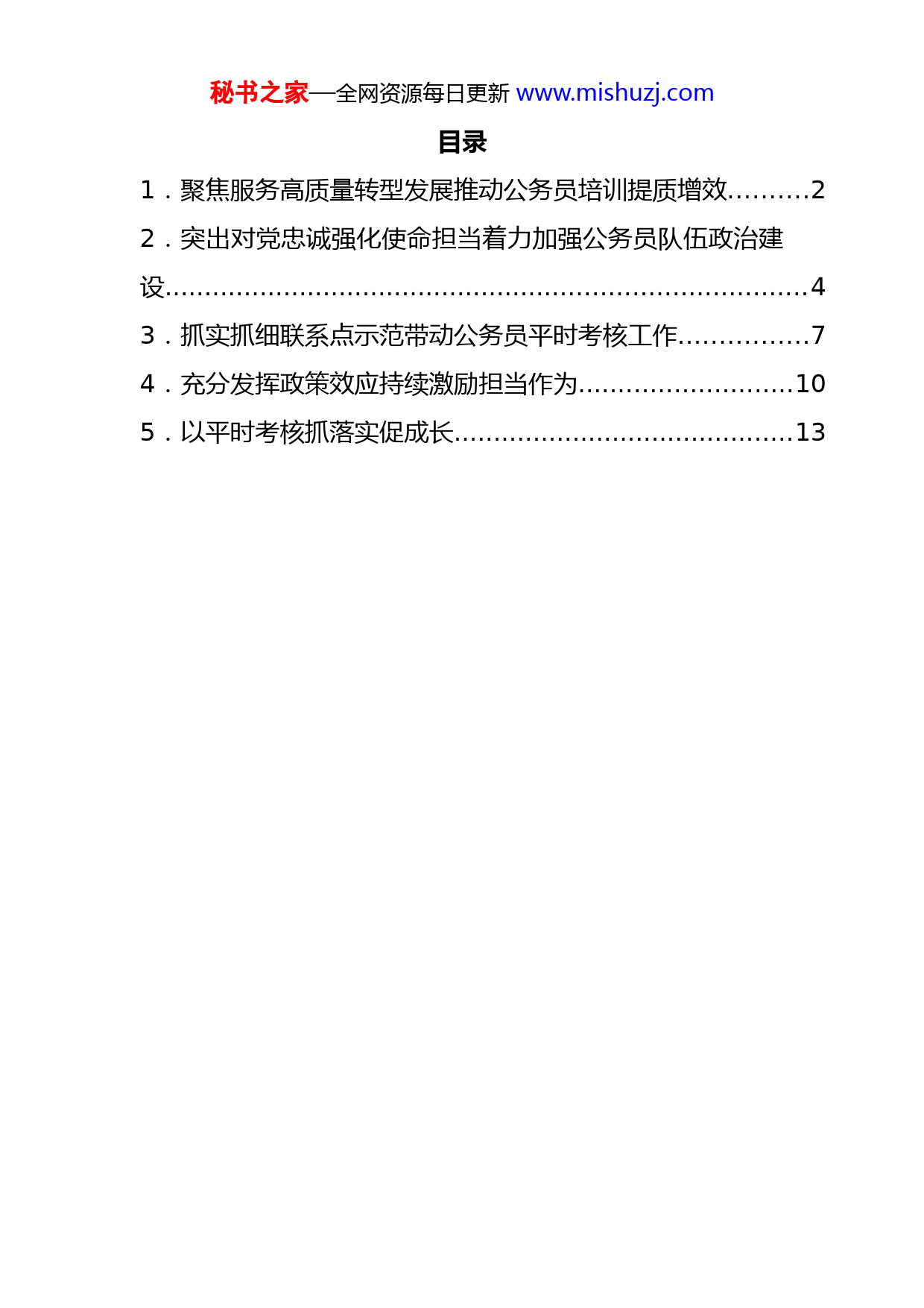 秘书之家—全网资源每日更新www.mishuzj.com目录1.聚焦服务高质量转型发展推动公务员培训提质增效..........22.突出对党忠诚强化使命担当着力加强公务员队伍政治建设.................................................................................43.抓实抓细联系点示范带动公务员平时考核工作................74.充分发挥政策效应持续激励担当作为...........................105.以平时考核抓落实促成长...........................................13秘书之家—全网资源每日更新www.mishuzj.com聚焦服务高质量转型发展推动公务员培训提质增效×省着力促进公务员培训工作从“做没做、有没有”向“好不好、优不优”提升,为全方位推动×高质量发展提供了坚强组织保证。一、突出思想引领“铸魂”,持续强化政治训练。一是集中开发样板课程强化理论武装。围绕宣传阐释习近平总书记重要讲话精神开展课题研究,推动党的创新理论进课堂、进头脑。二是挖掘用好红色资源锤炼政治品格。在公务员培训中加强党史学习教育,注重发挥×具有光荣革命传统、红色资源丰富的优势,围绕弘扬太行精神等打造多条培训路线,用好八路军总部等革命旧址就近开展体验教学。三是以理论测试和实际表现检验政治训练成效。采用“线上+线下”方式,对各单位开展创新理论专题学习情况进行监测、对参训公务员政治理论基础知识进行测试。二、围绕中心任务“赋能”,持续推进能力建设。一是对接国家重大战略提升服务大局能力。围绕国家战略,结合×实际开展系列专题培训,用好对口培训资源,邀请国家部委领导干部、国内知名专家学者来晋授课。二是围绕省委决策部署提升推动发展能力。围绕×能源革命综合改革、产业结构调整优化等任务,分类分级举办××个专秘书之家—全网资源每日更新www.mishuzj.com题、××期培训班,培训××××人次。三是聚焦战略落实落地提升基层执行能力。通过送教下基层、结对帮扶培训和网络培训等方式,推动优质培训资源向基层延伸倾斜。三、创新方式方法“塑形”,持续提升培训效能。一是实践实训促提升。以“双实践”初任培训模式,每月集中×天时间,让新录用公务员走进基层一线、田间地头开展课题实践,实现理论与实践互促共进。二是“云端”课堂促提升。将公务员任职培训主体班次搬上“云端”网络平台,组织新提任领导职务公务员参加培训,学员平均完成×××学时,扩大了任职培训覆盖面。三是省校合作促提升。依托×与清华大学等全国××所知名高校深化合作的有利契机,坚持“引进来”和“走出去”相结合,联合开展公务员培训师资引进培养计划。秘书之家—全网资源每日更新www.mishuzj.com突出对党忠诚强化使命担当着力加强公务员队伍政治建设×市坚持以习近平新时代中国特色社会主义思想为指导,突出党的政治建设这个根本,把旗帜鲜明讲政治落实到公务员育选管用全过程各方面,激励广大公务员在全面建设社会主义现代化大都市生动实践中建功立业、奋发有为。一、坚持以政治忠诚立根固本。坚守党的集中统一领导这个“根”和“魂”,推动广大公务员坚定捍卫“两个确立”、坚决做到“两个维护”一是加强党的创新理论武装。把深入学习贯彻习近平新时代中国特色社会主义思想作为公务员培训的首要任务,持续开展对党忠诚教育,深入实施新时代基层干部主题培训行动计划,××××年培训××万人次。建立完善处级领导职务政治理论水平任职资格考试制度,做到“凡提必考”以考促学。二是深入开展党史学习教育。市委宣讲团对全市各级机关开展×轮全覆盖集中宣讲,开设党史视频课程×××门,创新开展“我为群众办实事”实践活动,建立机关干部下沉社区入列轮值工作制度,×.×万名公务员下沉一线当“员”入列,砥砺初心、践行使命。三是强化政治历练实践锻炼。选派×××名有潜力的局处级公务员到信访维稳、东西部协作等工作中磨砺成长,选派×××名处级公务员担任乡村振兴示范村第一书记。今年初迎战新冠疫情时秘书之家—全网资源每日更新www.mishuzj.com组织近×万名公务员深入防控一线,其中××××名同志连夜奔赴疫情最为严重的津南区、河北区,在封控区承担物资转运、执勤值守等任务,知重负重、逆行而上凸显了强烈政治忠诚。二、坚持以政治标准把关定向。把政治标准贯穿到公务员管理各环节中,严把政治关,做到“首关不过、余关莫论”。一是加强源头政治把关。制定《关于进一步做好公务员录用调任转任工作的意见》对市级机关公开招考、遴选选调职位全面实行差额考察,在面向优秀村(社区)党组织书记定向考录中,专门设置“政治品德和工作实绩”测评环节,占总成绩××%,高于笔试、面试权重,切实把政治素质好、有家国情怀的优秀人才选拔进公务员队伍。二是鲜明用人政治导向。公务员职务职级晋升一以贯之突出政治标准和实绩导向,着重看政治忠诚、政治定力、政治担当、政治能力、政治自律等专业技术类公务员任职资格评定防止只重专业水平忽视政治要求,对政治上不合格的坚决不予考虑。在区级领导班子换届中,对××名在疫情防控、脱贫攻坚工作中表现突出的一级、二级巡视员优先提拔重用。三是严格考察政治素质。修订《×市领导干部政治素质考察办法》,明确××个“是否”情形和××种具体考察方式,建立健全组