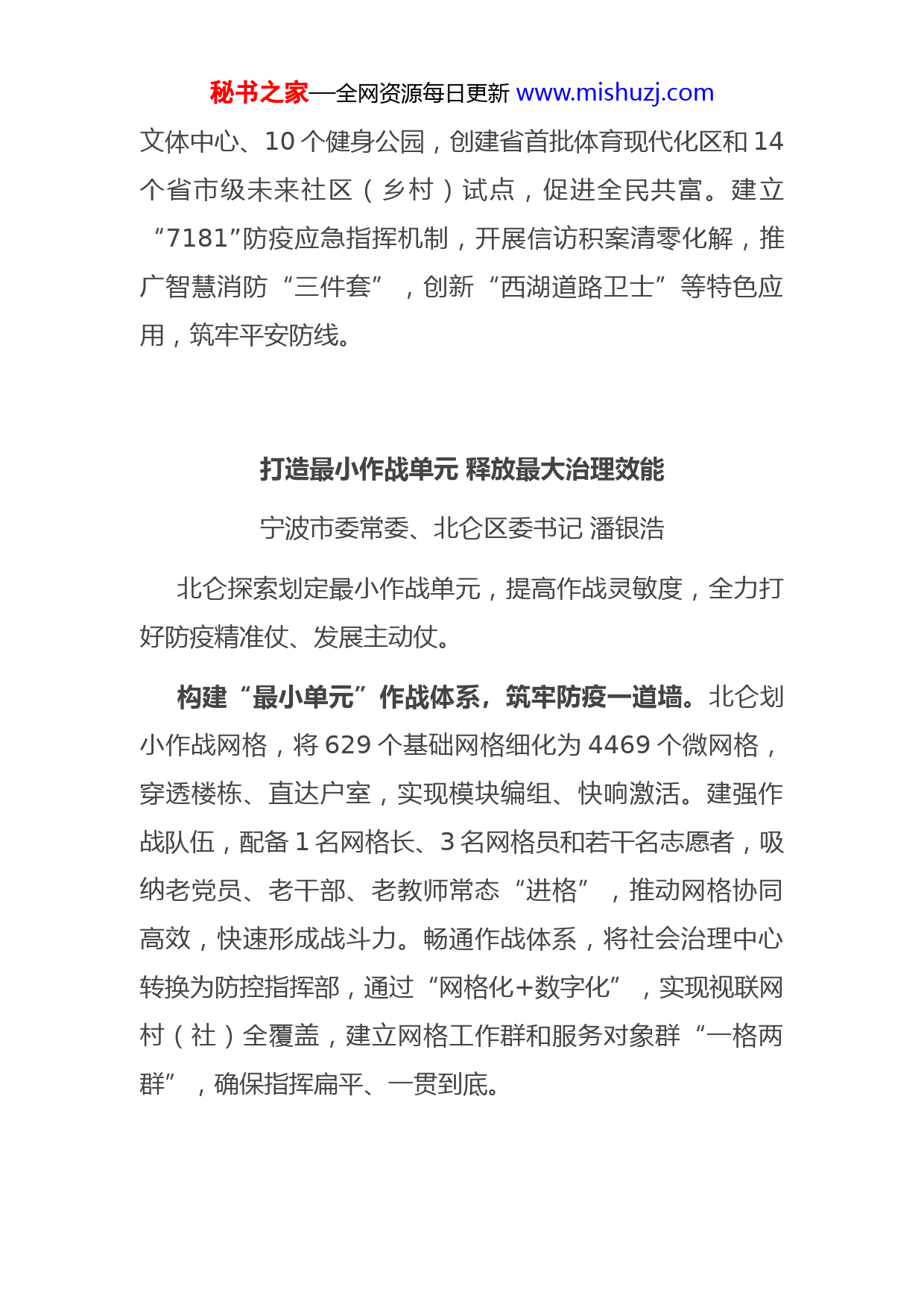 秘书之家—全网资源每日更新www.mishuzj.com西湖区聚焦“五精五高”,贯彻“简约、安全、精彩”的办会理念,坚持系统思维、量化闭环高效,全力服务保障亚运筹办,促进区域高质量发展。开启亚运“加速器”,举全区之力保障赛事筹备。以系统性谋划提升领导力,全面进行工作量化,以最小颗粒度分解总任务,实现“一图揽全局、一表掌进度”。以矩阵式管理凝聚战斗力,由区领导担任路长、片长、点长,一线指挥督导,代表委员视察调研,推动亚运攻坚。以数字化改革增强执行力,用好“民呼我为·西湖码”等数字化改革成果,实现实时总览、统一指挥、在线督办。用好亚运“助推器”,以绣花之功提升城市魅力。提升360度“处处是景”的城乡环境,抓实迎亚运环境品质提升行动,修缮亚运道路、无障碍设施,规范标识标牌,打造文三数字街区等三大商圈。做优24小时“时时在线”的公共服务,建成幸福西湖民生综合体20个,提供全时段民生服务。营造百万人口“人人参与”的亚运氛围,全方位宣传造势,企事业单位和村社等积极联动,形成人人都是东道主的良好氛围。借力亚运“放大器”,抓非常之机打造首善之区。主动融入城西科创大走廊,引进国家重点实验室等重大战略项目,实现综合考评五连优,推动稳进提质。打造3个大型秘书之家—全网资源每日更新www.mishuzj.com文体中心、10个健身公园,创建省首批体育现代化区和14个省市级未来社区(乡村)试点,促进全民共富。建立“7181”防疫应急指挥机制,开展信访积案清零化解,推广智慧消防“三件套”,创新“西湖道路卫士”等特色应用,筑牢平安防线。打造最小作战单元释放最大治理效能宁波市委常委、北仑区委书记潘银浩北仑探索划定最小作战单元,提高作战灵敏度,全力打好防疫精准仗、发展主动仗。构建“最小单元”作战体系,筑牢防疫一道墙。北仑划小作战网格,将629个基础网格细化为4469个微网格,穿透楼栋、直达户室,实现模块编组、快响激活。建强作战队伍,配备1名网格长、3名网格员和若干名志愿者,吸纳老党员、老干部、老教师常态“进格”,推动网格协同高效,快速形成战斗力。畅通作战体系,将社会治理中心转换为防控指挥部,通过“网格化+数字化”,实现视联网村(社)全覆盖,建立网格工作群和服务对象群“一格两群”,确保指挥扁平、一贯到底。秘书之家—全网资源每日更新www.mishuzj.com完善“最小单元”作战功能,扎紧治理一张网。明确平战职责,按照“平时为民、战时为兵”的要求,严格规范网格准入事项;完善管理机制,实施网格员量化考评和积分管理,制定以奖代补政策,激发网格员工作热情;强化工作闭环,畅通任务下派和事件上行渠道,推动群众高频事项流程再造、多跨协同、闭环解决。用活“最小单元”作战理念,下好经济一盘棋。小专班优服务,成立15支锋领企服队,开展“助企开门红”活动,落实好“5+4”稳进提质政策,提振企业发展信心。小专班抓项目,发挥自贸区和经开区叠加优势,组建10个招商和76个项目工作小组,加快推进6个百亿项目、50个标志性项目和20个蜗牛项目。小专班破难题,以全域国土空间综合整治试点为契机,组建12个突击小分队,破解城中村、低效地、集卡围城等难题,为强港建设、产业发展拓展新空间。创新突破塑造变革推动共同富裕变革性实践瑞安市委书记麻胜聪秘书之家—全网资源每日更新www.mishuzj.com瑞安坚持向改革要动力,积极推动共同富裕变革性实践,两项改革分别获全省改革突破奖、提名奖,实现2021年温州综合考绩、七张清单管控力指数“双第一”。聚焦堵点痛点,找准共同富裕问题症结。找准总量大县人均小县、统筹发展难等五大关键堵点,系统构建1+1+3+X改革工作体系,实行堵点分析、数字变革等量化闭环落地“六步工作法”,连续三年获全省全面深化改革考评优秀。聚焦问题症结,推进共同富裕改革突破。以产业链治理机制改革推动转型升级,创新产业链“一键通”改革,依托六大数据监测模型,精准打好招大引强、科技赋能等组合拳,百亿单体制造业项目开工。以要素供给侧改革推动高效配置,围绕“钱从哪里来”,深化财政绩效管理改革政府债务率维持绿色评级;围绕“地从哪里来”,率先开展全域国土空间治理改革,打出“盘、腾、增、优”四联招,五未整治盘空间,三旧改造腾空间,机械上楼增空间弹性供地优空间,土地集约节约利用获省政府督查激励。以农村“三位一体”综合合作改革推动乡村振兴,打造集成28项多跨协同场景的智农共富平台,推进宅基地三权分置等三大改革,获批国家现代农业产业园。秘书之家—全网资源每日更新www.mishuzj.com聚焦改革突破,提升共同富裕变革能力。整体智治,增强除险保安能力。以“县乡一体、条抓块统”改革为主抓手,创新数据核查+微网格排查等五大防控硬招,以最短时间扑灭疫情、最小代价打赢疫情阻击战。赛马比拼,增强一线攻坚能力。创新“以事择人”动态积分管理等机制,形成“实干比担当、实绩论英雄”鲜明导向。全面加速制造业高质量转型升级湖州市吴兴区委书记赵如浪作为全省制造业高质量发展示范创建县,吴兴坚持创新驱动、稳进提质,1-2月制造业增加值增长12.3%,带动财政总收入增长19.1%。聚焦“筑巢引凤”,持续优化创新生态。提升平台承载力,以“顶配版”标准打造高能级产业平台,持续推动