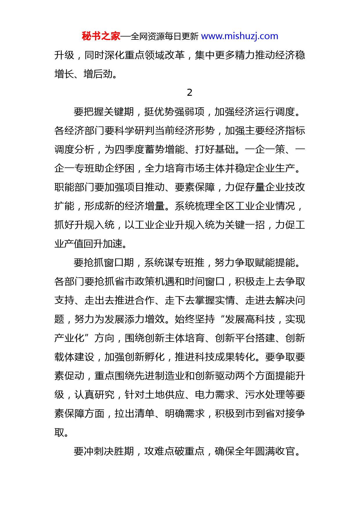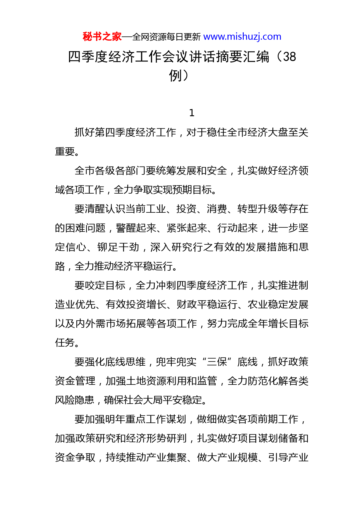 秘书之家—全网资源每日更新www.mishuzj.com四季度经济工作会议讲话摘要汇编(38例)1抓好第四季度经济工作,对于稳住全市经济大盘至关重要。全市各级各部门要统筹发展和安全,扎实做好经济领域各项工作,全力争取实现预期目标。要清醒认识当前工业、投资、消费、转型升级等存在的困难问题,警醒起来、紧张起来、行动起来,进一步坚定信心、铆足干劲,深入研究行之有效的发展措施和思路,全力推动经济平稳运行。要咬定目标,全力冲刺四季度经济工作,扎实推进制造业优先、有效投资增长、财政平稳运行、农业稳定发展以及内外需市场拓展等各项工作,努力完成全年增长目标任务。要强化底线思维,兜牢兜实“三保”底线,抓好政策资金管理,加强土地资源利用和监管,全力防范化解各类风险隐患,确保社会大局平安稳定。要加强明年重点工作谋划,做细做实各项前期工作,加强政策研究和经济形势研判,扎实做好项目谋划储备和资金争取,持续推动产业集聚、做大产业规模、引导产业秘书之家—全网资源每日更新www.mishuzj.com升级,同时深化重点领域改革,集中更多精力推动经济稳增长、增后劲。2要把握关键期,挺优势强弱项,加强经济运行调度。各经济部门要科学研判当前经济形势,加强主要经济指标调度分析,为四季度蓄势增能、打好基础。一企一策、一企一专班助企纾困,全力培育市场主体并稳定企业生产。职能部门要加强项目推动、要素保障,力促存量企业技改扩能,形成新的经济增量。系统梳理全区工业企业情况,抓好升规入统,以工业企业升规入统为关键一招,力促工业产值回升加速。要抢抓窗口期,系统谋专班推,努力争取赋能提能。各部门要抢抓省市政策机遇和时间窗口,积极走上去争取支持、走出去推进合作、走下去掌握实情、走进去解决问题,努力为发展添力增效。始终坚持“发展高科技,实现产业化”方向,围绕创新主体培育、创新平台搭建、创新载体建设,加强创新孵化,推进科技成果转化。要争取要素促动,重点围绕先进制造业和创新驱动两个方面提能升级,认真研究,针对土地供应、电力需求、污水处理等要素保障方面,拉出清单、明确需求,积极到市到省对接争取。要冲刺决胜期,攻难点破重点,确保全年圆满收官。秘书之家—全网资源每日更新www.mishuzj.com临近岁末,招商引资部门要把握时机,力争再成功洽谈、签约一批好项目大项目,为明年“开门红”打下良好基础。要始终树牢“项目为王”理念,紧紧围绕重大项目建设,坚持链长和项目长并行制度,落实专班专人推动,做好资金筹集、强化用地保障、加大协调调度,力保项目顺利推进。同时,要及早抓好项目储备,加强项目筛选、申报,力争更多项目进入国家和省上重点项目盘子。要加强对企业生产要素保障,大力支持重点企业满负荷生产;推进优质企业数字化改造、转型升级,集中力量打造一批支撑力大、带动性强的“引爆点”企业,不断发展壮大。各级各相关部门要毫不放松抓实抓细常态化疫情防控,坚决筑牢疫情防控坚固防线。要强化安全隐患排查整治,统筹抓好安全生产、防灾减灾救灾、生态环境保护、森林防灭火、除险保安等工作。要全力服务和保障民生,深入推进“我为群众办实事”专项行动,解决群众急难愁盼问题。要高质量承办第七届中国创新挑战赛x赛区“新能源”产业赛和故宫博物院20xx年第x届文化遗产保护青年学者论坛两项活动,认真学习借鉴先进地区赛事举办经验,及早做好筹备工作,确保办出特色和亮点。3今年以来,我县克服多重困难,坚决贯彻习近平总书记来x视察重要指示精神,认真落实中央、省、市决策部秘书之家—全网资源每日更新www.mishuzj.com署,真抓实干、建功一线,以科学之策应对非常之事,高效统筹安全和经济社会发展,全县经济稳的基础不断巩固、进的态势正在形成,整体呈现“稳中有进、稳中向好”的良好局面。在充分肯定成绩的同时,我们也要准确把握盐亭经济发展面临的挑战与机遇。希望全县广大党员干部铆足干劲、勇挑重担、奋发作为,在服务全市全省大局中贡献更多盐亭力量。xxx强调,要咬定目标、坚定信心,全力冲刺全年目标任务。今年以来,县委坚持发展第一要务,坚定实施“三大战略”,推动全县经济社会发展取得了新成效,迈上了新台阶。当前,距年底只剩xxx天,已经进入完成全年目标任务的冲刺期、决战期,各项工作任务都很重。全县干部要坚定信心不动摇、真抓实干谋发展,把所有精力聚焦到全年目标任务上来,全面梳理、逐项分析落后指标存在的问题原因,对标补短、打通堵点,继续保持前三季度良好的发展态势,全力以赴冲刺第四季度,努力在省市考核中晋位争先,给市委和全县人民交出一份满意答卷。要突出重点、统筹推进,推动三次产业协同跨越。坚持问题导向、目标导向,聚力聚焦产业主引擎,精准施策解决产业发展面临的现实困难和突出问题,大力实施工业“xxx”工程、农业“xxx”工程、服务业“xxx”工程,推动三次产业集群发展、加速壮大,让经济稳的基础更牢、进秘书之家—全网资源每日更新www.mishuzj.com的底气更足。要抢抓机遇、聚焦关键,全力以赴抓项目促投资。牢固树立“项目为王”的理念,坚持工作盯着项目干、围绕项目转,强化项目储备、狠抓项目建设、加强对上争取、着力招大引强,形成全力抓项目抓投资浓