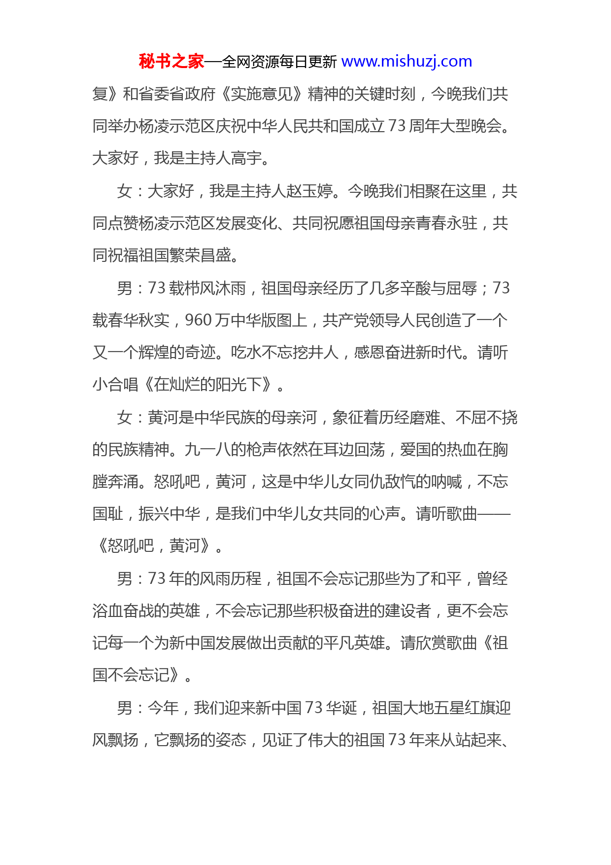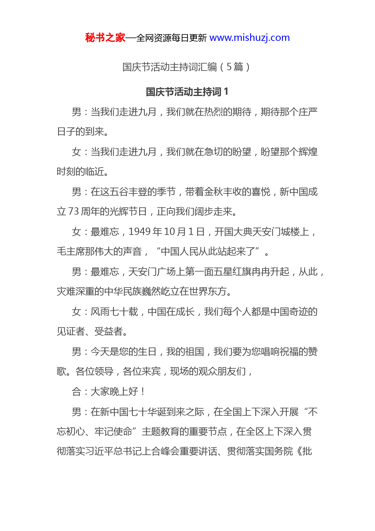 秘书之家—全网资源每日更新www.mishuzj.com国庆节活动主持词汇编(5篇)国庆节活动主持词1男:当我们走进九月,我们就在热烈的期待,期待那个庄严日子的到来。女:当我们走进九月,我们就在急切的盼望,盼望那个辉煌时刻的临近。男:在这五谷丰登的季节,带着金秋丰收的喜悦,新中国成立73周年的光辉节日,正向我们阔步走来。女:最难忘,1949年10月1日,开国大典天安门城楼上,毛主席那伟大的声音,“中国人民从此站起来了”。男:最难忘,天安门广场上第一面五星红旗冉冉升起,从此,灾难深重的中华民族巍然屹立在世界东方。女:风雨七十载,中国在成长,我们每个人都是中国奇迹的见证者、受益者。男:今天是您的生日,我的祖国,我们要为您唱响祝福的赞歌。各位领导,各位来宾,现场的观众朋友们,合:大家晚上好!男:在新中国七十华诞到来之际,在全国上下深入开展“不忘初心、牢记使命”主题教育的重要节点,在全区上下深入贯彻落实习近平总书记上合峰会重要讲话、贯彻落实国务院《批秘书之家—全网资源每日更新www.mishuzj.com复》和省委省政府《实施意见》精神的关键时刻,今晚我们共同举办杨凌示范区庆祝中华人民共和国成立73周年大型晚会。大家好,我是主持人高宇。女:大家好,我是主持人赵玉婷。今晚我们相聚在这里,共同点赞杨凌示范区发展变化、共同祝愿祖国母亲青春永驻,共同祝福祖国繁荣昌盛。男:73载栉风沐雨,祖国母亲经历了几多辛酸与屈辱;73载春华秋实,960万中华版图上,共产党领导人民创造了一个又一个辉煌的奇迹。吃水不忘挖井人,感恩奋进新时代。请听小合唱《在灿烂的阳光下》。女:黄河是中华民族的母亲河,象征着历经磨难、不屈不挠的民族精神。九一八的枪声依然在耳边回荡,爱国的热血在胸膛奔涌。怒吼吧,黄河,这是中华儿女同仇敌忾的呐喊,不忘国耻,振兴中华,是我们中华儿女共同的心声。请听歌曲——《怒吼吧,黄河》。男:73年的风雨历程,祖国不会忘记那些为了和平,曾经浴血奋战的英雄,不会忘记那些积极奋进的建设者,更不会忘记每一个为新中国发展做出贡献的平凡英雄。请欣赏歌曲《祖国不会忘记》。男:今年,我们迎来新中国73华诞,祖国大地五星红旗迎风飘扬,它飘扬的姿态,见证了伟大的祖国73年来从站起来、秘书之家—全网资源每日更新www.mishuzj.com富起来到强起来的辉煌历程,是每个中国人心中挥之不去的那一抹亮色。每当五星红旗冉冉升起,我们心中不禁涌起无数祖国赞歌。请欣赏歌曲串烧《五星红旗》、《今天是你的生日》。女:不知道你们是否发现,如今我们的生活中出现了许多新名词?男:不仅发现了,而且每天都能听到、说到、接触到。这样吧,说几个给你和大家听听,比如新常态,依法治国、一带一路、不忘初心等等,我一说,大家一定是耳熟能详,深有体会。女:这些新词、热词、流行语见证着我们生活的巨大变化,老百姓切实感受到了风清气正了、办事容易了、幸福指数提高了,男:今天的的祖国大地萌发着勃勃生机,国家富强,民族振兴,人民幸福的中国梦正一天天地实现。女:中国梦,是属于人民的梦。只要我们敢于铸梦,勇于追梦,就一定能够凝聚起强大的中国力量,去创造属于这个时代的光荣与梦想。请欣赏歌舞《共筑中国梦》。【结束语】男:欢乐的时光总是短暂的,对祖国的祝福却是永远的。回望共和国73年的光辉历程,我们更加感恩我们的党;展望新时代的壮丽征程,我们更加热爱我们的国。秘书之家—全网资源每日更新www.mishuzj.com女:73年后再出发,而今迈步从头越。让我们紧密团结在以习近平同志为核心的党中央周围,增强“四个意识”,坚定“四个自信”,做到“两个维护”,加快上合组织农业技术交流培训基地建设;男:让我们以习近平新时代中国特色社会主义思想为指导,认真贯彻落实习近平总书记上合峰会讲话和国务院《批复》、省委省政府《实施意见》精神,奋力打造示范区升级版、为推进杨凌高质量发展、实现中华民族伟大复兴的中国梦而不懈奋斗。女:下面请全体起立,一起合唱歌曲《歌唱祖国》。国庆节活动主持词2开场白:女:尊敬各位来宾、各位朋友:男:亲爱的女士们、先生们:合:大家晚上好!男:伴着金秋明媚的阳光,迎着十月的云淡气爽女:带着世纪创业的豪情,满怀丰收的幸福渴望男:中华人民共和国73华诞合:在万众期盼的目光中向我们阔步走来女:七十年弹指一挥间,73岁对人类来说是古稀之年,但对我们的祖国来说,正以青春的步伐向着新时代迈进。秘书之家—全网资源每日更新www.mishuzj.com男:祖国的成长也是日飞猛进。女:最难忘的,是1949年的那个秋天,天安门广场上,欢乐的人群联成了红彤彤的一片男:最难忘的,是开国大典的那个夜晚,缤纷的礼花中,依稀可见无数先烈们欣慰的笑颜女:不能忘记啊,天安门城楼上那洪亮的声音,向全世界郑重宣告男:中华人民共和国中央人民政府成立了女:当历史的车轮滚滚驶入九十年代,世界风云瞬息万变男:黑云压城,岂能摧垮钢铁铸就的双肩女:蚍蜉撼树,怎能动摇大中国风雨如磐的伟岸男:中国的航船在狂风骤雨中,依旧劈波斩浪,阔步向前女:看,真心的祝愿插上翅膀,同展翅的和平鸽一起自由翱翔:男:听,欢庆的歌声随风远扬,把颂歌献给祖国、献给人民、献给亲爱的党合:祝福我们的民族团结大奋进,祝福我们的祖国繁荣昌盛女:在这个特别的日子里,