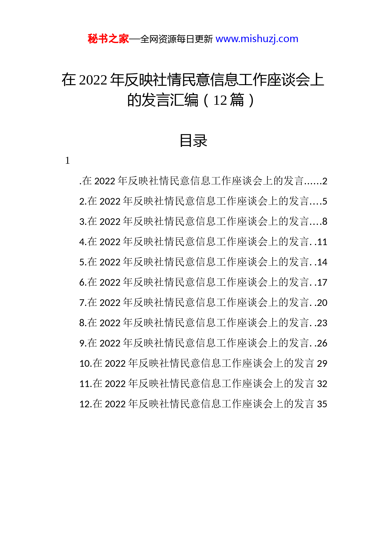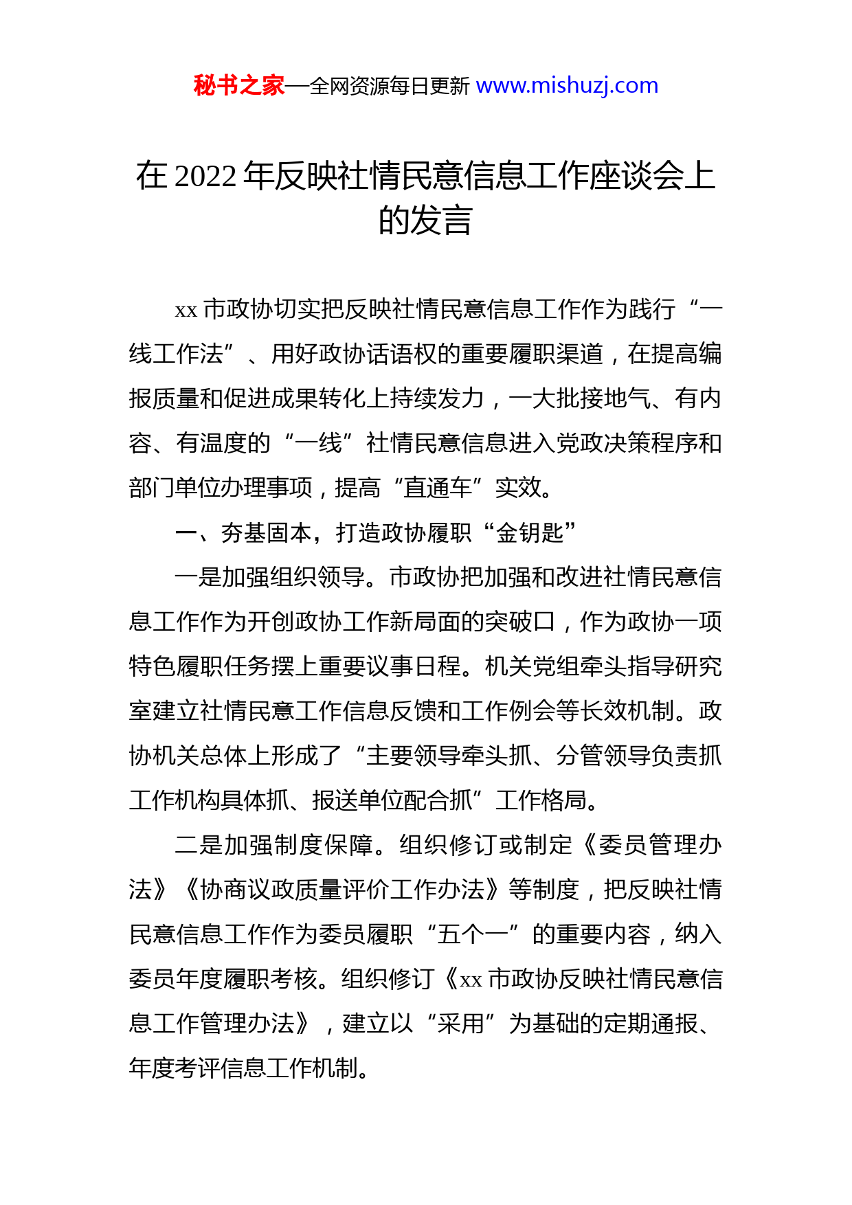 秘书之家—全网资源每日更新www.mishuzj.com在2022年反映社情民意信息工作座谈会上的发言汇编(12篇)目录1.在2022年反映社情民意信息工作座谈会上的发言......22.在2022年反映社情民意信息工作座谈会上的发言....53.在2022年反映社情民意信息工作座谈会上的发言....84.在2022年反映社情民意信息工作座谈会上的发言..115.在2022年反映社情民意信息工作座谈会上的发言..146.在2022年反映社情民意信息工作座谈会上的发言..177.在2022年反映社情民意信息工作座谈会上的发言..208.在2022年反映社情民意信息工作座谈会上的发言..239.在2022年反映社情民意信息工作座谈会上的发言..2610.在2022年反映社情民意信息工作座谈会上的发言2911.在2022年反映社情民意信息工作座谈会上的发言3212.在2022年反映社情民意信息工作座谈会上的发言35秘书之家—全网资源每日更新www.mishuzj.com在2022年反映社情民意信息工作座谈会上的发言xx市政协切实把反映社情民意信息工作作为践行“一线工作法”、用好政协话语权的重要履职渠道,在提高编报质量和促进成果转化上持续发力,一大批接地气、有内容、有温度的“一线”社情民意信息进入党政决策程序和部门单位办理事项,提高“直通车”实效。一、夯基固本,打造政协履职“金钥匙”一是加强组织领导。市政协把加强和改进社情民意信息工作作为开创政协工作新局面的突破口,作为政协一项特色履职任务摆上重要议事日程。机关党组牵头指导研究室建立社情民意工作信息反馈和工作例会等长效机制。政协机关总体上形成了“主要领导牵头抓、分管领导负责抓工作机构具体抓、报送单位配合抓”工作格局。二是加强制度保障。组织修订或制定《委员管理办法》《协商议政质量评价工作办法》等制度,把反映社情民意信息工作作为委员履职“五个一”的重要内容,纳入委员年度履职考核。组织修订《xx市政协反映社情民意信息工作管理办法》,建立以“采用”为基础的定期通报、年度考评信息工作机制。秘书之家—全网资源每日更新www.mishuzj.com三是加强队伍建设。依托政协专委会、市级民主党派、市工商联和县(市、区)政协,动态组建社情民意工作管理服务人员、市政协《社情民意》专兼职编辑人员、社情民意撰稿骨干“三支队伍”;面向广大政协委员,培育发展反映社情民意信息的“积极分子”和“骨干力量”,形成上下联动、横向联合的社情民意信息工作网络。每年举办社情民意信息工作培训会。四是加强服务指导。不断完善编辑报送流程,明确重要信息“研究室编审、秘书长初审、主席审定”的审报流程和一般信息研究室编报程序。注重培训指导,坚持在两会委员培训,每年社情民意专题培训班上培训指导。二、突出重点,畅通委员议政建言的“直通车”一是时时专注,提高“敏锐度”。在选题上,紧跟中省市重大决策部署,以及领导关心的重点工作、群众关心的热点话题、改革发展的难点事项,及时编制发布反映社情民意信息参考选题。二是字字精细,挖掘“精准度”。始终坚持把立意准确、客观真实作为社情民意工作的根本。对收集的信息,逐一调查核实,并邀请有关专家共同讨论,加大对社情民意信息的鉴别筛选和分析提炼,确保报送到党政领导或上级政协的社情民意信息始终分析透彻、重点突出、措施具体、操作性强。秘书之家—全网资源每日更新www.mishuzj.com三是篇篇打磨,把握“分寸度”。在编辑社情民意信息时,注意把握好分寸,以维护团结、维护稳定、统一思想、助推工作为目标。三、坚持下沉,建好委员走访一线的“连心桥”一是收集一线民情民意。建立社情民意走访调研制度,由分管领导亲自带队深入基层、深入群众,广泛搜集基层社情民意信息。二是助推一线问题解决。始终把关注民生、服务民生、改善民生作为反映社情民意信息工作的出发点和落脚点。三是凝聚一线社会共识。对当前不具备解决条件的社会堵点、难点问题,引导委员发挥自身优势“双向发力”协助做好解疑释惑工作、广泛凝聚发展共识。四、注重提质,建好服务党政工作的“新引擎”一是扩大发声影响。争取党政领导批示批办社情民意信息。同时,加强与党政机关单位的沟通联系,准确掌握办理落实情况,力争社情民意信息件件有着落、有结果。二是畅通反馈机制。建立反映社情民意信息工作反馈通报制度,及时向委员、政协参加单位和基层政协通报采用情况、处理意见、有关批示及落实情况,有效解决“情况不明、反馈滞后”的问题。三是优化表彰氛围。对反映社情民意信息工作做出突出成绩的政协参加单位、政协委员和政协工作者,对促进秘书之家—全网资源每日更新www.mishuzj.com党政工作发挥了重要作用的优秀信息,及时给予表彰和奖励,激发争先进位的工作氛围。秘书之家—全网资源每日更新www.mishuzj.com在2022年反映社情民意信息工作座谈会上的发言九三学社xx省委作为民主党派省级组织,始终把反映社情民意信息工作作为履行民主党派职能的重要抓手,鼓励广大社员围绕经济社会发展中的热点、难点、痛点问题努力反映上接天线、下接地气的社情民意信息,为党委政府科学决策提供有价值的参考。一、以健全制度为着力点,注重激发信息工作活力一是不断健全信息工作激励考核制度。对市(州)社组织的信息报送和采