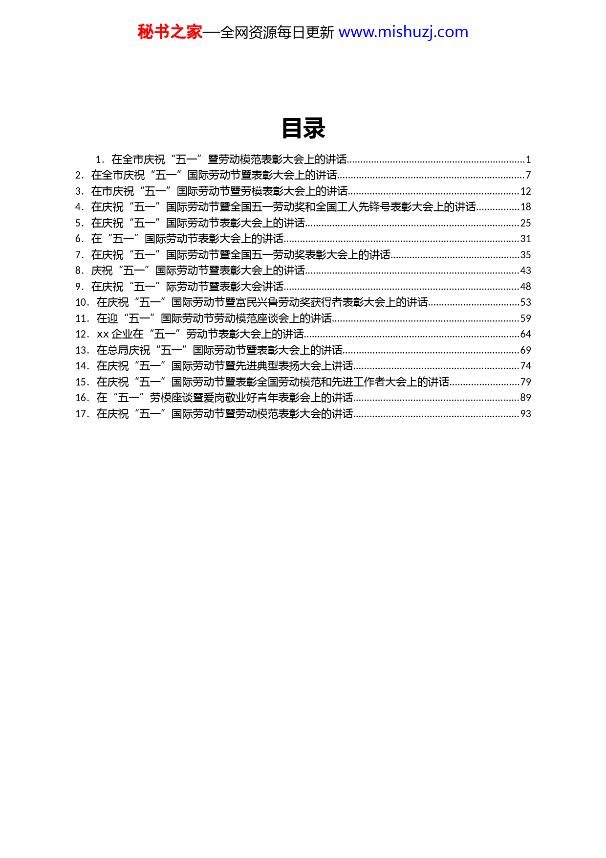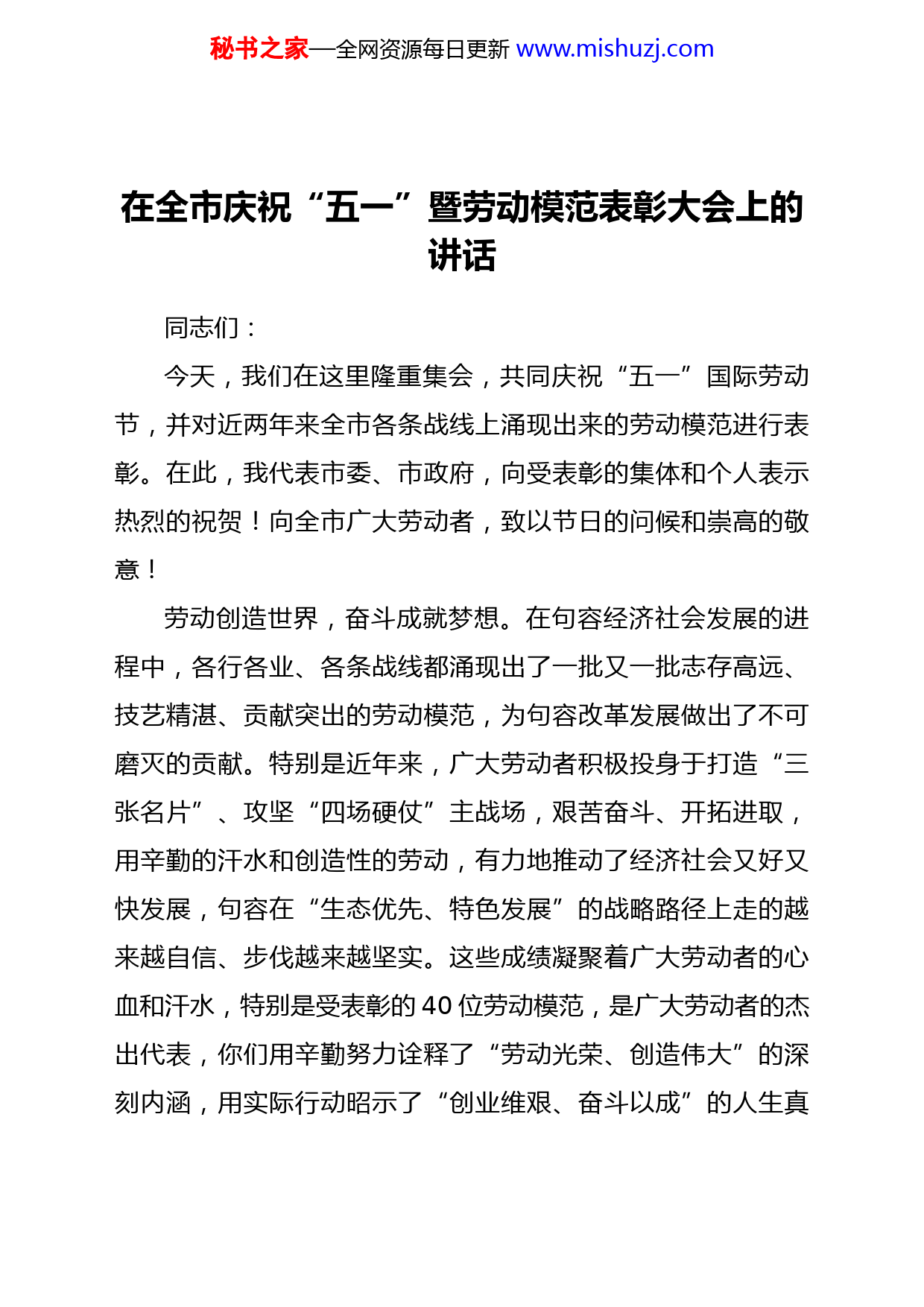 秘书之家—全网资源每日更新www.mishuzj.com目录1.在全市庆祝“五一”暨劳动模范表彰大会上的讲话..................................................................12.在全市庆祝“五一”国际劳动节暨表彰大会上的讲话.....................................................................73.在市庆祝“五一”国际劳动节暨劳模表彰大会上的讲话...............................................................124.在庆祝“五一”国际劳动节暨全国五一劳动奖和全国工人先锋号表彰大会上的讲话................185.在庆祝“五一”国际劳动节表彰大会上的讲话...............................................................................256.在“五一”国际劳动节表彰大会上的讲话.......................................................................................317.在庆祝“五一”国际劳动节暨全国五一劳动奖表彰大会上的讲话................................................358.庆祝“五一”国际劳动节暨表彰大会上的讲话...............................................................................439.在庆祝“五一”际劳动节暨表彰大会讲话.......................................................................................4810.在庆祝“五一”国际劳动节暨富民兴鲁劳动奖获得者表彰大会上的讲话..................................5311.在迎“五一”国际劳动节劳动模范座谈会上的讲话.....................................................................5912.xx企业在“五一”劳动节表彰大会上的讲话................................................................................6413.在总局庆祝“五一”国际劳动节暨表彰大会上的讲话.................................................................6914.在庆祝“五一”国际劳动节暨先进典型表扬大会上讲话.............................................................7415.在庆祝“五一”国际劳动节暨表彰全国劳动模范和先进工作者大会上的讲话..........................7916.在“五一”劳模座谈暨爱岗敬业好青年表彰会上的讲话.............................................................8917.在庆祝“五一”国际劳动节暨劳动模范表彰大会的讲话.............................................................93秘书之家—全网资源每日更新www.mishuzj.com在全市庆祝“五一”暨劳动模范表彰大会上的讲话同志们:今天,我们在这里隆重集会,共同庆祝“五一”国际劳动节,并对近两年来全市各条战线上涌现出来的劳动模范进行表彰。在此,我代表市委、市政府,向受表彰的集体和个人表示热烈的祝贺!向全市广大劳动者,致以节日的问候和崇高的敬意!劳动创造世界,奋斗成就梦想。在句容经济社会发展的进程中,各行各业、各条战线都涌现出了一批又一批志存高远、技艺精湛、贡献突出的劳动模范,为句容改革发展做出了不可磨灭的贡献。特别是近年来,广大劳动者积极投身于打造“三张名片”、攻坚“四场硬仗”主战场,艰苦奋斗、开拓进取,用辛勤的汗水和创造性的劳动,有力地推动了经济社会又好又快发展,句容在“生态优先、特色发展”的战略路径上走的越来越自信、步伐越来越坚实。这些成绩凝聚着广大劳动者的心血和汗水,特别是受表彰的40位劳动模范,是广大劳动者的杰出代表,你们用辛勤努力诠释了“劳动光荣、创造伟大”的深刻内涵,用实际行动昭示了“创业维艰、奋斗以成”的人生真秘书之家—全网资源每日更新www.mishuzj.com谛,用火热实践彰显了“我能我行我成功、创新创业创一流”的句容气质,谱写了一曲曲不平凡的劳动者之歌,展示了新时期广大劳动者的时代风采。你们是发展的功臣,是句容的骄傲,是值得全体句容人学习的榜样。我提议,让我们再次把最热烈的掌声送给在座的各位劳模,送给所有为句容发展作出贡献的劳动者!习近平总书记指出,人世间的美好梦想,只有通过诚实劳动才能实现;发展中的各种难题,只有通过诚实劳动才能破解;生命里的一切辉煌,只有通过诚实劳动才能铸就。当前,句容正面临历史性的多重发展机遇,面临依然复杂严峻的宏观形势,置身新时代高质量发展的大潮,每一个句容人都是主角,每一个句容人都有责任,我们比以往任何时候都更加需要用劳模精神引领风尚,用劳动精神激发干劲,用工匠精神凝聚力量。希望全市广大职工和劳动群众,始终以先进模范人物为榜样,以勤奋劳动成就梦想、以诚实劳动铸就辉煌、以创造劳动续写荣光,在推进句容“两聚一高”新实践征程中创造出无愧于时代的光辉业绩。借此机会,我再提几点希望和要求:一、大力弘扬劳模精神,要崇尚劳动、爱岗敬业,汇聚起团结奋斗的强大力量劳模精神是引领新时代劳动者奋发向上的光辉旗帜,是鼓秘书之家—全网资源每日更新www.mishuzj.com舞我们奋勇前进的精神动力。劳模的最可贵之处就是以平凡劳动创造了不平凡的业绩。广大劳动群众要大力弘扬践行“信念坚定、立场鲜明,艰苦奋斗、勇于奉献,胸怀大局、纪律严明,开拓创新、自强不息”的工人阶级品格,通过劳动推动改革发展、创造美好生活、实现人生价值,使新时代劳模精神成为激励句容人民团结奋斗、干事创业的强大动力。要大力宣传劳模事迹,以劳模的先进事迹感召劳动群众,以劳模的优秀品质引领社会风尚,激励每个劳动者人生出彩、梦想成真。广大劳动群众要向劳模先进学习,把树立远大理想与做好本职工作结合起来,把实现自身价值与句容的跨越发展结