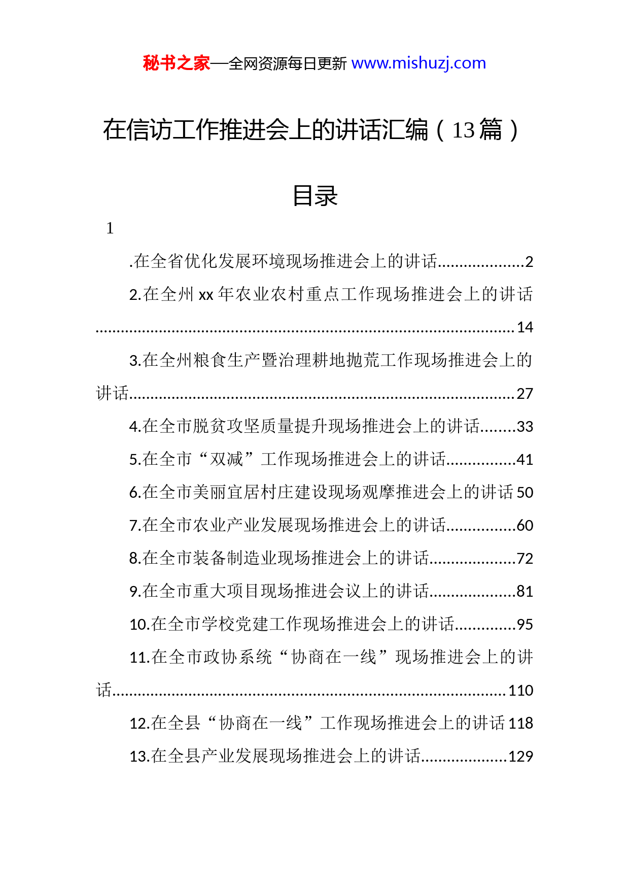 秘书之家—全网资源每日更新www.mishuzj.com在信访工作推进会上的讲话汇编(13篇)目录1.在全省优化发展环境现场推进会上的讲话....................22.在全州xx年农业农村重点工作现场推进会上的讲话..................................................................................................143.在全州粮食生产暨治理耕地抛荒工作现场推进会上的讲话..........................................................................................274.在全市脱贫攻坚质量提升现场推进会上的讲话........335.在全市“双减”工作现场推进会上的讲话................416.在全市美丽宜居村庄建设现场观摩推进会上的讲话507.在全市农业产业发展现场推进会上的讲话................608.在全市装备制造业现场推进会上的讲话....................729.在全市重大项目现场推进会议上的讲话....................8110.在全市学校党建工作现场推进会上的讲话..............9511.在全市政协系统“协商在一线”现场推进会上的讲话............................................................................................11012.在全县“协商在一线”工作现场推进会上的讲话11813.在全县产业发展现场推进会上的讲话....................129秘书之家—全网资源每日更新www.mishuzj.com秘书之家—全网资源每日更新www.mishuzj.com在全省优化发展环境现场推进会上的讲话同志们:这次会议,主要是学习贯彻习近平新时代中国特色社会主义思想,认真落实中央经济工作会议精神,按照省委经济工作会议部署,为全省高质量发展营造良好环境。刚才,我们现场观看了xx新区和xx高新区经验介绍专题片,省发改委、xx县分别作了发言,相信大家会有很大启发。等会,杜家毫书记要作重要讲话,大家要认真学习,抓好落实。下面,我讲几点意见。一、我省围绕大力振兴实体经济,营造良好发展环境取得积极成效近年来,我们以供给侧结构性改革为主线,以转变政府职能为重点,在深化改革、优化服务和转变作风中释放改革红利,有效激发了市场主体活力。截至xx年底,全省市场主体、注册资本数分别达到xx万户、xx亿元,是xx年底的xx倍、xx倍;在湘投资的世界xx强、中国xx强、民营xx强分别达到xx、xx、xx家,剔除重复计算的总数为xx家。今年xx—xx月,全省新引进xx强企业xx家(伟创力、东旭集团、中南控股集团),新增xx强企业投资项目xx个,总投资xx亿元。我们主要是抓了五个方面。秘书之家—全网资源每日更新www.mishuzj.com一是以激发市场活力为导向推进简政放权。以“放管服”改革为抓手,持续减权限权、刀刃向内,为企业松绑为群众解困。全面落实国务院取消下放的行政审批事项,省市县行政许可事项分别精简xx%、xx%和xx%,非行政许可审批事项全部取消;深化商事制度改革,推进“多证合一、一照一码”。清理规范行政审批中介服务事项,对省本级保留的xx项实行清单管理。大力整治“红顶中介”,基本完成行业协会商会与行政机构脱钩相关任务。深入开展减证便民行动,清理各类证明超过xx项。向省直管县赋权xx项,向经济发达镇赋权xx项,各市州向所属园区累计赋权xx余项。二是以提升行政效能为目标优化政务服务。大力推进“网上办”,“互联网+政务服务”平台正式上线运行,推动各级各类平台互联互通,xx个事项实现一网通办,编制行政许可事项通用目录库和省级公共服务事项目录,推动各类事项在线办理。大力推进“集中办”,在xx市芙蓉区、湘潭经开区开展相对集中行政许可权改革试点,在县级政务中心、各类园区、乡镇(街道)建立行政审批帮办代办服务点,整合省直单位办事窗口,市县审批服务事项进驻政务中心办理率达xx%以上。大力推进“一次办”,深化“最多跑一次”改革,在市县、园区建立“大并联审批、全流程服务”工作机制,最大限度压缩时限、办事环秘书之家—全网资源每日更新www.mishuzj.com节、申报材料;聚焦投资项目、工程建设、就业民生等重点领域,推动建设工程审批改革,推行联合办税;推动国际贸易“单一窗口”和口岸信息化建设,开展海关提高通关效率专项行动。三是以促进公平竞争为核心规范监管执法。出台《xx省市场监管办法》,厘清各部门市场监管职责,建立省市县三级政府权力清单动态管理机制,开展基层政务公开标准化规范化试点,建成覆盖全省的“互联网+监督”平台全面推行行政处罚裁量权基准,实施“双随机、一公开”监管,完善行政审批事中事后监管机制,着力推进综合执法,县级实现工商、食药监、质监部门及执法机构三合一全面建成省级信用信息共享交换平台,实现全省各级各部门信用信息共享和“一键式”查询,信用监管大格局初步形成。在公共资源交易、交通、水利、住建等xx个领域建立红黑名单制度,全省法院五年来发布失信被执行人名单xx余万条,联合建立信用监督、警示和惩戒机制,强化“一处失信、处处受限”。四是以减负增效为抓手降低企业成本。严格落实高新技术企业发展、小微企业税收优惠、固定资产加速折旧所得税、支持企业兼并重组等优惠政策,xx年减免各项税收xx亿元;除中央设立的收费项目外,省级涉企行政事业性收费全部取消。组建省担保集团和省农业信贷担保有限公秘书之家—全网资源每日更新www.mishuzj.com司,引导农村商业银行、村镇银行加强支农支小服务。通过阶段性降低养老保险单位费率、实施费率过渡试点、封定缴费基数