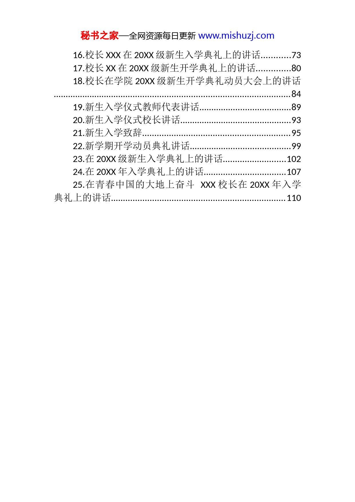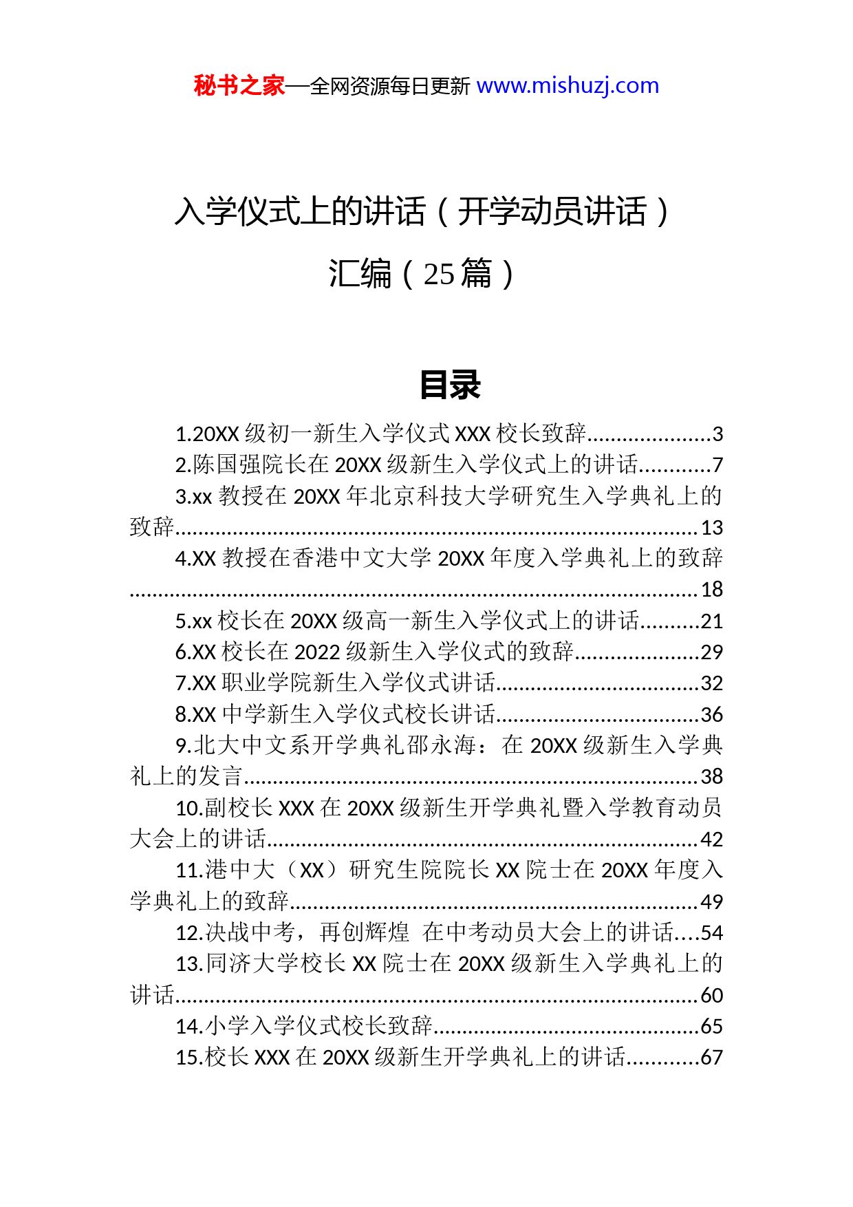 秘书之家—全网资源每日更新www.mishuzj.com入学仪式上的讲话(开学动员讲话)汇编(25篇)目录1.20XX级初一新生入学仪式XXX校长致辞.....................32.陈国强院长在20XX级新生入学仪式上的讲话............73.xx教授在20XX年北京科技大学研究生入学典礼上的致辞..........................................................................................134.XX教授在香港中文大学20XX年度入学典礼上的致辞..................................................................................................185.xx校长在20XX级高一新生入学仪式上的讲话..........216.XX校长在2022级新生入学仪式的致辞.....................297.XX职业学院新生入学仪式讲话...................................328.XX中学新生入学仪式校长讲话...................................369.北大中文系开学典礼邵永海:在20XX级新生入学典礼上的发言..............................................................................3810.副校长XXX在20XX级新生开学典礼暨入学教育动员大会上的讲话..........................................................................4211.港中大(XX)研究生院院长XX院士在20XX年度入学典礼上的致辞......................................................................4912.决战中考,再创辉煌在中考动员大会上的讲话....5413.同济大学校长XX院士在20XX级新生入学典礼上的讲话..........................................................................................6014.小学入学仪式校长致辞..............................................6515.校长XXX在20XX级新生开学典礼上的讲话............67秘书之家—全网资源每日更新www.mishuzj.com16.校长XXX在20XX级新生入学典礼上的讲话............7317.校长XX在20XX级新生开学典礼上的讲话..............8018.校长在学院20XX级新生开学典礼动员大会上的讲话..................................................................................................8419.新生入学仪式教师代表讲话......................................8920.新生入学仪式校长讲话..............................................9321.新生入学致辞.............................................................9522.新学期开学动员典礼讲话..........................................9923.在20XX级新生入学典礼上的讲话..........................10224.在20XX年入学典礼上的讲话..................................10725.在青春中国的大地上奋斗XXX校长在20XX年入学典礼上的讲话........................................................................110秘书之家—全网资源每日更新www.mishuzj.com福悦前行强国有我——20XX级初一新生入学仪式XXX校长致辞同学们:上午好!建党百年,辉煌今朝。伴着走过中学门的激动心情,我们迎来了20XX级初一新生的第一次集会,在此我代表传媒附中党政工团及在校全体师生欢迎你们!祝贺你们成为光荣的一名初中生!同学们,进入传媒附中你们是幸福的!我们的学校是一所公立初中学校,它建于1963年,2014年更名,是朝阳区一所历史悠久,文化底蕴深厚的学校。学校现有16个教学班,学生近500人,教职工65名,本科率100%,其中市区级骨干教师16名,硕博士生13人。近年来,学校办学效益显著,中考成绩逐年攀升。刚刚结束的北京市首次初中学业水平考试,我校570分以上学生高达65.6%,创历史新高,这些学生将有幸走进像北大附、八十中学等市区级优质高中和河北周边的优质高中进一步深造,也会有约20%同学升入普高学习,11.2%的学生走进职高技校,学习技能成为国家建设的有生力量。今年是传媒附中建校58周年,近58年的发展历程,学校始终坚守立德树人的教育初心,在新时代秉承传承“福”文化,绽放“悦”生命的教育理念,创新实施“福悦教育”,形成了“教书是福、育人为悦”的教风和“读书是福、成长为悦”的学风。学校先后获评全国“冰雪特色校”、“国防教育特色校”,北京市“冰雪示范校”、北京市“文明校园”、北京市“义务教育学校管理标准达标校”、北京市“语言文字达标校”,朝阳区第三届学校“理念文化”特色项目金牌第一名。同时学校依托传媒大学丰富的教育资源,构建“福悦风车”课程体系,打造媒秘书之家—全网资源每日更新www.mishuzj.com介素养、播音主持、人文艺术、科技制作等四大类14种社团课程,开设“传美大讲堂”,引进“人防技能课”和“短道速滑”等冰雪特色项目,每学期约有20多位大学教授和业内专家大咖亲临附中给学生授课指导,不仅拓宽了学生视野,满足学生全面而个性发展的需求,也促进了学校高质量特色发展,为区域内百姓提高了优质的教育需求。同学们,跨入传媒附中的校门,意味着你又迈出自己迅速成长的一步。只有保持奋斗、才能勇攀高峰!传媒附中是你成就梦想和辉煌的地方,附中学子应该是具有阳光心态,良好习惯、热爱学习、遵规守纪、热爱劳动、懂得感恩的人。为了帮助大家迈好初中生活的第一步,我给大家提四点建议:01重新定位打造自己在初中这个新起点上,首先要重新定位自己,调整好心态。也许你是踌躇满志的来到新学校,希望能展现自我的风采,但新集体里人才济济,以前出色的你不再拔尖,以前自信的你可能有了胆怯,这时请同学们不要心灰意冷一蹶不振,暂时的落后不等于失败,抖擞精神再出发是你的最佳选择。也许你在小学时就表现一般,进入中学有点茫然无措,这时请同学们务必不能自暴自弃,小学的一切只是代表过去,证明不了现在和将来,新的学习和生活刚刚开始,学校会陆续