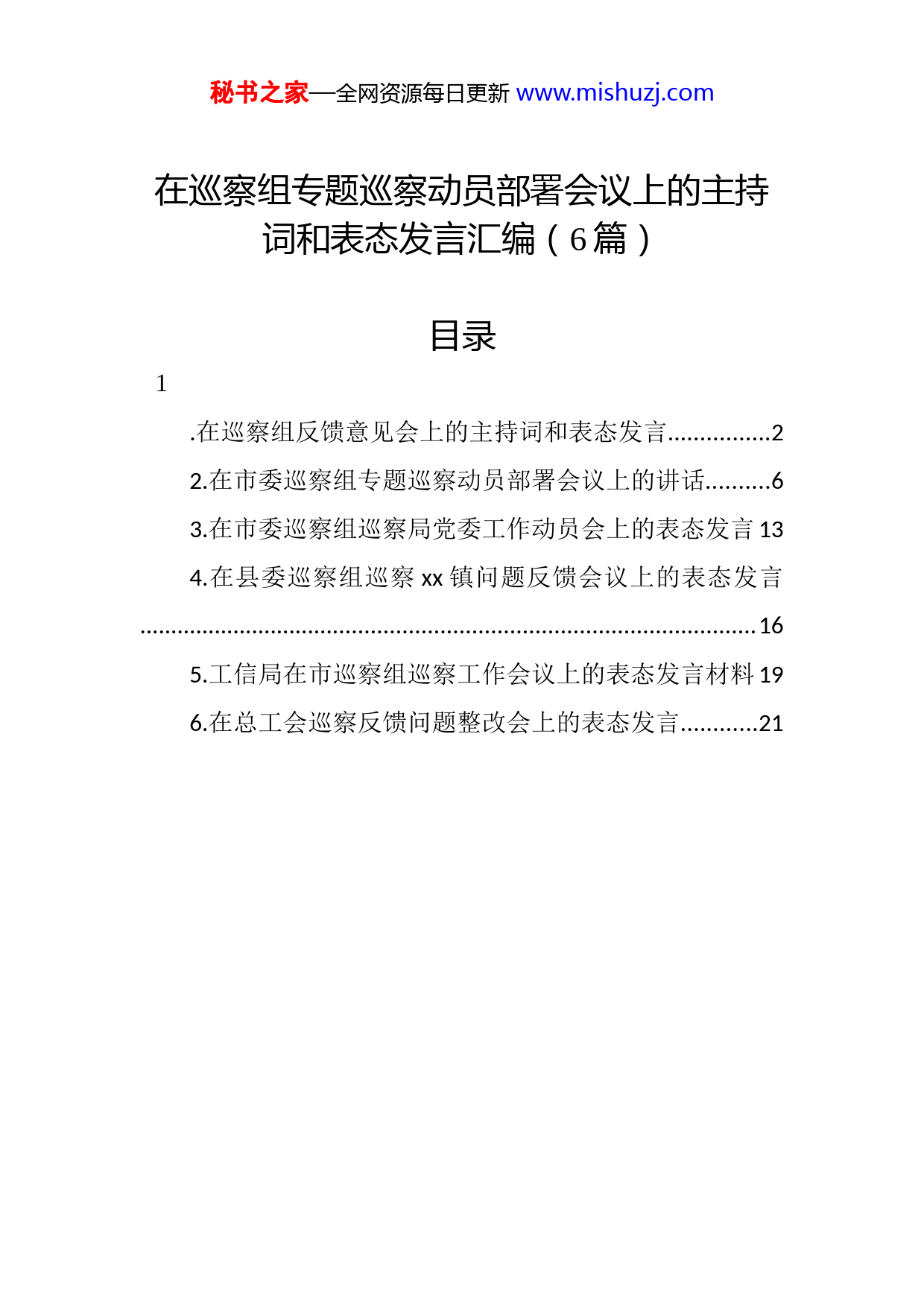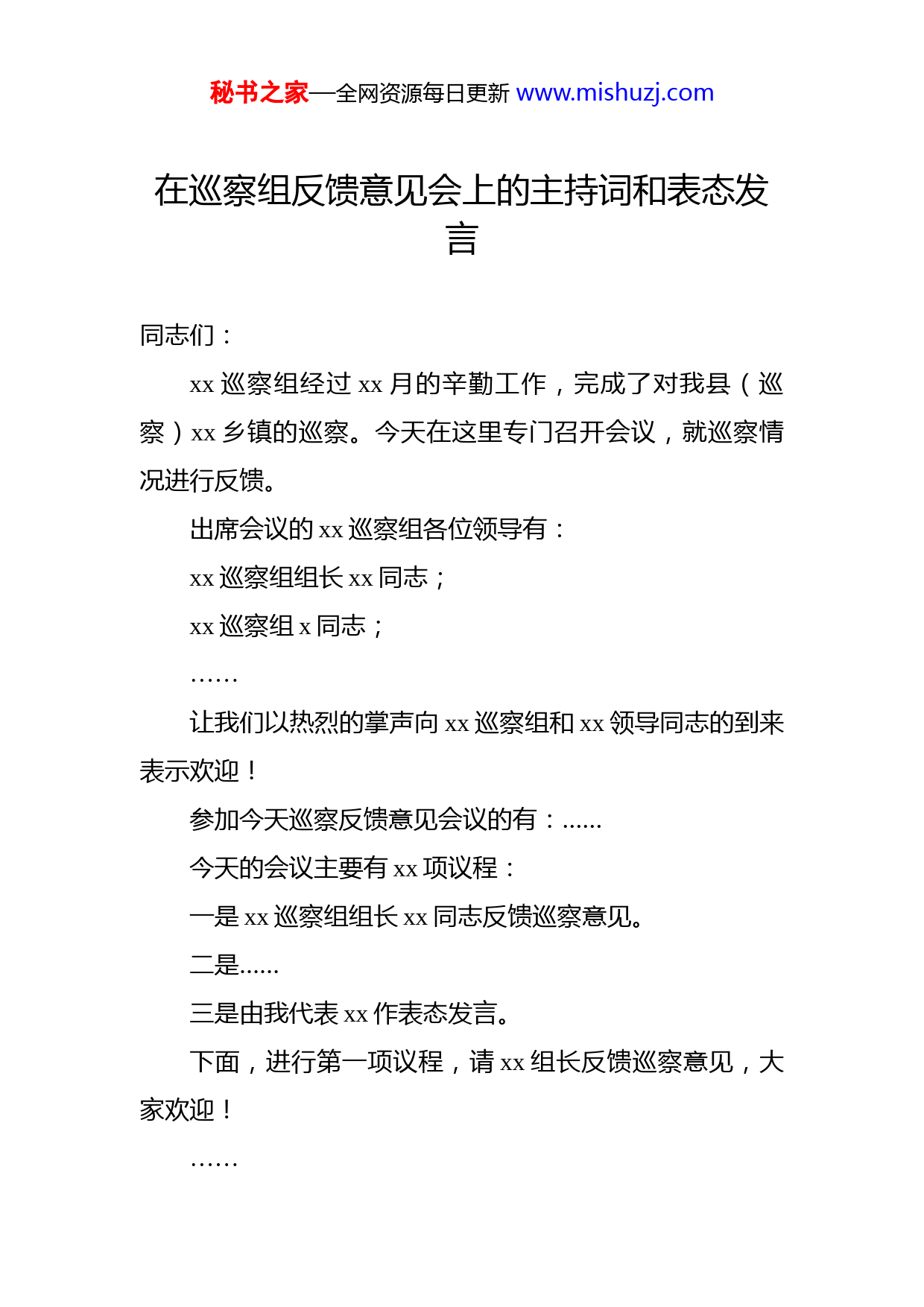 秘书之家—全网资源每日更新www.mishuzj.com在巡察组专题巡察动员部署会议上的主持词和表态发言汇编(6篇)目录1.在巡察组反馈意见会上的主持词和表态发言................22.在市委巡察组专题巡察动员部署会议上的讲话..........63.在市委巡察组巡察局党委工作动员会上的表态发言134.在县委巡察组巡察xx镇问题反馈会议上的表态发言..................................................................................................165.工信局在市巡察组巡察工作会议上的表态发言材料196.在总工会巡察反馈问题整改会上的表态发言............21秘书之家—全网资源每日更新www.mishuzj.com在巡察组反馈意见会上的主持词和表态发言同志们:xx巡察组经过xx月的辛勤工作,完成了对我县(巡察)xx乡镇的巡察。今天在这里专门召开会议,就巡察情况进行反馈。出席会议的xx巡察组各位领导有:xx巡察组组长xx同志;xx巡察组x同志;……让我们以热烈的掌声向xx巡察组和xx领导同志的到来表示欢迎!参加今天巡察反馈意见会议的有:……今天的会议主要有xx项议程:一是xx巡察组组长xx同志反馈巡察意见。二是……三是由我代表xx作表态发言。下面,进行第一项议程,请xx组长反馈巡察意见,大家欢迎!……秘书之家—全网资源每日更新www.mishuzj.com下面,进行第二项议程,xx同志讲话,大家欢迎!……同志们:刚才,xx组长代表巡察组反馈了意见,公正客观地指出了我县(乡、镇)在履行主体责任,执行民主集中制和政治纪律政治规矩,贯彻落实中央八项规定,加强作风建设、执行群众纪律情况等方面存在的突出问题。这些问题一针见血,切中要害,为我们敲响了警钟。同时,针对这些问题提出的意见建议,非常中肯、切合实际。xx同志作了重要讲话,就如何抓好巡察整改工作提出了明确的要求对巡察组提出的问题和建议,我们诚恳接受,并坚决抓好整改落实。xx巡察组的各位领导同志在巡察期间,以高度的政治责任感,不辞辛劳,勤奋工作,付出了大量的心血和汗水务实的作风、敬业的精神,给我们留下了深刻的印象,也给我们树立了良好的榜样。在此,我代表xx班子和全xx广大党员干部,对xx巡察组给予xx的关心、指导和帮助表示衷心感谢!下面,我代表xx就落实好巡察整改工作要求,向xx巡察组表态。第一,进一步增强思想自觉,高度重视xx巡察组反馈意见。xx巡察组的反馈意见,对我巡察深入推进党风廉政秘书之家—全网资源每日更新www.mishuzj.com建设和反腐败工作,进一步加强领导班子和干部队伍建设具有重要意义。我们将把整改落实工作作为一项重要的政治任务,主动对号入座,不选择、不变通,坚决整改落实到位。我们将层层分解任务,定出时间表,划出路线图,建立整改销号制度,保质保量完成整改任务。我们将深挖问题根源,拿出治本之策,防止类似问题再次发生。对整改落实过程中消极怠工、不担当不作为的干部,我们将严肃查处、绝不姑息。第二,进一步增强政治自觉,严格落实全面从严治党要求。我们将进一步树立主责主业意识,落实好各级党组织的主体责任和纪委的监督责任,深入推进党风廉政建设和反腐败斗争。我们将结合“两学一做”学习教育,加强政治纪律和政治规矩教育,不断增强党员干部政治意识、大局意识、核心意识、看齐意识。我们将落实《干部选拔任用工作条例》,树立正确用人导向,营造良好政治生态严格落实《中国共产党纪律处分条例》和《中国共产党问责条例》,严格执行《中国共产党廉洁自律准则》和中央八项规定,驰而不息纠正“四风”。以零容忍的态度,严肃查处不收敛、不收手、违反党规党纪的突出问题,始终保持反腐高压态势。第三,进一步增强行动自觉,以整改落实的实际成果推动经济社会发展。我们将把xx确定的任务目标与整改落秘书之家—全网资源每日更新www.mishuzj.com实工作结合起来,切实把整改的过程转化为落实全面从严治党要求的过程、转化为营造风清气正政治生态的过程、转化为推动经济社会发展的过程。我们要专题研究制定整改落实方案,自觉把思想和行动统一到xx要求上来,确保整改落实不务虚功、取得实效。总之,请xx放心,我们将以高度的政治责任感抓好整改落实工作,绝不松手、绝不松劲、绝不松懈,以整改落实的实际成效、以经济社会发展的实际成果,向xx和全巡察广大干部群众交上一份满意的答卷。最后,让我们再次以热烈的掌声,对xx巡察组在我巡察巡察工作表示感谢!(询问巡察组领导是否还有其他事宜。)今天的会议到此结束,散会。秘书之家—全网资源每日更新www.mishuzj.com在市委巡察组专题巡察动员部署会议上的讲话同志们:按照市委部署安排,市委第六巡察组从x月x至xx月xx日,对市发改委党组等xx家部门党组织开展“十四五”规划专题,市政数局党组等xx家部门党组织开展优化营商环境专题,市应急管理局党委开展安全生产专题巡察。这轮巡察,是七届市委首轮巡察。市委对这次巡察高度重视市委书记xx同志明确要求,要组织开展好这轮巡察,以巡察政治监督实际成效迎接党的二十大胜利召开。x月xx日召开了巡察动员部署会议,市委常委、市纪委书记、市监委主任、市委巡察工作领导小组组长xx同志出席会议,专门作部署、提要求。希望各被巡察党组(党工委)要高度重视巡察工作,充分认识这次专题巡察的重要意义,坚决贯彻落实好市委的部署要求。下面,就如何开展本