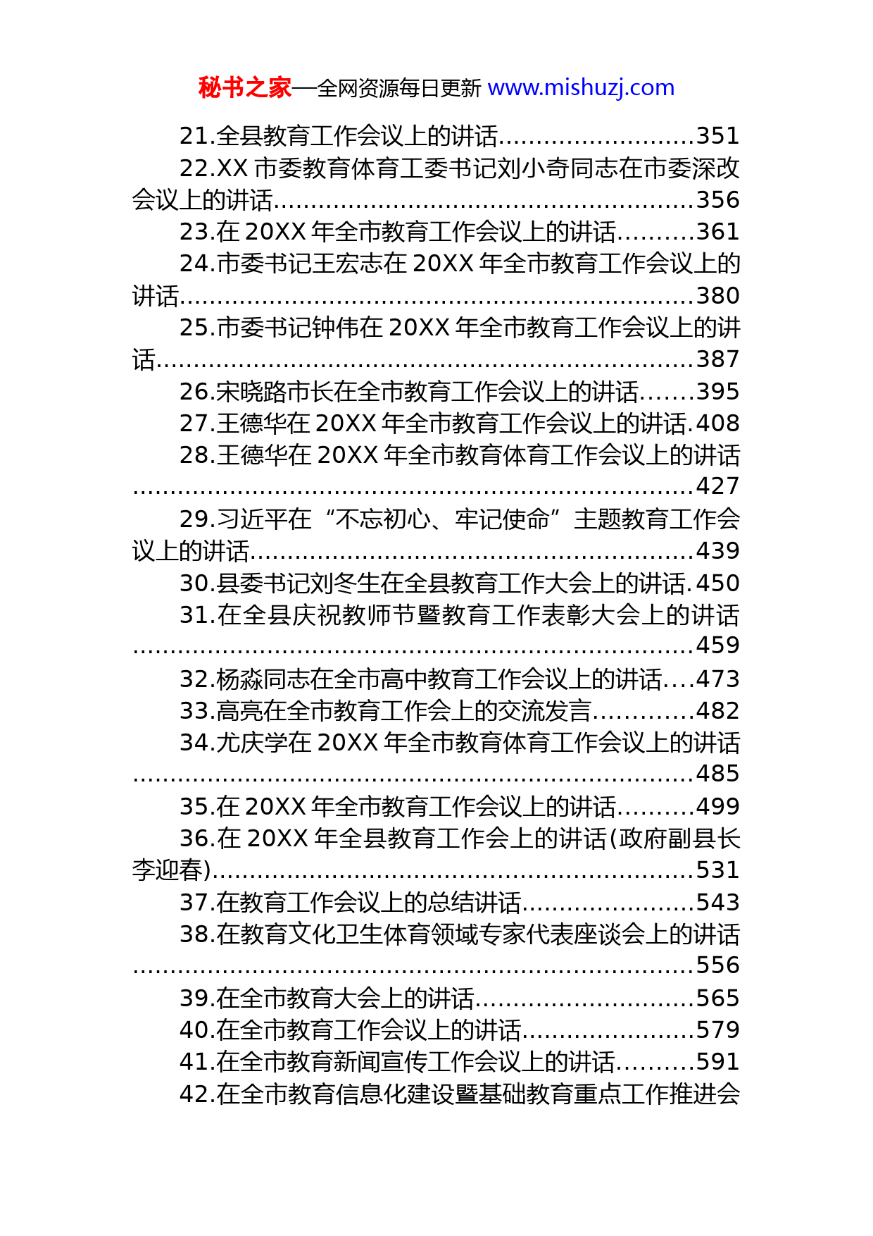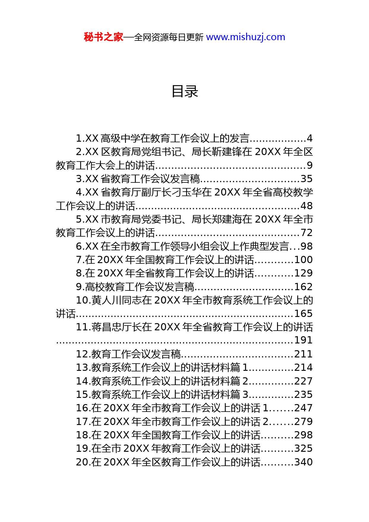 秘书之家—全网资源每日更新www.mishuzj.com目录1.XX高级中学在教育工作会议上的发言..................42.XX区教育局党组书记、局长靳建锋在20XX年全区教育工作大会上的讲话...............................................93.XX省教育工作会议发言稿...............................354.XX省教育厅副厅长刁玉华在20XX年全省高校教学工作会议上的讲话....................................................485.XX市教育局党委书记、局长郑建海在20XX年全市教育工作会议上的讲话.............................................726.XX在全市教育工作领导小组会议上作典型发言...987.在20XX年全国教育工作会议上的讲话............1008.在20XX年全省教育工作会议上的讲话............1299.高校教育工作会议发言稿...............................16210.黄人川同志在20XX年全市教育系统工作会议上的讲话.....................................................................16511.蒋昌忠厅长在20XX年全省教育工作会议上的讲话...........................................................................19112.教育工作会议发言稿...................................21113.教育系统工作会议上的讲话材料篇1..............21414.教育系统工作会议上的讲话材料篇2..............22715.教育系统工作会议上的讲话材料篇3..............23516.在20XX年全市教育工作会议上的讲话1.......24717.在20XX年全市教育工作会议上的讲话2.......27918.在20XX年全国教育工作会议上的讲话..........29819.在全市20XX年教育工作会议上的讲话..........32520.在20XX年全区教育工作会议上的讲话..........340秘书之家—全网资源每日更新www.mishuzj.com21.全县教育工作会议上的讲话..........................35122.XX市委教育体育工委书记刘小奇同志在市委深改会议上的讲话........................................................35623.在20XX年全市教育工作会议上的讲话..........36124.市委书记王宏志在20XX年全市教育工作会议上的讲话.....................................................................38025.市委书记钟伟在20XX年全市教育工作会议上的讲话........................................................................38726.宋晓路市长在全市教育工作会议上的讲话.......39527.王德华在20XX年全市教育工作会议上的讲话.40828.王德华在20XX年全市教育体育工作会议上的讲话...........................................................................42729.习近平在“不忘初心、牢记使命”主题教育工作会议上的讲话...........................................................43930.县委书记刘冬生在全县教育工作大会上的讲话.45031.在全县庆祝教师节暨教育工作表彰大会上的讲话...........................................................................45932.杨淼同志在全市高中教育工作会议上的讲话....47333.高亮在全市教育工作会上的交流发言.............48234.尤庆学在20XX年全市教育体育工作会议上的讲话...........................................................................48535.在20XX年全市教育工作会议上的讲话..........49936.在20XX年全县教育工作会上的讲话(政府副县长李迎春)................................................................53137.在教育工作会议上的总结讲话.......................54338.在教育文化卫生体育领域专家代表座谈会上的讲话...........................................................................55639.在全市教育大会上的讲话.............................56540.在全市教育工作会议上的讲话.......................57941.在全市教育新闻宣传工作会议上的讲话..........59142.在全市教育信息化建设暨基础教育重点工作推进会秘书之家—全网资源每日更新www.mishuzj.com上的讲话..............................................................59743.在全县党史学习教育总结会议上的讲话..........62344.在全县教育工作会议上的发言稿....................63645.在全州教育重点工作推进会上的讲话.............64046.在20XX年度全市教育工作会议上的讲话.......652秘书之家—全网资源每日更新www.mishuzj.comXX高级中学在教育工作会议上的发言XX高级中学是一所有着八十八年悠久办学历史的国家示范高中、省首批四星级高中、市首批名校。近年来,学校在县委、县政府正确领导下,在市县教育局和有关部门关心支持下,深入贯彻落实科学发展观,坚持“以人为本科学发展”的教育理念,以“坚持三个面向,遵循教育规律,实施素质教育,培育四有新人”为办学指导思想,以“创高标准的办学条件,建高层次的教师队伍,育高素质的创新人才,办高品位的特色学校”为办学目标,秉承“崇德尚学”的校训,发扬“团结、奉献、务实、争先”的赣中精神,积极实施素质教育,大力推进教育现代化进程,取得了较为显著的办学业绩。一、以引导教师发展为关键,建高层次的教师队伍有专长、强素质、高水平的教师队伍,是学校赖以建设和发展的核心和灵魂,培育锻炼出一支懂理论、精业务善管理、能钻研、具有科研能力和创新精神的一流教师队伍,是学校教书育人的坚实基础和中流砥柱。多年以来,学校认真落实《高层次教师队伍建设工程实施方案》,积极实施“名师工程”和“青蓝工程”,鼓励教师自学研读加大对骨干教师培训力度,选派优秀教师外出学习,经常举行课堂教学观摩研讨活动。目前,教师队伍年龄结构合理。经验丰富、精力充沛、年富力强的中年教师和朝气蓬勃、理念先进、勇于探索、敢于创新的青年教师占80%以上。在一大批骨干教师的