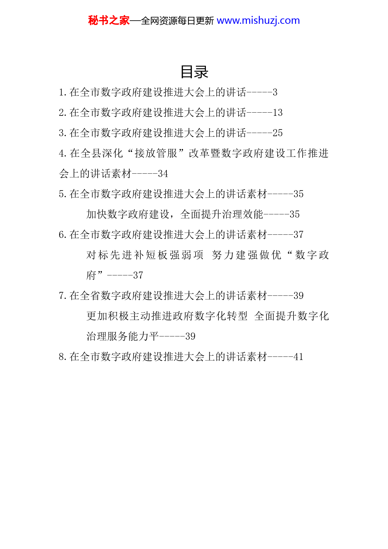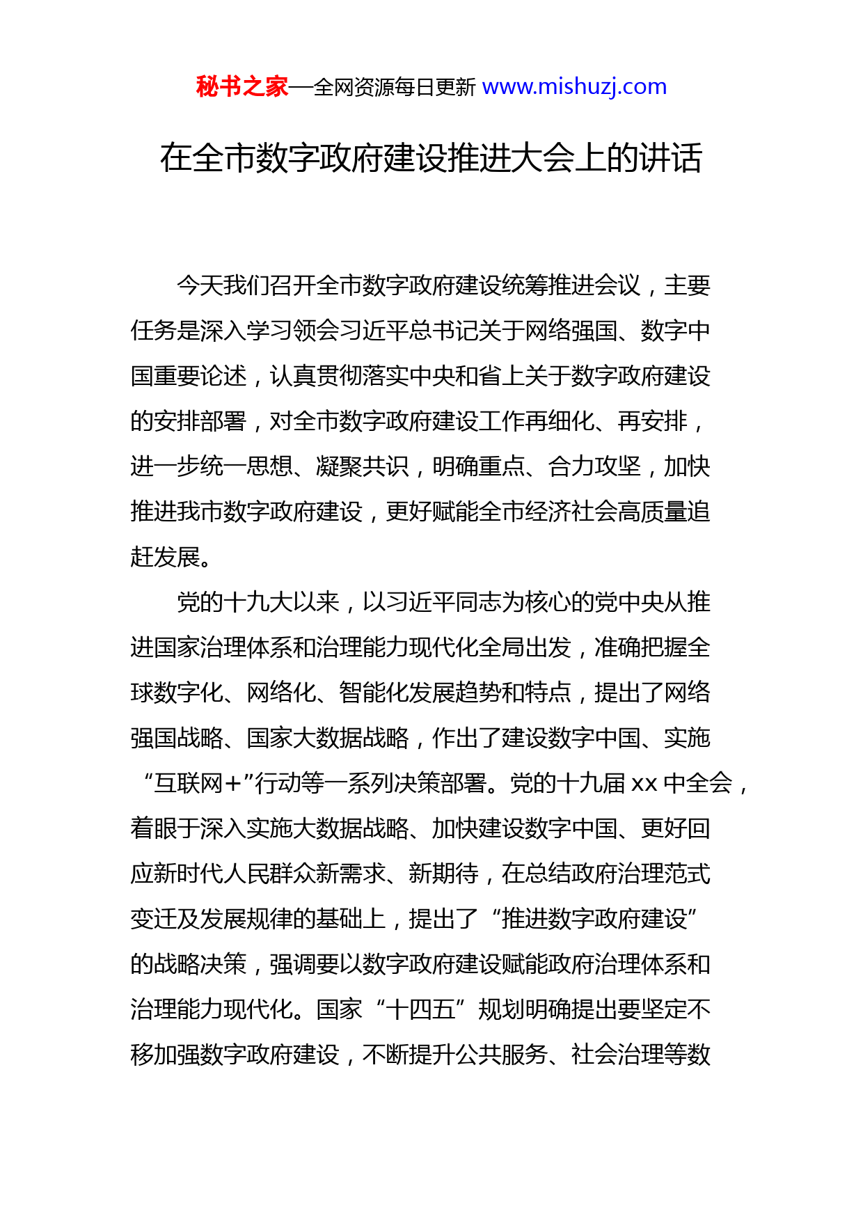 秘书之家—全网资源每日更新www.mishuzj.com目录1.在全市数字政府建设推进大会上的讲话-----32.在全市数字政府建设推进大会上的讲话-----133.在全市数字政府建设推进大会上的讲话-----254.在全县深化“接放管服”改革暨数字政府建设工作推进会上的讲话素材-----345.在全市数字政府建设推进大会上的讲话素材-----35加快数字政府建设,全面提升治理效能-----356.在全市数字政府建设推进大会上的讲话素材-----37对标先进补短板强弱项努力建强做优“数字政府”-----377.在全省数字政府建设推进大会上的讲话素材-----39更加积极主动推进政府数字化转型全面提升数字化治理服务能力平-----398.在全市数字政府建设推进大会上的讲话素材-----41秘书之家—全网资源每日更新www.mishuzj.com在全市数字政府建设推进大会上的讲话今天我们召开全市数字政府建设统筹推进会议,主要任务是深入学习领会习近平总书记关于网络强国、数字中国重要论述,认真贯彻落实中央和省上关于数字政府建设的安排部署,对全市数字政府建设工作再细化、再安排,进一步统一思想、凝聚共识,明确重点、合力攻坚,加快推进我市数字政府建设,更好赋能全市经济社会高质量追赶发展。党的十九大以来,以习近平同志为核心的党中央从推进国家治理体系和治理能力现代化全局出发,准确把握全球数字化、网络化、智能化发展趋势和特点,提出了网络强国战略、国家大数据战略,作出了建设数字中国、实施“互联网+”行动等一系列决策部署。党的十九届xx中全会,着眼于深入实施大数据战略、加快建设数字中国、更好回应新时代人民群众新需求、新期待,在总结政府治理范式变迁及发展规律的基础上,提出了“推进数字政府建设”的战略决策,强调要以数字政府建设赋能政府治理体系和治理能力现代化。国家“十四五”规划明确提出要坚定不移加强数字政府建设,不断提升公共服务、社会治理等数秘书之家—全网资源每日更新www.mishuzj.com字化智能化水平,为推进国家治理体系和治理能力现代化提供支撑。省委省政府高度重视数字政府建设工作,不仅组建了数字政府建设工作专班、成立了省大数据管理局和省大数据中心,出台了《数字政府建设总体规划(xx-xx)》《数字政府建设系统集成设计规划》等重要文件,搭建了数字政府建设的“四梁八柱”。尹弘书记开展专题调研,面对面、点对点指导,并作出重要指示,省政府常务会议多次研究推进数字政府建设工作,从省级层面对数字政府是什么、干什么、怎么干作出了系统设计。去年xx月xx日召开了全省对接会,振鹤省长xx月xx日专题召开全省数字政府建设统筹推进会再次作出全面安排部署,为我们更快、更实加快数字政府建设明确了方向、路径和举措。大家一定要清醒认识到,数字政府建设虽然是单项工作,但非常重要,事关经济社会发展方方面面,是推进信息化建设的需要,是进一步优化营商环境的需要,是更好服务人民群众的需要,是推进政府治理能力和治理体系现代化的需要。今天,我们召开全市数字政府建设统筹推进会,就是要在已有工作的基础上,再次动员大家乘势而上、加力加速,严格按照时限要求推动数字政府建设,力争取得更大进展,更好助力我们追赶发展、争先进位。前面,宝林同志通报了全市数字政府建设项目进展情况,中国移动集成秘书之家—全网资源每日更新www.mishuzj.com项目负责同志介绍了数字政府建设总体情况,市政管局、市大数据服务中心和陇西县政府负责同志分别作了交流发言,大家要对标先进,找准差距,下大力气推进数字政府建设。下面,我讲三个方面的意见。一、总结成绩,找准差距,准确把握数字政府建设现状近年来,市委市政府高度重视数字政府建设工作,认真贯彻落实中央、省上相关部署,成立了以市政府分管领导为组长的工作专班,设立了市大数据服务中心,正在加快实施以xx市联合大数据中心为重点的各项软硬件工程,数字政府建设各项工作从去年xx月份全面启动,正在紧锣密鼓加快推进。这方面,我们的工作起步是早的,在省上全面推动之前已经做了大量工作,取得了阶段性成效。一是基础支撑体系初具规模。已建成xx市电子政务云平台、xx市数据共享交换平台、市县乡村四级全覆盖的xx市电子政务外网,实现政务外网全覆盖,目前已接入全市部门单位及乡镇、村(社区)xx家,覆盖率达到xx%。特别是我们谋划建设的履责管理“六大系统一平台”已全部上线运行,为政府实现数字化治理提供了有效支撑。二是政务服务体系加快完善。先后建成运行电子政务云和一体化政务服务应用系统、“陇码”公共服务平台为核心的智慧政务体系,一体化政务服务平台加载市级事项秘书之家—全网资源每日更新www.mishuzj.comxx条、县区事项xx万项、乡村事项xx万项,市级全程网办率达到xx%、县区(含乡镇街道)达到xx%以上。“ixx”APP陇码公共服务平台挂载xx个功能模块xx项政务服务事项,“掌上办”“指尖办”已经初步实现。三是资源整合共享不断拓展。市数据共享交换平台与国家、省上数据汇聚共享的“快通道”全线打通,已发布共享目录xx条,汇聚xx项数据目录xx万条数据,支撑服务金融、住建、自然资源、发改、公共资源交易中心等部门申请使用法人红黑榜、营业执照、公积金缴纳、社保卡等数据信息资源xx项,数据总交换量xx亿条,共享