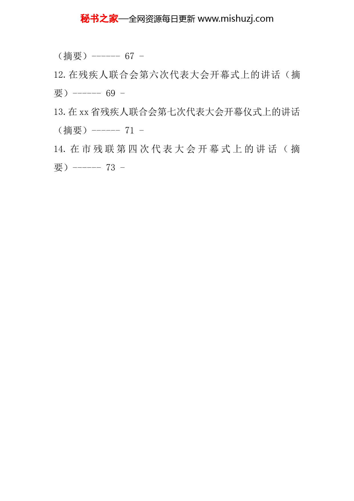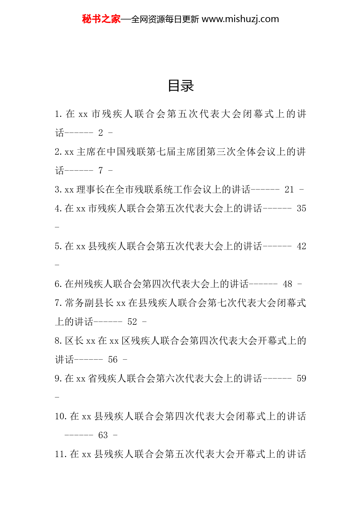 秘书之家—全网资源每日更新www.mishuzj.com目录1.在xx市残疾人联合会第五次代表大会闭幕式上的讲话------2-2.xx主席在中国残联第七届主席团第三次全体会议上的讲话------7-3.xx理事长在全市残联系统工作会议上的讲话------21-4.在xx市残疾人联合会第五次代表大会上的讲话------35-5.在xx县残疾人联合会第五次代表大会上的讲话------42-6.在州残疾人联合会第四次代表大会上的讲话------48-7.常务副县长xx在县残疾人联合会第七次代表大会闭幕式上的讲话------52-8.区长xx在xx区残疾人联合会第四次代表大会开幕式上的讲话------56-9.在xx省残疾人联合会第六次代表大会上的讲话------59-10.在xx县残疾人联合会第四次代表大会闭幕式上的讲话------63-11.在xx县残疾人联合会第五次代表大会开幕式上的讲话秘书之家—全网资源每日更新www.mishuzj.com(摘要)------67-12.在残疾人联合会第六次代表大会开幕式上的讲话(摘要)------69-13.在xx省残疾人联合会第七次代表大会开幕仪式上的讲话(摘要)------71-14.在市残联第四次代表大会开幕式上的讲话(摘要)------73-秘书之家—全网资源每日更新www.mishuzj.com在xx市残疾人联合会第五次代表大会闭幕式上的讲话xx市人民政府副市长、市残联第五届主席团主席xx各位代表、同志们:xx市残疾人联合会第五次代表大会在市委、市政府的领导下,在省残联的关心指导下和社会各界的大力支持下,经过与会代表的共同努力,圆满完成了各项预定议程,即将胜利闭幕。会上,代表们以高度的责任感和使命感,认真履职,充分表达了全市残疾人的愿望和要求,在此,我代表市委、市政府和大会主席团,向全体代表和工作人员以及所有关心、支持残疾人事业的社会各界人士表示衷心的感谢!这次会议是在全市上下喜迎党的二十大,深入学习贯彻习近平总书记考察xx重要讲话和关于残疾人事业的重要指示批示精神之际,召开的一次重要会议。大会总结了我市过去五年残疾人事业取得的成绩,部署了今后五年的工作思路和目标任务,选举产生了新一届xx市残联领导班子。会议的召开,对于动员广大残疾人和残疾人工作者进一步做好残疾人工作、促进残疾人事业发展,必将产生重大而深远的影响。本次会议既是一次实事求是的总结会,又是一次带领全市残疾人朝着第二个百年奋斗目标进军的展望会、动员会,吹响了残疾人事业新发展的号角。这次会议,代表们选举我担任新一届残疾人联合会主秘书之家—全网资源每日更新www.mishuzj.com席团主席,我深感荣幸,又倍感责任重大,感谢大家对我的信任,我一定不负众望。在今后的工作中,一定按照大会提出的工作思路和目标,与新当选的各位委员、代表一道,恪尽职守,认真履职,为扎实推进我市残疾人事业作出不懈努力。同志们,残疾人事业新发展的号角已经吹响,我们必须以时不我待的紧迫感,以舍我其谁的使命感全力投入到新时代新阶段的残疾人工作中。下面,我就今后一段时期残疾人工作讲几点意见:一、以高度的思想自觉和行动,扎实推进残疾人各项事业高质量发展发展残疾人事业。做好残疾人工作,不仅关系到广大残疾人的切身利益,更关系到全面建设社会主义现代化国家。残疾人是社会人群中的困难群体,帮助残疾人克服生活、工作中的困难,为残疾人提供康复、就业、教育、维权等服务,让残疾人生活、工作有尊严、有人格、更体面,这是我们工作努力的方向,也是文明城市的标志。我市现有15.7万残疾人士,占全市总人口的6.4%,关联千家万户。各级政府、各相关部门要从全局和战略的高度出发,充分认识到做好残疾人工作的重要意义,一定要把发展残疾人事业作为一项底线工程,高度重视,统筹规划,优先发展;市残工委成员单位要主动承担起残疾人工作任务,自觉为残疾人事业的发展创造更加优良的条件;社会各界要大力弘扬扶残助残优良传统,进一秘书之家—全网资源每日更新www.mishuzj.com步形成全社会理解、尊重、关爱、帮助残疾人,支持残疾人事业发展的良好风尚;新一届残联主席团和执行理事会要认真履职,积极研究和落实本次大会确定的发展思路和目标任务,确保我市残疾人事业“十四五”规划全面实施,使残疾人工作与我市的经济社会实现同步xx发展。二、以高度的服务意识和效率意识,不断提升残疾人服务水平。这次会议已明确了今后五年的工作思路和奋斗目标,即着眼残疾人最关心、最直接、最现实的利益问题和困难,以满足残疾人日益增长的美好生活需要为根本目的,保障残疾人基本民生和平等权益,健全帮扶残疾人社会福利制度,不断完善残疾人关爱服务体系和设施,改善残疾人生活品质,增强残疾人自我发展能力,全面开创xx残疾人事业新局面。我市残疾人工作的基础是好的,但是也要看到,我们现在还存在着不少问题,还需各级政府和有关部门努力予以解决。全市各级残联要持续推进作风革命、效能建设,强化服务意识、效率意识,认真履行残联“代表、管理、服务”的职能,寓代表、管理、维权于服务之中,密切联系广大残疾人,倾听残疾人的呼声,代表残疾人的利益,管理好残疾人工作事务,把党和政府对残疾人的关怀落到实处,把满足残疾人及其亲友对美好生活的需求作为我们工作的出发点和落脚点。我们要大力推行项目工作法,把实现残疾人事业新发展的“大主题”转化秘书之家—全网资源每日更新www.mishuzj.com