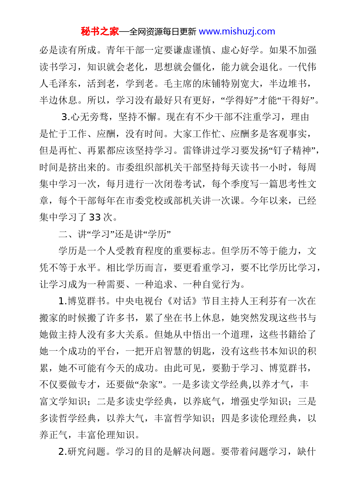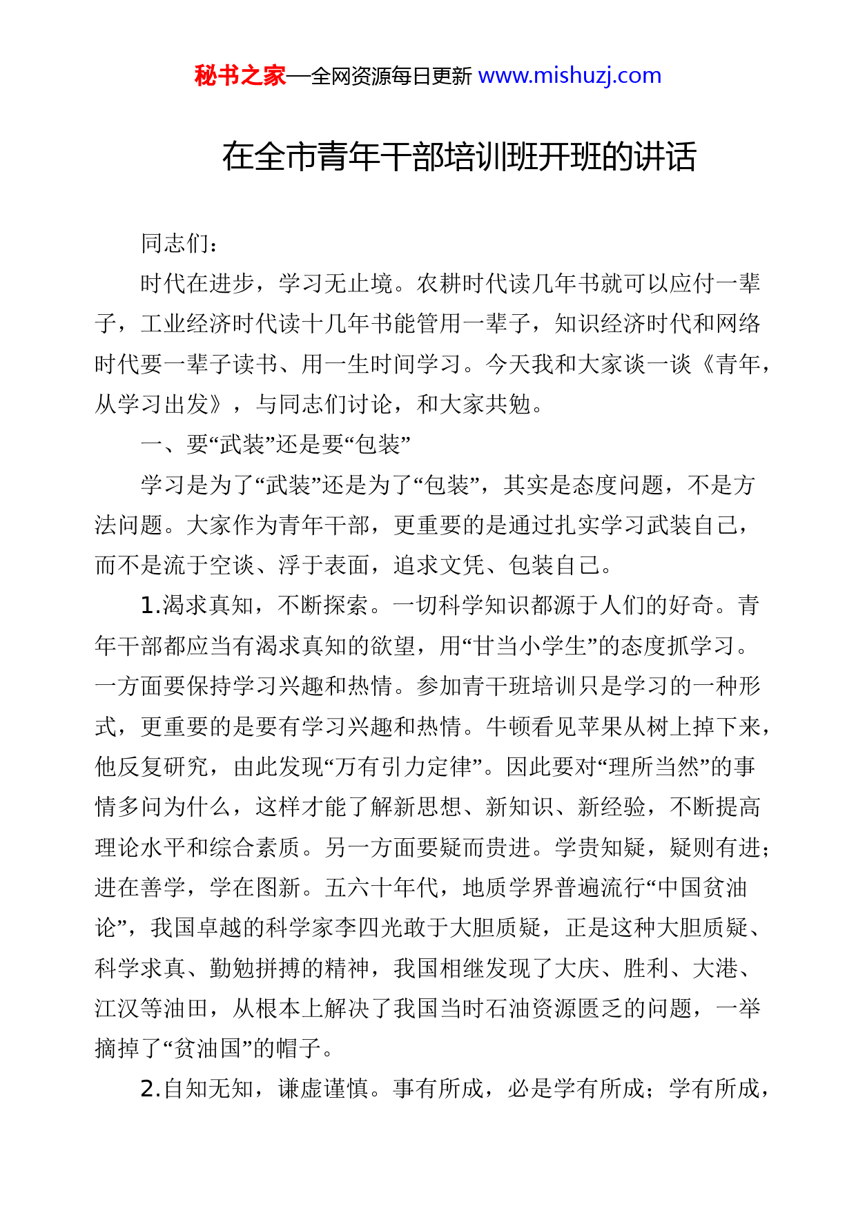 秘书之家—全网资源每日更新www.mishuzj.com在全市青年干部培训班开班的讲话同志们:时代在进步,学习无止境。农耕时代读几年书就可以应付一辈子,工业经济时代读十几年书能管用一辈子,知识经济时代和网络时代要一辈子读书、用一生时间学习。今天我和大家谈一谈《青年,从学习出发》,与同志们讨论,和大家共勉。“”“”一、要武装还是要包装“”“”学习是为了武装还是为了包装,其实是态度问题,不是方法问题。大家作为青年干部,更重要的是通过扎实学习武装自己,而不是流于空谈、浮于表面,追求文凭、包装自己。1.渴求真知,不断探索。一切科学知识都源于人们的好奇。青“”年干部都应当有渴求真知的欲望,用甘当小学生的态度抓学习。一方面要保持学习兴趣和热情。参加青干班培训只是学习的一种形式,更重要的是要有学习兴趣和热情。牛顿看见苹果从树上掉下来,“”“”他反复研究,由此发现万有引力定律。因此要对理所当然的事情多问为什么,这样才能了解新思想、新知识、新经验,不断提高理论水平和综合素质。另一方面要疑而贵进。学贵知疑,疑则有进;“进在善学,学在图新。五六十年代,地质学界普遍流行中国贫油”论,我国卓越的科学家李四光敢于大胆质疑,正是这种大胆质疑、科学求真、勤勉拼搏的精神,我国相继发现了大庆、胜利、大港、江汉等油田,从根本上解决了我国当时石油资源匮乏的问题,一举“”摘掉了贫油国的帽子。2.自知无知,谦虚谨慎。事有所成,必是学有所成;学有所成,秘书之家—全网资源每日更新www.mishuzj.com必是读有所成。青年干部一定要谦虚谨慎、虚心好学。如果不加强读书学习,知识就会老化,思想就会僵化,能力就会退化。一代伟人毛泽东,活到老,学到老。毛主席的床铺特别宽大,半边堆书,“”“”半边休息。所以,学习没有最好只有更好,学得好才能干得好。3.心无旁骛,坚持不懈。现在有不少干部不注重学习,理由是忙于工作、应酬,没有时间。大家工作忙、应酬多是客观事实,“”但是再忙、再累都应该坚持学习。雷锋讲过学习要发扬钉子精神,时间是挤出来的。市委组织部机关干部坚持每天读书一小时,每周集中学习一次,每月进行一次闭卷考试,每个季度写一篇思考性文章,每个干部每年在市委党校或部机关讲一次课。今年以来,已经集中学习了33次。“”“”二、讲学习还是讲学历学历是一个人受教育程度的重要标志。但学历不等于能力,文凭不等于水平。相比学历而言,要更看重学习,要不比学历比学习,让学习成为一种需要、一种追求、一种自觉行为。1.博览群书。中央电视台《对话》节目主持人王利芬有一次在搬家的时候搬了许多书,累了坐在书上休息,她突然发现这些书与她做主持人没有多大关系。但她从中悟出一个道理,这些书籍给了她一个成功的平台,一把开启智慧的钥匙,没有这些书本知识的积累,她不可能有今天的成功。由此可见,要勤于学习、博览群书,“”不仅要做专才,还要做杂家。一是多读文学经典,以养才气,丰富文学知识;二是多读史学经典,以养底气,增强史学知识;三是多读哲学经典,以养大气,丰富哲学知识;四是多读伦理经典,以养正气,丰富伦理知识。2.研究问题。学习的目的是解决问题。要带着问题学习,缺什秘书之家—全网资源每日更新www.mishuzj.com么补什么,差什么学什么。大家到党校培训,就是要提高能力,提升境界,包括改进工作方式方法。要选择工作中的一些问题,有针对性的深入思考,确保学有所得,学有所获。3.“融会贯通。毛主席说过:读书是学习,使用也是学习,而”且是更重要的学习。大家要把这次学习的过程当作提升自我、推进工作的过程,做到理论与实际、学习与运用、言论与行动相统一。只有通过提高思想境界、提升工作能力、提升理论水平、提高综合“素质,才能做一个高尚的人,一个纯粹的人,一个有道德的人,”一个脱离了低级趣味的人,一个有益于人民的人。“”“”三、比提高还是比提拔“”不想当将军的士兵不是好士兵。作为青年干部,不讲提拔不现实,只讲提拔不正确。提拔必须以提高为基础,提高要体现在能力上。具体是三个方面。1.赢在执行。实干兴邦,空谈误国。《执行重在到位》一书中“有两句话给我印象特别深刻:执行不到位等于不执行,执行不到”位不如不执行。没有执行力,落实就是空话,务实就是口号。要转变观念抓执行。很多事情不是缺乏解决问题的能力,而是缺乏解决问题的态度。我们去检查工作,有些干部宁愿花精力、花时间、花金钱应付检查,不愿意花精力、花时间、花金钱把工作做扎实,从根本上解决问题。这就是缺乏解决问题的态度。要从转变观念入手,重视基础工作,把时间花在平时,把精力花在平时,把金钱花在平时,把工作做扎实。要杜绝借口抓执行。有些干部对布置的任务,一是拖,一拖十天半月,拖到忘记就过关;二是推,找种种借口推辞工作、推卸责任;三是抗,软磨硬泡,顶着不办。这都不利“于工作,不利于成长,不利于提高。美国西点军校有句名言:没秘书之家—全网资源每日更新www.mishuzj.com”有任何借口。这是西点军校200年奉行的最重要的行为准则,是西点军校传授给每一位新生的第一个理念。秉承这一理念,200多年来西点军校为美国培养了3位总统、5位五星级上将、3700“”名将军。要强化细节抓执