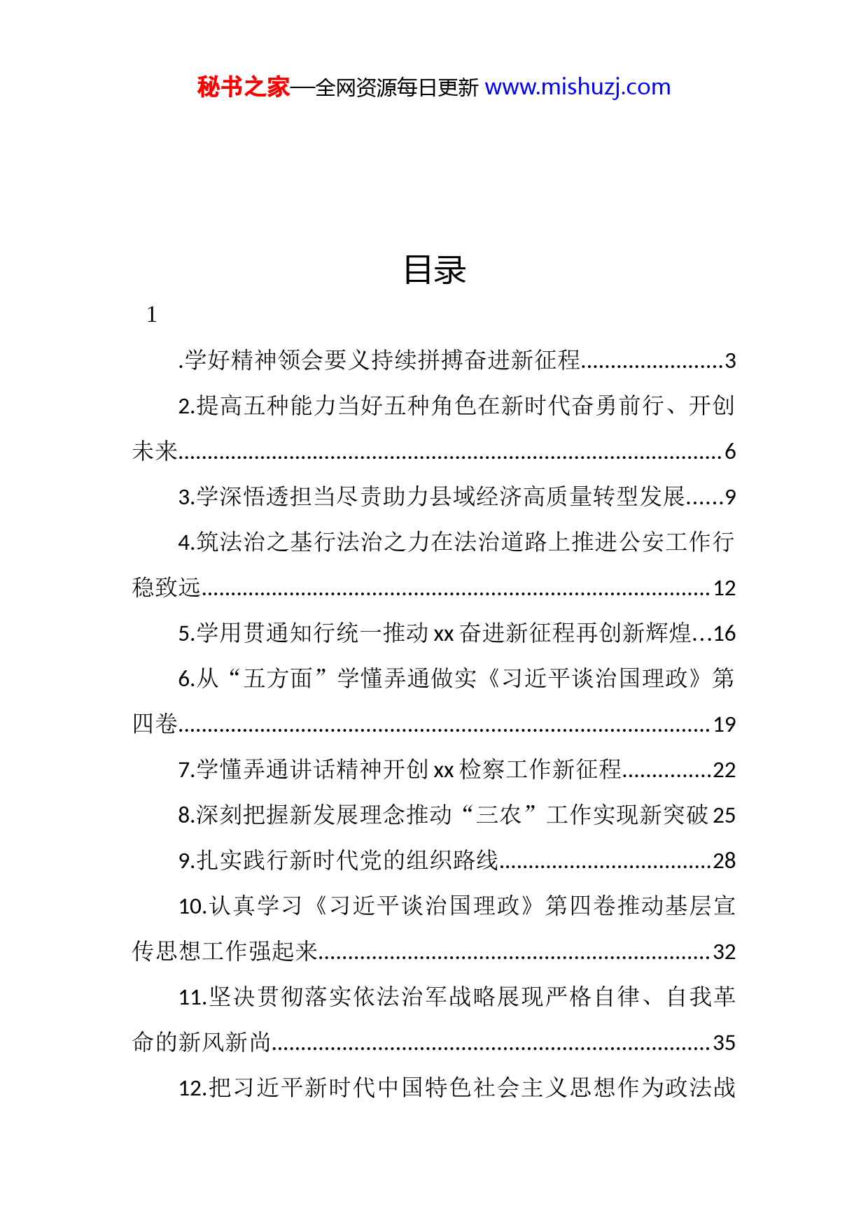 秘书之家—全网资源每日更新www.mishuzj.com目录1.学好精神领会要义持续拼搏奋进新征程........................32.提高五种能力当好五种角色在新时代奋勇前行、开创未来............................................................................................63.学深悟透担当尽责助力县域经济高质量转型发展......94.筑法治之基行法治之力在法治道路上推进公安工作行稳致远......................................................................................125.学用贯通知行统一推动xx奋进新征程再创新辉煌...166.从“五方面”学懂弄通做实《习近平谈治国理政》第四卷..........................................................................................197.学懂弄通讲话精神开创xx检察工作新征程...............228.深刻把握新发展理念推动“三农”工作实现新突破259.扎实践行新时代党的组织路线....................................2810.认真学习《习近平谈治国理政》第四卷推动基层宣传思想工作强起来..................................................................3211.坚决贯彻落实依法治军战略展现严格自律、自我革命的新风新尚..........................................................................3512.把习近平新时代中国特色社会主义思想作为政法战秘书之家—全网资源每日更新www.mishuzj.com线政治建设的根本要求..........................................................3913.坚持党的全面领导统筹发展和安全..........................4214.用马克思主义中国化最新成果武装头脑不断提升政治判断力、政治领悟力、政治执行力...................................4515.坚定不移走高质量发展之路......................................4816.从学习经典著作中汲取成长力量..............................5117.深思细研学理论凝神聚力促发展..............................5518.凝心聚力践行全过程人民民主..................................5919.践行新思想展现新作为以实际行动迎接中共二十大胜利召开..................................................................................62秘书之家—全网资源每日更新www.mishuzj.com学好精神领会要义持续拼搏奋进新征程一、学有所获,找好新时代落脚点通过本次学习活动,让我对《习近平谈治国理政》第四卷有了更深层次的理解与思考,深刻体会到书中蕴藏的丰富内涵和真挚情怀,习近平总书记在书中的原创性、指导性重要论述,更是引导全党全国人民朝着社会主义现代化扎实迈进的方法论和风向标。对此,我们必须要努力做到学有所获、学以致用。一是在学习中把握规律方向。当前,面对错综复杂的国内外政治经济形势和改革发展的内在压力,只有把政治理论学习放在更加重要的位置,才能靠先进的理论武装头脑、指导实践,从而不断提升理论素养,坚定发展自信,明确发展方向。二是在学习中增进人民情怀。要坚信党的根基在人民、党的力量在人民,坚持一切为了人民、一切依靠人民,深刻体会为民之情,真正在想问题、做决策、干事情上,注入真感情,以人民群众满不满意作为衡量一切工作好坏的标准,做好民生这篇“大文章”。三是在学习中永葆奋斗精神。我们党已经走过了101年的历程,但我们要永远保持建党时中国共产党人的奋斗精秘书之家—全网资源每日更新www.mishuzj.com神,在回顾历史中增强开拓前进的勇气和力量,深入认识当前各项工作新常态。同时,要经常反思缺点不足,为今后工作提供有效借鉴。二、牢记嘱托,握好新时代接力棒身处百年变局的重要时期,我们更要持续提升能力、优化作风,为事业发展进步夯实“软基础”。一是立场要稳。中国特色社会主义的本质特征和最大优势,正是中国共产党领导,要从根本之处着眼于政治大局,站在更高的政治立场上,坚持对党绝对忠诚。政治上要不断锤炼忠诚的政治品格和政治定力,行为上坚决贯彻落实中央、省市县各项工作部署,确保不打折扣执行到位。二是工作要勤。勤政就是在其位就要谋其政,要有认真负责的精神,力求每一项工作都做到位,每一件事情都办牢靠,始终以精益求精的标准要求自己,从大处着眼,从小处着手,始终以时不我待、只争朝夕的紧迫感,主动工作,积极作为。三是干事要能。作为领导干部,不仅要有干事的愿望,还要有办成事的能力。要善于思考、善于调控、善于决策树立抓工作有思路、抓落实有业绩的政风,努力用干部的辛苦指数换回群众的幸福指数,面对危险敢于挺身而出,面对失误敢于承担责任,面对歪风邪气敢于坚决斗争。四是从政要廉。廉洁是立身之本,廉洁从政、干净干秘书之家—全网资源每日更新www.mishuzj.com事既是人民的期盼,也是新时期领导干部面临的一项重大考验。要始终把廉洁自律作为立身处世的根本要求,自觉执行关于廉洁从政的各项规定,规范自己的工作,约束自己的言行,不断强化自律意识、廉政意识和法制意识。五是遇难要闯。习近平总书记强调,中华民族的伟大复兴,不是轻轻松松靠着敲锣打鼓就能实现的。改革发展走到今天,“低垂的果子”都已经摘完,剩下的全是难啃的硬骨头,我们要在紧要关头做到勇挑重担子、能接烫山芋,凡是有利于党和人民的事,就要事不避难、义不逃责。三、厚植情怀,做好新时代答卷人立足新发展阶段,更需要厚植党员干部初心情怀,凝聚奋进力量,在新时代、新征程的“赶考”路上永不停歇。一是答好民生底线“基础卷”。始终将群众的安危冷暖