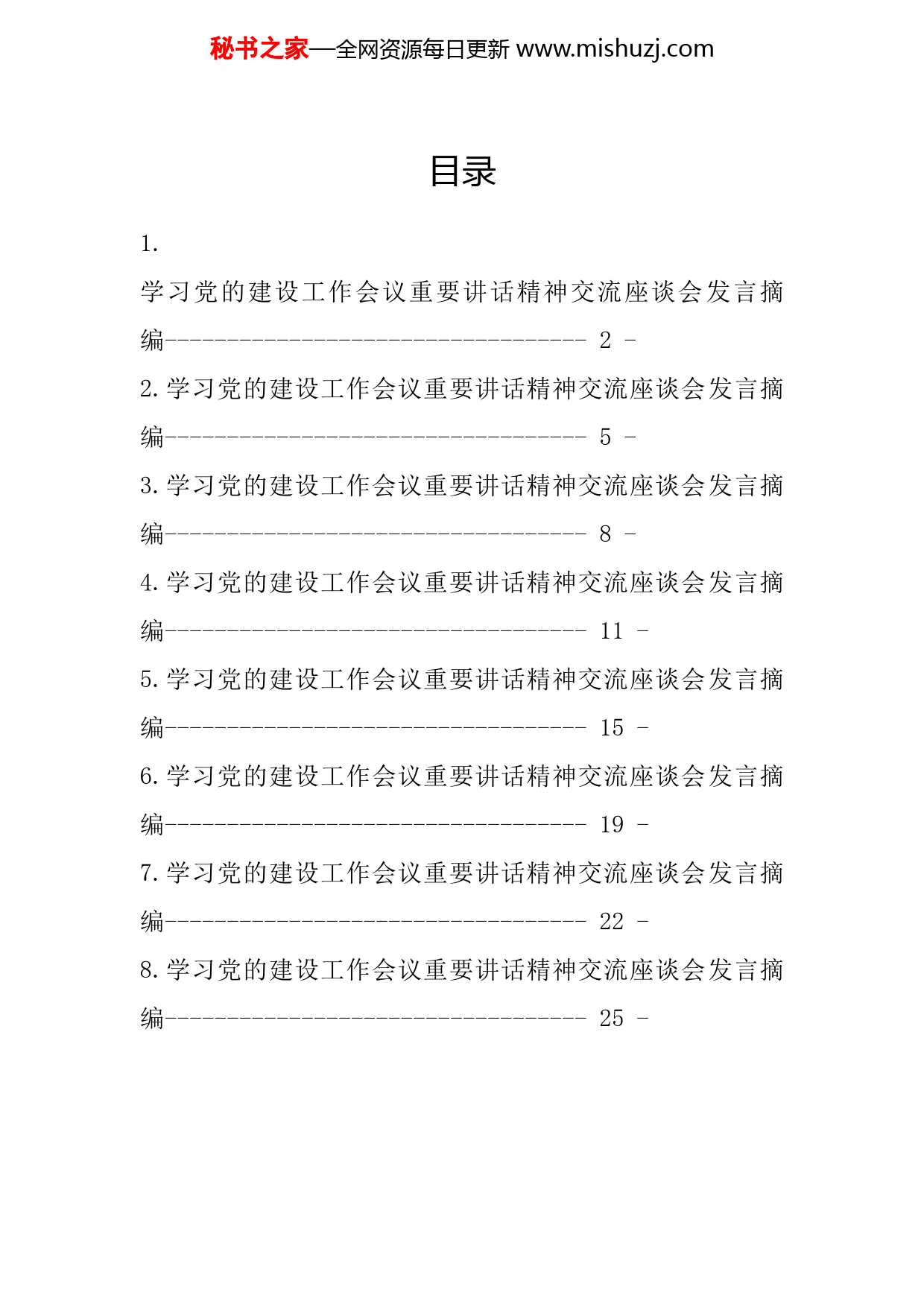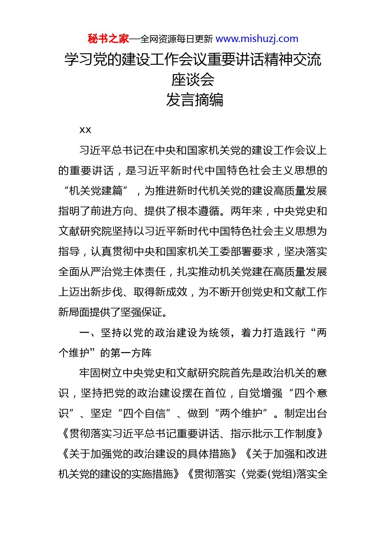 秘书之家—全网资源每日更新www.mishuzj.com目录1.学习党的建设工作会议重要讲话精神交流座谈会发言摘编----------------------------------2-2.学习党的建设工作会议重要讲话精神交流座谈会发言摘编----------------------------------5-3.学习党的建设工作会议重要讲话精神交流座谈会发言摘编----------------------------------8-4.学习党的建设工作会议重要讲话精神交流座谈会发言摘编----------------------------------11-5.学习党的建设工作会议重要讲话精神交流座谈会发言摘编----------------------------------15-6.学习党的建设工作会议重要讲话精神交流座谈会发言摘编----------------------------------19-7.学习党的建设工作会议重要讲话精神交流座谈会发言摘编----------------------------------22-8.学习党的建设工作会议重要讲话精神交流座谈会发言摘编----------------------------------25-秘书之家—全网资源每日更新www.mishuzj.com学习党的建设工作会议重要讲话精神交流座谈会发言摘编xx习近平总书记在中央和国家机关党的建设工作会议上的重要讲话,是习近平新时代中国特色社会主义思想的“机关党建篇”,为推进新时代机关党的建设高质量发展指明了前进方向、提供了根本遵循。两年来,中央党史和文献研究院坚持以习近平新时代中国特色社会主义思想为指导,认真贯彻中央和国家机关工委部署要求,坚决落实全面从严治党主体责任,扎实推动机关党建在高质量发展上迈出新步伐、取得新成效,为不断开创党史和文献工作新局面提供了坚强保证。一、坚持以党的政治建设为统领,着力打造践行“两个维护”的第一方阵牢固树立中央党史和文献研究院首先是政治机关的意识,坚持把党的政治建设摆在首位,自觉增强“四个意识”、坚定“四个自信”、做到“两个维护”。制定出台《贯彻落实习近平总书记重要讲话、指示批示工作制度》《关于加强党的政治建设的具体措施》《关于加强和改进机关党的建设的实施措施》《贯彻落实〈党委(党组)落实全秘书之家—全网资源每日更新www.mishuzj.com面从严治党主体责任规定〉实施办法》等系列制度,始终把学习贯彻落实习近平总书记重要讲话、指示批示精神作为第一位任务,第一时间、第一议题传达学习,研究确定贯彻意见,推动习近平总书记重要指示批示精神和党中央重大决策部署落实落地。坚持把编辑出版习近平总书记著作作为首要政治任务和首要工作职责,编辑出版习近平总书记《论坚持党对一切工作的领导》《论党的宣传思想工作》《习近平关于“不忘初心、牢记使命”论述摘编》等重要著作66本,建院以来编辑出版了41本,为推动用党的创新理论武装全党、教育人民发挥了重要作用。二、持续强化党的创新理论武装,有力推动学习习近平新时代中国特色社会主义思想走深走心走实院务会始终把深入学习贯彻习近平新时代中国特色社会主义思想作为理论武装的重中之重,举行院务会理论学习中心组集体学习21次,院务会成员带头作重点发言,充分发挥领导干部领学促学作用。利用专家资源优势,组织承担习近平总书记著作编辑和党史学习教育指定教材编写任务的同志,在全院开展巡回宣讲。邀请老领导、老专家作“宣讲党史、讲授传统、传授业务”主题宣讲。开展“年轻干部讲党史”微党课录制宣传活动,推动年轻干部学党史、讲党史。注重加强党的创新理论研究阐释,院务会成员、退出现职领导和有关专家学者在中央主要报刊发秘书之家—全网资源每日更新www.mishuzj.com表有分量的理论文章100多篇,为推进全党理论武装发挥了重要作用。三、认真履行党中央赋予的职责使命,积极服务全党党史学习教育院务会把开展党史学习教育作为重大政治任务,既高标准高质量抓好自身学习,又注重发挥职能和专业资源优势,主动服务全党党史学习教育大局。编辑习近平总书记《论中国共产党历史》《毛泽东邓小平江泽民胡锦涛关于中国共产党历史论述摘编》,参与编写《中国共产党简史》,为全党开展学习教育提供了基本教材。截至6月底,3本教材累计发行1.4亿册,受到广大党员群众和社会各界好评。在中央宣讲团25名成员中,中央党史和文献研究院专家有14名,分赴各地开展宣讲和形式多样的互动交流活动达116场次。院内53名党史专家应邀外出作专题宣讲、辅导报告等218场次,推动党史学习教育深入群众、深入基层、深入人心。制作大型原创栏目《党史百年·天天读》在院官网推出,全网总阅读量达21.3亿人次。联合推出百集微纪录片《百炼成钢:中国共产党的100年》,全网总播放量已超过25亿人次,为党史学习教育提供了丰富素材。总结两年来的工作,主要有4点体会:一是必须始终把做到“两个维护”作为首要任务,确保政治机关鲜明本秘书之家—全网资源每日更新www.mishuzj.com色;二是必须始终把党的创新理论作为行动指南,牢牢把握新时代机关党建工作的正确方向;三是必须始终把围绕中心、建设队伍、服务群众作为职责定位,推动机关党建和业务工作有机融合;四是必须始终把坚决落实机关党建工作责任制作为有力抓手,确保机关党建各项任务落实落地。我们将坚持以习近平总书记“七一”重要讲话精神为指导,认真贯彻落实这次座谈交流会精神,努力推进机关党建工作再上新台阶。秘书之家—全网资源每日更新www.mishuzj.com学习党的建设工作会议重要讲