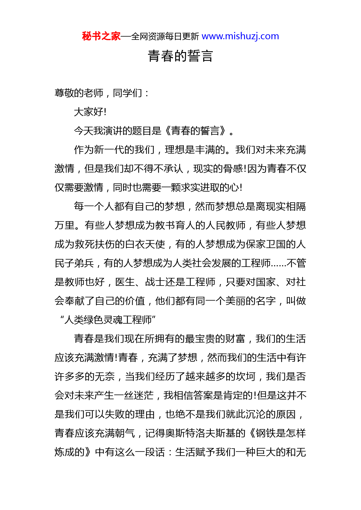 秘书之家—全网资源每日更新www.mishuzj.com学校教师学生优秀演讲稿汇编(10篇)目录1.青春的誓言2.最初的梦想3.真爱无言4.大学生演讲稿5.百善孝为先6.教师演讲稿7.最初的梦想8.鼓励9.转变责任观念10教育的光辉秘书之家—全网资源每日更新www.mishuzj.com青春的誓言尊敬的老师,同学们:大家好!今天我演讲的题目是《青春的誓言》。作为新一代的我们,理想是丰满的。我们对未来充满激情,但是我们却不得不承认,现实的骨感!因为青春不仅仅需要激情,同时也需要一颗求实进取的心!每一个人都有自己的梦想,然而梦想总是离现实相隔万里。有些人梦想成为教书育人的人民教师,有些人梦想成为救死扶伤的白衣天使,有的人梦想成为保家卫国的人民子弟兵,有的人梦想成为人类社会发展的工程师……不管是教师也好,医生、战士还是工程师,只要对国家、对社会奉献了自己的价值,他们都有同一个美丽的名字,叫做“人类绿色灵魂工程师”青春是我们现在所拥有的最宝贵的财富,我们的生活应该充满激情!青春,充满了梦想,然而我们的生活中有许许多多的无奈,当我们经历了越来越多的坎坷,我们是否会对未来产生一丝迷茫,我相信答案是肯定的!但是这并不是我们可以失败的理由,也绝不是我们就此沉沦的原因,青春应该充满朝气,记得奥斯特洛夫斯基的《钢铁是怎样炼成的》中有这么一段话:生活赋予我们一种巨大的和无秘书之家—全网资源每日更新www.mishuzj.com限高贵的礼品,这就是青春:充满着力量,充满着期待,充满着求知和斗争的志向,充满着希望和信心的青春!"的确如此,青,是绿色,是生命的颜色,春,是季节,是成长的季节,青春是人生最美好的季节,青春是人生最铿锵的篇章,青春是摧枯拉朽的豪情,青春是旭日东升的力量,青春的我们意气风发,青春的我们敢为人先,青春的我们斗志昂扬!少年兴则国兴,小年强则国强!此时的我们正当年少,正如一柄刚刚出炉的刀,我们容不得片刻的等待与迟疑,我们要像蜗牛那样凭着自己的耐力默默前行。我们更要像雄鹰一样一飞冲天!我们绝不让似水的岁月在慢慢氧化中失去光泽,我们更不会让它布满斑驳,成为废铁!我们要迎着青春之歌,奋发向上,砥砺前行!我的演讲完毕,谢谢大家!秘书之家—全网资源每日更新www.mishuzj.com最初的梦想尊敬的老师,同学们:大家好!今天我演讲的题目是《最初的梦想》。最初的梦想就握在自己手上,最想要去的地方就别在半路返航。如果梦想不曾坠落悬崖,千钧一发,又怎么会懂得,执着的人,有双梦的翅膀。不顾一切疯狂追寻过,失落过,也妥协过,但都不能湮灭梦想兑现时的片刻欢喜。在梦想与现实交锋的那一瞬间,我看到了它们的差距。而这只是一个梦想的差距,需要太多的勇气,太多的才气,太多的热情,才能点燃青春的高潮。是成为笑傲天穹的精灵,还是成为陆地上平庸的小丑,这一切都由你自己决定。当奥运健儿站在最高领奖台上,当国歌奏响、五星红旗缓缓升起的那个瞬间,我们看到是自豪、骄傲。可这自豪的背后又有多少不为人知的艰辛与汗水,要实现梦想就必须为之奋斗。战国时期的政治家苏秦。年轻时,学问不深,曾到好多地方做事,都不受重视。家人也瞧不起他。这对他的刺激很大。所以,他下决心发奋读书。常常读书到深夜,很疲倦,他便想出了一个方法,一打瞌睡,就用锥子往自己的大腿上刺一下。这秘书之家—全网资源每日更新www.mishuzj.com样,猛然间感到疼痛,使自己清醒起来,再坚持读书。才有了“苏秦刺骨”的佳话。几千年前年轻的苏秦都懂得克制,更何况现在的我们呢?青春的日子请好好把握,不要等到梦里都麻木的一天,才懂得懊悔,更不要等到青春散尽的一天,才懂得珍惜。让我们去回想我们最初的梦想,燃起我们的激情,洒一路汗水,饮一路风尘,咀嚼一路艰辛。让青春在红旗下继续燃烧,我们是搏击长空的鹰,是辽阔无垠的海,我们是有梦想,有作为的少年,我们乘风破浪,披荆砍棘,只为最初的梦,只为最炫目的光!我的演讲到此结束,谢谢大家!秘书之家—全网资源每日更新www.mishuzj.com真爱无言各位领导、各位老师、各位同学:大家下午好!今天我演讲的题目是:真爱无言。是谁把我们带到这个世界上,哺育我们成长?谁一年365天,为我们精心准备一日三餐?谁在我们生病的时候,在床边失眠默默的流泪?谁在我们受委屈的时候,把我们抱在怀里,用温暖的爱驱散我们心中的阴霾?谁在我们失意时用真诚的感情抚平我们心中的创伤?谁为我们取得一点点进步而充满了快乐?答案显而易见,就是我们的父母!他们为为了我们可以把黑头发变成了白头发。可以毫不犹豫的用血汗为我们的成长铺出一条光明大路。甚至可以用生命为我们书写一段辉煌的明天。在这个世界上,最无私的爱就是父母对子女的爱是父母,让充满爱的帆船载着我们驶向理想的彼岸。是父母,把所有的努力都倾注在我们的身上。父母,就是那群会为了我们放弃他们刚想入口的食物。他们可以毫不犹豫的告诉你,这些东西他不喜欢吃,你吃吧!可能我们听上去觉得很苦涩,但是他们却觉得心里甜滋滋的。秘书之家—全网资源每日更新www.mishuzj.com当我们给妈妈好吃的东西时,妈妈的眼睛里闪着泪光,不停地说:孩子长大了!懂事了!那么,让我们从今天开始,感恩父母,从一点做起,从身边做起,从现在做起!请给辛苦工作了一天的父母倒上一杯热茶,请给疲惫了