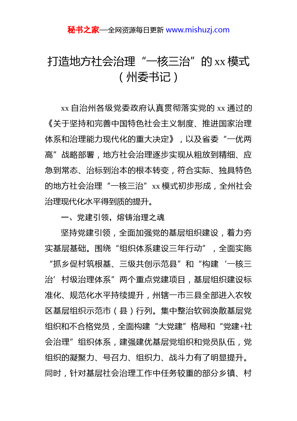 秘书之家—全网资源每日更新www.mishuzj.com目录1.打造地方社会治理“一核三治”的xx模式(州委书记)............................................................................................22.创新“红色物业”做实“红色网格”构建市域社会治理现代化新模式(区委书记).............................................73.打造市域社会治理现代化新模式(公安局警务督察支队队长)..................................................................................114.打造市域社会治理现代化新模式(公安局局长)....135.坚持善治之道打造社会治理新模式(党组书记、厅长)..........................................................................................19秘书之家—全网资源每日更新www.mishuzj.com打造地方社会治理“一核三治”的xx模式(州委书记)xx自治州各级党委政府认真贯彻落实党的xx通过的《关于坚持和完善中国特色社会主义制度、推进国家治理体系和治理能力现代化的重大决定》,以及省委“一优两高”战略部署,地方社会治理逐步实现从粗放到精细、应急到常态、治标到治本的根本转变,符合实际、独具特色的地方社会治理“一核三治”xx模式初步形成,全州社会治理现代化水平得到质的提升。一、党建引领,熔铸治理之魂坚持党建引领,全面加强党的基层组织建设,着力夯实基层基础。围绕“组织体系建设三年行动”,全面实施“抓乡促村筑根基、三级共创示范县”和“构建‘一核三治’村级治理体系”两个重点党建项目,基层组织建设标准化、规范化水平持续提升,州辖一市三县全部进入农牧区基层组织示范市(县)行列。集中整治软弱涣散基层党组织和不合格党员,全面构建“大党建”格局和“党建+社会治理”组织体系,建强建优基层党组织和党员队伍,党组织的凝聚力、号召力、组织力、战斗力有了明显提升。同时,针对基层社会治理工作中任务较重的部分乡镇、村秘书之家—全网资源每日更新www.mishuzj.com社开展了一系列综合治理、专项治理工作,形成了较强的示范效应,实现了从维护稳定向建设稳定的战略转移。xx州构建以党的基层组织建设为引领、服务管理为核心的“大党建”格局的实践证明,只有坚定不移坚持中国共产党的领导,大力推动基层党建与基层社会治理深度融合,不断提高基层党组织领导和协调基层政权组织、自治组织、群团组织、经济组织和社会组织的能力,统筹推进基层社会治理,才能彻底夯实党在基层社会的执政基础,真正把党的理论优势、政治优势、制度优势、密切联系群众优势转化成为社会治理的强大效能。二、依法治理,筑牢治理之本完善地方社会治理制度体系,加快《xx自治州基层社会治理条例》立法进程。法治政府建设不断提速,司法改革成效斐然,依法治理能力不断提升。持续推进法律“七进”,法治宣传教育机制不断完善。全面落实法律援助和“一村一法律顾问”制度,群众依法维权已经成为常态。强力推进州县乡村四级综治中心建设,抓牢城乡网格化管理和社会治理信息化建设两个重点,建成了一站式社会治理联动平台,综治中心标准化建设、实体化运转和实战化应用走在了全省前列。推动大数据、人工智能等现代科技与社会治理深度融合,“网格化+信息化”的智治型社会治理领跑全省。不断强化意识形态领域斗争,抢抓舆论主动秘书之家—全网资源每日更新www.mishuzj.com严管舆论阵地,确保意识形态工作的领导权牢牢掌握在党和政府手中。结合扫黑除恶专项斗争,依法严厉打击干预行政司法村务等违法犯罪行为,坚决杜绝陈规陋习,匡正了社会风气。建立矛盾纠纷化解“三区”分类管理等工作机制,推广“两法+特邀”矛盾纠纷调处机制。社会大局稳定是社会发展的基石,重拳治乱是维护社会稳定的有效手段,xx州坚决维护法律权威、依法严厉打击一切分裂渗透破坏活动、坚决捍卫国家政治安全的实践证明,只有高举法治大旗,才能打好主动仗、整体仗、进攻仗,才能牢牢掌控地方治理主动权。三、强化德治,滋养治理之源广泛开展习近平新时代中国特色社会主义思想和“中国梦”的理论宣传教育,积极推进公民道德建设,把社会主义核心价值观融入社会治理各方面全过程。设立乡镇村社舆情信息中心,净化网络空间,守牢网络安全底线。组建红旗宣讲团和马背宣讲队,推动“爱国、感恩、团结、法治”教育常态化、全覆盖,凝聚起最广泛的社会共识。统筹推进扶贫扶智、移风易俗,打造精神高地,培育乡风文明。发扬光大优秀传统文化的滋养作用,挖掘和运用孝老爱亲等传统村落文化资源,做好与时代精神的衔接与转化。发挥身边榜样的示范带动作用,采取多种形式表彰先进、选树典型,社会风气得到明显改善,正能量不断上升秘书之家—全网资源每日更新www.mishuzj.com把民族团结进步创建作为事关全局的基础性战略性工程来抓,围绕健全机制、教育引导、拓展载体、加快发展、促进和谐抓创建,探索走出了一条独具特色的民族团结进步之路。打造精神高地、培育乡风文明是凝聚人心、彻底扭转社会风气的根本举措。xx州综合施策、统筹推进公民道德建设、努力用社会主义核心价值观这个“最大公约数”凝聚社会共识的实践证明,只有实现以德育人、化风成俗、崇尚文明,才能从根本上化解社会矛盾,夯实地方治理的思想基础。四、突出自治,夯实治理之基健全完善党组织领