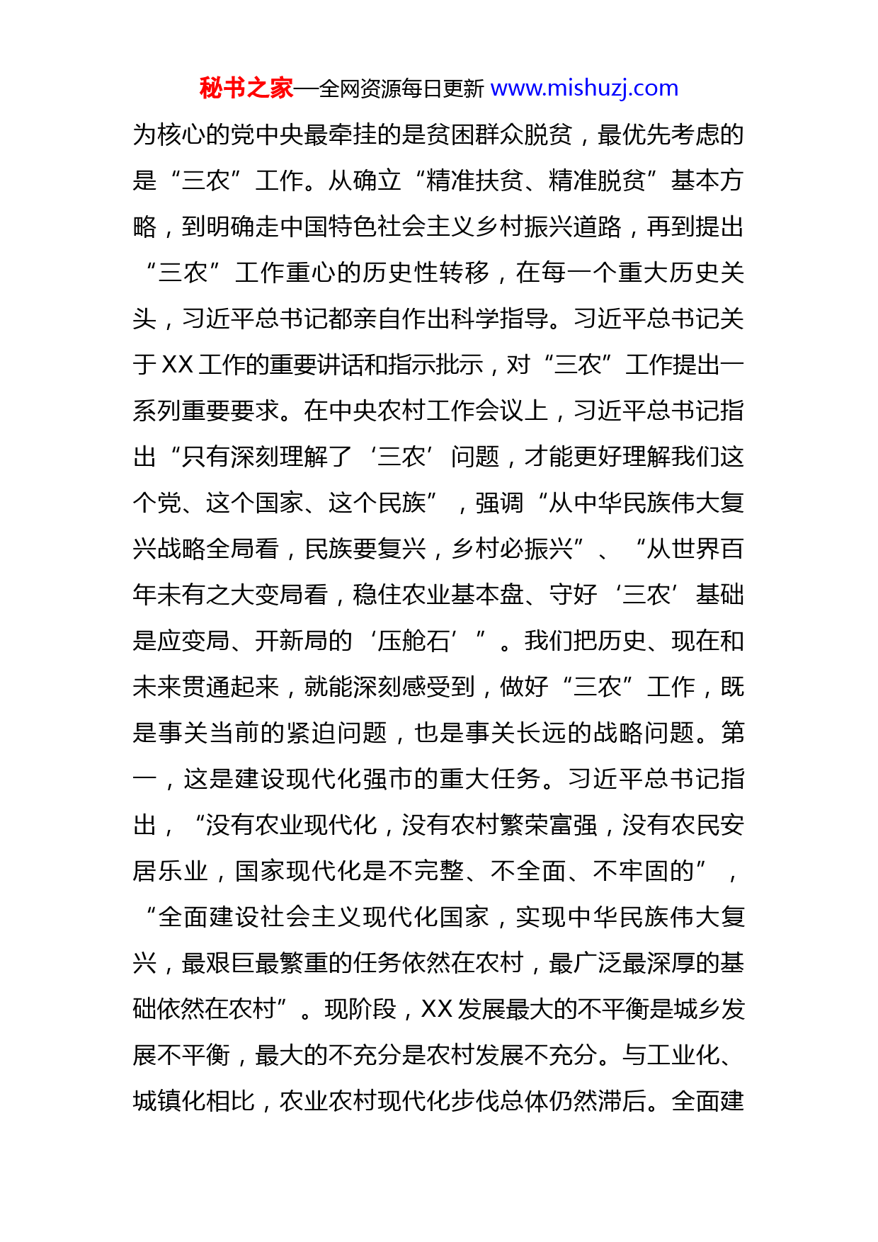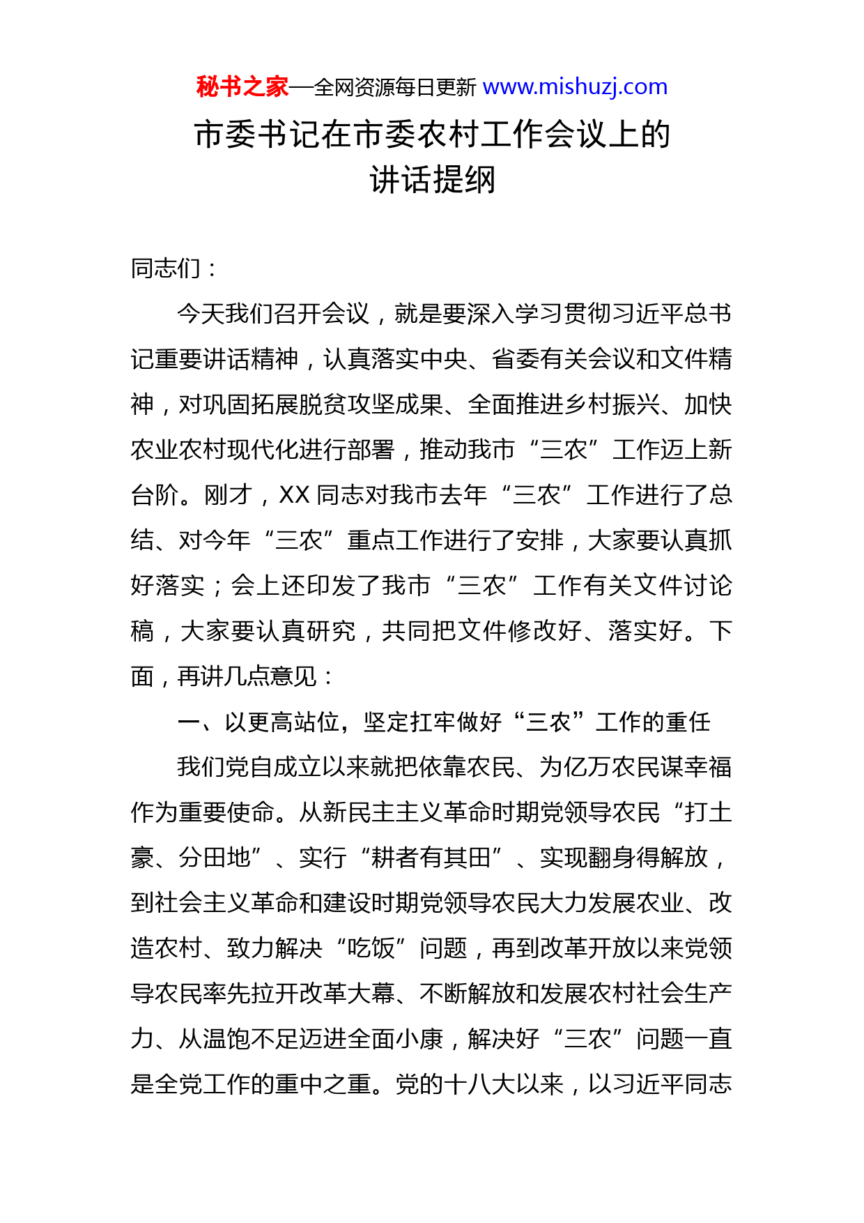 秘书之家—全网资源每日更新www.mishuzj.com市委书记在市委农村工作会议上的讲话提纲同志们:今天我们召开会议,就是要深入学习贯彻习近平总书记重要讲话精神,认真落实中央、省委有关会议和文件精神,对巩固拓展脱贫攻坚成果、全面推进乡村振兴、加快农业农村现代化进行部署,推动我市“三农”工作迈上新台阶。刚才,XX同志对我市去年“三农”工作进行了总结、对今年“三农”重点工作进行了安排,大家要认真抓好落实;会上还印发了我市“三农”工作有关文件讨论稿,大家要认真研究,共同把文件修改好、落实好。下面,再讲几点意见:一、以更高站位,坚定扛牢做好“三农”工作的重任我们党自成立以来就把依靠农民、为亿万农民谋幸福作为重要使命。从新民主主义革命时期党领导农民“打土豪、分田地”、实行“耕者有其田”、实现翻身得解放,到社会主义革命和建设时期党领导农民大力发展农业、改造农村、致力解决“吃饭”问题,再到改革开放以来党领导农民率先拉开改革大幕、不断解放和发展农村社会生产力、从温饱不足迈进全面小康,解决好“三农”问题一直是全党工作的重中之重。党的十八大以来,以习近平同志秘书之家—全网资源每日更新www.mishuzj.com为核心的党中央最牵挂的是贫困群众脱贫,最优先考虑的是“三农”工作。从确立“精准扶贫、精准脱贫”基本方略,到明确走中国特色社会主义乡村振兴道路,再到提出“三农”工作重心的历史性转移,在每一个重大历史关头,习近平总书记都亲自作出科学指导。习近平总书记关于XX工作的重要讲话和指示批示,对“三农”工作提出一系列重要要求。在中央农村工作会议上,习近平总书记指出“只有深刻理解了‘三农’问题,才能更好理解我们这个党、这个国家、这个民族”,强调“从中华民族伟大复兴战略全局看,民族要复兴,乡村必振兴”、“从世界百年未有之大变局看,稳住农业基本盘、守好‘三农’基础是应变局、开新局的‘压舱石’”。我们把历史、现在和未来贯通起来,就能深刻感受到,做好“三农”工作,既是事关当前的紧迫问题,也是事关长远的战略问题。第一,这是建设现代化强市的重大任务。习近平总书记指出,“没有农业现代化,没有农村繁荣富强,没有农民安居乐业,国家现代化是不完整、不全面、不牢固的”,“全面建设社会主义现代化国家,实现中华民族伟大复兴,最艰巨最繁重的任务依然在农村,最广泛最深厚的基础依然在农村”。现阶段,XX发展最大的不平衡是城乡发展不平衡,最大的不充分是农村发展不充分。与工业化、城镇化相比,农业农村现代化步伐总体仍然滞后。全面建秘书之家—全网资源每日更新www.mishuzj.com设社会主义现代化强市,必须解决好这一问题,这在一定程度上也决定着现代化强市建设的成效。特别从产业发展看,农业是基础产业、县域经济支柱产业,农业现代化是“四化同步”中不可或缺的关键环节;从实现共同富裕看,如果农民生活水平长期落后于城镇居民,共同富裕就无从谈起。我们要投入更多的资源和力量优先发展农业农村,确保农业农村在现代化进程中不掉队、同步赶上来。第二,这是融入新发展格局的关键举措。在形成新发展格局中,扩大内需处于“战略基点”的重要位置,而城乡经济循环是国内大循环的题中应有之义,是确保国内国际双循环比例关系健康的关键因素。对XX来讲,全市约九成的地域是农村、近六成的户籍人口在农村。做好“三农”工作,既可以持续增加农民收入,补齐农村基础设施和公共服务短板,释放巨量的消费和投资需求;又可以有效开发农村的产业、生态、文化等多重功能,不断满足群众对绿色优质农产品、乡村休闲旅游等的需求,推动形成需求牵引供给、供给创造需求的良性发展格局,更好地畅通城乡经济循环。融入新发展格局,农村有巨大空间,可以大有作为。我们要充分挖掘和释放农村内需潜力,为融入新发展格局提供强大战略支撑。第三,这是应对重大风险挑战的基础支撑。农为邦本,本固邦宁。从维护国家安全看,粮食安全与能源安全、金融安全并称为三大经济安全,任秘书之家—全网资源每日更新www.mishuzj.com何时候都不能放松。从基层社会治理看,没有农村的和谐稳定,就没有全社会的和谐稳定;没有农民的安居乐业,就没有全市人民的安居乐业。XX虽不是农业大市,但稳住农业基本盘、守好“三农”基础也是应对风险挑战的战略回旋。去年以来,在严峻复杂的外部环境特别是新冠肺炎疫情冲击下,全市社会大局能够保持稳定,就得益于我们始终把“三农”工作牢牢抓住手上,扛牢粮食安全这个重任,以沟域生态经济为抓手推动农业高质量发展,千方百计帮助农民稳定增收。我们要把做好“三农”工作作为长远之计和固本之举,以“三农”的稳定性应对外部环境的不确定性。要深刻认识到,我市“三农”工作还面临不少问题和挑战。从工作层面看,主要是农业生产弱、农村条件差、农民收入低的状况还没有根本改变,制约城乡二元结构矛盾破解、影响“三农”工作高质量的因素还有很多,城乡发展不平衡、农村发展不充分仍然是社会主要矛盾的集中体现。在巩固脱贫攻坚成果上,贫困地区和贫困群众刚脱贫不久,自我发展能力仍然脆弱,易致贫返贫人群数量依然很大,稍有麻痹大意就有可能出问题。在居民
