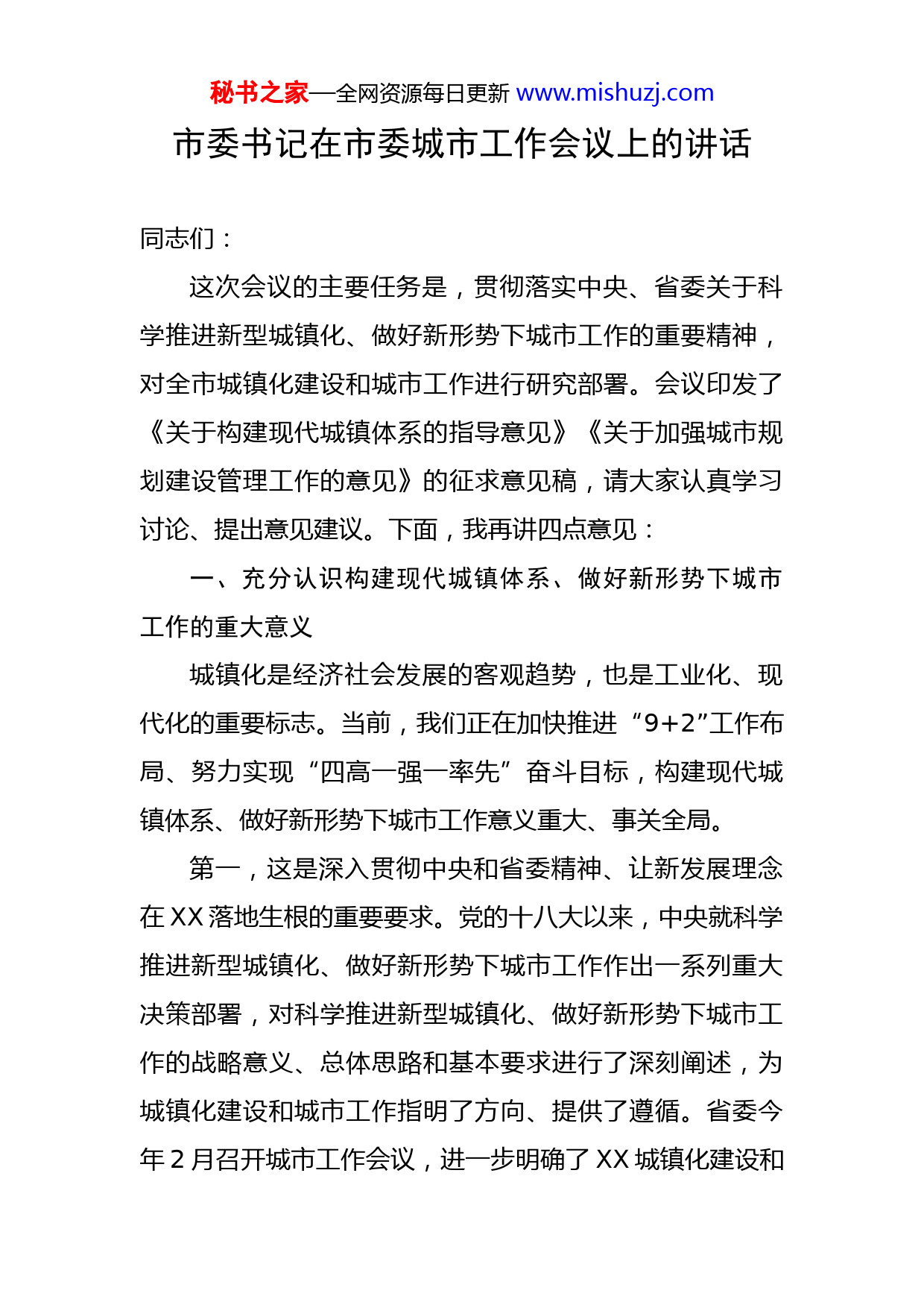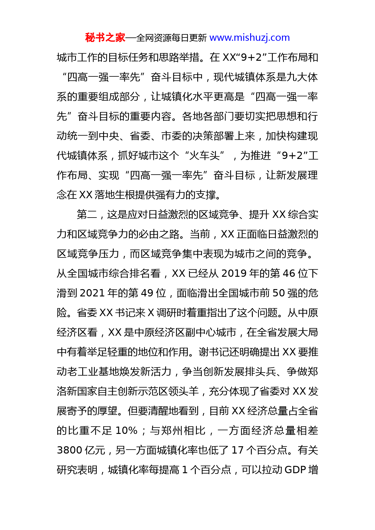 秘书之家—全网资源每日更新www.mishuzj.com市委书记在市委城市工作会议上的讲话同志们:这次会议的主要任务是,贯彻落实中央、省委关于科学推进新型城镇化、做好新形势下城市工作的重要精神,对全市城镇化建设和城市工作进行研究部署。会议印发了《关于构建现代城镇体系的指导意见》《关于加强城市规划建设管理工作的意见》的征求意见稿,请大家认真学习讨论、提出意见建议。下面,我再讲四点意见:一、充分认识构建现代城镇体系、做好新形势下城市工作的重大意义城镇化是经济社会发展的客观趋势,也是工业化、现代化的重要标志。当前,我们正在加快推进“9+2”工作布局、努力实现“四高一强一率先”奋斗目标,构建现代城镇体系、做好新形势下城市工作意义重大、事关全局。第一,这是深入贯彻中央和省委精神、让新发展理念在XX落地生根的重要要求。党的十八大以来,中央就科学推进新型城镇化、做好新形势下城市工作作出一系列重大决策部署,对科学推进新型城镇化、做好新形势下城市工作的战略意义、总体思路和基本要求进行了深刻阐述,为城镇化建设和城市工作指明了方向、提供了遵循。省委今年2月召开城市工作会议,进一步明确了XX城镇化建设和秘书之家—全网资源每日更新www.mishuzj.com城市工作的目标任务和思路举措。在XX“9+2”工作布局和“四高一强一率先”奋斗目标中,现代城镇体系是九大体系的重要组成部分,让城镇化水平更高是“四高一强一率先”奋斗目标的重要内容。各地各部门要切实把思想和行动统一到中央、省委、市委的决策部署上来,加快构建现代城镇体系,抓好城市这个“火车头”,为推进“9+2”工作布局、实现“四高一强一率先”奋斗目标,让新发展理念在XX落地生根提供强有力的支撑。第二,这是应对日益激烈的区域竞争、提升XX综合实力和区域竞争力的必由之路。当前,XX正面临日益激烈的区域竞争压力,而区域竞争集中表现为城市之间的竞争。从全国城市综合排名看,XX已经从2019年的第46位下滑到2021年的第49位,面临滑出全国城市前50强的危险。省委XX书记来X调研时着重指出了这个问题。从中原经济区看,XX是中原经济区副中心城市,在全省发展大局中有着举足轻重的地位和作用。谢书记还明确提出XX要推动老工业基地焕发新活力,争当创新发展排头兵、争做郑洛新国家自主创新示范区领头羊,充分体现了省委对XX发展寄予的厚望。但要清醒地看到,目前XX经济总量占全省的比重不足10%;与郑州相比,一方面经济总量相差3800亿元,另一方面城镇化率也低了17个百分点。有关研究表明,城镇化率每提高1个百分点,可以拉动GDP增秘书之家—全网资源每日更新www.mishuzj.com长1.5个百分点、拉动消费增长1.6个百分点。构建现代城镇体系,既有利于稳定经济增长,也有利于更好地集聚生产要素,能够加快实现“双轮驱动”“双向发力”“双高引领”“双赢并进”,促进产业升级和经济转型,推动县域经济发展壮大,是提升XX综合实力和区域竞争力、确保综合实力稳居全国城市前50强的必由之路。第三,这是转变城市发展方式、科学推进新型城镇化建设的迫切需要。近年来,XX积极稳妥推进新型城镇化,城镇化率已达到52.6%,今后还将有大量人口不断涌入,到2025年将超过60%,城市在全局工作中举足轻重,我们的工作重心也必须随着服务对象、管理对象的变化而变化。在这样的背景下,推进新型城镇化显得尤为迫切。我们要看到,在城镇化建设和城市工作中还存在不少问题,特别是习近平总书记在中央城市工作会议上指出的城市发展存在的10类主要问题,在XX也都不同程度存在,有些还比较突出。主要体现在八个方面:在顶层设计上,缺乏科学的城镇体系作引领,不同区域之间的功能定位和发展目标不够明确,城镇布局不够合理。在统筹指导上,市、县两级虽然比较重视各自的主城区建设,但市对县、县对中心镇特色镇关注不够、抓得不紧。在规划体制上,各项规划缺乏有效协调和有序衔接,政出多门、时有掣肘、相互打架,领导干预规划的问题依然存在,规划随意变动,秘书之家—全网资源每日更新www.mishuzj.com触及红线,治违不力,没有一张蓝图绘到底。在功能配套上,部分地段缺乏停车场、小游园、超市、商场、学校、医院等配套设施,路、水、气、热等基础设施还不完善,雨污合流等问题比较突出,不少地方没有实现集中供气供暖。在县级城市规划建设管理上,缺乏高起点的规划设计,一些建筑盲目求大求新求高求洋,与本地的自然风貌、山水特色不相符、不协调,挡了山、阻了水、少个性、无特色。一些县城高层建筑比比皆是、遍地开花,不仅破坏了城市风貌,消防成本、建安成本、管理运营成本等都大幅增加,脱离了当地发展实际。在文化传承上,城市发展与文物保护、遗址保护结合不够紧密,彰显XX特色的文化元素没有很好地融入城市建设,厚重的文化底蕴没有很好地彰显出来。在生态环境上,城市区内仍有不少“三高一低”企业,“林水一体”的格局远未形成,通风廊道亟待建设,离宜居城市还有差距。在城市管理上,“多龙治水”与“管理真空”并存,交通拥堵、环境污染、违章建筑、市容市貌脏乱差等问题还需要加大治理力度。解决这些问题,关键要加快构建现代城镇体系,切实转变城市发展方式,不断优化城镇布局和形态,统筹做