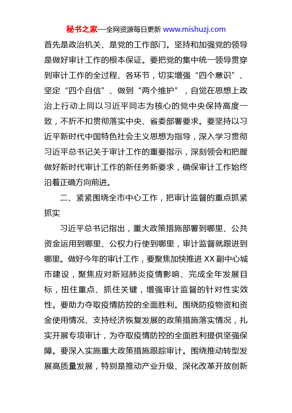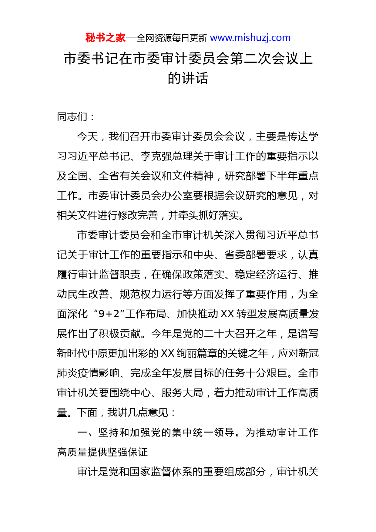 秘书之家—全网资源每日更新www.mishuzj.com市委书记在市委审计委员会第二次会议上的讲话同志们:今天,我们召开市委审计委员会会议,主要是传达学习习近平总书记、李克强总理关于审计工作的重要指示以及全国、全省有关会议和文件精神,研究部署下半年重点工作。市委审计委员会办公室要根据会议研究的意见,对相关文件进行修改完善,并牵头抓好落实。市委审计委员会和全市审计机关深入贯彻习近平总书记关于审计工作的重要指示和中央、省委部署要求,认真履行审计监督职责,在确保政策落实、稳定经济运行、推动民生改善、规范权力运行等方面发挥了重要作用,为全面深化“9+2”工作布局、加快推动XX转型发展高质量发展作出了积极贡献。今年是党的二十大召开之年,是谱写新时代中原更加出彩的XX绚丽篇章的关键之年,应对新冠肺炎疫情影响、完成全年发展目标的任务十分艰巨。全市审计机关要围绕中心、服务大局,着力推动审计工作高质量。下面,我讲几点意见:一、坚持和加强党的集中统一领导,为推动审计工作高质量提供坚强保证审计是党和国家监督体系的重要组成部分,审计机关秘书之家—全网资源每日更新www.mishuzj.com首先是政治机关、是党的工作部门。坚持和加强党的领导是做好审计工作的根本保证。要把党的集中统一领导贯穿到审计工作的全过程、各环节,切实增强“四个意识”、坚定“四个自信”、做到“两个维护”,自觉在思想上政治上行动上同以习近平同志为核心的党中央保持高度一致,不折不扣贯彻落实中央、省委部署要求。要坚持以习近平新时代中国特色社会主义思想为指导,深入学习贯彻习近平总书记关于审计工作的重要指示,深刻领会和把握做好新时代审计工作的新任务新要求,确保审计工作始终沿着正确方向前进。二、紧紧围绕全市中心工作,把审计监督的重点抓紧抓实习近平总书记指出,重大政策措施部署到哪里、公共资金运用到哪里、公权力行使到哪里,审计监督就跟进到哪里。做好今年的审计工作,要聚焦加快推进XX副中心城市建设,聚焦应对新冠肺炎疫情影响、完成全年发展目标,扭住重点、抓住关键,增强审计监督的针对性实效性。要助力夺取疫情防控的全面胜利。围绕防疫物资和资金使用情况、支持经济恢复发展的政策措施落实情况,扎实开展专项审计,为夺取疫情防控的全面胜利提供坚强保障。要深入实施重大政策措施跟踪审计。围绕推动转型发展高质量发展,特别是推动产业升级、深化改革开放创新秘书之家—全网资源每日更新www.mishuzj.com“三力联动”、打好“三大攻坚战”等重点任务推进情况,加大跟踪审计力度,协助市委市政府了解真实情况、发现问题弊端、揭示风险隐患、提出意见建议,切实发挥审计“治已病、防未病”的建设性作用。要重点关注领导干部在抢抓中部地区崛起、黄河流域生态保护和高质量发展等战略机遇,落实省委省政府对XX的发展定位,坚持开放引领,统筹推进制造业高质量发展、文化繁荣兴盛、生态文明建设、城乡综合承载力提升等方面的担当作为,推动中央、省、市决策部署落实落细。要扎实开展预算执行审计。强化对经济运行的全面体检,替市委市政府看好“钱袋子”,推动各地各部门合理使用资金,压缩一般性支出,加大对民生领域的投入力度,真正用政府“紧日子”换来群众“好日子”。要着力推进领导干部经济责任审计。扎实开展领导干部经济责任和自然资产离任、任中审计,重点关注领导干部履职中的决策责任、发展责任、管理责任、廉政责任,坚持“三个区分开来”,站在专业的角度客观公正评价领导干部,在揭示问题的同时分析问题、推动问题解决,避免简单地翻账本、找毛病。要加大民生领域审计力度。加大对就业、教育、医疗、安居、社保、养老、公共文化、环保、食品药品安全等重点民生领域的审计力度,更加关注疫情影响下困难群众的基本生活保障,更加关注民生政策的普惠性、基础性和兜底性,促秘书之家—全网资源每日更新www.mishuzj.com进各项民生实事、惠民政策落到实处。三、切实抓好审计整改工作,让审计监督的职能得到更好发挥抓好审计整改工作,是发挥审计监督职能、维护审计监督权威的重要要求。要构建问题整改长效机制,坚持标本兼治,不仅“治已病”,更“防未病”,切实减少“屡审屡犯”问题。首先,要运用好审计整改工作联席会议制度,加强对全市审计整改工作的统筹协调。审计联席会议成员单位要严格按照职责和分工开展工作,对审计机关提请协助执行和移送处理的整改事项,及时反馈办理结果,推进审计查出问题整改落实到位。其二,要把审计监督与纪检监察、组织人事、巡察监督等贯通起来,进一步健全完善协作配合机制,定期沟通、上报、反馈审计过程中发现的问题线索,有效促进审计发现的重大案件线索和问题依法及时得到处理和整改。其三,要坚持揭示问题和促进制度完善并重,既善于细查表面的“病灶”,也善于深挖体制机制层面的“病根”,更善于站在审计视角开出符合XX实际的“药方”,真正将审计发挥作用的落脚点放在推动制度完善和落实上。四、着力加强审计干部队伍建设,全面提升审计工作水平审计工作政治性、政策性、法纪性很强,对审计干部秘书之家—全网资源每日更新www.mishuzj.com队伍建设