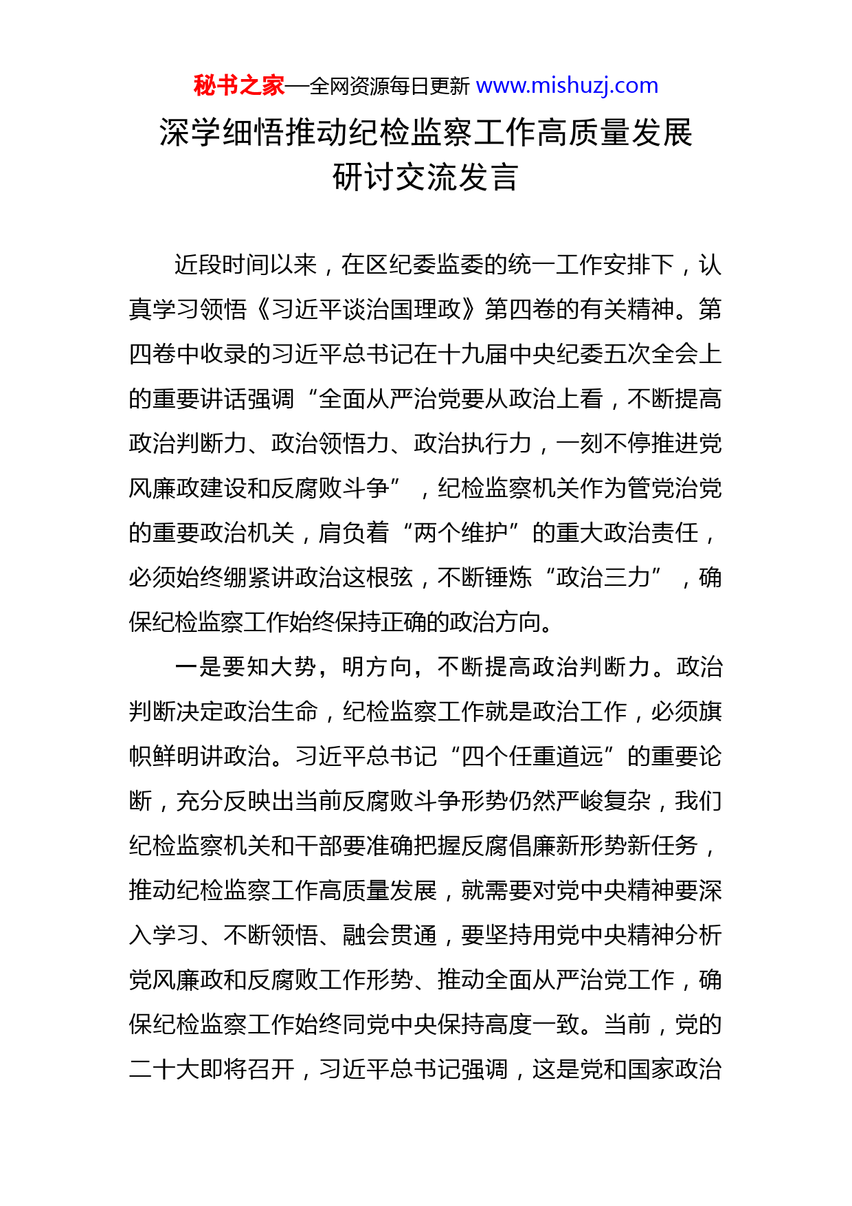 秘书之家—全网资源每日更新www.mishuzj.com深学细悟推动纪检监察工作高质量发展研讨交流发言近段时间以来,在区纪委监委的统一工作安排下,认真学习领悟《习近平谈治国理政》第四卷的有关精神。第四卷中收录的习近平总书记在十九届中央纪委五次全会上的重要讲话强调“全面从严治党要从政治上看,不断提高政治判断力、政治领悟力、政治执行力,一刻不停推进党风廉政建设和反腐败斗争”,纪检监察机关作为管党治党的重要政治机关,肩负着“两个维护”的重大政治责任,必须始终绷紧讲政治这根弦,不断锤炼“政治三力”,确保纪检监察工作始终保持正确的政治方向。一是要知大势,明方向,不断提高政治判断力。政治判断决定政治生命,纪检监察工作就是政治工作,必须旗帜鲜明讲政治。习近平总书记“四个任重道远”的重要论断,充分反映出当前反腐败斗争形势仍然严峻复杂,我们纪检监察机关和干部要准确把握反腐倡廉新形势新任务,推动纪检监察工作高质量发展,就需要对党中央精神要深入学习、不断领悟、融会贯通,要坚持用党中央精神分析党风廉政和反腐败工作形势、推动全面从严治党工作,确保纪检监察工作始终同党中央保持高度一致。当前,党的二十大即将召开,习近平总书记强调,这是党和国家政治秘书之家—全网资源每日更新www.mishuzj.com生活中的一件大事,反复要求做到“疫情要防住、经济要稳住、发展要安全”,并在中央政治局会议上进一步要求扎实做好大会的筹备工作,确保大会胜利召开。阶段来,区纪委监委严格按照上级部署要求,全力以赴把常态化疫情防控工作抓紧抓实抓细抓到位,也严格落实办案区疫情防控要求,做实审查调查安全工作,实现办案人员零违纪、办案工作零事故。下来,在迎接党的二十大胜利召开这个当前最重要的时点上,纪检监察机关要牢固树立没有安全就没有办案的理念,把办案安全放在首位,确保案件办理的安全、平稳、有序,同时要加强对谈话场所等的安全管理,善于用政治的眼光发现问题、分析问题、解决问题,做到知责于心、担责于身、履责于行,切切实实守住守牢疫情防控和办案安全的底线。二是要读原著、悟原理,不断提高政治领悟力。从政治上领悟好全面从严治党战略部署,是纪检监察工作高质量发展的首要前提。纪检监察干部只有不断提高对党中央精神的领悟能力,才能确保执行不偏不移,政治上的坚定源于理论上的清醒,政治领悟力的提升离不开科学理论的指引。阶段来,区纪委监委通过“领导干部带头学”引领“干部职工全面学”,机关党总支、各党支部及各部门相继开展学习,组织前往“呼援通”廉洁教育示范点、妈屿岛廉洁教育基地参观学习,举办第三十四期“清风悦读秘书之家—全网资源每日更新www.mishuzj.com会”,通过“线上学习平台”与“线下学习活动”相结合等方式,迅速掀起学习《习近平谈治国理政》第四卷的热潮,这些都是提高纪检监察干部政治领悟力的有力措施,下来,必须坚持不懈读原著、悟原理,在学深悟透习近平新时代中国特色社会主义思想上下功夫,深刻领会贯穿其中的立场观点方法,把潜心学习化为提高政治觉悟、增强党性修养的实际效果,结合实际找准找实纪检监察机关服务保障“国之大者”的结合点和着力点,使讲政治从外在要求转化为内在主动,自觉在思想上政治上行动上同党中央保持高度一致。三是要强担当、抓落实,不断提高政治执行力。政治执行力是政治判断力、政治领悟力的落脚点,也是纪检监察干部政治能力的具体体现和实际检验。纪检监察干部要以更高标准、更严要求、更实举措践行“两个维护”,党中央提倡的坚决响应,党中央决定的坚决执行,党中央禁止的坚决不做,坚持底线思维、问题导向,对党中央确定的任务、人民群众期盼的实事勇于担当、积极作为,切实发扬钉钉子精神抓落实,以“咬定青山不放松”的心态不断解决实际问题,把党中央决策部署的各项任务落实到位。阶段来,区纪委监委充分发挥案件查办的震慑作用及治本功效,深化以案促改推动解决基层历史遗留难题,让一些村(社区)实现挽损增收,提升基层综合治理水平,秘书之家—全网资源每日更新www.mishuzj.com给人民群众带来实实在在的获得感;充分发挥巡察监督利剑作用,深化巡察整改和成果运用,巡察期间坚持以人民为中心,推动解决民生实事等。下来,要继续保持反腐高压态势,狠抓办案,深化“三不”一体推进;要聚焦群众“急难愁盼”问题,坚持纠正一切损害群众利益的腐败和不正之风;要围绕“三个聚焦”深化政治巡察,加强巡察上下联动,更好发挥巡察综合监督作用和联系群众桥梁纽带功能;要持续深化纪检监察体制改革,持续深化机关作风专项整顿,建设政治素质高、忠诚干净担当、专业化能力强、敢于善于斗争的纪检监察铁军。
