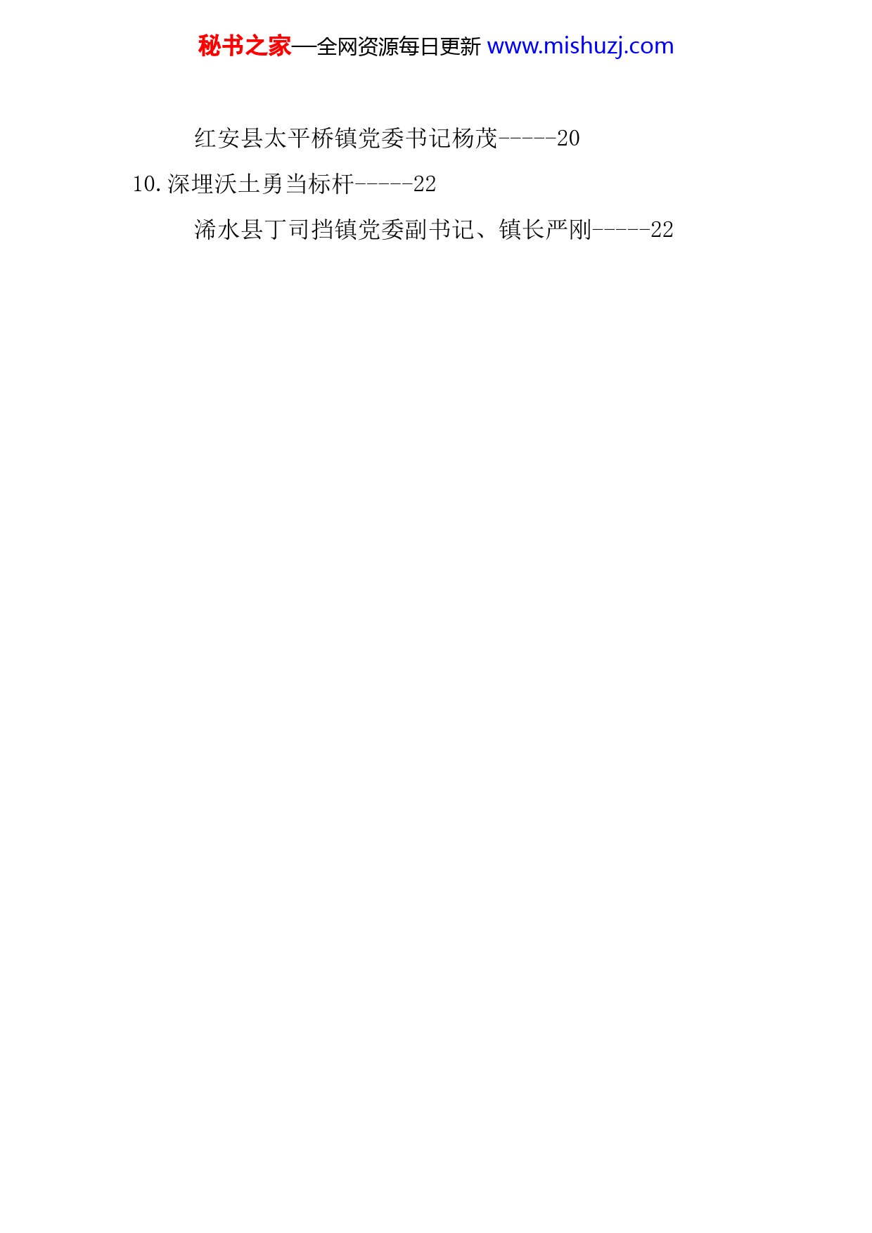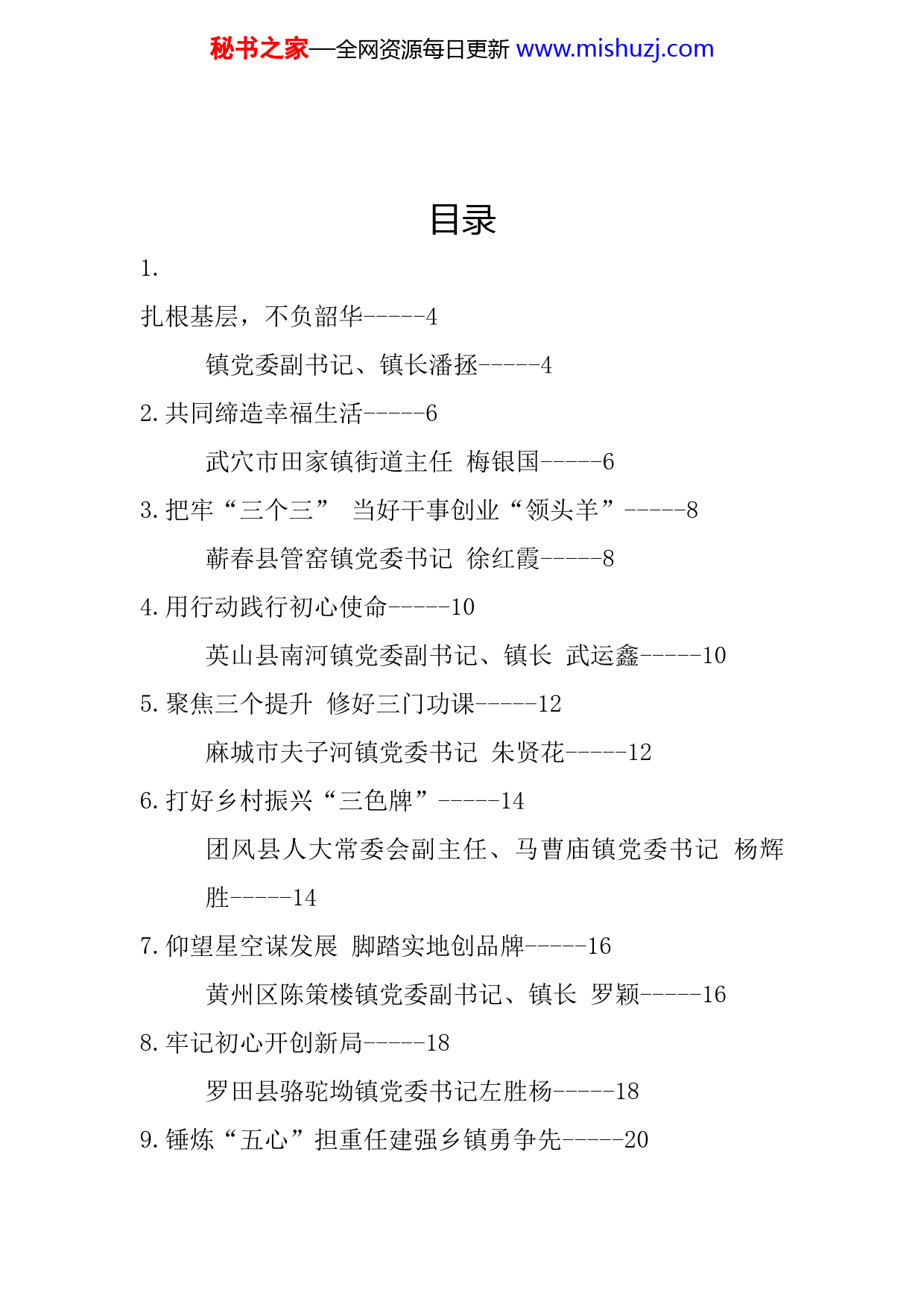 秘书之家—全网资源每日更新www.mishuzj.com目录1.扎根基层,不负韶华-----4镇党委副书记、镇长潘拯-----42.共同缔造幸福生活-----6武穴市田家镇街道主任梅银国-----63.把牢“三个三”当好干事创业“领头羊”-----8蕲春县管窑镇党委书记徐红霞-----84.用行动践行初心使命-----10英山县南河镇党委副书记、镇长武运鑫-----105.聚焦三个提升修好三门功课-----12麻城市夫子河镇党委书记朱贤花-----126.打好乡村振兴“三色牌”-----14团风县人大常委会副主任、马曹庙镇党委书记杨辉胜-----147.仰望星空谋发展脚踏实地创品牌-----16黄州区陈策楼镇党委副书记、镇长罗颖-----168.牢记初心开创新局-----18罗田县骆驼坳镇党委书记左胜杨-----189.锤炼“五心”担重任建强乡镇勇争先-----20秘书之家—全网资源每日更新www.mishuzj.com红安县太平桥镇党委书记杨茂-----2010.深埋沃土勇当标杆-----22浠水县丁司挡镇党委副书记、镇长严刚-----22秘书之家—全网资源每日更新www.mishuzj.com扎根基层,不负韶华镇党委副书记、镇长潘拯政令如军令,在履职尽责中将党委决定落实落地。一要绝对忠诚,坚决执行党中央决策部署和省、市、县、镇委工作要求,以实干实绩诠释对党的绝对忠诚。二要绝对可靠,找准定位,明晰角色,与党委班子、干部群众同心同德。三要绝对落实,坚决拥护党委决定,放手谋划干事,放心大胆落实。头脑刮风暴,在多思善谋中将镇域发展谋定谋动。做实全国农业产业强镇金色招牌,做稳鄂东粮仓、黄冈油仓,充实“米袋子”,打响“米牌子”,做精“米链子”。围绕园区配套招商引资,打造产业聚集区。实施绿色发展,依靠现有资源和项目,推动三大清洁能源综合开发利用,构建新能源产业园。脚上踏泥土,在扬长挖潜中将资源项目做大做强。坚持“以路促街、以街扩镇、以山美镇、以水灵镇、以镇融城”理念,优化镇区结构。壮大工业底盘,做强龙头,做大规模,做响品牌,做活营销,推动工业倍增升级。盘活资秘书之家—全网资源每日更新www.mishuzj.com源禀赋,我镇风光水资源充沛,各大电力企业先后布局濯港,以资源换项目,以商招商、引智招财,带动综合开发利用。深挖文化底蕴,以太白小镇为支点,着力打造一批有本地特色的乡村文化、旅游品牌。思想要紧绷,在把舵领航中将民生福祉保值保全。把牢发展主线,全面落实“解难题、稳增长、促发展”企业帮扶活动,做实“双千行动”,狠抓惠企政策落实,切实帮助企业解决困难。守牢安全底线,我镇交通安全复杂,同时拥有139.23公里的超长防汛堤段,防汛异常艰巨。必须思想上时刻紧绷,行动上有备而战,态度上一抓到底,统筹好发展与稳定。秘书之家—全网资源每日更新www.mishuzj.com共同缔造幸福生活武穴市田家镇街道主任梅银国三天时间的学习,领导授课都强调了乡镇的重要性和乡镇主职的特殊性,让我们对这个特殊的岗位有了新的理解和认识。“五件要事”,“十个问题”都触及乡镇工作的要害。具体到田家镇街道来讲,将努力做到“五先”。在忠诚担当上“率先”。立足街道党工委这个角色定位,把抓落实作为讲政治的核心体现,真正做到守土有责、守土负责、守土尽责。在稳住经济上“争先”。2021年田家镇试验区30家规模以上企业总产值达160亿元,同比增长26.9%,居黄冈县市乡镇第一位。我们将突出主导产业优势,精准对接祥云、华新、民本等重点企业;对祥云新材料产业园、祉星纸业520万吨浆纸一体化项目、生态合成革产业园3个百亿项目、8个十亿元项目、21个亿元项目,实行“一项一策”,打造精细化工、纸浆造纸、生态合成革三大组团,纵向延伸产业链;在推动销售回归、主辅分离上做文章,加大市场主体培育。秘书之家—全网资源每日更新www.mishuzj.com在战略布局上“抢先”。抢抓“三区三线”划定工作契机,努力争取省厅支持,推动园区调区扩区,为园区三期发展留足战略空间、赢得战略主动。在优化环境上“创先”。持续深化“放管服”改革,着力解决“审批难、办事难、效率低”等痛点堵点,今年将做好全要素的服务保障,力争解决好祥云集团上市的关键瓶颈,争取市委、市政府上市企业“破零翻番”计划在田家镇率先破题。在惠民安民上“优先”。围绕“人从哪里来”“农产品往哪里运”等核心问题,从人民群众最关心、与群众切身利益联系最密切的事情做起,协调各方力量,共同缔造幸福生活。秘书之家—全网资源每日更新www.mishuzj.com把牢“三个三”当好干事创业“领头羊”蕲春县管窑镇党委书记徐红霞一名合格的乡镇党委书记,要保持三度。政治站位要有高度。必须坚持正确的政治方向,旗帜鲜明讲政治,才能始终做到高标准落实。理论知识要有深度。必须坚持加强理论武装,学思用贯通,只有在“学”中下苦功,才能在“论”中有底气。为民服务要有温度。必须坚持以人民为中心,时刻把群众的困难和诉求记在心里,只有全心全意为人民服务,才能得到群众的支持拥护。一位合格的基层负责人,要处理好三种关系。处理好“大与小”的关系。基层工作千头万绪,要善于统筹谋划抓落实,既要做好上级安排部署的大事,又要做好群众急难愁盼的小事。处理好“远与近”的关系。处理好发展与保护的关系,严守生态红线,推动绿色发展、循环发展。处理好“快与慢”的关系。在抓工作落实上,谋划要早、行动要快。在有些