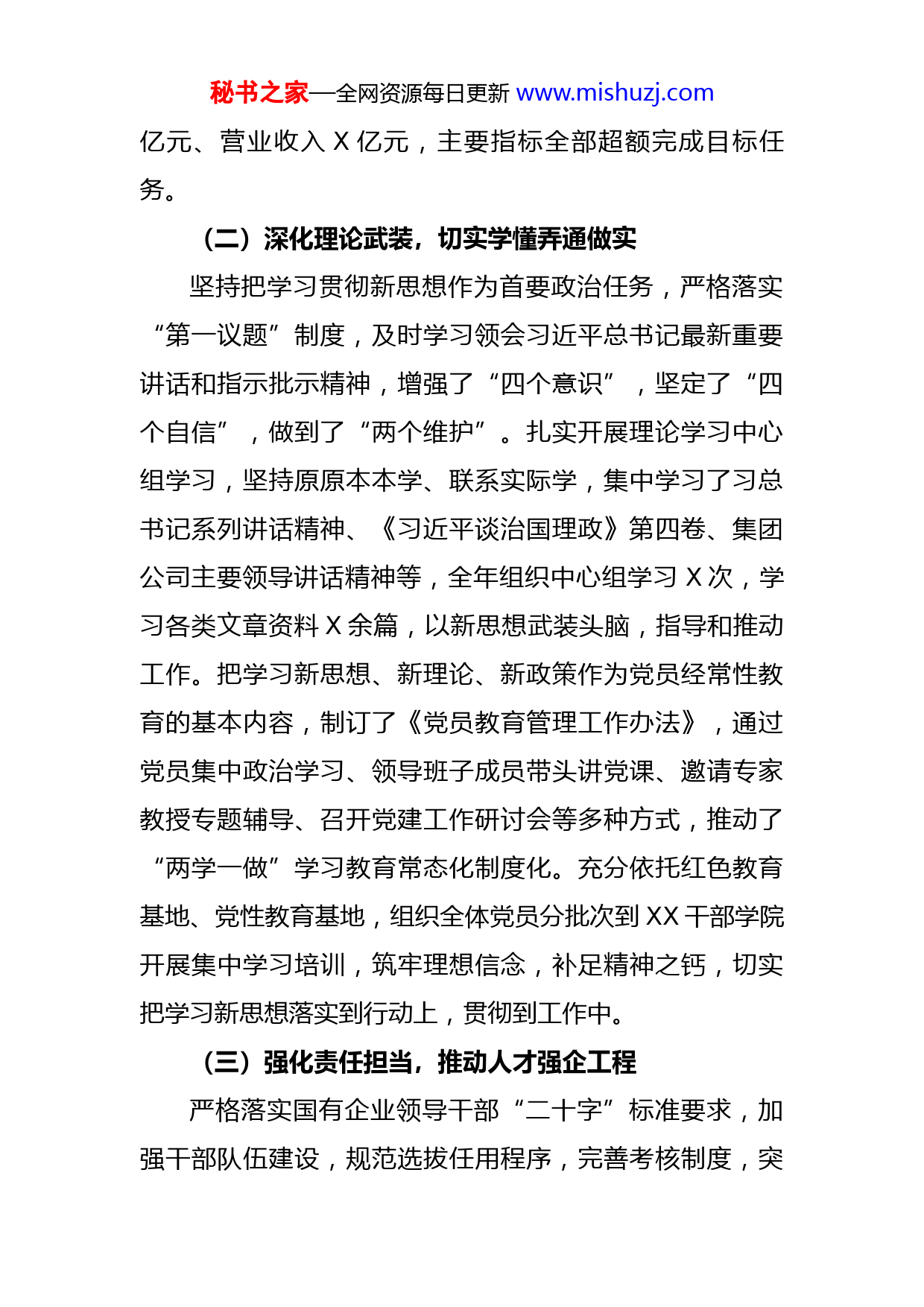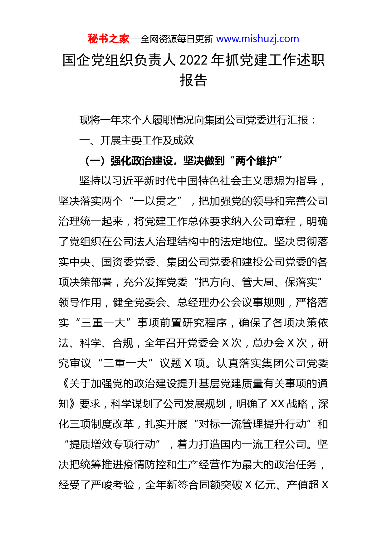 秘书之家—全网资源每日更新www.mishuzj.com国企党组织负责人2022年抓党建工作述职报告现将一年来个人履职情况向集团公司党委进行汇报:一、开展主要工作及成效(一)强化政治建设,坚决做到“两个维护”坚持以习近平新时代中国特色社会主义思想为指导,坚决落实两个“一以贯之”,把加强党的领导和完善公司治理统一起来,将党建工作总体要求纳入公司章程,明确了党组织在公司法人治理结构中的法定地位。坚决贯彻落实中央、国资委党委、集团公司党委和建投公司党委的各项决策部署,充分发挥党委“把方向、管大局、保落实”领导作用,健全党委会、总经理办公会议事规则,严格落实“三重一大”事项前置研究程序,确保了各项决策依法、科学、合规,全年召开党委会X次,总办会X次,研究审议“三重一大”议题X项。认真落实集团公司党委《关于加强党的政治建设提升基层党建质量有关事项的通知》要求,科学谋划了公司发展规划,明确了XX战略,深化三项制度改革,扎实开展“对标一流管理提升行动”和“提质增效专项行动”,着力打造国内一流工程公司。坚决把统筹推进疫情防控和生产经营作为最大的政治任务,经受了严峻考验,全年新签合同额突破X亿元、产值超X秘书之家—全网资源每日更新www.mishuzj.com亿元、营业收入X亿元,主要指标全部超额完成目标任务。(二)深化理论武装,切实学懂弄通做实坚持把学习贯彻新思想作为首要政治任务,严格落实“第一议题”制度,及时学习领会习近平总书记最新重要讲话和指示批示精神,增强了“四个意识”,坚定了“四个自信”,做到了“两个维护”。扎实开展理论学习中心组学习,坚持原原本本学、联系实际学,集中学习了习总书记系列讲话精神、《习近平谈治国理政》第四卷、集团公司主要领导讲话精神等,全年组织中心组学习X次,学习各类文章资料X余篇,以新思想武装头脑,指导和推动工作。把学习新思想、新理论、新政策作为党员经常性教育的基本内容,制订了《党员教育管理工作办法》,通过党员集中政治学习、领导班子成员带头讲党课、邀请专家教授专题辅导、召开党建工作研讨会等多种方式,推动了“两学一做”学习教育常态化制度化。充分依托红色教育基地、党性教育基地,组织全体党员分批次到XX干部学院开展集中学习培训,筑牢理想信念,补足精神之钙,切实把学习新思想落实到行动上,贯彻到工作中。(三)强化责任担当,推动人才强企工程严格落实国有企业领导干部“二十字”标准要求,加强干部队伍建设,规范选拔任用程序,完善考核制度,突秘书之家—全网资源每日更新www.mishuzj.com出讲担当重担当、重实干重实绩的鲜明导向,全年X名干部得到提职,X名干部进行轮岗,X名员工到项目一线锻炼。坚持“五湖四海、任人唯贤”,建立健全人才引进、培养、使用、评价、激励、流动体制机制,组织了X次社会招聘和校园招聘,录用了X名优秀人才。加强人才培养,完善人才培养体系,全年X名同志参加集团公司举办的领导力提升高级研修班,X名同志参加青年干部培训班,X名同志参与商儒管理学院综合能力提升培训,公司内部组织各专业学习培训X余次,有力提升了干部人才队伍能力素质。(四)加强“三基”建设,提升党建工作水平扎实开展党建精细年活动,严格落实党建工作责任制,制订并执行《全面从严治党主体责任清单》,构建了党委履行主体责任、书记承担第一责任、专职副书记承担直接责任、班子成员“一岗双责”、职能部门牵头抓总、相关部门齐抓共管,层层抓落实的“大党建”工作格局。持续抓“三基”建设,落实《中国共产党国有企业基层组织工作条例(试行)》,组织召开公司第一次党代会,选举第一届党委领导班子,健全了组织机构;落实“四同步、四对接”要求,按照两个1%规定,配齐党务人员,按比例提取党组织工作经费,实施兼职党务人员奖补贴,为基层党建工作提供了保障;落实《关于新形势下党内政治秘书之家—全网资源每日更新www.mishuzj.com生活若干准则》,严肃党内组织生活,创新活动形式,坚定了信念,锤炼了党性;健全党群工作制度体系,新制定党群工作制度X项,确保了基层党组织工作规范化、标准化。(五)深度融入中心,促进生产经营工作坚持党建工作服务生产经营不偏离,把提高效益、增强竞争实力,实现国有企业资产保值增值作为党组织工作的出发点和落脚点,以改革发展成果检验党组织的工作和战斗力。在全公司范围开展XX主题实践活动,强化了责任意识,改进了干部作风,保障了工作落实。公司领导分头带队深入项目一线进行专题调研,与基层干部职工谈心谈话XX人次,着力解决制约公司改革发展的瓶颈问题,解决职工群众关心的热点难点问题,解决一线生产经营工作中的“中梗阻”问题,共查找解决问题XX项。各党支部、各部门、各单位全面推行首办负责制、服务承诺制、限时办结制、考核评议制,提高了工作效率;各级党员干部持续改进作风、率先垂范,执行24小时轮流值班、领导干部带班制,发挥“党员先锋队”作用,提高了工作效能。(六)重视宣传引领,营造良好文化氛围以围绕中心、服务大局为根本,广泛传播公司声音,讲好公司故事。加强内部宣传报道,对公司改革发展、经营管理、党建群团等各方面亮点工作及时宣传报道,统一秘书之家—全网资源每日更新www.mishuzj.com了职工