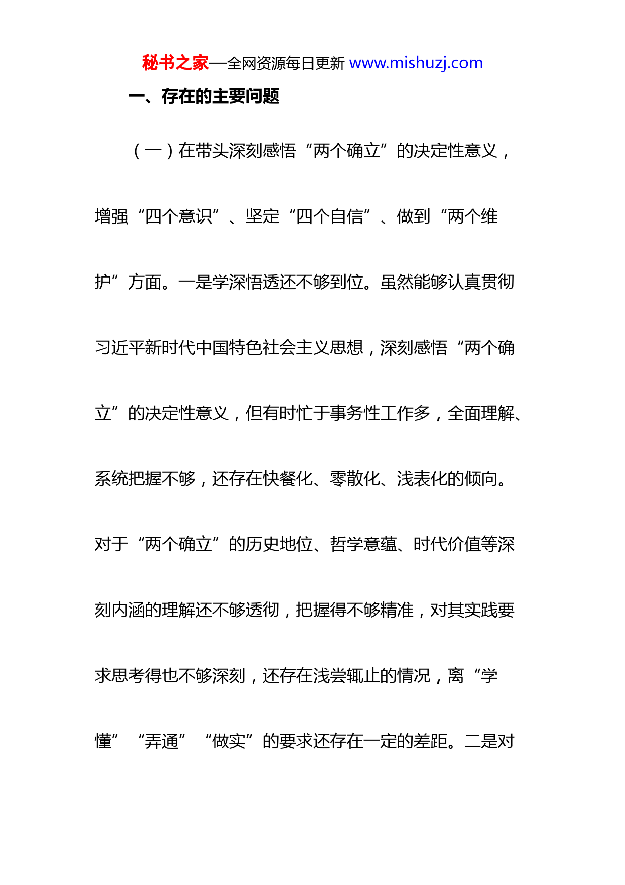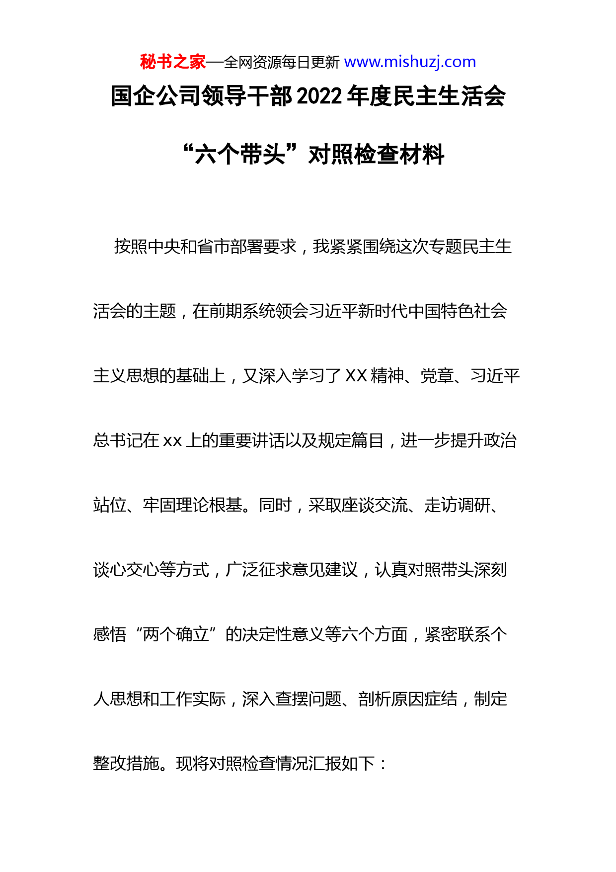 秘书之家—全网资源每日更新www.mishuzj.com国企公司领导干部2022年度民主生活会“六个带头”对照检查材料按照中央和省市部署要求,我紧紧围绕这次专题民主生活会的主题,在前期系统领会习近平新时代中国特色社会主义思想的基础上,又深入学习了XX精神、党章、习近平总书记在xx上的重要讲话以及规定篇目,进一步提升政治站位、牢固理论根基。同时,采取座谈交流、走访调研、谈心交心等方式,广泛征求意见建议,认真对照带头深刻感悟“两个确立”的决定性意义等六个方面,紧密联系个人思想和工作实际,深入查摆问题、剖析原因症结,制定整改措施。现将对照检查情况汇报如下:秘书之家—全网资源每日更新www.mishuzj.com一、存在的主要问题(一)在带头深刻感悟“两个确立”的决定性意义,增强“四个意识”、坚定“四个自信”、做到“两个维护”方面。一是学深悟透还不够到位。虽然能够认真贯彻习近平新时代中国特色社会主义思想,深刻感悟“两个确立”的决定性意义,但有时忙于事务性工作多,全面理解、系统把握不够,还存在快餐化、零散化、浅表化的倾向。对于“两个确立”的历史地位、哲学意蕴、时代价值等深刻内涵的理解还不够透彻,把握得不够精准,对其实践要求思考得也不够深刻,还存在浅尝辄止的情况,离“学懂”“弄通”“做实”的要求还存在一定的差距。二是对秘书之家—全网资源每日更新www.mishuzj.com标看齐还不够到位。能够坚决拥护“两个确立”、做到“两个维护”,但在实际工作中还没有真正上升为思想自觉、政治自觉和行动自觉,有时存在离得远、与我关系不大的模糊认识,单纯认为这是高层的事、对高级干部的要求,自己职低位轻,轮不着、够不上。有时对如何更好地维护党的权威形象、维护公司利益等思考研究不多,身边出现的一些错误言论、不良思潮,虽然自觉做到不听、不信、不传,但没有真正站在“两个维护”的政治高度去反思本质危害,也没有旗帜鲜明地进行抵制批驳。三是贯彻落实还不够到位。没有真正把“两个确立”、“两个维护”内化为过硬的政治领悟力政治判断力政治执行力,有秘书之家—全网资源每日更新www.mishuzj.com时不能完全站在政治和全局上思考问题,看表面多、看根源少,看现象看、看本质少;还没有真正转化为坚决贯彻落实党中央决策部署和省委、市委决议的实际行动,对于棘手难办的、影响利益的,有时强调客观因素多、看风向左右观望多,推进落实力度还不够大。(二)在带头用习近平新时代中国特色社会主义思想凝心铸魂方面。一是学习理解还需要深入。有时学得不够实,单纯注重学习数量、通读篇目、体会字数,会议集中传达学习多,缺乏细品慢读、深入体验的措施;有时悟得不够透,泛读多、精研少,对一些重要理论观点在系统把握学、扩展延伸学、联系实际学上下功夫还不够。有时跟秘书之家—全网资源每日更新www.mishuzj.com得不够紧,紧跟形势学的主动性还不强,对新思想、新战略、新理念把握领悟不够及时、把握不够精准。二是融会贯通还需要加强。对习近平总书记关于国有企业党的建设和深化国有企业改革重要讲话精神理解不深刻、研究不到位、引领作用不强。围绕培育企业核心竞争力,在加快技术创新、提升管理质效、数字赋能等方面,还缺乏具体有效的办法,推进企业高质量发展的制胜优势没有充分显现出来。三是推动工作还需要用力。运用习近平新时代中国特色社会主义思想破解难题、推动工作的能力还不够,有时站位还不够高,从工作落实的绩效上看,远未达到学以致用,理论的科学性和工作的高标准没有统一起来,跟着秘书之家—全网资源每日更新www.mishuzj.com惯性经验走、按着本本套路走的毛病改得还不彻底。特别是身为副职领导,对党委、主要领导的决心意图理解把握不够准确,抓工作动作还跟不上,缺乏强烈的时间、效率和质量观念。(三)在带头坚持和加强党的全面领导方面。一是参与集体议事决策还不够主动。身为党委委员,有时参加党委议事决策存在“事不关己、高高挂起”的思想,对于重大融资、重大投资项目、大额度资金运作等事项,属于自己分管的就多说一些,不属于自己分管的就少说为佳。特别是在当前经济下行压力较大的情况下,就如何化解企业高额债务、市场竞争力减弱、盈利能力不足等问题,主动秘书之家—全网资源每日更新www.mishuzj.com参与研究不够,有针对性的意见措施还不够多。二是贯彻执行党委决议还不够严格。有时认为贯彻党委决议,上有党委书记把关定向,下有分管部门贯彻落实,身为副职搞好上传下达就行了,有些涉及分管的工作行动不够迅速,落实措施不够具体,效果不够明显,甚至还有一定程度的打折扣、搞变通现象。有时一些常规工作请示报告制度落实不到位,甚至主要领导过问了、强调了才进行报告,给分管工作带来了不良影响。三是推动党建深度融合还不够到位。身为分管党建工作的副职领导,能够认真履行党建职责,协助书记建章立制,在完善公司治理中加强党的领导。但有时统筹兼顾不够到位,没有把党建工作和业务工秘书之家—全网资源每日更新www.mishuzj.com作同谋划、同部署、同落实、同考核,“两层皮”的现象还没有得到根本解决。基层组织党建标准化、规范化建设还相对滞后,虽然进行了试点规范、整体