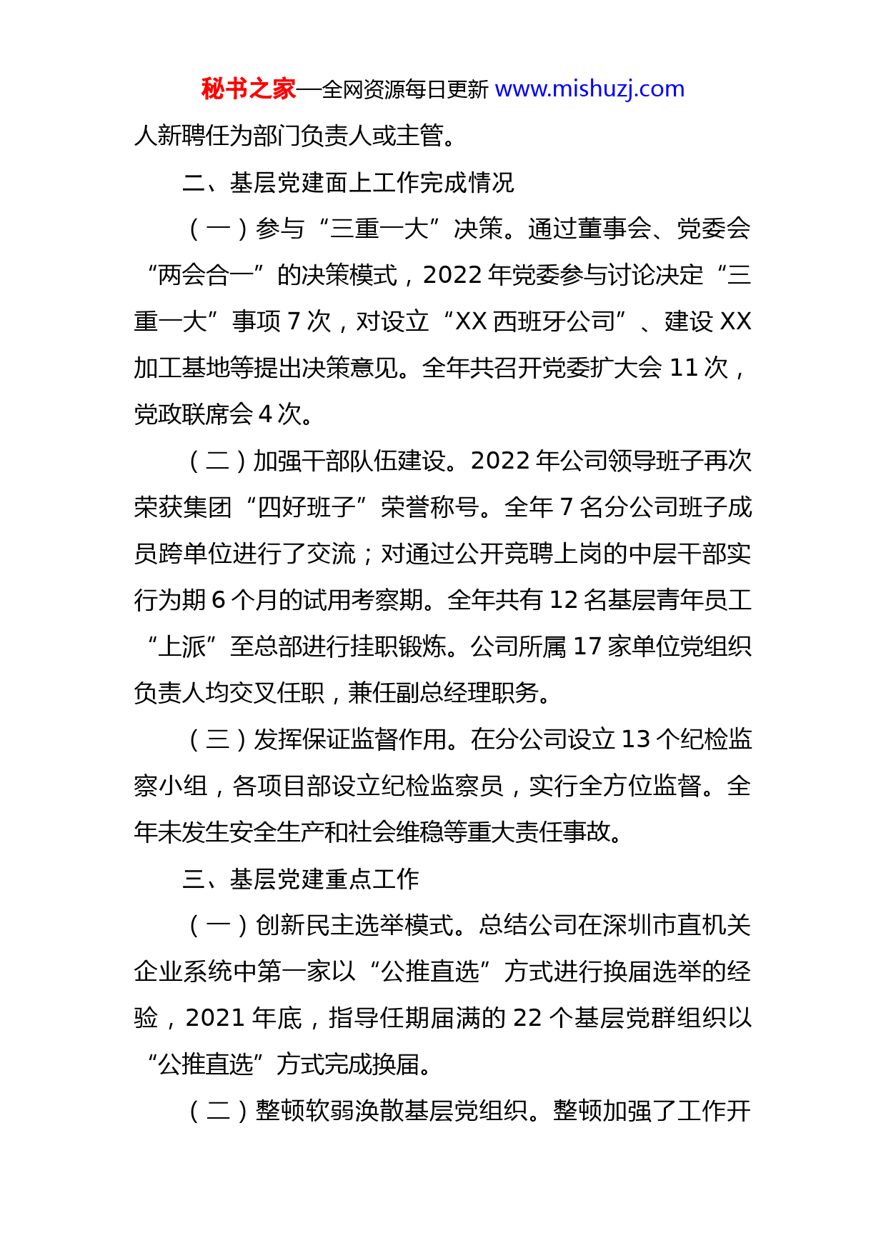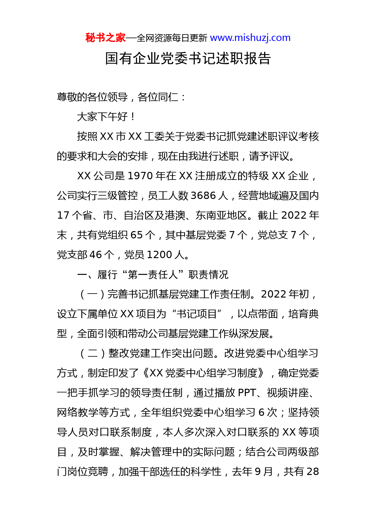 秘书之家—全网资源每日更新www.mishuzj.com国有企业党委书记述职报告尊敬的各位领导,各位同仁:大家下午好!按照XX市XX工委关于党委书记抓党建述职评议考核的要求和大会的安排,现在由我进行述职,请予评议。XX公司是1970年在XX注册成立的特级XX企业,公司实行三级管控,员工人数3686人,经营地域遍及国内17个省、市、自治区及港澳、东南亚地区。截止2022年末,共有党组织65个,其中基层党委7个,党总支7个,党支部46个,党员1200人。一、履行“第一责任人”职责情况(一)完善书记抓基层党建工作责任制。2022年初,设立下属单位XX项目为“书记项目”,以点带面,培育典型,全面引领和带动公司基层党建工作纵深发展。(二)整改党建工作突出问题。改进党委中心组学习方式,制定印发了《XX党委中心组学习制度》,确定党委一把手抓学习的领导责任制,通过播放PPT、视频讲座、网络教学等方式,全年组织党委中心组学习6次;坚持领导人员对口联系制度,本人多次深入对口联系的XX等项目,及时掌握、解决管理中的实际问题;结合公司两级部门岗位竞聘,加强干部选任的科学性,去年9月,共有28秘书之家—全网资源每日更新www.mishuzj.com人新聘任为部门负责人或主管。二、基层党建面上工作完成情况(一)参与“三重一大”决策。通过董事会、党委会“两会合一”的决策模式,2022年党委参与讨论决定“三重一大”事项7次,对设立“XX西班牙公司”、建设XX加工基地等提出决策意见。全年共召开党委扩大会11次,党政联席会4次。(二)加强干部队伍建设。2022年公司领导班子再次荣获集团“四好班子”荣誉称号。全年7名分公司班子成员跨单位进行了交流;对通过公开竞聘上岗的中层干部实行为期6个月的试用考察期。全年共有12名基层青年员工“上派”至总部进行挂职锻炼。公司所属17家单位党组织负责人均交叉任职,兼任副总经理职务。(三)发挥保证监督作用。在分公司设立13个纪检监察小组,各项目部设立纪检监察员,实行全方位监督。全年未发生安全生产和社会维稳等重大责任事故。三、基层党建重点工作(一)创新民主选举模式。总结公司在深圳市直机关企业系统中第一家以“公推直选”方式进行换届选举的经验,2021年底,指导任期届满的22个基层党群组织以“公推直选”方式完成换届。(二)整顿软弱涣散基层党组织。整顿加强了工作开秘书之家—全网资源每日更新www.mishuzj.com展较弱的国际工程部XX项目党支部。(三)发挥民主监督作用。在工资调整、房屋配租、社保基数等涉及职工切身利益的事项都经过各级职代会、团组长会讨论通过后再实施。(四)严肃查处违纪违规事件。全年获取举报线索、问题线索和上级转来信访件共3件,核查、完结3件。(五)严格党员教育管理。年内对党员干部上专题党课2次,对公司中层及以上管理人员进行党风廉洁教育集体约谈1次;按照XX省委统一部署,集中开展庸懒散浮拖等三个专项整治工作;本人认真履行市党代表职责,共接待社区党员群众768人次,入户走访42户,慰问党员36人。(六)落实基层党建工作保障。在专兼职党群工作人员待遇、津贴的保障、党建工作活动场地等方面加大投入力度,每年度将党组织活动专项经费列入公司费用预算。公司2021年完成营业收入逾千亿,增长22.76%,利润同比增长36.89%,被XX认定为XX企业。荣获2021年度“全国XX业先进企业”四、存在的主要问题(一)项目党建工作开展较弱,活力不够。(二)党群干部储备捉襟见肘。青黄不接、后继乏人、来源狭窄成为党群队伍建设的主要问题。秘书之家—全网资源每日更新www.mishuzj.com(三)存“重经济效益、轻思想教育和理论学习”的现象,思想认识有待提高。(四)思想政治工作创新不够。五、下一步思路和举措以十九届和历次全会精神为指导,加强组织建设和队伍建设,发挥党组织战斗堡垒作用,推动企业转型升级发展。(一)完善基层党群组织建设,探索创新党建工作新方式。2021年召开公司第六次党代会,完成党委换届。完善两级机关和项目党群组织设置;对退休党员进行统一管理,加强退休党支部建设。与公司“善建”企业文化系列活动相结合,围绕生产活动和相关过程开展主题鲜明的组织活动,探索创新党建工作的新方式。(二)改进培训工作。把素质提升培训职责划归党委工作部,增强干部培训的实效性和针对性。2021年6月30日前完成《XX党群制度汇编》,尝试推行党群干部岗前培训制度,考试合格后方能上岗;试行党群干部任职考察期,对不合格者给予调整或调离职务处理。(三)加强思想教育,提高对新时期全面加强党建的认识。通过选送人员参加党校培训班、加强中心组学习、“走出去、请进来”学习先进单位党建工作经验等方式,加强思想教育,提升新形势、新任务下对基层党建工作的秘书之家—全网资源每日更新www.mishuzj.com认识。(四)加强党群干部选人用人工作。一方面面向基层、项目部积极选拔人才;另一方面开展党群业务培训,培育人才。在继续推行党组织负责人兼任行政职务的同时,尝试从符合基本条件的行政干部中选用3名左右党群干部,通过交叉任职,使党建工作与行政工作相互渗透、相互融合,推动公司工作的顺利完成。