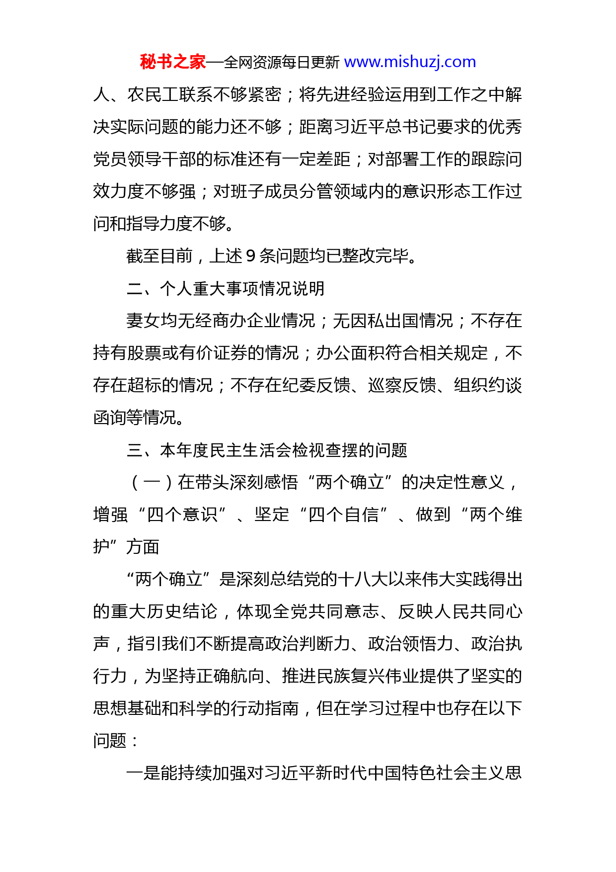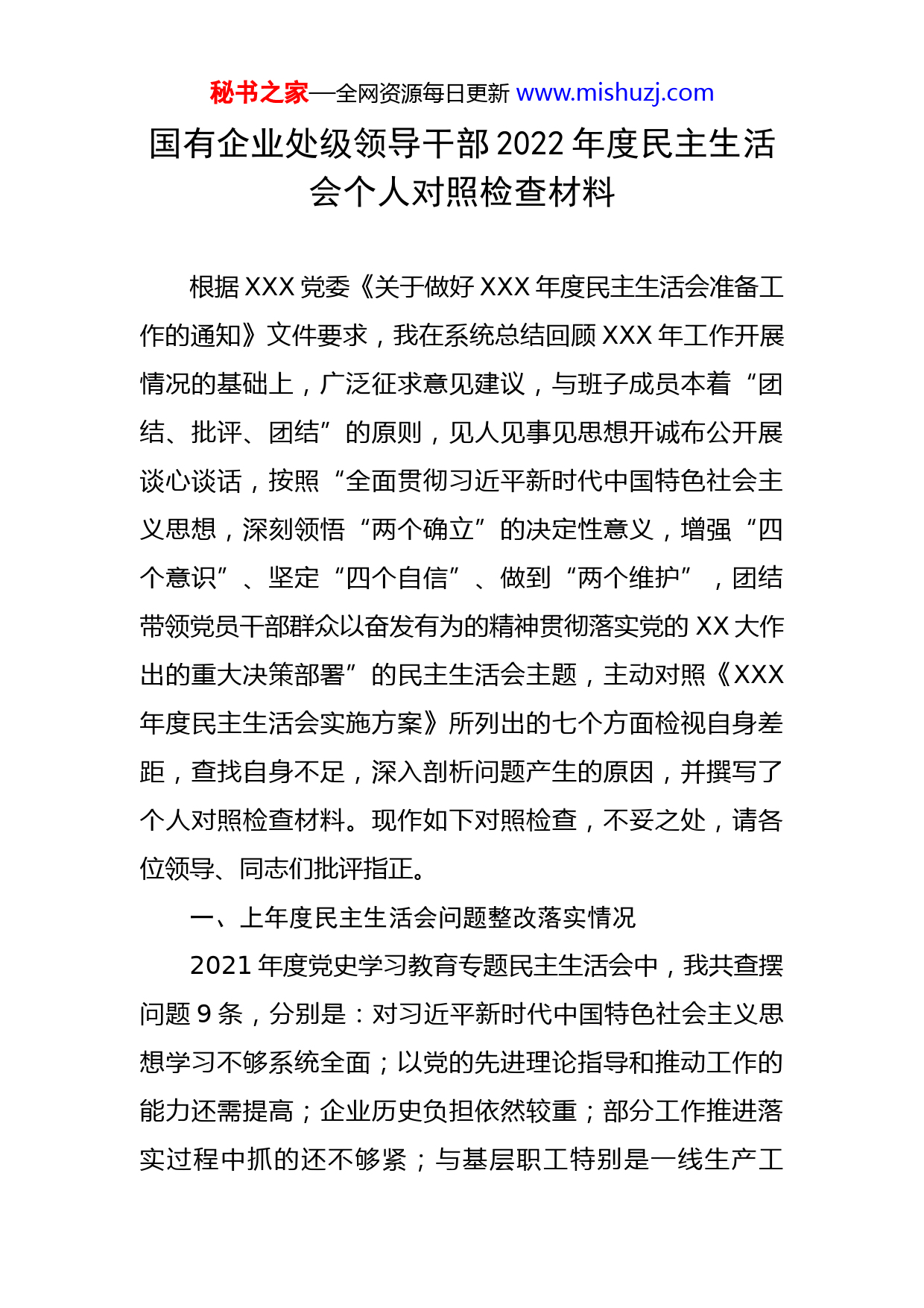 秘书之家—全网资源每日更新www.mishuzj.com国有企业处级领导干部2022年度民主生活会个人对照检查材料根据XXX党委《关于做好XXX年度民主生活会准备工作的通知》文件要求,我在系统总结回顾XXX年工作开展情况的基础上,广泛征求意见建议,与班子成员本着“团结、批评、团结”的原则,见人见事见思想开诚布公开展谈心谈话,按照“全面贯彻习近平新时代中国特色社会主义思想,深刻领悟“两个确立”的决定性意义,增强“四个意识”、坚定“四个自信”、做到“两个维护”,团结带领党员干部群众以奋发有为的精神贯彻落实党的XX大作出的重大决策部署”的民主生活会主题,主动对照《XXX年度民主生活会实施方案》所列出的七个方面检视自身差距,查找自身不足,深入剖析问题产生的原因,并撰写了个人对照检查材料。现作如下对照检查,不妥之处,请各位领导、同志们批评指正。一、上年度民主生活会问题整改落实情况2021年度党史学习教育专题民主生活会中,我共查摆问题9条,分别是:对习近平新时代中国特色社会主义思想学习不够系统全面;以党的先进理论指导和推动工作的能力还需提高;企业历史负担依然较重;部分工作推进落实过程中抓的还不够紧;与基层职工特别是一线生产工秘书之家—全网资源每日更新www.mishuzj.com人、农民工联系不够紧密;将先进经验运用到工作之中解决实际问题的能力还不够;距离习近平总书记要求的优秀党员领导干部的标准还有一定差距;对部署工作的跟踪问效力度不够强;对班子成员分管领域内的意识形态工作过问和指导力度不够。截至目前,上述9条问题均已整改完毕。二、个人重大事项情况说明妻女均无经商办企业情况;无因私出国情况;不存在持有股票或有价证券的情况;办公面积符合相关规定,不存在超标的情况;不存在纪委反馈、巡察反馈、组织约谈函询等情况。三、本年度民主生活会检视查摆的问题(一)在带头深刻感悟“两个确立”的决定性意义,增强“四个意识”、坚定“四个自信”、做到“两个维护”方面“两个确立”是深刻总结党的十八大以来伟大实践得出的重大历史结论,体现全党共同意志、反映人民共同心声,指引我们不断提高政治判断力、政治领悟力、政治执行力,为坚持正确航向、推进民族复兴伟业提供了坚实的思想基础和科学的行动指南,但在学习过程中也存在以下问题:一是能持续加强对习近平新时代中国特色社会主义思秘书之家—全网资源每日更新www.mishuzj.com想的学习,坚持学而信、学而用,但学习存在片面性,多侧重于与企业经营发展有关的政策、方向等方面,学习的系统性不够。二是由于学习存在实用主义倾向,工作中面对新形势新变化,缺少更加坚定的理论自信,影响了自己思想的进步和工作的推进。(二)在带头用习近平新时代中国特色社会主义思想凝心铸魂方面能坚持用习近平新时代中国特色社会主义思想统一思想、统一意志、统一行动,做到学思用贯通,知信行统一,并着力引导广大党员干部坚定理想信念,让全体职工全面正确认识到在中国共产党的领导下中国发生的翻天覆地的变化,把中国共产党团结带领全国各族人民为实现中华民族伟大复兴而不懈奋斗的奋进伟力转化为推动工作的具体实践。也存在以下问题:一是虽然打造了党员责任林,但由于平时工作较忙,与广大党员一同参与义务劳动的的频次偏低,依托党员责任林发挥党员先进模范作用不够充分,没有起到较好的带头作用。二是能始终自觉坚持政治理论学习,将思想高度统一到行动上来,但对如何把思想内化为行动、转化为成果方面思考的不够,以先进理论指导实践推动工作的能力还要进一步提升。(三)在带头坚持和加强党的全面领导方面秘书之家—全网资源每日更新www.mishuzj.com一是指导党建工作开展的能力还不够强。多来来长期从事业务工作,日常工作中也多强调干好实际业务多一些,对如何抓好党建工作思考的不够深、不够透,导致在抓基层党建与业务工作相结合上方法不多、形式不活,特别是履职党委副书记以来,存在强烈的“本领恐慌”感。二是党内组织生活开展不彻底。在民主生活会和组织生活会上,有时顾面子、讲人情,面对同志的缺点和问题,存在以提醒代替批评、“只栽花不挑刺”的老好人思想,谈心谈话不够深入透彻,讲工作、将成绩多,谈问题、谈缺点不够。(四)在带头坚持以人民为中心的发展思想,推动改革发展稳定方面一是与基层职工特别是一线生产工人、农民工联系不够紧密,对他们的所思所想所盼了解掌握的不够,忙于日常管理工作,一对一帮扶为职工排忧解难方面做的还不够。二是XXX集团的历史包袱重,两年来虽然成功化解3亿元多元债务,但剩余债务对XXX集团而言仍存在非常大的压力,以混合所有制改革方式推动企业实现规模和效益双赢方面还需更加努力。(五)在带头发扬斗争精神,防范化解风险挑战方面十九届六中全会在实现第二个百年奋斗目标的“4个必秘书之家—全网资源每日更新www.mishuzj.com须”中提出,必须铭记生于忧患、死于安乐,常怀远虑、居安思危。习近平总书记也讲,“工作抓而不紧,等于不抓;抓而不实,等于白抓。发扬斗争精神,全面做好企业风险防范化解是保障企业健康平稳运行的关键。XXX年,我主导建立了清欠、安全、成本风险评估,能及时分析研判企业运行中的潜在风