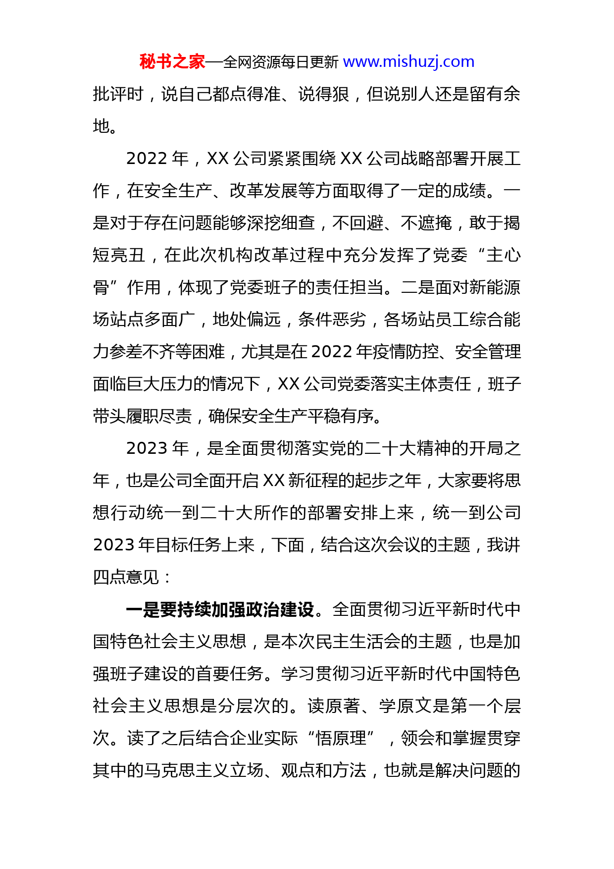 秘书之家—全网资源每日更新www.mishuzj.com在公司2022年度党员领导干部民主生活会上的讲话同志们:根据党建联系点工作要求,今天,我参加XX公司党员领导干部民主生活会,与大家共同接受党内政治生活的洗礼和教育。本次民主生活会是贯彻习近平新时代中国特色社会主义思想和党的二十大精神的重要举措。刚才,史国建同志代表领导班子进行对照检查,五位同志先后作了个人对照发言。总体感觉,新能源公司党委能够按照上级部署要求,扎实开展学习研讨,广泛听取意见建议,深入进行谈心谈话,围绕六个方面重点内容剖析查摆问题,深挖问题背后的思想根源,真诚严肃地开展批评和自我批评,有针对性提出改进措施,体现了党内政治生活的严肃性,也体现了新能源公司领导班子直面问题、敢于担当的勇气和决心。本次民主生活会起到了“出汗、排毒、脸红、心跳”的作用,达到了统一思想、改进作风、增进团结、推动工作的目的,是一次质量较高的民主生活会。当然,与上级的要求对标对表,还有一些可以进一步提升的地方,比如对工作层面的问题查摆得相对比较多,对思想作风层面的问题查找要少一些;在开展批评与自我秘书之家—全网资源每日更新www.mishuzj.com批评时,说自己都点得准、说得狠,但说别人还是留有余地。2022年,XX公司紧紧围绕XX公司战略部署开展工作,在安全生产、改革发展等方面取得了一定的成绩。一是对于存在问题能够深挖细查,不回避、不遮掩,敢于揭短亮丑,在此次机构改革过程中充分发挥了党委“主心骨”作用,体现了党委班子的责任担当。二是面对新能源场站点多面广,地处偏远,条件恶劣,各场站员工综合能力参差不齐等困难,尤其是在2022年疫情防控、安全管理面临巨大压力的情况下,XX公司党委落实主体责任,班子带头履职尽责,确保安全生产平稳有序。2023年,是全面贯彻落实党的二十大精神的开局之年,也是公司全面开启XX新征程的起步之年,大家要将思想行动统一到二十大所作的部署安排上来,统一到公司2023年目标任务上来,下面,结合这次会议的主题,我讲四点意见:一是要持续加强政治建设。全面贯彻习近平新时代中国特色社会主义思想,是本次民主生活会的主题,也是加强班子建设的首要任务。学习贯彻习近平新时代中国特色社会主义思想是分层次的。读原著、学原文是第一个层次。读了之后结合企业实际“悟原理”,领会和掌握贯穿其中的马克思主义立场、观点和方法,也就是解决问题的秘书之家—全网资源每日更新www.mishuzj.com方法,是第二个层次。结合工作实际、特别是改革发展中的重大问题去活学活用,通过深入地研究、思考,从习近平新时代中国特色社会主义思想和党中央决策部署中找到推动工作的方向、方法,这是第三个层次。刚才,有的同志在查摆问题中提到了学习不深入、不系统,联系实际、指导工作成效不够等问题,就是这三个层次的不同体现。集团公司党组“学研创落”工作法是解决这些问题的一个好方法。同志们要真正理解“学研创落”工作法的本质内涵,坚持问题导向开展深入研究,真正做到用党的创新理论指导实践、推动工作。近期,根据党中央统一部署,将在全党开展学习贯彻习近平新时代中国特色社会主义思想主题教育,集团公司已经明确将“党的建设和企业管理向基层延伸”作为开展主题教育的重要抓手,公司党委也将相应作出部署安排,你们要认真抓好落实。二是要着力加强班子建设。领导班子自身建设是带队伍、谋发展、促改革的关键。要不断锤炼政治品质、加强党性修养、增强班子团结,提高科学决策和民主决策的水平。在一个集体里,对工作有不同的看法,有不同意见,那是正常的。许多思路和办法都是在争论中、讨论中得出的。我也反复强调,同志间的友谊,不是靠欺欺哄哄。我们这个团队、我们的事业是靠我们的真诚,靠改进不足不秘书之家—全网资源每日更新www.mishuzj.com断推进事业进步。批评和自我批评是我们党强身治病、保持肌体健康的锐利武器,我们召开民主生活会,就是为了把班子建设得更好,通过这种方式,经常提醒,清除每个人身上的“灰尘”。我相信,只要出于公心,态度诚恳,讲究方法,无论是主要领导还是副职,都会做到相互包容、相互支持。当前,我们正处在百年未有之大变局,大的环境在变,公司发展在变,员工队伍也在变,我们的工作始终面临着新形势、新目标、新要求。在座的各位要充分认识提高政治能力的重要性和紧迫性,不断增强自身的政治判断力、政治领悟力和政治执行力,锤炼推动高质量发展的本领、防范化解风险的本领,使自己的政治能力同新形势、新目标、新要求相契合,同肩负的领导职责、历史使命相匹配,做一名政治坚强、本领高强、意志顽强的领导干部。三是要奋发有为抓发展。我多次在各类会议上强调,发展是解决一切问题的总钥匙。去年,公司党委统筹完成了一系列体制机制改革措施,其中一个大动作便是整合新能源开发力量,成立覆盖全国的10家省域公司,而XX公司作为成立时间最早的省域公司,一定要发挥“老大哥”的带头作用,主动扛起公司新能源事业跨越式发展的重任,勇当主力军、争做排头兵,不等不靠、奋起直追。要秘书之家—全网资源每日更新www.mishuzj.com敢于斗争、善于斗争,协同法律企管部等专业部门进一步完善新能源项目开发法