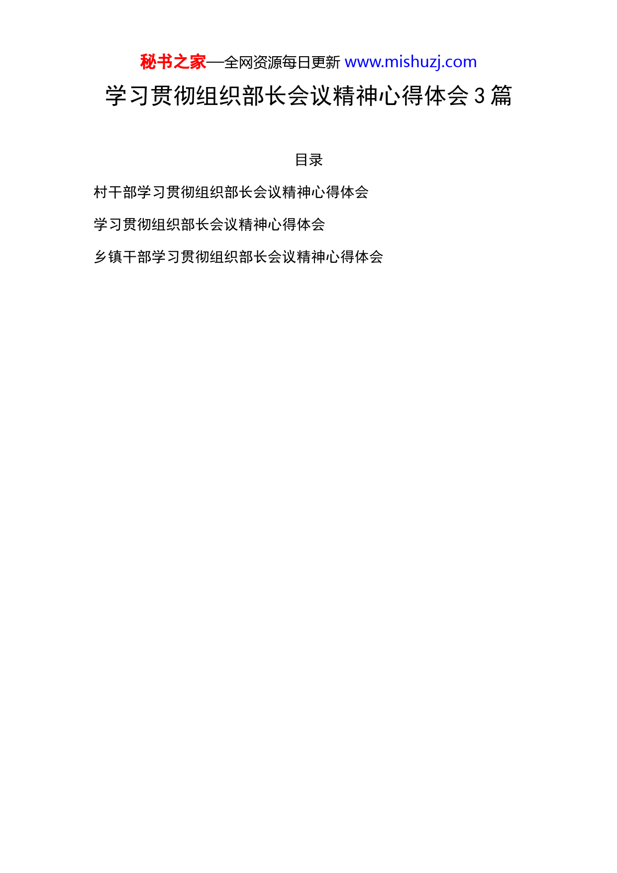 秘书之家—全网资源每日更新www.mishuzj.com学习贯彻组织部长会议精神心得体会3篇目录村干部学习贯彻组织部长会议精神心得体会学习贯彻组织部长会议精神心得体会乡镇干部学习贯彻组织部长会议精神心得体会秘书之家—全网资源每日更新www.mishuzj.com村干部学习贯彻组织部长会议精神心得体会近日,XX在全国组织部长会议上强调,健全培养选拔优秀年轻干部常态化工作机制,教育引导年轻干部成为党和人民忠诚可靠的干部。《求是》杂志在2022年第3期中也连续刊发三篇重磅文章呼吁引导广大年轻干部努力成为可堪大用能担重任的栋梁之才。欣逢盛世,当不懈奋斗,坐而论道不如起而行之。广大年轻干部当以服务群众有诚心,面对困难有对策、干事创业有担当的“三有”之行去书写青春奋斗的壮丽篇章。服务群众有诚心,兢兢业业得民心。XXX强调,加强党的政治建设,要紧扣民心这个最大的政治,把赢得民心民意、汇集民智民力作为重要着力点。“以诚感人者,人亦以诚而应”。回顾党的百年奋斗史,就是一部回应民声、顺应民意、真诚为民、赢得民心的历史,这是我们党之所以能够始终走在时代前列、经得起各种风浪考验、不断从胜利走向胜利的关键所在。广大年轻干部作为党和国家事业的接班人,当始终怀有赤诚为民之心。要学习党的光荣历史,继承党的优良作风,始终把人民群众放在心中最高的位置,厚植为民情怀,深入田间地头,坐在百姓炕头,以百姓心为心,把群众事当家事,真真切切解决人民秘书之家—全网资源每日更新www.mishuzj.com群众急难愁盼的问题,不断深化与人民群众的鱼水之情。面对困难有对策,勤学苦练强本领。回顾我们党的奋斗史,既是一部荡气回肠的斗争史,也是一部不断学习的奋斗史。正是因为我们党不断学习,增长本领,才实现了由弱小到强大的涅槃重生,使星星之火成燎原之势,进而夺取全国政权,让中华民族实现了从站起来、富起来到强起来的伟大飞跃,锻造了走在时代前列的中国共产党。当今广大青年处于最好的年华,当砥砺奋斗,勤学苦练,以“不用扬鞭自奋蹄”的行动自觉增强自身本领以满足党和人民的需要。要向书本求知,学习马克思主义原理,读原著悟思想,学习党的创新理论,用理论武装头脑指导实践推动工作,向实践求知,勇于实践,发扬一不怕苦、二不怕累的精神,主动到艰苦的岗位上锻炼自己,到复杂环境中砥砺意志,努力让自己成为关键时刻冲得上的人民好干部。干事创业有担当,实事求是出成效。XXX指出,我们做人一世,为官一任,要有肝胆,要有担当精神,应该对为官不为感到羞耻,应该予以严肃批评。正是因为共产党人敢于担当,扛起了民族复兴的伟大旗帜,人民才选择了中国共产党,历史才选择了中国共产党;正是因为这份担当我们才能攻克千难万险取得四个“伟大成就”,才能庄严地向世界发出“中国没有辜负社会主义,社会主义没有秘书之家—全网资源每日更新www.mishuzj.com辜负中国”的政治宣言。广大青年干部处于三观成熟的重要时期,一定要牢牢树立起担当意识,同时在干事创业的过程中也要实事求是。要“干”字当头,敢想敢干,既要苦干实干,也要能干巧干,以强烈的政治责任感和历史使命感,保持只争朝夕、奋发有为的奋斗姿态和越是艰险越向前的斗争精神,以钉钉子精神抓工作落实,努力创造经得起实践、人民、历史检验的实绩。秘书之家—全网资源每日更新www.mishuzj.com学习贯彻组织部长会议精神心得体会近日,中共中央政治局委员、中组部部长XX在全国组织部长会议上强调,“要健全培养选拔优秀年轻干部常态化工作机制,教育引导年轻干部成为党和人民忠诚可靠的干部。”时代赋予青年全新的意义,在这干事创业的大好时期,更应该鼓励青年干部担当起自己的担当、肩负起自己的肩负、奉献出自己的奉献,成为敢于坚持真理、敢于奋力拼搏、敢于沉下身子的“三敢”人才。以党性立身,让青年人敢做“定心丸”。“人之忠也,犹鱼之有渊。”年轻干部要坚持以党性立身做事,把学习贯彻XXX新时代中国特色社会主义思想作为党性修养和锻炼的首要任务,敢于坚持真理,善于独立思考,坚持求真务实。通过进一步强化理论学习,将学习党史党章融入工作中,让更多青年干部走上讲台、走入基层,去宣传讲解党的方针政策、党员的先锋故事,让青年干部切实切身感受到老一辈共产党员干事创业的精气神,从而进一步坚定理想信念,筑牢干事奉献的思想之魂。以创新为帆,让青年人敢闯“无人区”。“苟利于民,不必法古;苟周于事,不必循俗。”敢蹚别人没走过的路,才能收获别样风景;敢拓前人没垦过的荒,才能开辟新的空间。通过深化创新人才评价体系改革,树立创新秘书之家—全网资源每日更新www.mishuzj.com人才评价正确导向,扭转“唯名校”“唯学历”“唯论文”“唯帽子”的错误导向,破除歧视性限制和各种隐性障碍,建立以创新能力、质量、贡献为导向的人才评价体系和激励机制,形成“英雄不问出身”“创新不论身份”的制度环境,最大程度激发青年创新创造潜能,努力形成“人人努力成才、人人皆可成才、人人尽展其才”的生动局面。以务实为要,让青年人敢坐“冷板凳”。“物有甘苦,尝之者识;道有夷险,履之者知。”2月7日上午,XX全省改进工作作风为民办实事为企优环境大会在合肥召开,“躺平”干部将