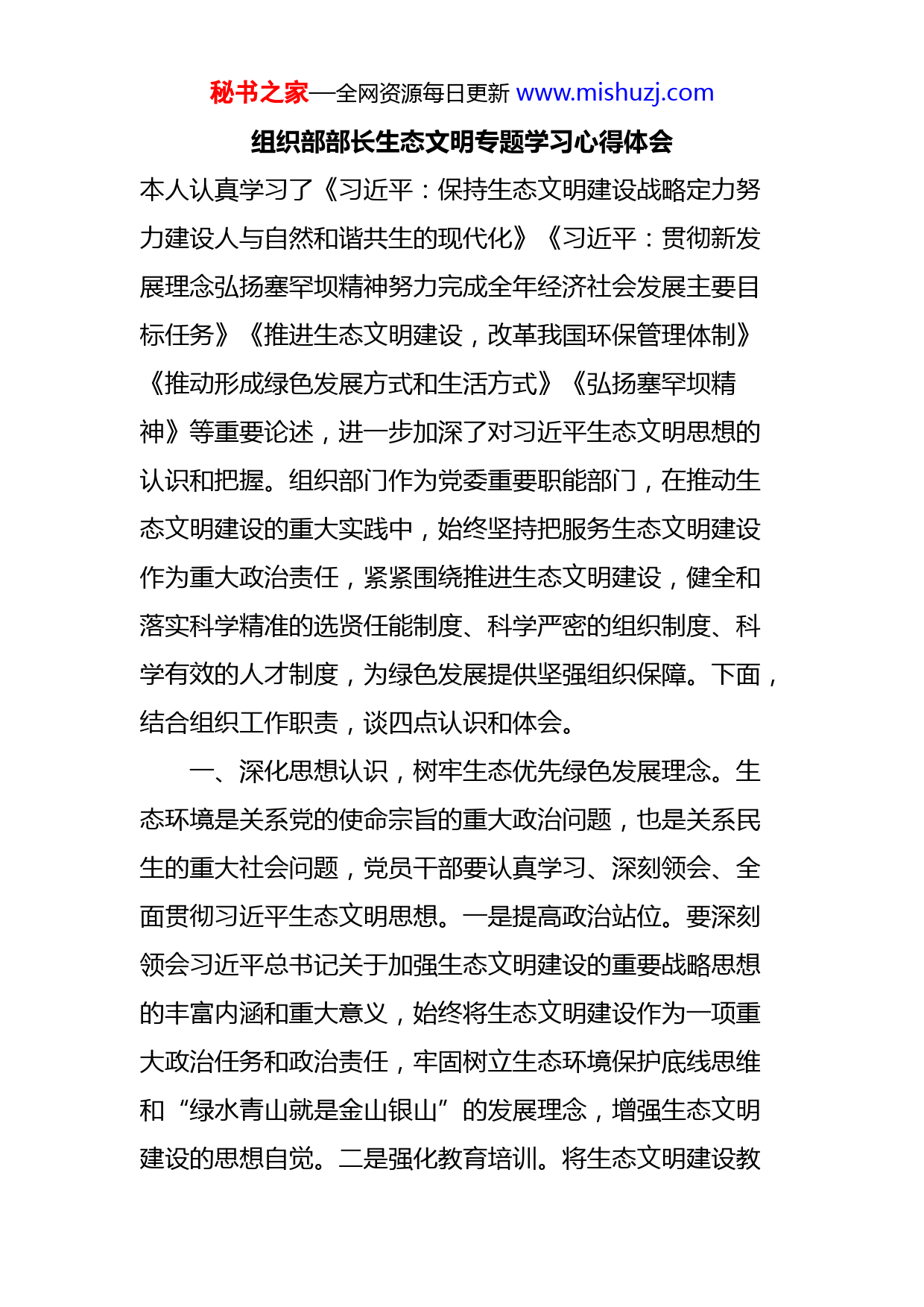 秘书之家—全网资源每日更新www.mishuzj.com组织部部长生态文明专题学习心得体会本人认真学习了《习近平:保持生态文明建设战略定力努力建设人与自然和谐共生的现代化》《习近平:贯彻新发展理念弘扬塞罕坝精神努力完成全年经济社会发展主要目标任务》《推进生态文明建设,改革我国环保管理体制》《推动形成绿色发展方式和生活方式》《弘扬塞罕坝精神》等重要论述,进一步加深了对习近平生态文明思想的认识和把握。组织部门作为党委重要职能部门,在推动生态文明建设的重大实践中,始终坚持把服务生态文明建设作为重大政治责任,紧紧围绕推进生态文明建设,健全和落实科学精准的选贤任能制度、科学严密的组织制度、科学有效的人才制度,为绿色发展提供坚强组织保障。下面,结合组织工作职责,谈四点认识和体会。一、深化思想认识,树牢生态优先绿色发展理念。生态环境是关系党的使命宗旨的重大政治问题,也是关系民生的重大社会问题,党员干部要认真学习、深刻领会、全面贯彻习近平生态文明思想。一是提高政治站位。要深刻领会习近平总书记关于加强生态文明建设的重要战略思想的丰富内涵和重大意义,始终将生态文明建设作为一项重大政治任务和政治责任,牢固树立生态环境保护底线思维和“绿水青山就是金山银山”的发展理念,增强生态文明建设的思想自觉。二是强化教育培训。将生态文明建设教秘书之家—全网资源每日更新www.mishuzj.com育纳入党员干部培训主体班次计划,作为干部大讲堂、各级党委(党组)理论中心组学习、党支部“三会一课”的重要内容,依托各党校分校、电视夜校、微信公众号等平台,推进生态环保教育进机关、进学校、进社区、进企业、进农村。三是加大宣传力度。定期举办生态文明建设宣传讲座、专题论坛等活动,依托微信公众号、抖音等平台,注重挖掘和宣传生态文明建设中的好典型、好经验、好做法,努力营造良好舆论氛围,引导广大党员干部牢固树立生态文明价值观。二、建强战斗堡垒,不断提升乡村环境治理能力。贯彻落实习近平生态文明思想,推进生态文明建设,需要政府、企事业单位、社会组织和民众的积极参与。一是锻造坚强战斗堡垒。突出党建引领,健全基层生态环境保护共建共治共享机制。深入开展“XX”和党员XX制等活动,团结动员党员干部群众积极参与“厕所革命”、环境卫生整治等民生重点工作中。二是促进工作责任落实。将生态文明建设纳入党组织书记抓基层党建述职评议考核内容,压实镇、村生态环境保护责任,解决农村生态环境保护“最后一公里”问题。结合“我为群众办实事”和“XX”活动,推动各基层党组织把力量凝聚到破解生态文明建设的堵点和难题上来。三是加快党建工作成效转化。以党建引领绿色发展,指导基层党组织采取有效措施发展有机农业、生态旅游等秘书之家—全网资源每日更新www.mishuzj.com生态产业,提升村级集体经济规模和质量。进一步巩固扩大“不忘初心、牢记使命”主题教育成果,认真开展生态环境矛盾纠纷排查工作。三、优化班子建设,提高干部队伍生态文明建设能力。推动生态文明建设工作落到实处,急需一批能力素质过硬、敢于担当的好干部。一是选优干部配强班子。紧紧围绕生态文明建设选优配强领导班子和干部队伍,选优配强生态文明建设机关单位领导班子成员,探索从企业、高校、科研院所选拔环保工作经验丰富、生态文明意识强的优秀干部进入党政机关,集中选派有潜力的年轻干部到生态文明建设一线跟班学习、挂职锻炼,优化提升领导班子抓生态文明建设的整体功能。二是建立健全考核评价机制。把生态文明建设以及生态环境和资源保护情况作为干部年度考核、日常考核等的重要内容,加大资源消耗、环境保护、生态效益等等指标考核权重,并将考核结果作为综合评价领导班子和领导干部的重要参考,充分运用到班子配备、干部选任、换届考察、评先评优等工作中。三是加强跟踪问效和督查问责。建立生态环境责任追究沟通协作机制,加强与纪检、巡查、环保等部门的信息共享,及时做好“咬耳扯袖”,做到有权必有责、用权受监督。畅通“四位一体”举报渠道,将生态损害问题纳入举报受理重要内容。严格落实生态文明建设责任制,对造成生态环境损害秘书之家—全网资源每日更新www.mishuzj.com负有责任的领导干部,和受党纪政纪处分的干部,相应给予调整岗位、降职、免职、责令辞职等组织处理,引导各级领导班子和领导干部加快新旧动能转换、推进绿色发展、提升生态文明建设水平。四、创新工作机制,打造良好的人才生态环境。生态文明建设是一项业务性很强的工作,急需一批懂生态建设、有项目经验的优秀人才。一是加大人才引进力度。将生态文明建设类专技人才统筹纳入高层次人才引进、公务员考录、选调生招录等需求计划,通过“XX”“XX”等项目围绕XX生态保护和建设引进一批急需紧缺高层次人才,不断充实生态文明建设人才队伍专业力量。二是注重专业人才培养。通过优先扶持和奖励生态环保建设做得好的大学生创业项目、选派本地人才到生态文明水平领先地区及生态环保问题挑战较大的部门进行学习交流和实践锻炼等,提高各类人才解决生态文明建设实际问题的工作能力。三是做好人