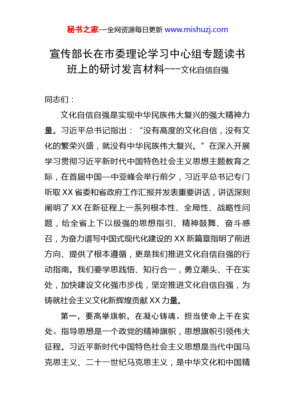 秘书之家—全网资源每日更新www.mishuzj.com宣传部长在市委理论学习中心组专题读书班上的研讨发言材料---文化自信自强同志们:文化自信自强是实现中华民族伟大复兴的强大精神力量。习近平总书记指出:“没有高度的文化自信,没有文化的繁荣兴盛,就没有中华民族伟大复兴。”在深入开展学习贯彻习近平新时代中国特色社会主义思想主题教育之际,在首届中国—中亚峰会举行前夕,习近平总书记专门听取XX省委和省政府工作汇报并发表重要讲话,讲话深刻阐明了XX在新征程上一系列根本性、全局性、战略性问题,给全省上下以极强的思想指引、精神鼓舞、奋斗感召,为奋力谱写中国式现代化建设的XX新篇章指明了前进方向、提供了根本遵循,更是我们推进文化自信自强的行动指南。我们要学思践悟、知行合一,勇立潮头、干在实处,加快建设文化强市步伐,坚定推进文化自信自强,为铸就社会主义文化新辉煌贡献XX力量。第一,要高举旗帜,在凝心铸魂、担当使命上干在实处。指导思想是一个政党的精神旗帜,思想旗帜引领伟大征程。习近平新时代中国特色社会主义思想是当代中国马克思主义、二十一世纪马克思主义,是中华文化和中国精秘书之家—全网资源每日更新www.mishuzj.com神的时代精华,是我们推动工作、解决问题的“金钥匙”。坚持不懈用习近平新时代中国特色社会主义思想凝心铸魂,是我们最根本的政治任务。增强理论武装工作的战略定力。理论强,才能方向明、人心齐、底气足。党的理论创新每前进一步,理论武装就要跟进一步。站在坚定拥护“两个确立”、坚决做到“两个维护”的政治高度,及时跟进、系统学习习近平新时代中国特色社会主义思想,牢牢把握这一重要思想的科学体系、精髓要义、实践要求,把握这一重要思想的世界观和方法论,自觉从党的科学理论中悟规律、明方向、学方法、增智慧。坚持理论舆论同向发力、同频共振,贯通抓好深化、内化、转化的工作,充分彰显党的创新理论的真理力量、实践伟力,着力推动党的创新理论“飞入寻常百姓家”。胸怀“国之大者”,全面对标对表,时刻关注以习近平同志为核心的党中央在关心什么、强调什么,深刻领会什么是党和国家最重要的利益、什么是最需要坚定维护的立场,坚如磐石沿着习近平总书记指引的方向奋勇前进。增强肩负文化使命的历史自觉。中华民族伟大复兴进入了不可逆转的历史进程,越是接近目标,越需要推进文化自信自强,越需要增强人民力量、振奋民族精神。坚持马克思主义在意识形态领域指导地位的根本制度,坚定不移用习近平新时代中国秘书之家—全网资源每日更新www.mishuzj.com特色社会主义思想统领新时代文化建设,不断巩固全党全国各族人民团结奋斗的共同思想基础。认真贯彻落实党中央关于文化建设的方针政策和决策部署,坚持“二为”方向、“双百”方针,坚持创造性转化、创新性发展,贯彻“双效统一”要求,一以贯之抓好学习贯彻、执行落实,推动文化事业和文化产业繁荣发展。坚持以社会主义核心价值观为引领,发展社会主义先进文化,弘扬革命文化,传承中华优秀传统文化,更好构筑中国精神、中国价值、中国力量,让中华民族精神的大厦巍然耸立。增强维护文化安全的时代责任。坚定文化自信是事关国运兴衰、事关文化安全、事关民族精神独立性的大问题。历史和现实反复表明,一个抛弃或者背叛了自己历史文化的民族,不仅不可能发展起来,而且很可能上演一幕幕历史悲剧。统筹发展和安全,正确处理好民族文化与世界文化、社会主义文化与资本主义文化的关系,在文化交流交融交锋中始终保持中华文化立场、展现中华文化魅力。加强斗争精神和斗争本领养成,着力增强防风险、迎挑战、抗打压能力,在事关文化发展方向等大是大非问题上保持清醒头脑,旗帜鲜明批驳错误思潮和主张,守好建好文化阵地、网络阵地,筑牢文化安全的“铜墙铁壁”。第二,要发挥优势,在坚持“两个结合”、服务中心秘书之家—全网资源每日更新www.mishuzj.com大局上作出示范。习近平总书记指出:“我们走中国特色社会主义道路,一定要推进马克思主义中国化。如果没有中华五千年文明,哪里有什么中国特色?如果不是中国特色,哪有我们今天这么成功的中国特色社会主义道路?”坚持把马克思主义基本原理同中国具体实际相结合、同中华优秀传统文化相结合,为推进马克思主义中国化时代化提供了丰富实践依据和深厚文化底蕴。习近平新时代中国特色社会主义思想是在推进“两个结合”中形成的,是坚持“两个结合”的光辉典范。只有坚定历史自信、文化自信,坚持古为今用、推陈出新,进一步把马克思主义思想精髓同中华优秀传统文化精华贯通起来、同人民群众日用而不觉的共同价值观念融通起来,才能让马克思主义深深地扎根于中国的土地。XX是中华文明的重要发祥地之一,历史文脉源远流长,圣贤名哲人才辈出,遗存遗址星罗棋布,古籍典藏丰富厚重,特别是以周、秦、汉、唐为代表的历史文化灿烂辉煌,以延安为中心的红色文化独树一帜。坚持“两个结合”,推进文化自信自强,XX具有得天独厚的优势,理所必然走在前列、作出示范。充分发掘中华优秀传统文化的精华精髓。中华优秀传统文化是中国特色社会主义植根的文化沃土。习近平新时代中国特色社