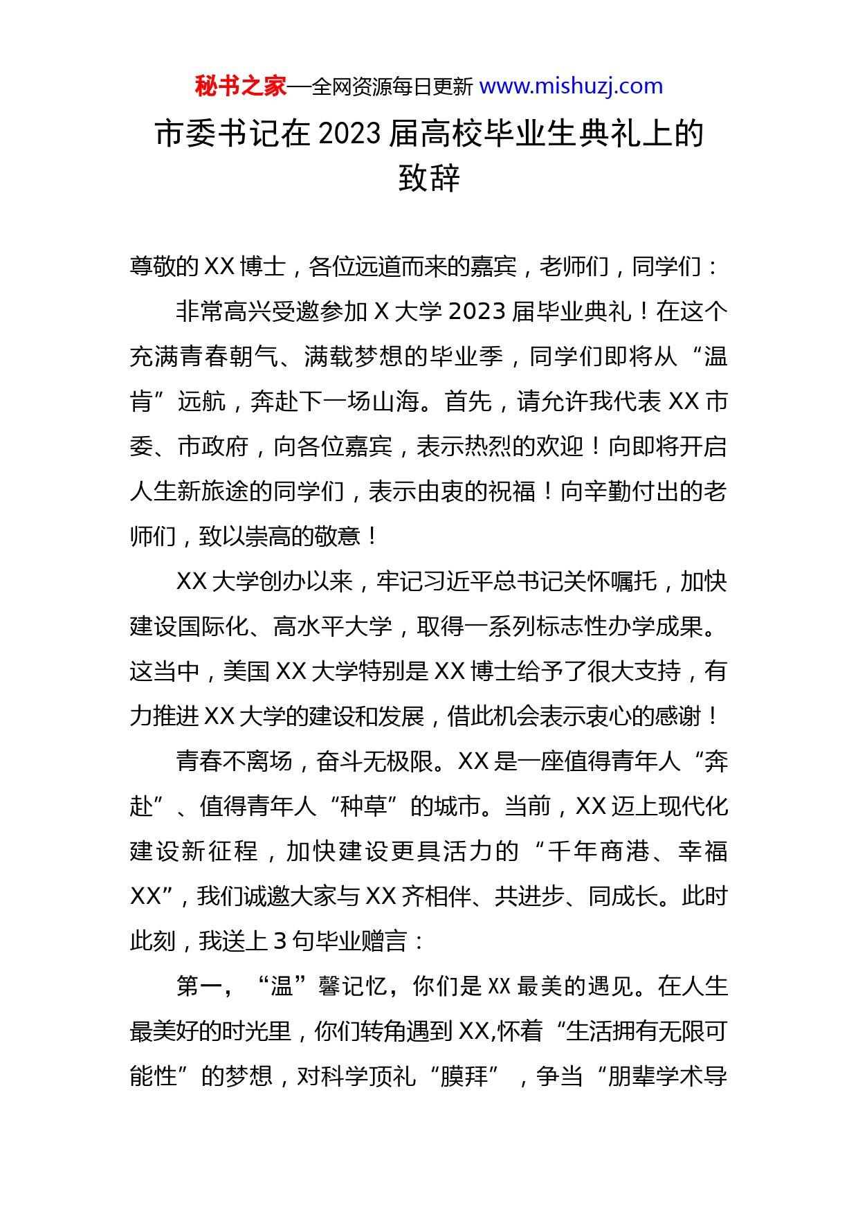 秘书之家—全网资源每日更新www.mishuzj.com市委书记在2023届高校毕业生典礼上的致辞尊敬的XX博士,各位远道而来的嘉宾,老师们,同学们:非常高兴受邀参加X大学2023届毕业典礼!在这个充满青春朝气、满载梦想的毕业季,同学们即将从“温肯”远航,奔赴下一场山海。首先,请允许我代表XX市委、市政府,向各位嘉宾,表示热烈的欢迎!向即将开启人生新旅途的同学们,表示由衷的祝福!向辛勤付出的老师们,致以崇高的敬意!XX大学创办以来,牢记习近平总书记关怀嘱托,加快建设国际化、高水平大学,取得一系列标志性办学成果。这当中,美国XX大学特别是XX博士给予了很大支持,有力推进XX大学的建设和发展,借此机会表示衷心的感谢!青春不离场,奋斗无极限。XX是一座值得青年人“奔赴”、值得青年人“种草”的城市。当前,XX迈上现代化建设新征程,加快建设更具活力的“千年商港、幸福XX”,我们诚邀大家与XX齐相伴、共进步、同成长。此时此刻,我送上3句毕业赠言:第一,“温”馨记忆,你们是XX最美的遇见。在人生最美好的时光里,你们转角遇到XX,怀着“生活拥有无限可能性”的梦想,对科学顶礼“膜拜”,争当“朋辈学术导秘书之家—全网资源每日更新www.mishuzj.com师”,开展“全球连麦”,让XX这座千年古城焕发了青春的活力。很多同学还参加了世界青年科学家峰会、亚运会筹办等,为XX城市增添了靓丽的色彩。一个个时间的相册、一张张记忆的照片、一次次美好的瞬间,都是XX的青春印记。第二,“温”暖同行,你们是XX奋斗的音符。XX不仅有山有海、有蓝天绿地、有诗意的生活,还有很多出新、出彩、出圈的机会。比如,蓬勃发展的新能源、数字经济等蕴含无限创业空间,中国数安港、中国眼谷等创新平台等待大家加盟,大孵化器集群等待大家“拎包入驻”。我们将全力创造良好的创业环境和生活环境,让大家“来XX、创未来,在XX、有未来”。第三,“温”情牵挂,你们是XX永远的守候。无论你们留在XX、还是走向远方,我们永远为青春“打call”,都会支持你的选择、关心你的成长、点赞你的收获。当前,XX正在建设青年发展型城市,打响“最美青春遇见幸福XX”城市IP,任何时候,XX都是大家温暖的港湾,为大家点亮守候的“灯光”。同学们,毕业,意味着告别旧的时光,踏上新的征程。你们将面对一个全新的未来,无限的可能等待你们去探索。期待大家秉持“于此启航,走向世界”的理念,脚踏实地、勇敢追梦,以火热的青春逐梦星辰大海,在世界秘书之家—全网资源每日更新www.mishuzj.com舞台上展现青春风采!祝福XX大学!祝福全体师生!祝福各位来宾!谢谢大家!