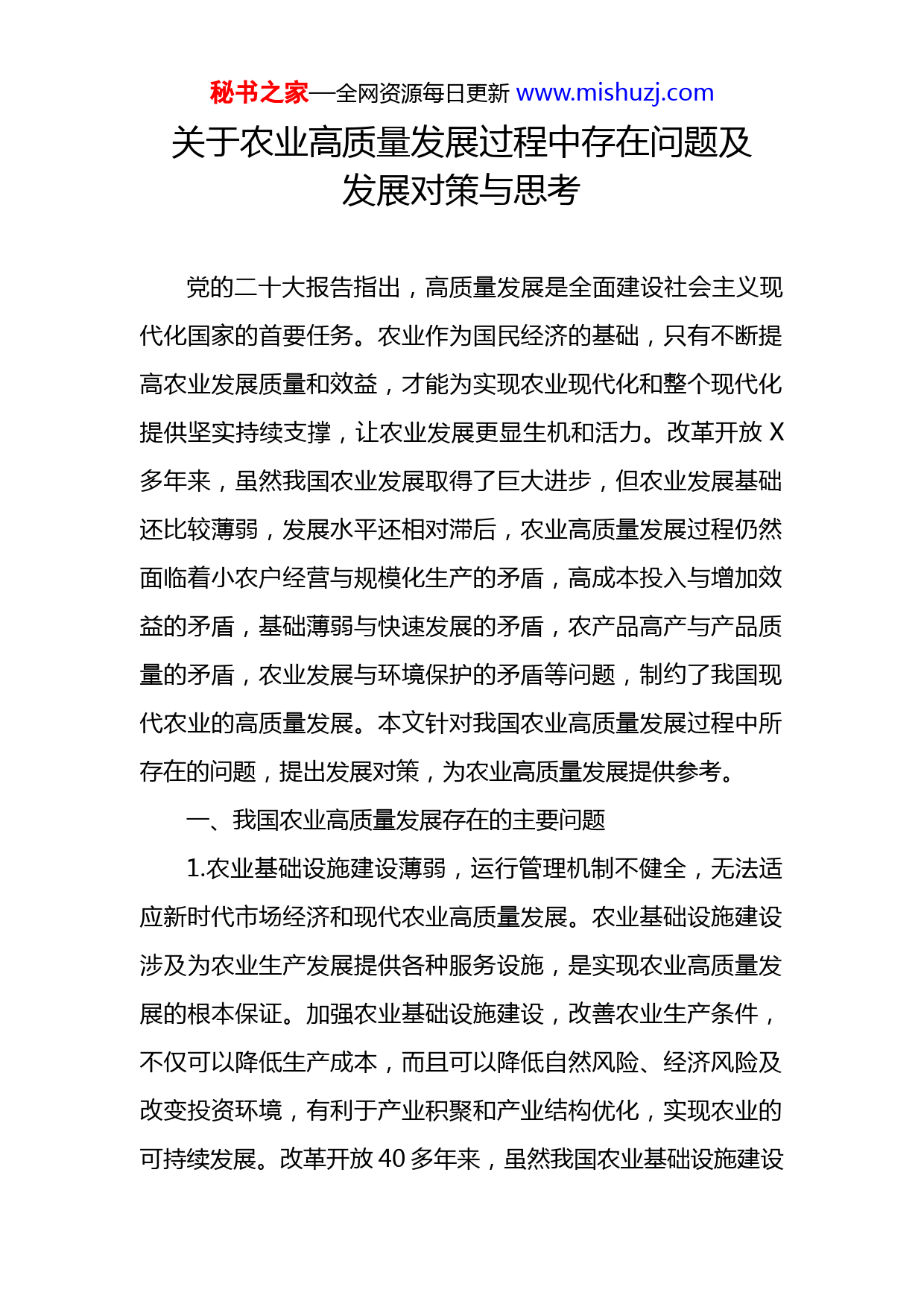 秘书之家—全网资源每日更新www.mishuzj.com关于农业高质量发展过程中存在问题及发展对策与思考党的二十大报告指出,高质量发展是全面建设社会主义现代化国家的首要任务。农业作为国民经济的基础,只有不断提高农业发展质量和效益,才能为实现农业现代化和整个现代化提供坚实持续支撑,让农业发展更显生机和活力。改革开放X多年来,虽然我国农业发展取得了巨大进步,但农业发展基础还比较薄弱,发展水平还相对滞后,农业高质量发展过程仍然面临着小农户经营与规模化生产的矛盾,高成本投入与增加效益的矛盾,基础薄弱与快速发展的矛盾,农产品高产与产品质量的矛盾,农业发展与环境保护的矛盾等问题,制约了我国现代农业的高质量发展。本文针对我国农业高质量发展过程中所存在的问题,提出发展对策,为农业高质量发展提供参考。一、我国农业高质量发展存在的主要问题1.农业基础设施建设薄弱,运行管理机制不健全,无法适应新时代市场经济和现代农业高质量发展。农业基础设施建设涉及为农业生产发展提供各种服务设施,是实现农业高质量发展的根本保证。加强农业基础设施建设,改善农业生产条件,不仅可以降低生产成本,而且可以降低自然风险、经济风险及改变投资环境,有利于产业积聚和产业结构优化,实现农业的可持续发展。改革开放40多年来,虽然我国农业基础设施建设秘书之家—全网资源每日更新www.mishuzj.com取得了长足发展和取得了很大成就,农业生产条件得到不断改善。但目前我国农业生产基础设施建设依然薄弱,农业基础设施及配套设施功能陈旧、老化、落后,运行管理机制不健全,尤其是欠发达地区农业基础设施更为落后,普遍存在建设水平低、布局不合理、保障能力不足、建设资金投入主体单一、缺乏资产经营管理等问题,农业基础设施建设无法适应现代农业高质量发展的需要。2.农村集体经济弱化且发展滞后,集体经济实力严重不足,已不能适应新时代市场经济和现代农业高质量发展。X世纪X年代初,农村双层经营体制伴随着我国农村经济体制改革而出现,集体统一经营和农户分散经营两者并存。双层经营中的集体统一经营,就是由村级集体组织管理土地,规划农田水利建设和农作物布局,为农业生产服务和管理协调组织生产,农村集体经济在我国农村经济发展中起着重要作用。但在农村经济的发展过程中,农村集体经济存在经济总量小、生产发展的基本生产要素匮乏、集体经济底子薄、经营管理水平低、缺乏人才的支持等诸多问题,随着我国农村经济社会和改革开放的发展,双层经营体制面临的发展环境已发生巨大变化,村、乡(镇)办企业改制成为民营企业,导致集体经营弱化,集体经济实力严重不足,已不能适应新时代市场经济和现代农业高质量发展。3.农业科技创新能力不足,农业发展后劲不足,已不能适秘书之家—全网资源每日更新www.mishuzj.com应新时代市场经济和现代农业高质量发展。现代农业高质量发展阶段,仅依靠土地和劳动力等生产要素的投入,难以显著提高农业效益,只有通过推动农业科技进步才能促进产量、效益增长。近年来,中国农业增长虽然速度放缓,但农业新技术在农业领域中的推广应用对产出的影响十分显著,突出表现为农业科技进步贡献率由20X年的X.X%提高到了20X年的X%。目前,发达国家的科技对农业的贡献率一般为X%,与国外发达国家相比,我国科技对农业的贡献率还相差甚远。据资料显示,目前农产品种子的专利权也是由少数西方公司所垄断,拥有全球稻米、小麦、玉米、大豆和高粱专利权的X%。当前中国X%以上的生猪、蛋肉鸡、奶牛良种,高端蔬菜花卉品种X%以上的依赖进口,我国农业科技依然落后于实际生产需要,农业科技创新体系依然存在科技创新主体创新能力不足、农业科技创新投入不足、科技成果转化率低、科技创新服务平台缺乏等问题,已不能适应新时代市场经济和现代农业高质量发展。4.我国农业生产规模小,产业化程度低,已不能适应新时代市场经济和现代农业高质量发展。X世纪X年代初我国农村开始实施家庭联产承包责任制改革,形成了以家庭为单位的小而全的“小农户”经济。据第三次农业普查显示,我国现有农户X.X亿户,其中规模经营农户仅有X万户,X.X%的耕地由“小农户”分散经营,依旧是一种自给自足的“小农户”生产模式,很难在短期内得到改变。随着我国经济社会发展,“小秘书之家—全网资源每日更新www.mishuzj.com农户”经济的环境发生了质的变化,难以适应新时代市场经济和现代农业高质量发展的要求,“小农户”分散经营、经营规模过小、专业化程度低、抗风险能力弱、科技推广成本高等“散、小、弱”的弊端逐渐显现出来,很难达到规模化经营和标准化生产要求,阻碍了农业新技术的推广应用,导致农业劳动效率低下和国际竞争力弱,很大程度上制约了现代农业的高质量发展。二、我国农业高质量发展对策1.加强农业基础设施建设,提升农业基础设施装备水平,为农业高质量发展奠定基础。聚焦农业基础设施建设“短板”,突出抓好农田水利设施建设、农田改良工程设施建设和农业基本工程建设、改造升级和配套项目建设,以及现代设施农业、农产品仓储保鲜冷链物流设施和物联网基础设施等项目建设,提高农业生产能力,确保粮食生产安全。要围绕大农业,积