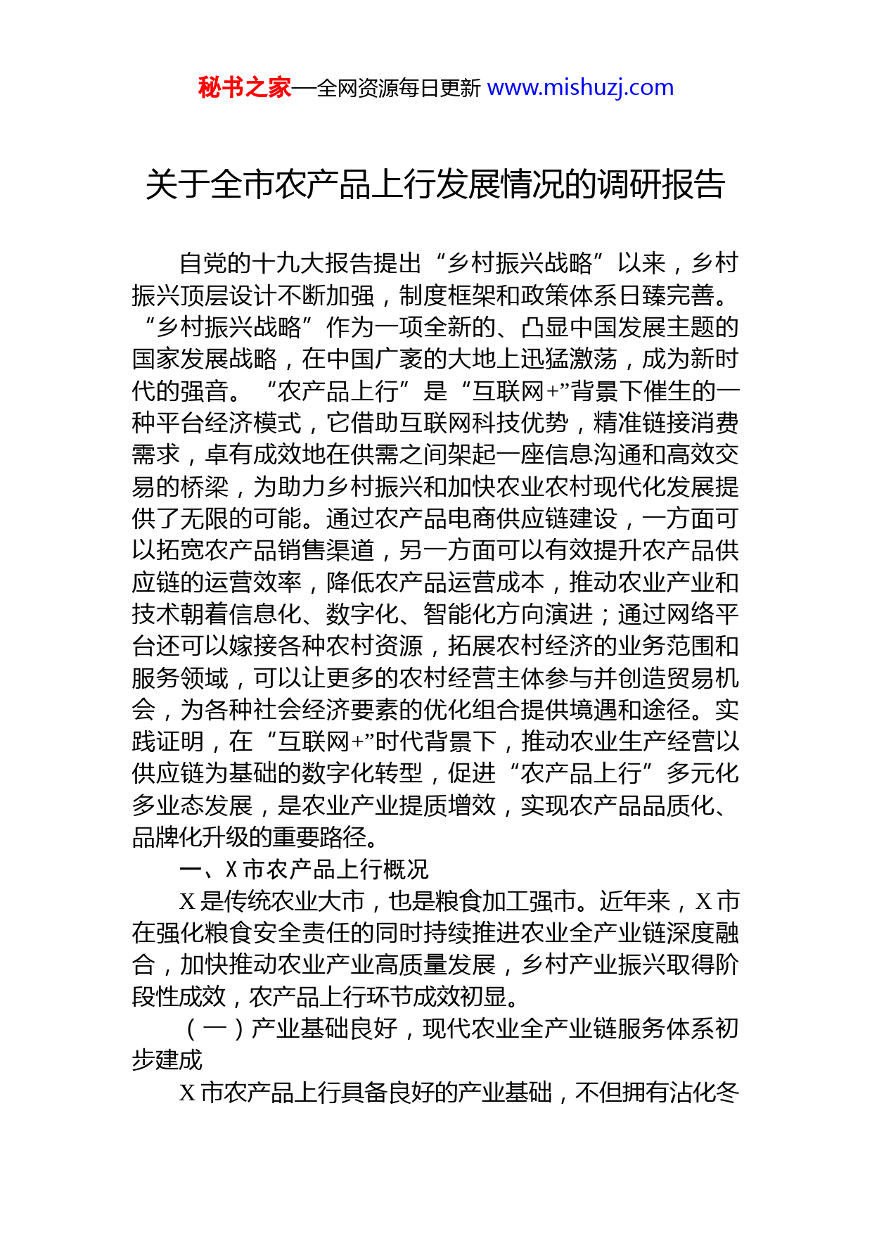 秘书之家—全网资源每日更新www.mishuzj.com关于全市农产品上行发展情况的调研报告自党的十九大报告提出“乡村振兴战略”以来,乡村振兴顶层设计不断加强,制度框架和政策体系日臻完善。“乡村振兴战略”作为一项全新的、凸显中国发展主题的国家发展战略,在中国广袤的大地上迅猛激荡,成为新时代的强音。“农产品上行”是“互联网+”背景下催生的一种平台经济模式,它借助互联网科技优势,精准链接消费需求,卓有成效地在供需之间架起一座信息沟通和高效交易的桥梁,为助力乡村振兴和加快农业农村现代化发展提供了无限的可能。通过农产品电商供应链建设,一方面可以拓宽农产品销售渠道,另一方面可以有效提升农产品供应链的运营效率,降低农产品运营成本,推动农业产业和技术朝着信息化、数字化、智能化方向演进;通过网络平台还可以嫁接各种农村资源,拓展农村经济的业务范围和服务领域,可以让更多的农村经营主体参与并创造贸易机会,为各种社会经济要素的优化组合提供境遇和途径。实践证明,在“互联网+”时代背景下,推动农业生产经营以供应链为基础的数字化转型,促进“农产品上行”多元化多业态发展,是农业产业提质增效,实现农产品品质化、品牌化升级的重要路径。一、X市农产品上行概况X是传统农业大市,也是粮食加工强市。近年来,X市在强化粮食安全责任的同时持续推进农业全产业链深度融合,加快推动农业产业高质量发展,乡村产业振兴取得阶段性成效,农产品上行环节成效初显。(一)产业基础良好,现代农业全产业链服务体系初步建成X市农产品上行具备良好的产业基础,不但拥有沾化冬秘书之家—全网资源每日更新www.mishuzj.com枣、阳信鸭梨、无棣金丝小枣、惠民蜜桃、博兴店子西红柿、邹平长山山药等很多具有一定市场影响力的特色农产品,而且涌现出中裕集团、香驰粮油、西王食品等一批在农产品生产、加工、仓储、流通、电商等领域地域优势显著、已形成规模效益的大型龙头企业。通过积极推进农业供给侧结构性改革,培育优质农产品,X农产品的质量安全水平和竞争力不断提升,形成富有特色的X农产品品牌形象。截至X年,X市拥有省级农产品品牌X个、“三品一标”产品X个、省级以上农业龙头企业X家、农业特色产业“十亿元乡镇”X个、全国“一村一品”示范村镇X家。(二)政府扶持、参与的力度加大,成效初显X市政府出台了包括资金拨付、融资帮扶、搭建电商平台、配套物流、品牌宣介等推动农产品上行的系列政策,电子商务蓬勃发展,“电子商务进农村”工程方兴未艾,成为拉动全市农村消费、引导农业生产、促进农民增收的重要抓手。1.积极培育现代农业产业园和电子商务产业园,推动产业融合发展。以价值链为核心,大力发展现代农业园区和工厂化农业,围绕粮食、肉牛、冬枣等优势特色产业兴建现代农业产业园,同时积极发挥电子商务精准连接消费需求的优势,兴建现代化电商产业园区,打造集跨境电商、传统电商、电商配套服务为一体的大型一站式综合服务中心。截至X年全市共获批创建X个国家级、X个省级现代农业产业园,农产品加工转化率达X%以上。新型经营主体逐步壮大,产业融合发展初显成效。2.加大扶持力度,构建品牌推广体系。围绕X市农业发展和优势产业升级需要,X年由X市农业农村局牵头成立“三农”服务联盟,出台了包括《关于助推“好品山东”建设促进高质量发展的实施意见》等文件,推动落实品牌培育提升专项行动。通过设立农业科技发展专项资金,农业品牌奖补,搭建融资、生产信息平台,引导银行、保险秘书之家—全网资源每日更新www.mishuzj.com担保等发挥金融支农中介桥梁作用,整合科研、推广、新型经营主体等要素资源,推动X农业转型升级和农产品品牌化建设。以沾化冬枣为例,通过不断的品牌化构建,完成了品质的提升,提高了产品的附加值,带来了可观的品牌溢价效益。X年,沾化冬枣荣获第一批“全国名特优新农产品”称号。X年成功入选第一批“好品山东”推荐名单。3.多渠道强化“农商互联”资源对接。X年由市供销社牵头,挂牌成立了“X供销电商平台”,设农粮、水果蔬菜、土特产等五大板块,开发本地农产品电商业务,强化产销衔接机制,解决农产品上行难题。同时积极推动建设农民合作社、益农信息社等互助型经济组织。目前X市已建设益农信息社X多个,涉及七个县市区,将逐步覆盖全部行政村。注册登记的农民合作社突破X万家,其中国家级示范社X家、省级示范社X家,农民合作社经营收入达X.X亿元。X中国农民合作社X强排行榜中,X市X家农民合作社入选。X市下辖的邹平市被农业农村部确定为全国农业社会化服务创新试点县。“农商互联”资源对接,提高了X市农业农村信息化水平和农村经济市场化水平,也增强了农民合作经营规范化、规模化的能力。4.积极谋划推动农产品宣传。X年以来,组织筹办了首届山东粮油产业博览会暨全国粮食产业新旧动能转换助力乡村振兴高峰论坛、第七届中国淘宝村高峰论坛、全国农民丰收节、冬枣节等系列活动,策划推动了“食域X”品牌走进山东农科等电视频道,开展了新型农业经营主体带头人经营管理培训活动,还组织有关企业和人员参加“天猫招商会”“全国农交会”“寿光蔬菜博览会”等活动,鼓励企业结合自身特色和